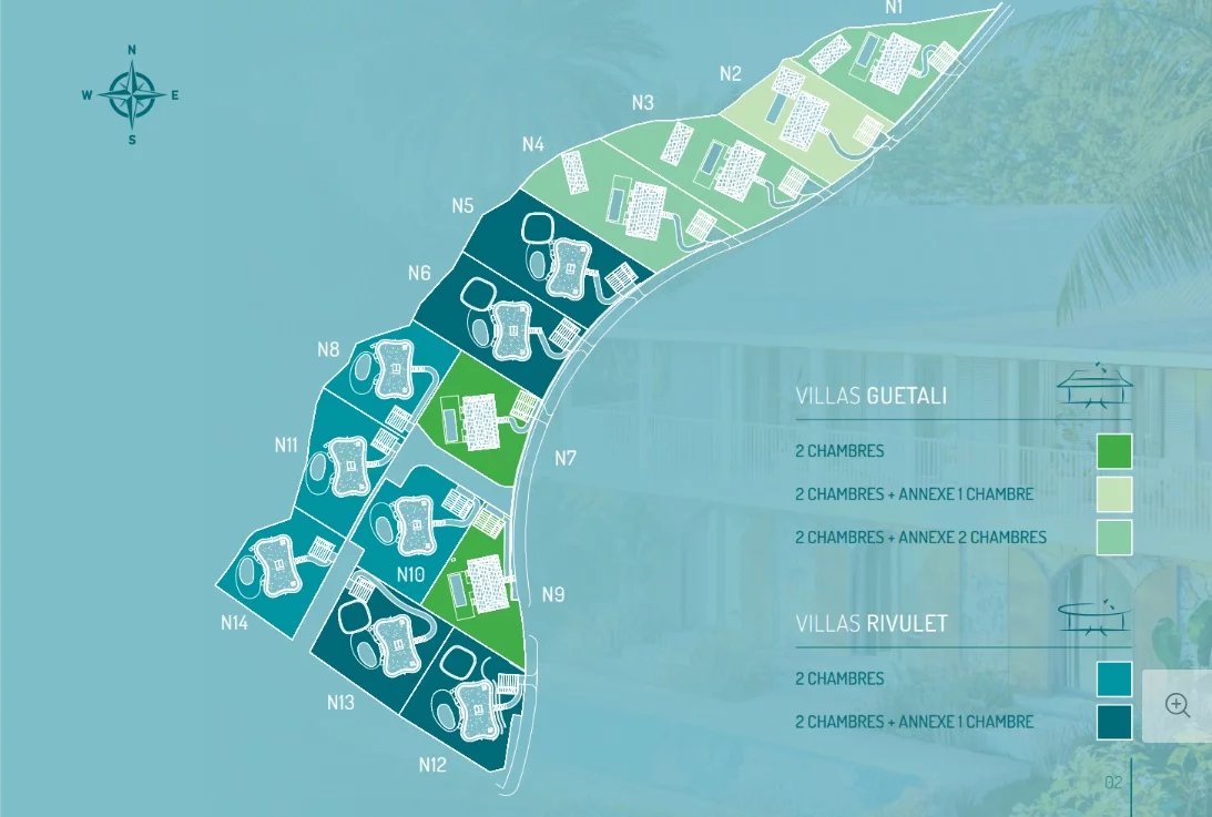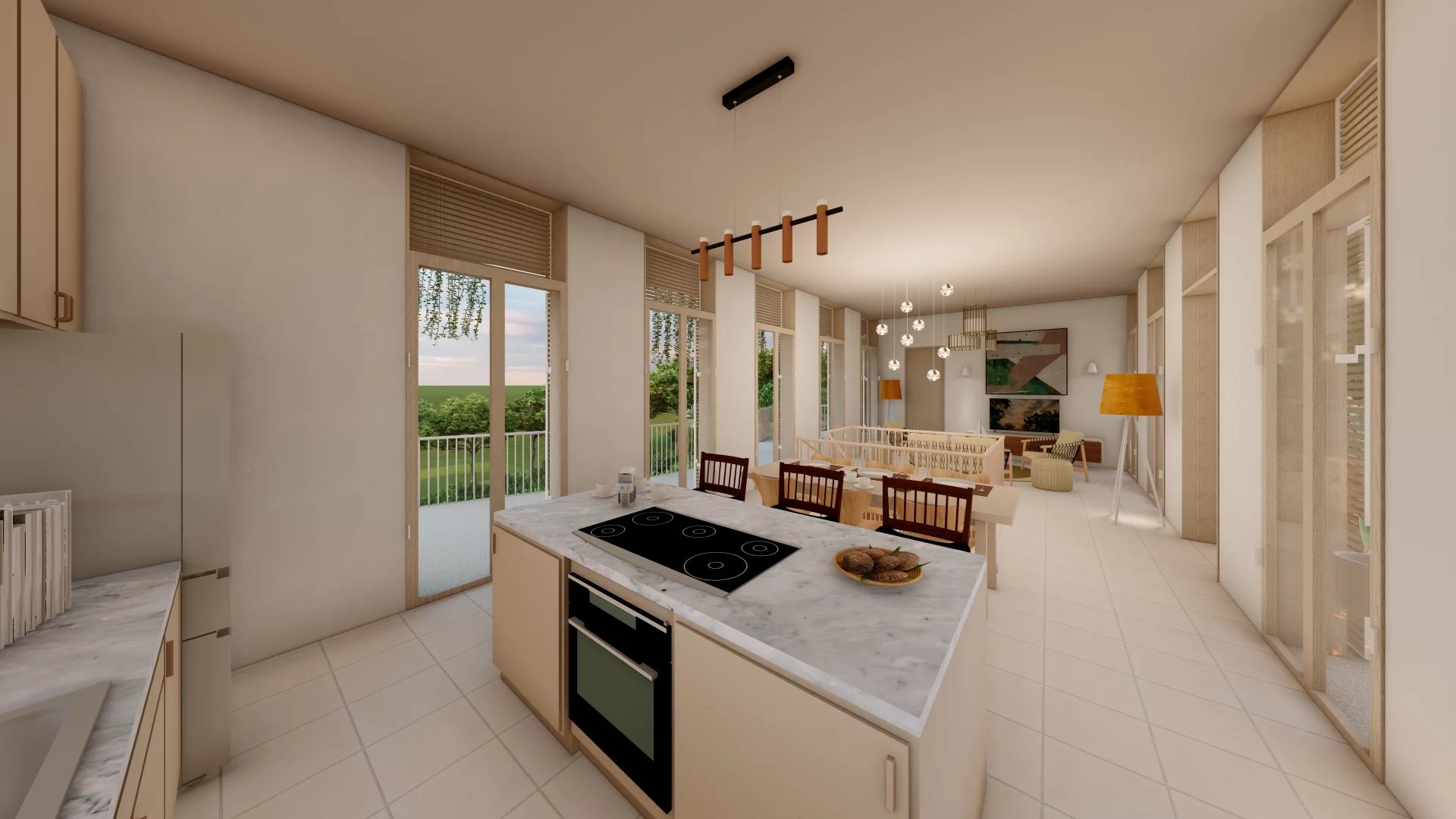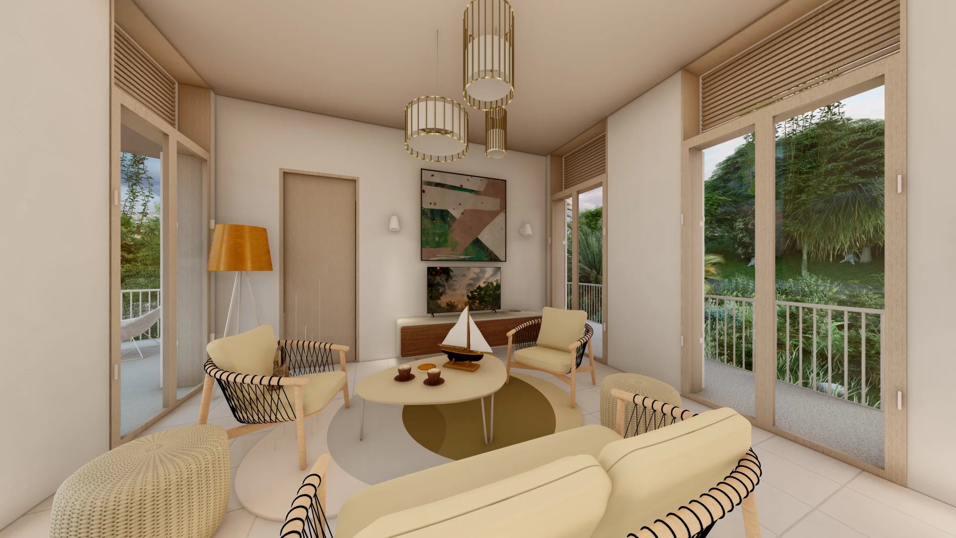 Le salon de 55 m², accessible directement depuis l'entrée, est situé au premier niveau. Cette disposition optimise la lumière naturelle, créant une atmosphère lumineuse et accueillante. Cette villa offre une vaste véranda de 60 m² sur laquelle les résidents pourront profiter de la vue imprenable sur le lagon.