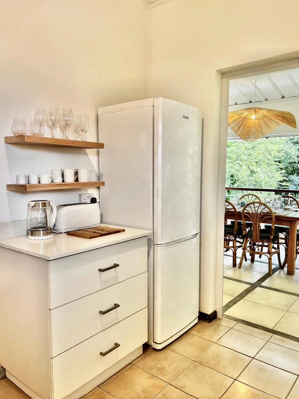 L’appartement principal offre deux chambres spacieuses, une salle de bain, des toilettes invités, un salon extérieur avec une salle à manger ainsi qu’une varangue avec une vue reposante sur la forêt.