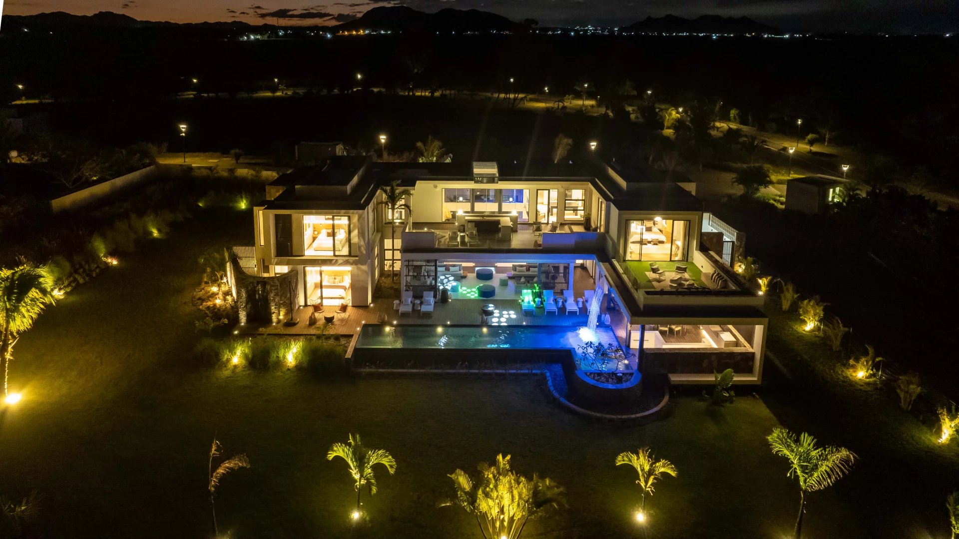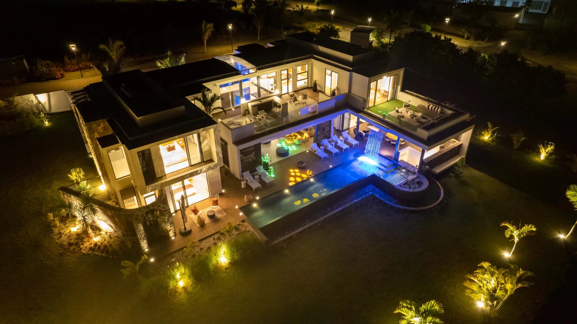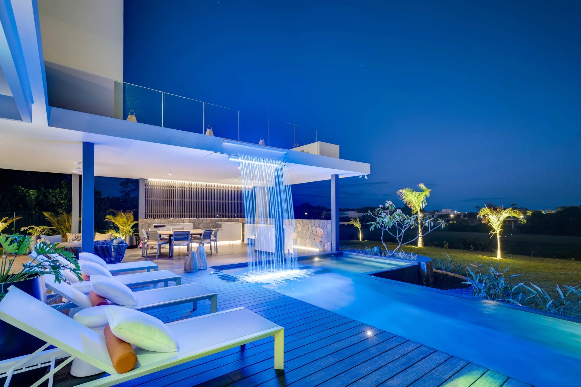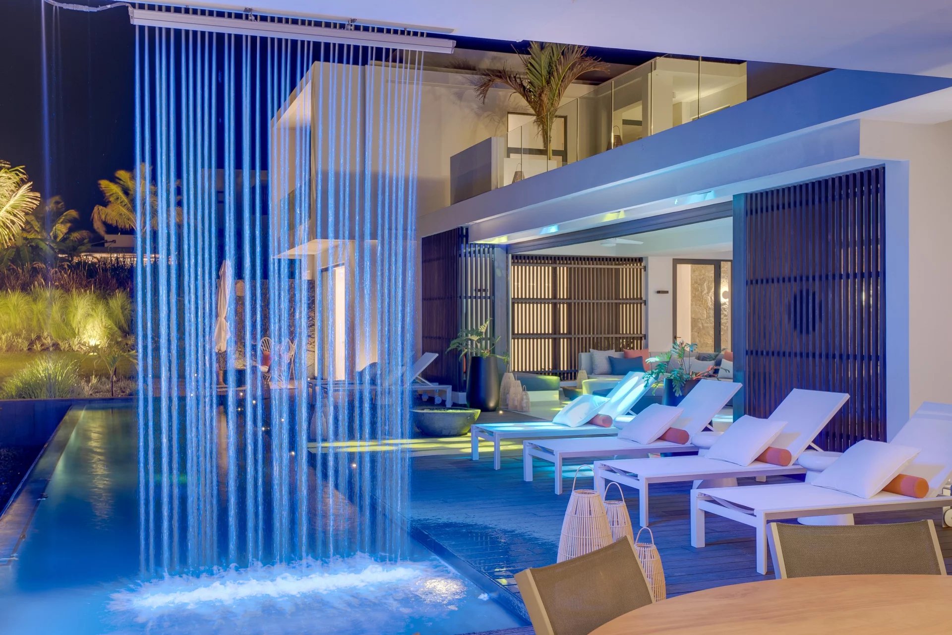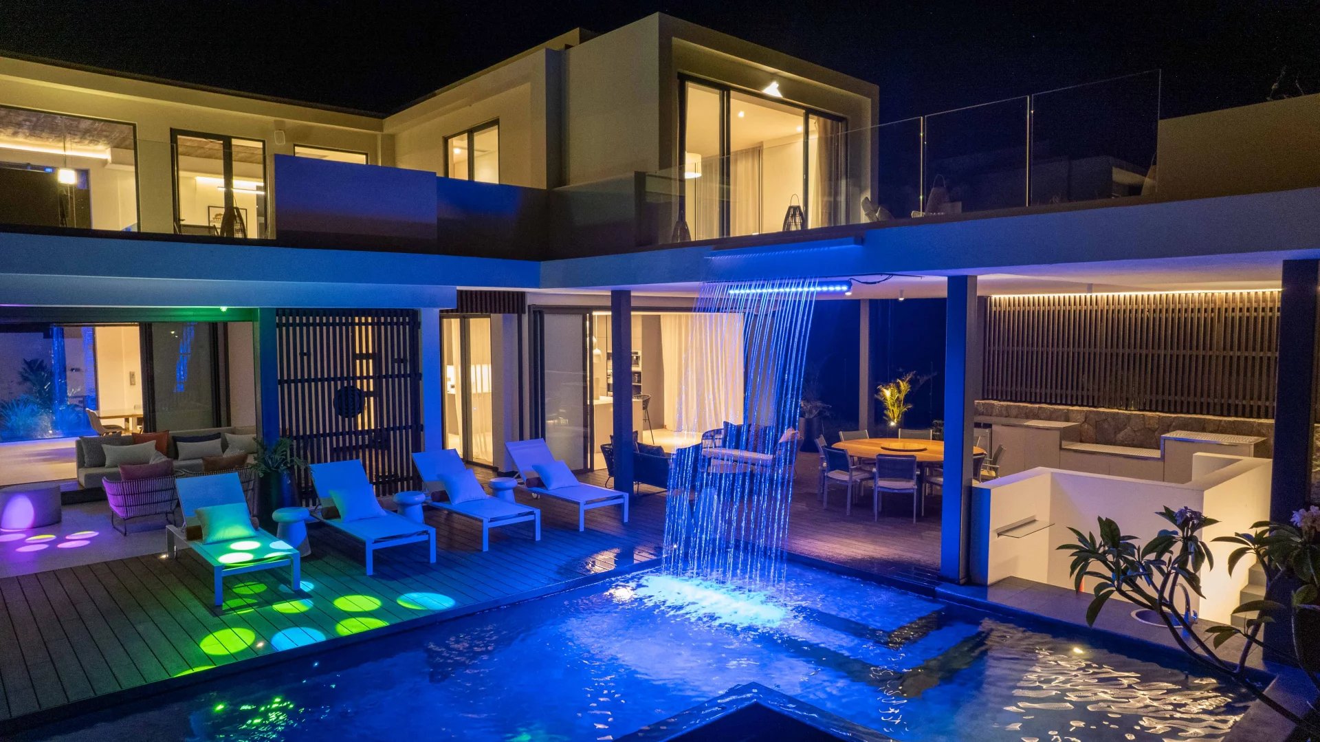 La domotique vous permettra le choix de vos ambiances, musiques et cascades à distance depuis votre smartphone. La nuit laissera place aux jeux de lumières qui donneront une dimension supplémentaire à cette villa d'exception.