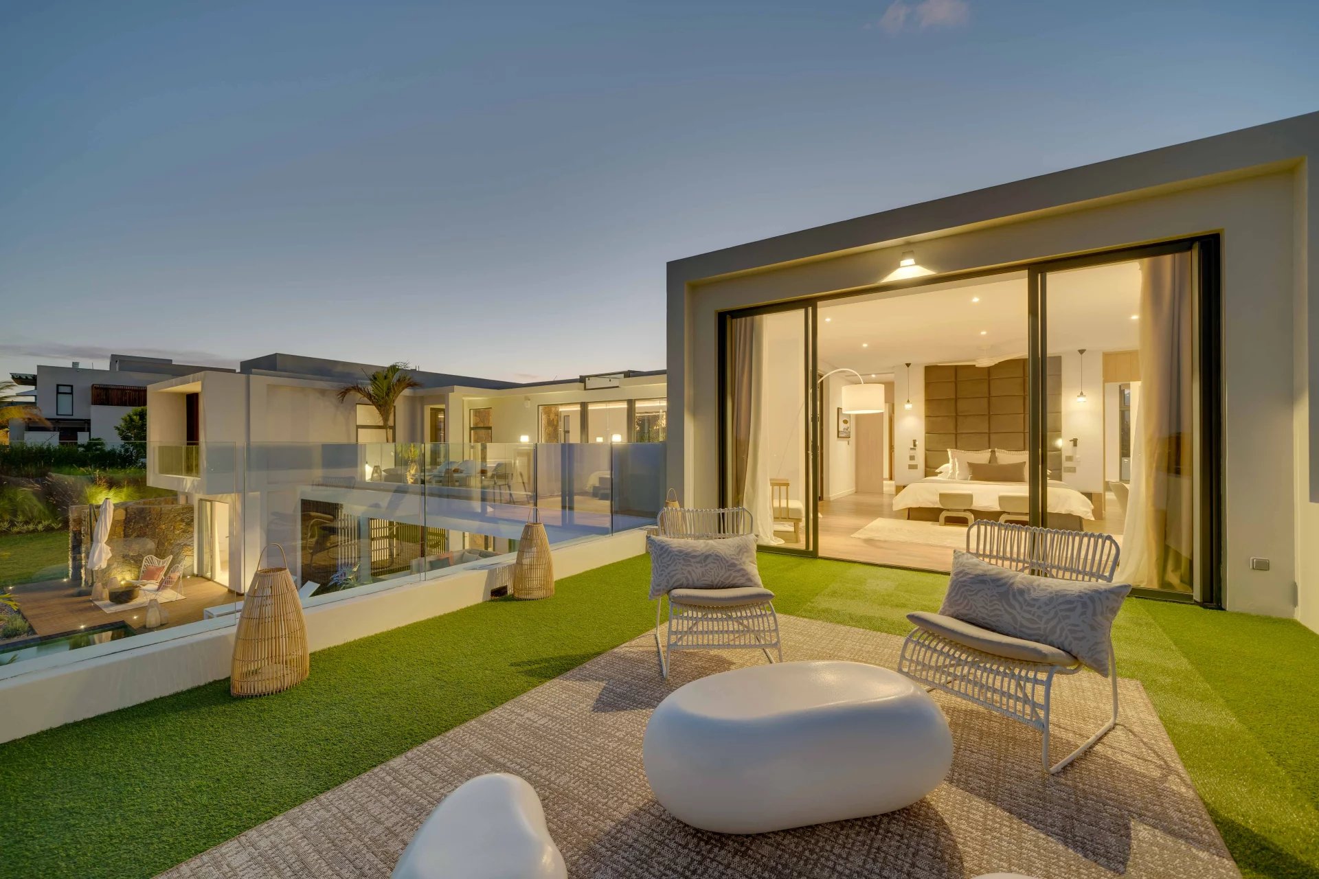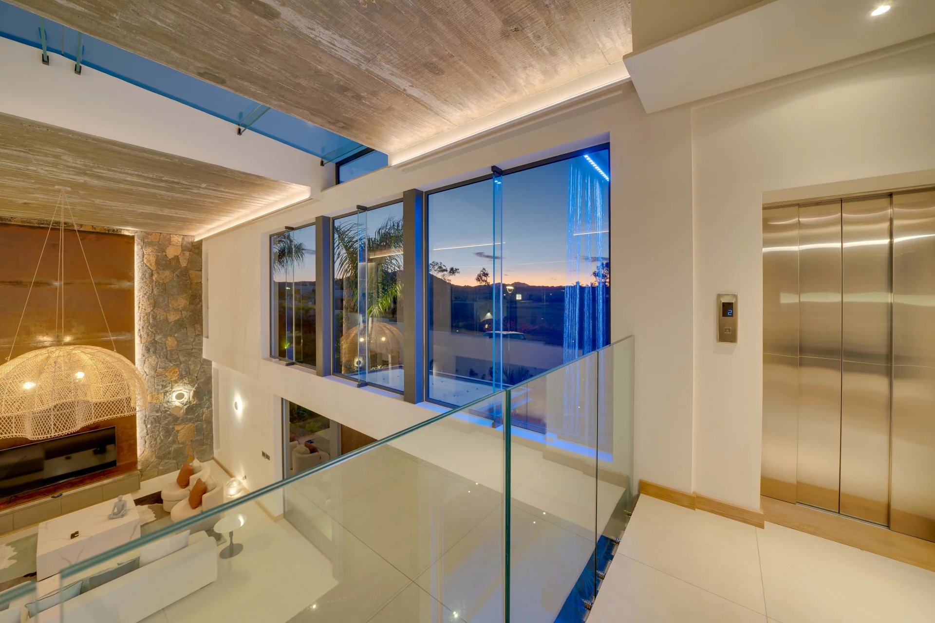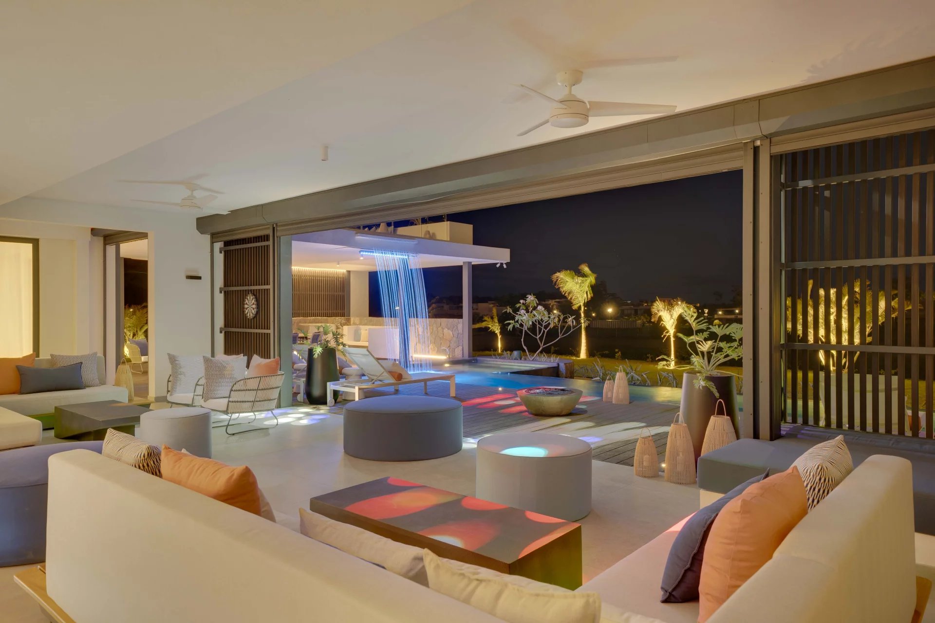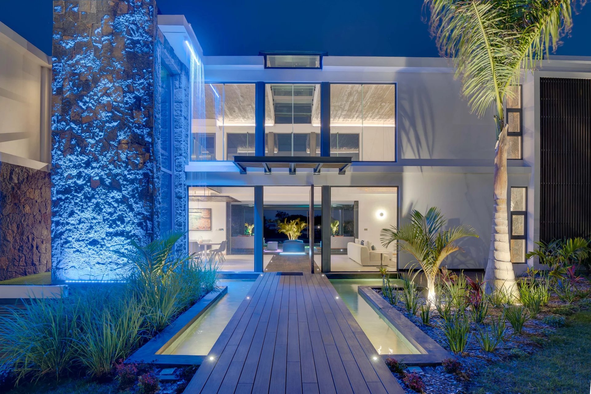 La domotique vous permettra le choix de vos ambiances, musiques et cascades à distance depuis votre smartphone. La nuit laissera place aux jeux de lumières qui donneront une dimension supplémentaire à cette villa d'exception.