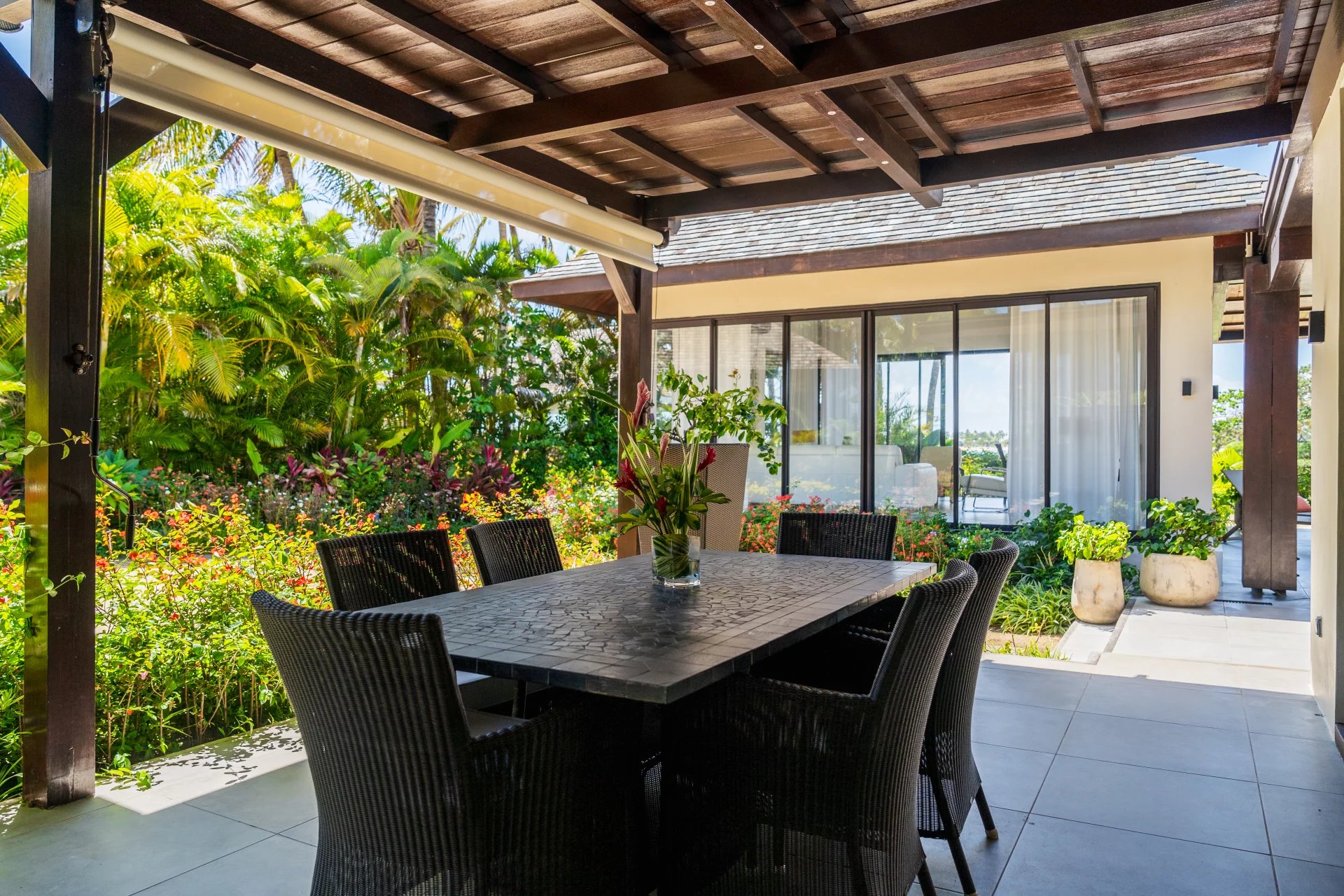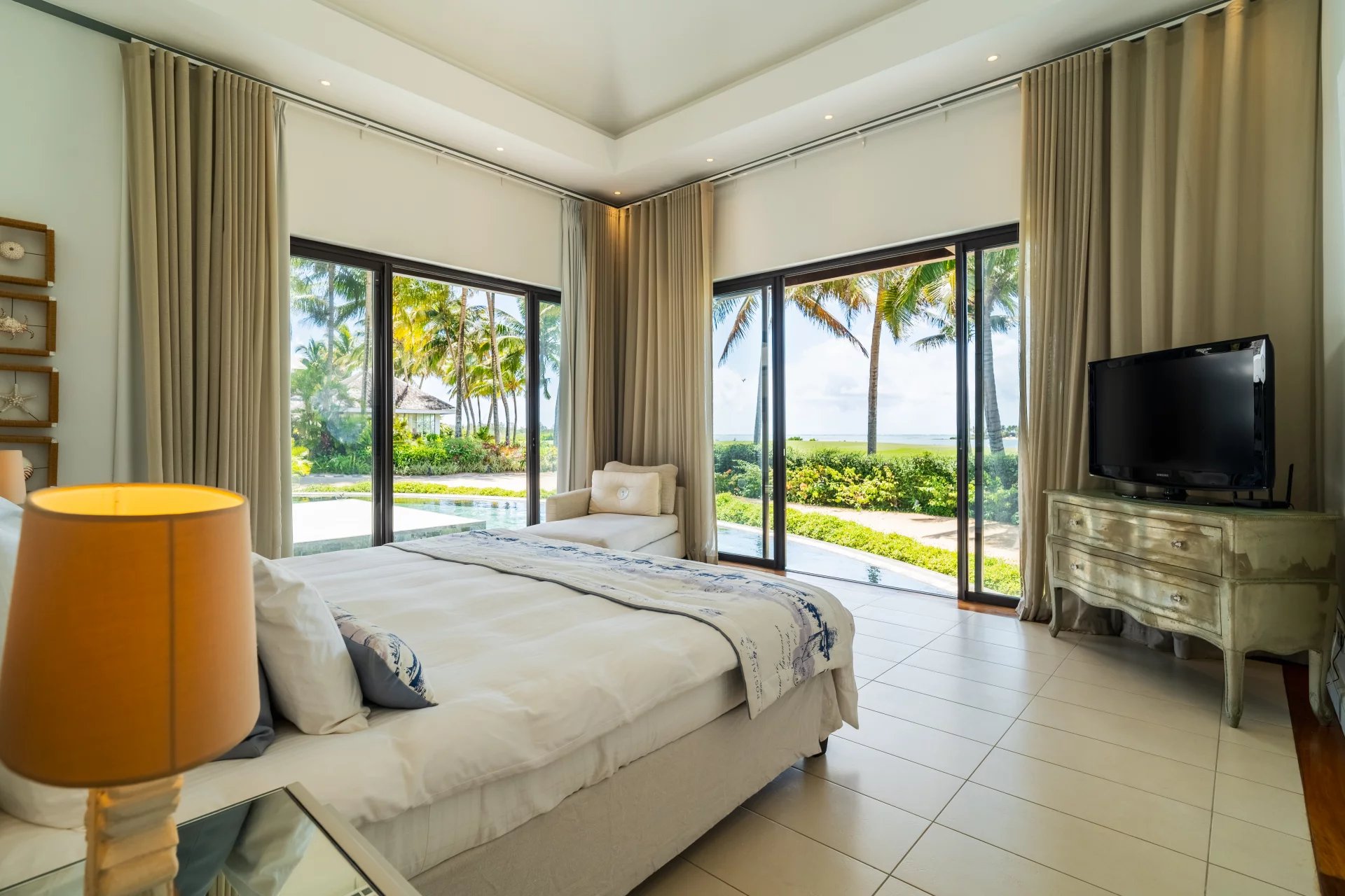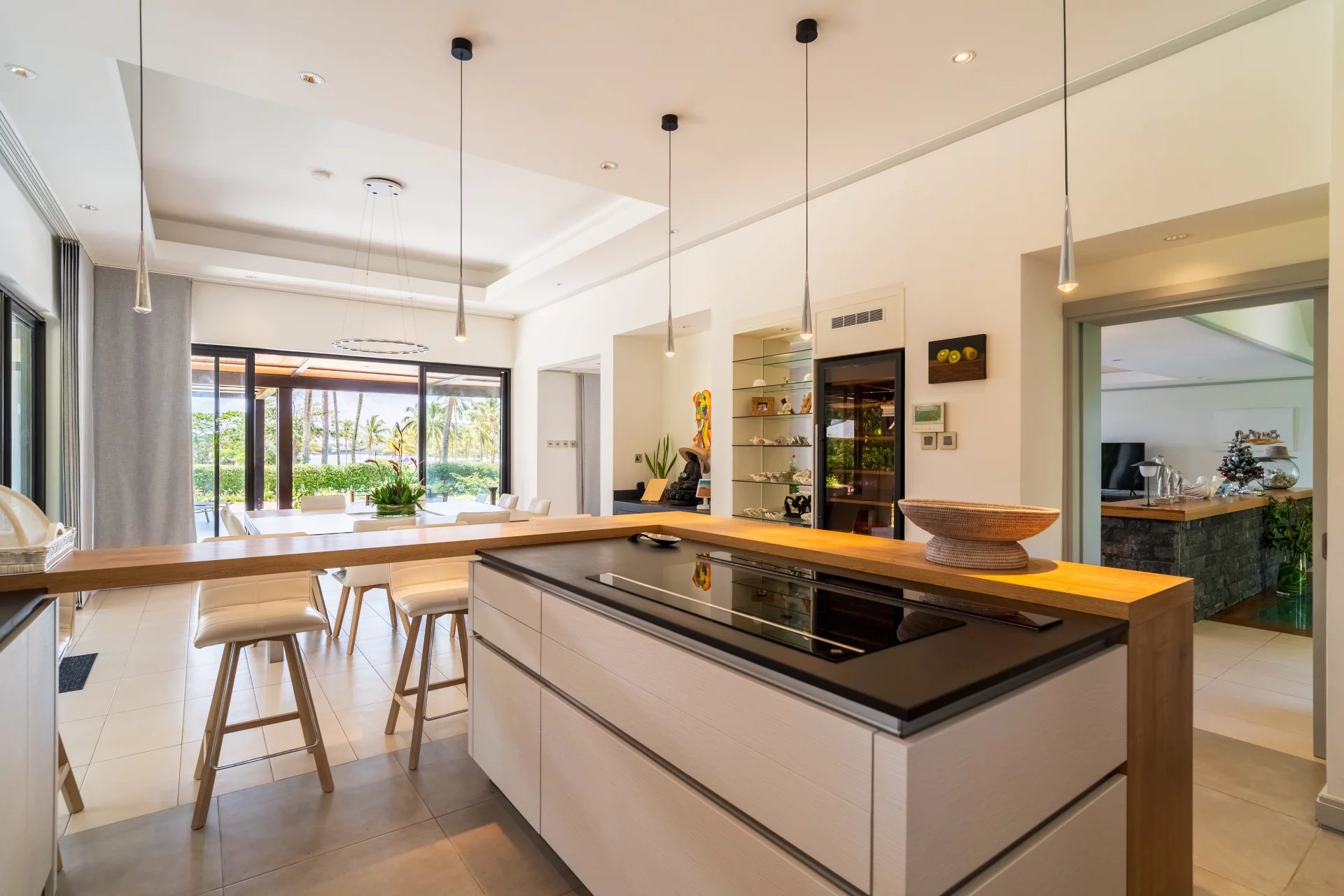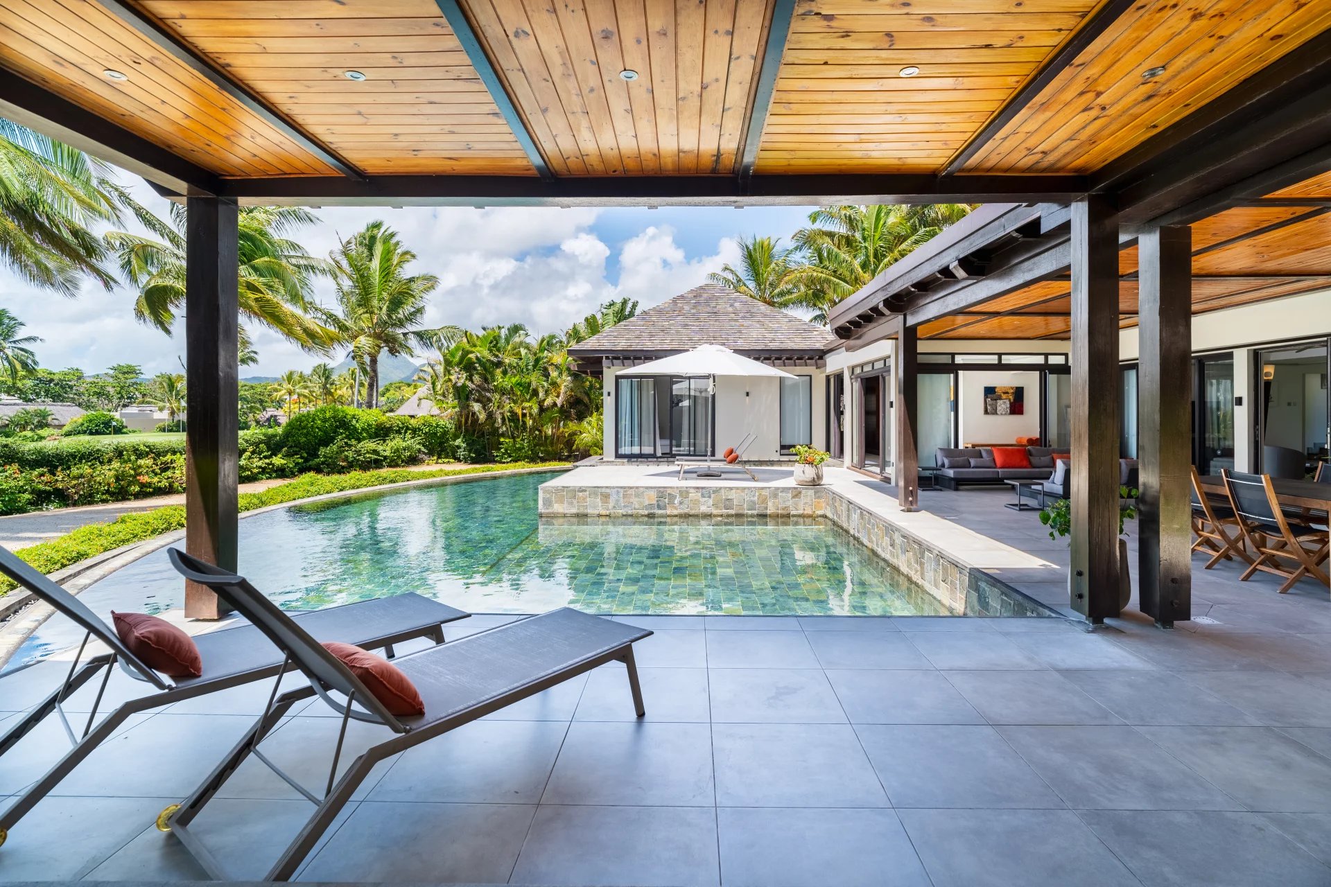 Le véritable atout de cette villa réside dans sa vue panoramique à 360 degrés, offrant un spectacle unique sur le lagon turquoise et l’île aux Cerfs. Chaque pièce a été pensée pour maximiser cette vue exceptionnelle.