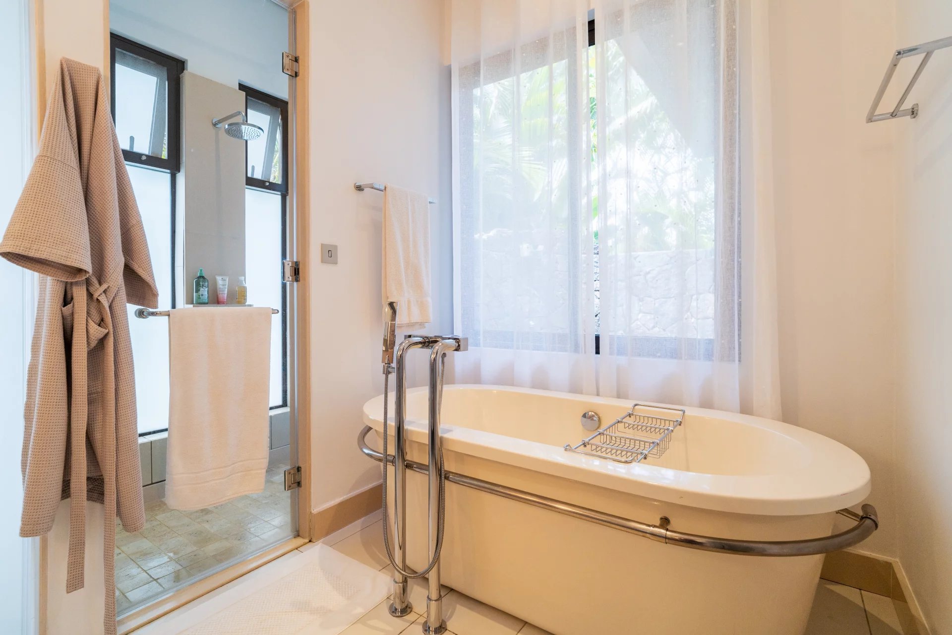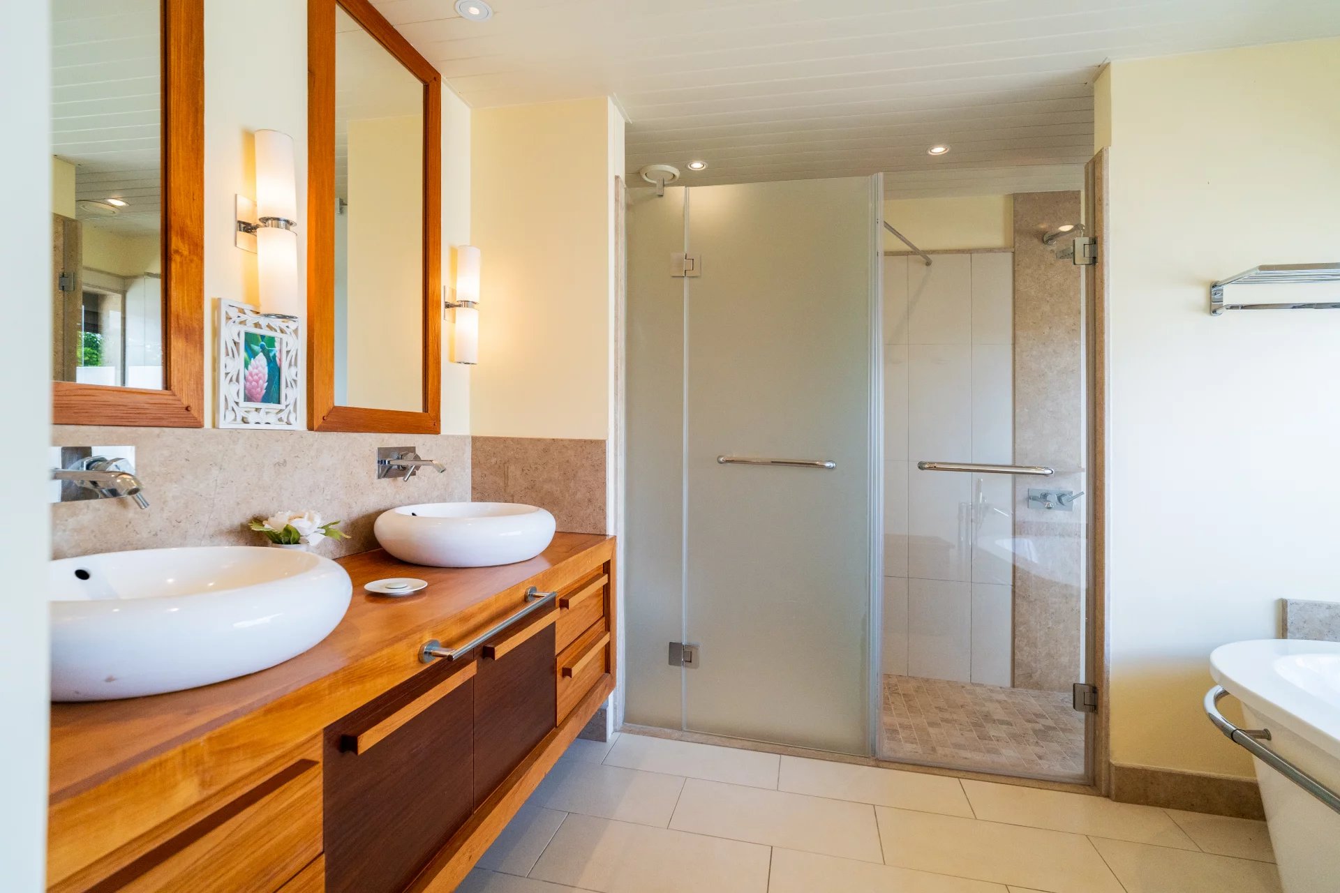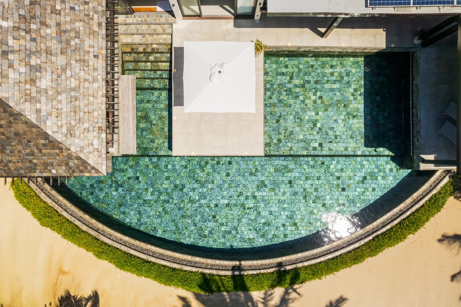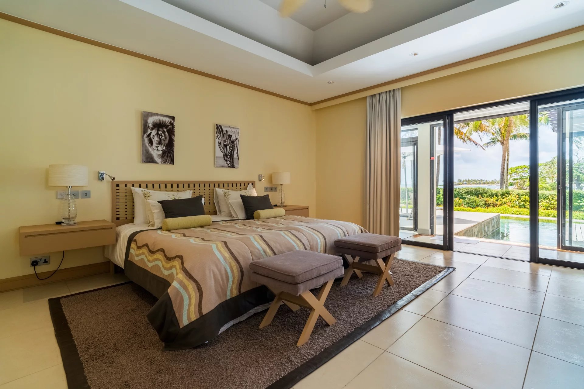 Le véritable atout de cette villa réside dans sa vue panoramique à 360 degrés, offrant un spectacle unique sur le lagon turquoise et l’île aux Cerfs. Chaque pièce a été pensée pour maximiser cette vue exceptionnelle.