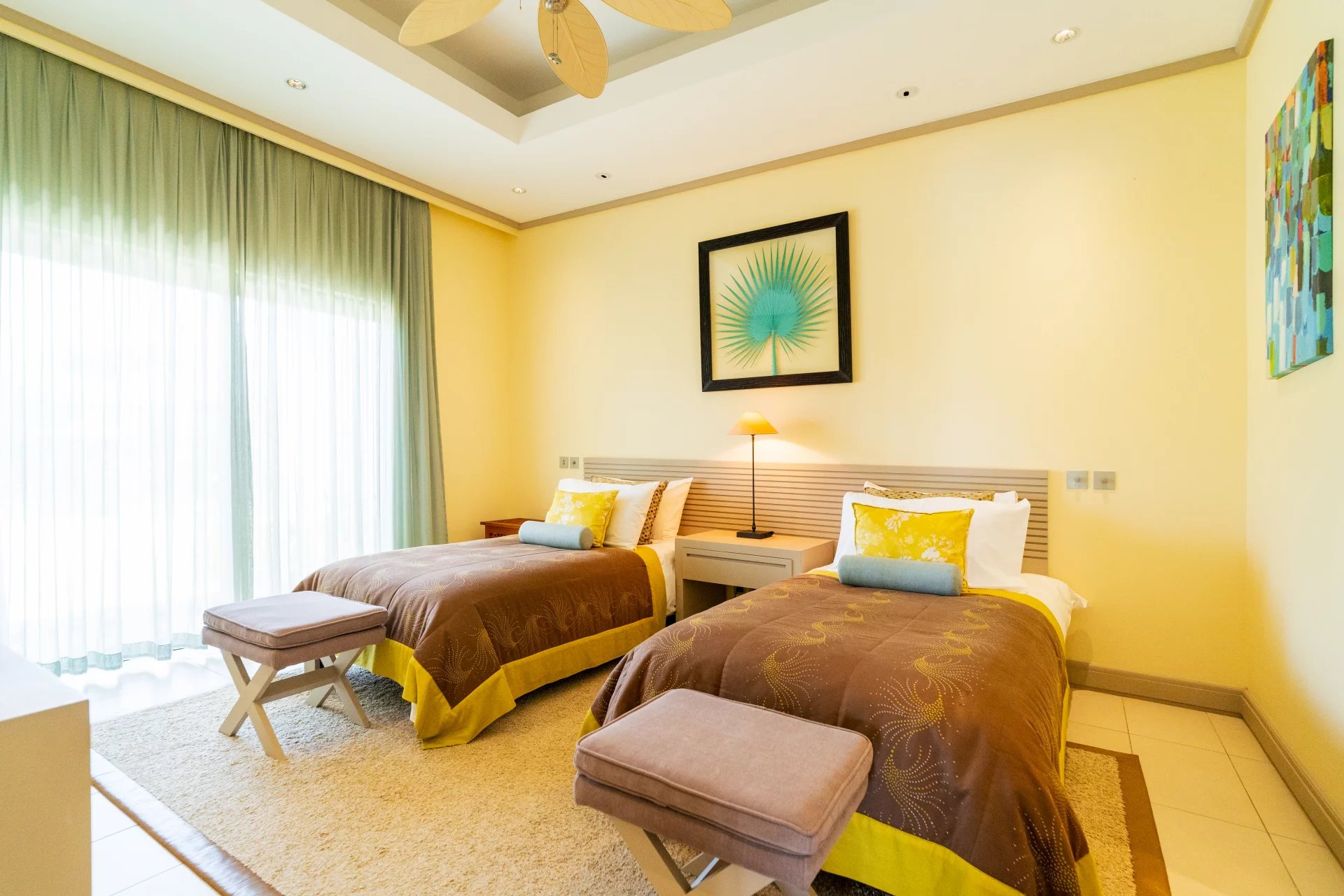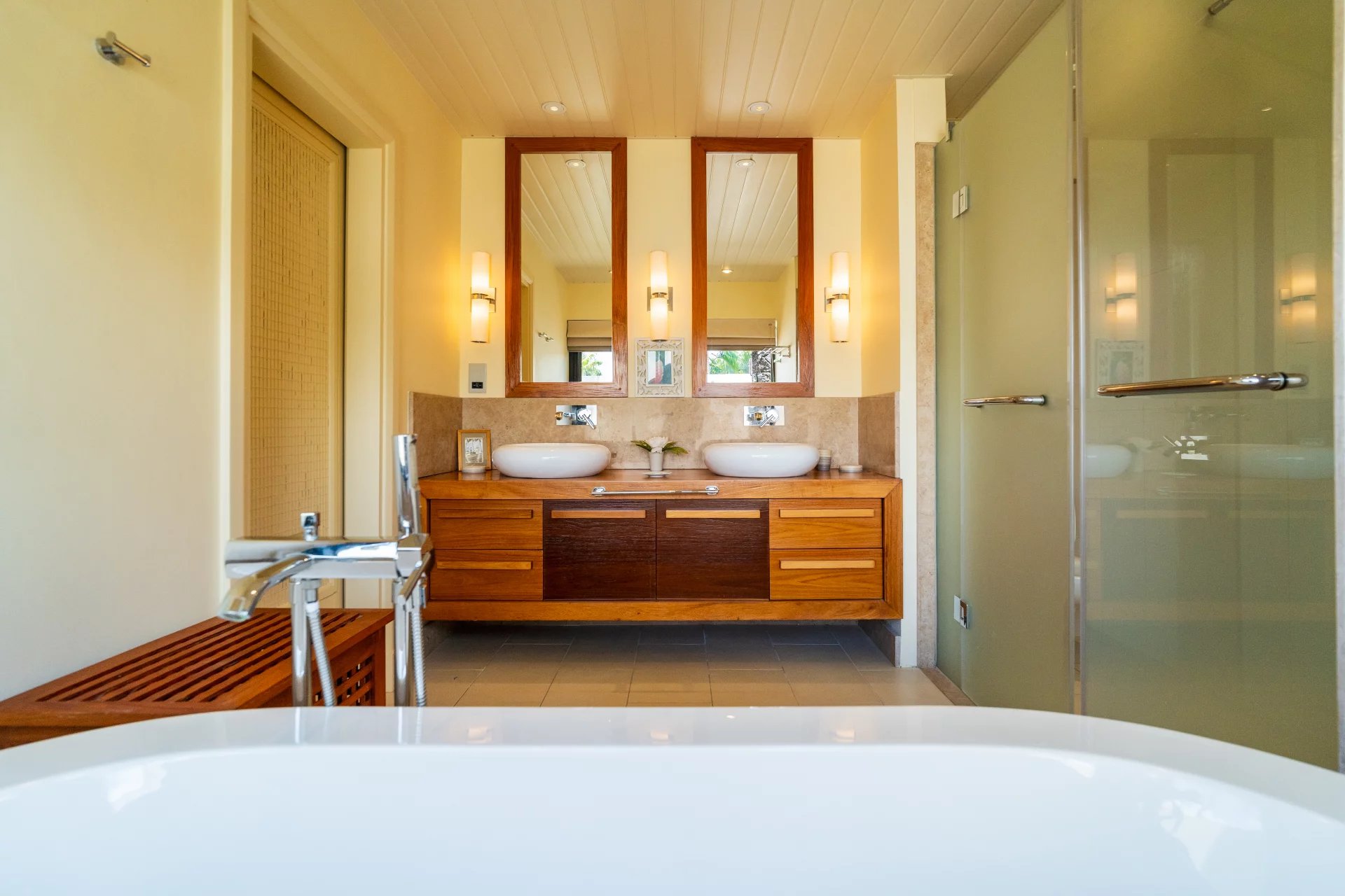 La villa dispose de quatre chambres luxueuses, dont trois suites avec salle de bains privative et dressing. La master bedroom, véritable havre de paix, offre une vue imprenable sur l’océan, créant une atmosphère de sérénité et de raffinement.