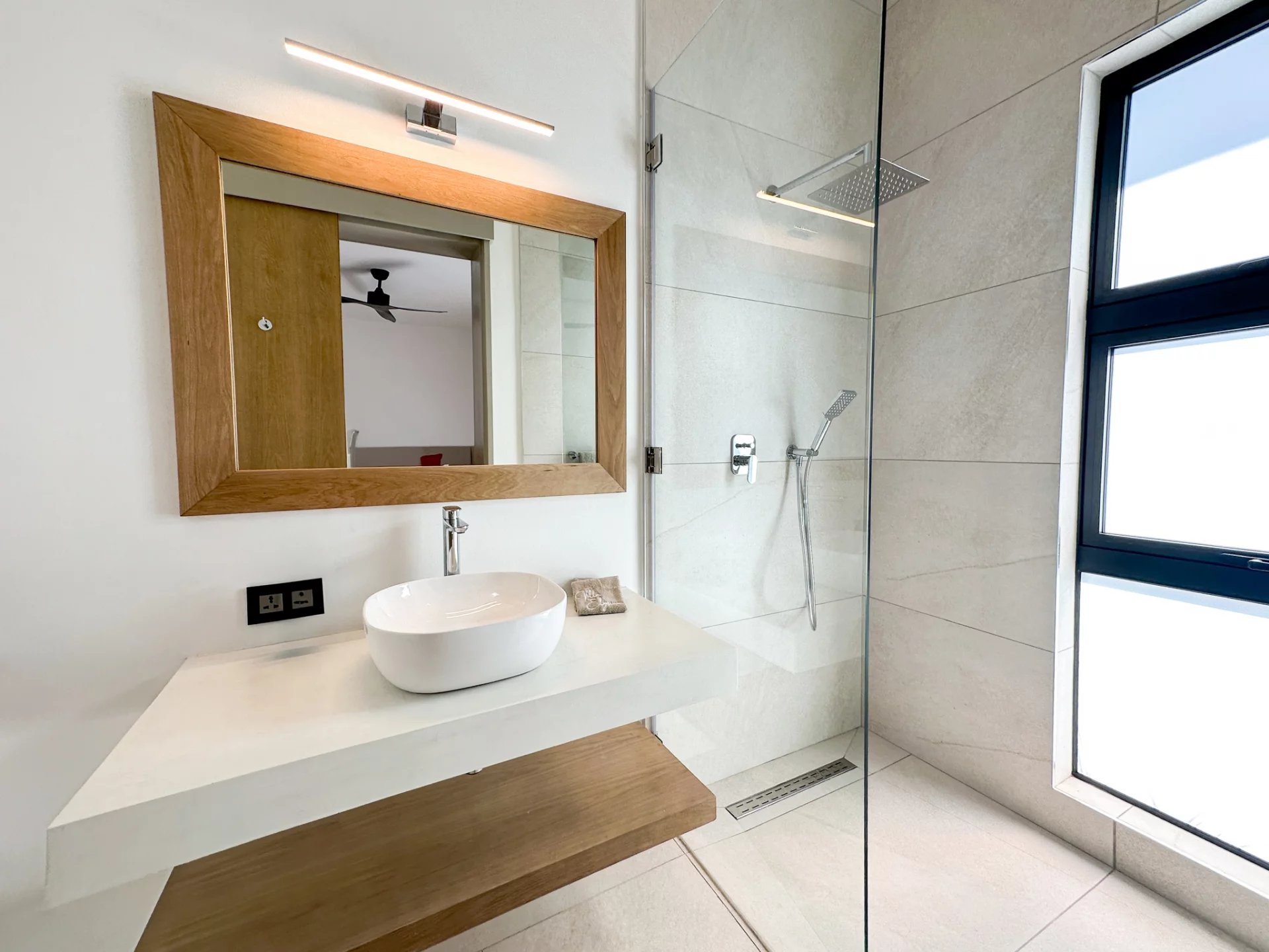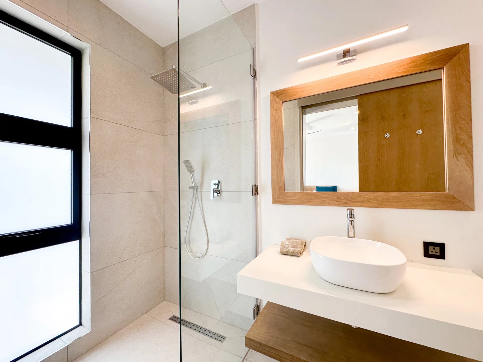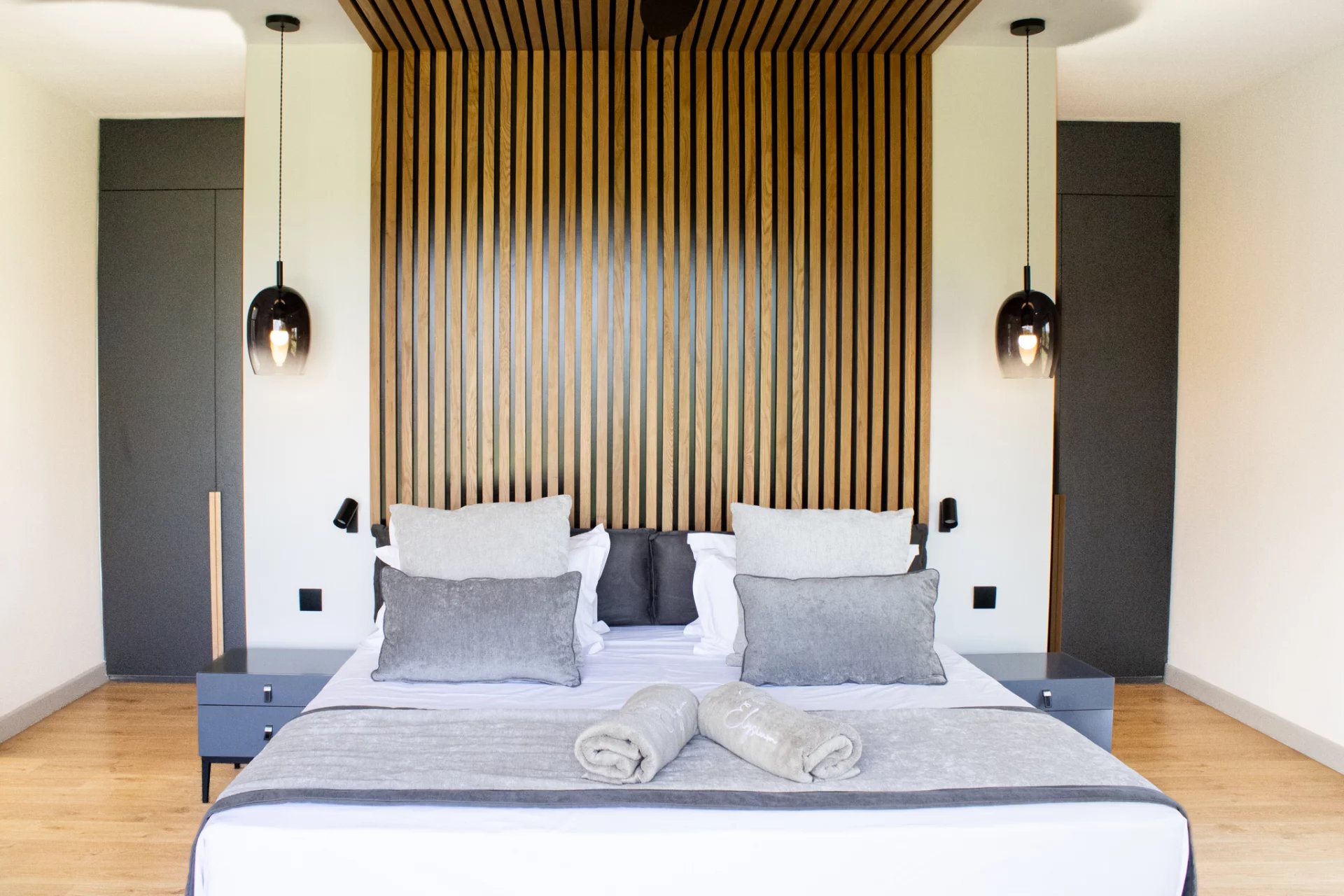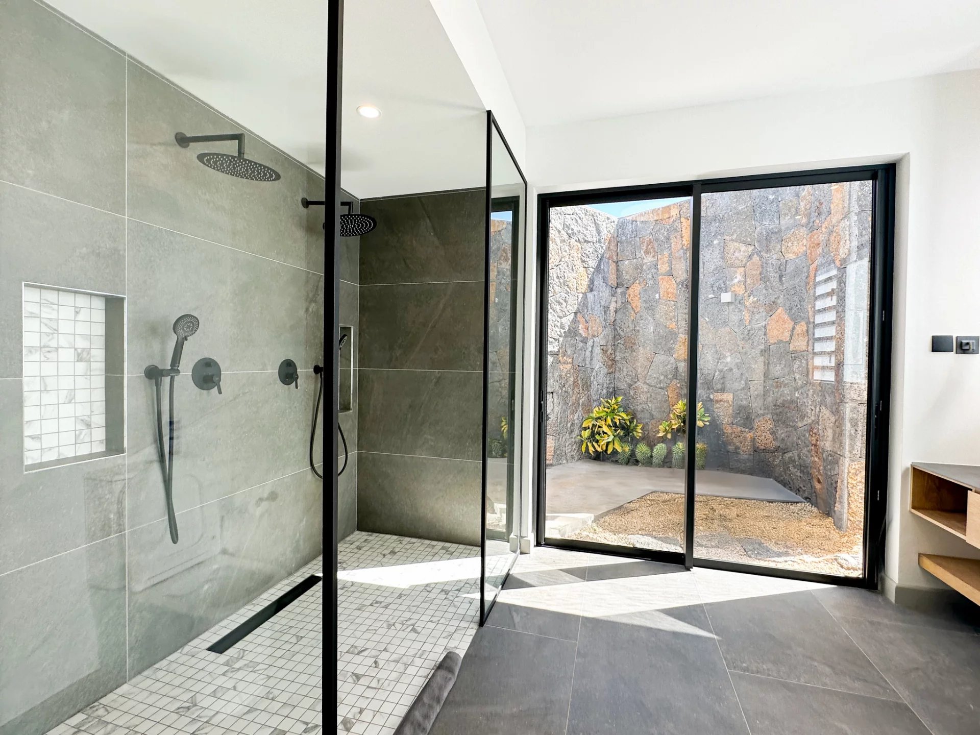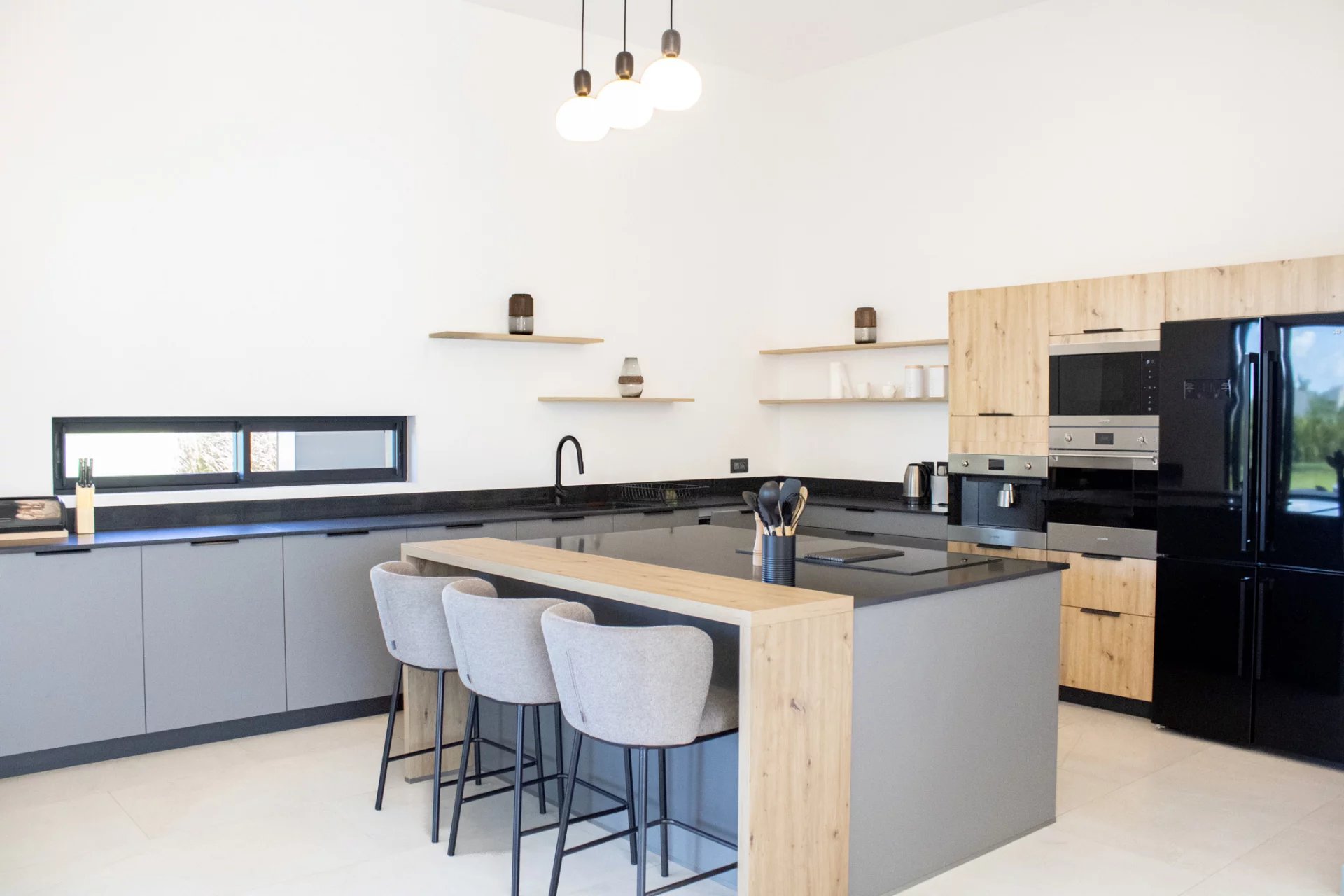 L’espace de vie comprend un vaste salon/salle à manger ouvert sur la terrasse principale, une cuisine équipée avec arrière-cuisine, trois chambres climatisées en suite, ainsi qu’un toit-terrasse offrant une vue panoramique à 360°. Un coin feu extérieur, une cuisine d’été et un garage complètent l’ensemble.