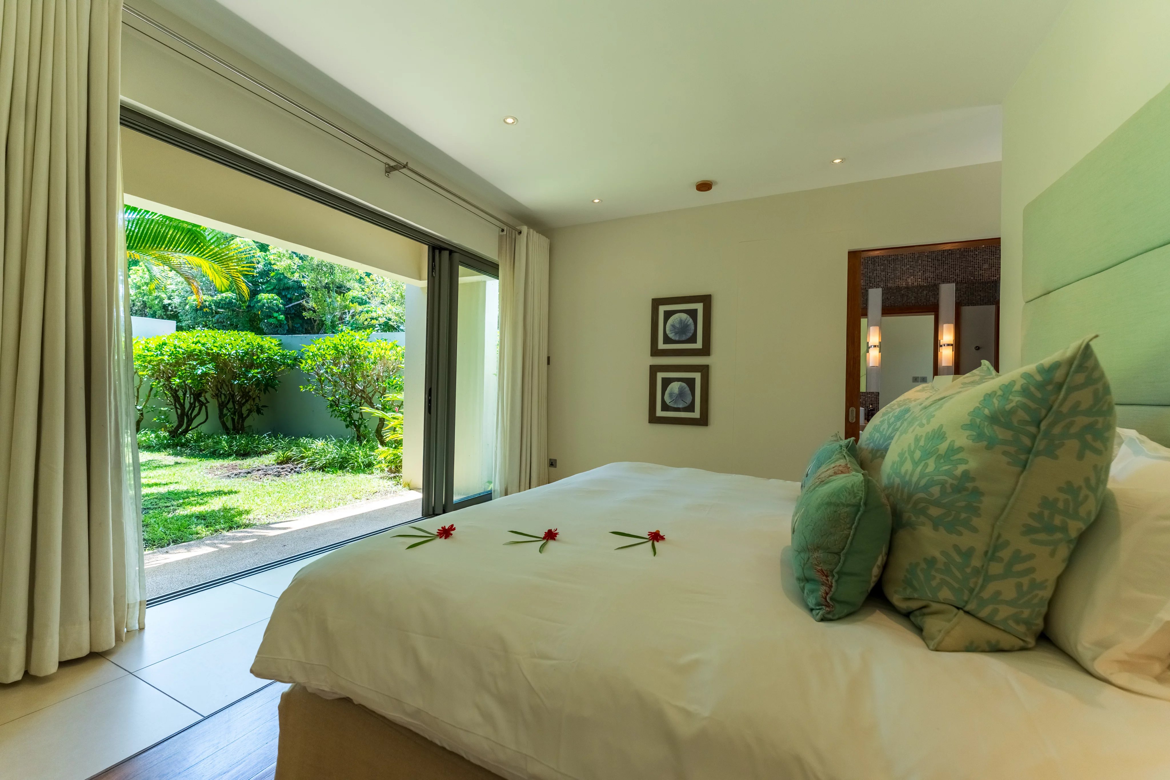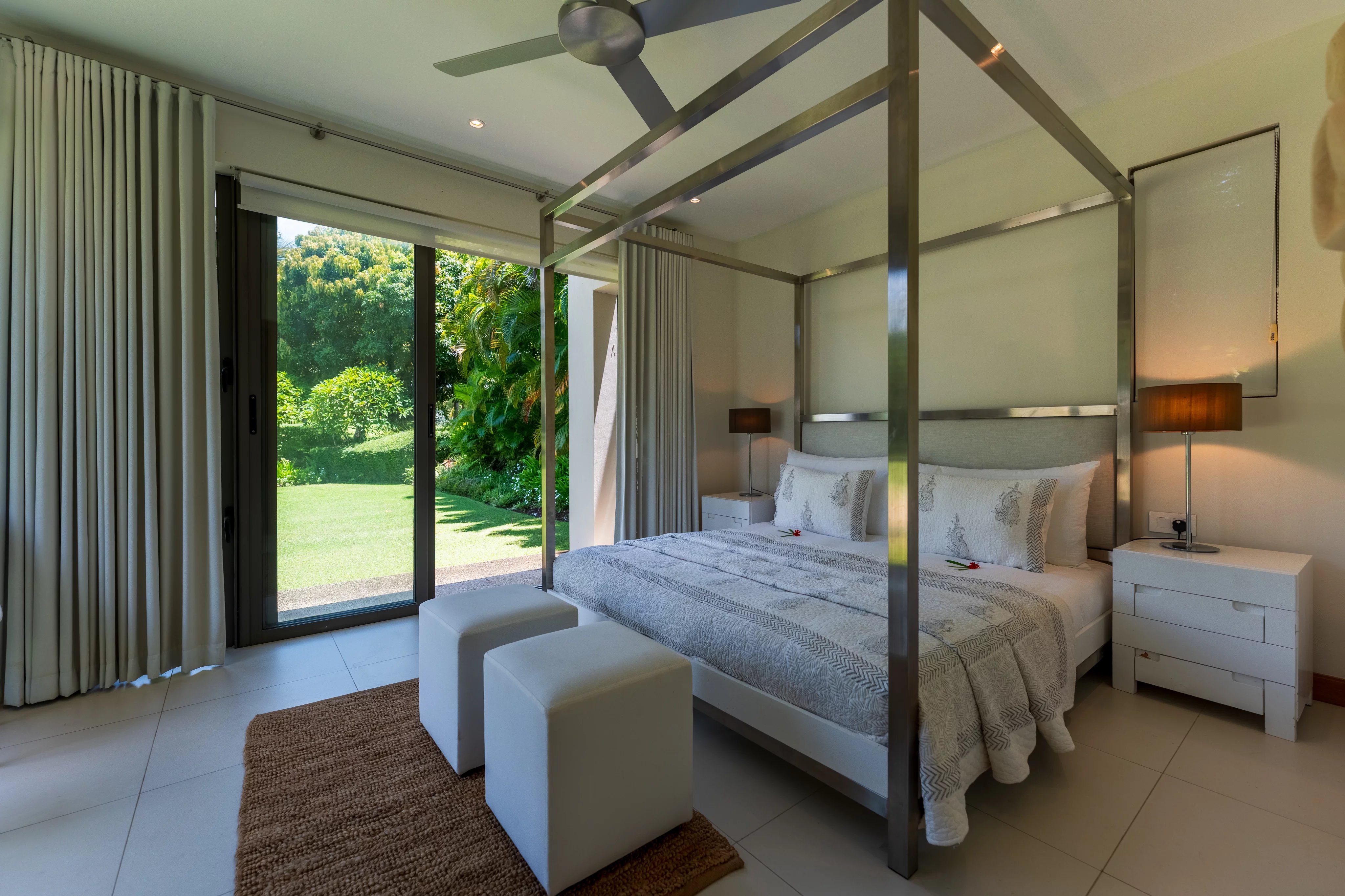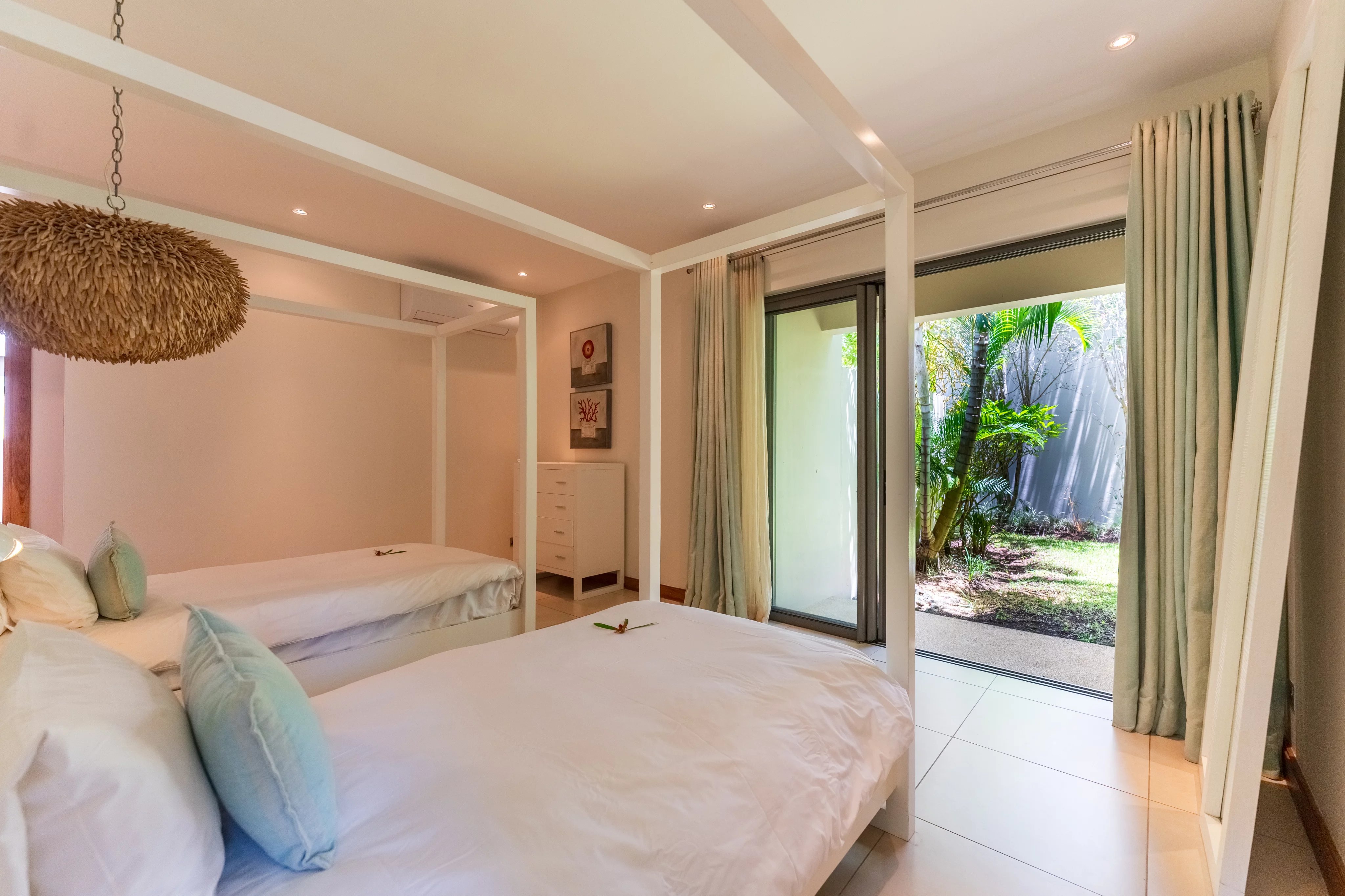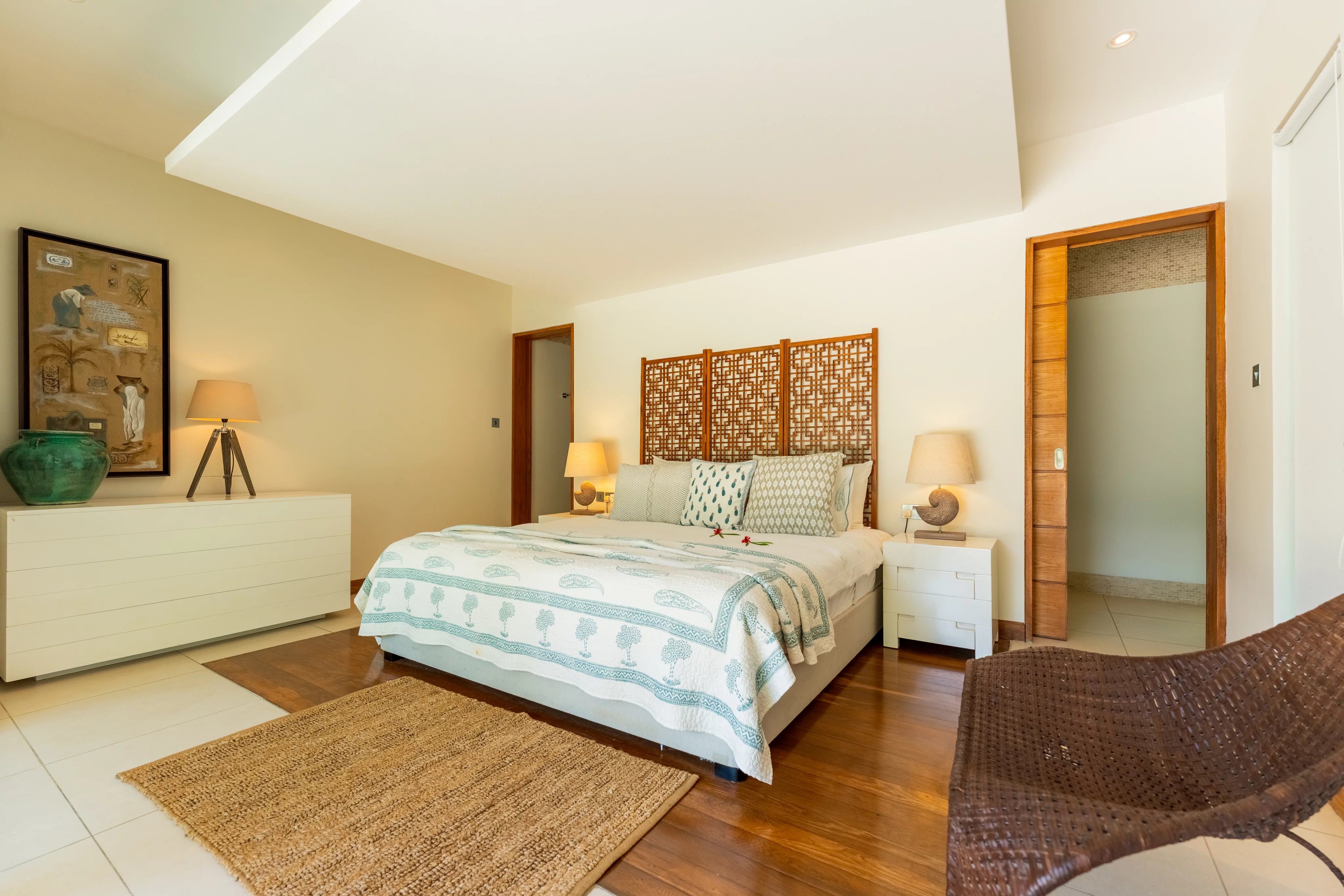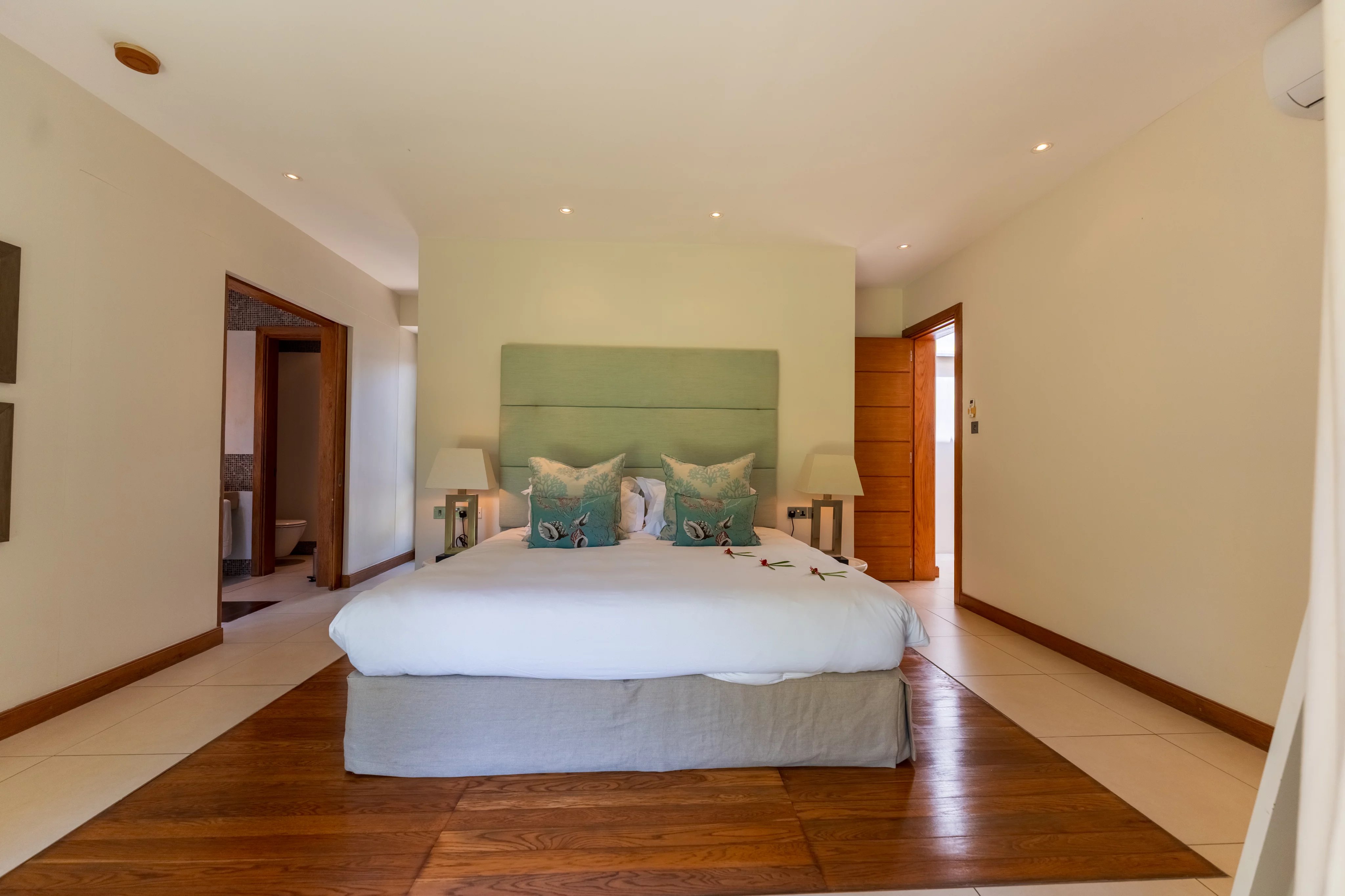 Elle dispose de trois chambres en suite dans la villa principale, chacune avec une salle de bains moderne et un accès direct au jardin. Deux autres chambres indépendantes en annexe, également en suite, offrent intimité et vue sur le jardin. Avec un total de cinq chambres, ce bien est particulièrement rare à Anahita.