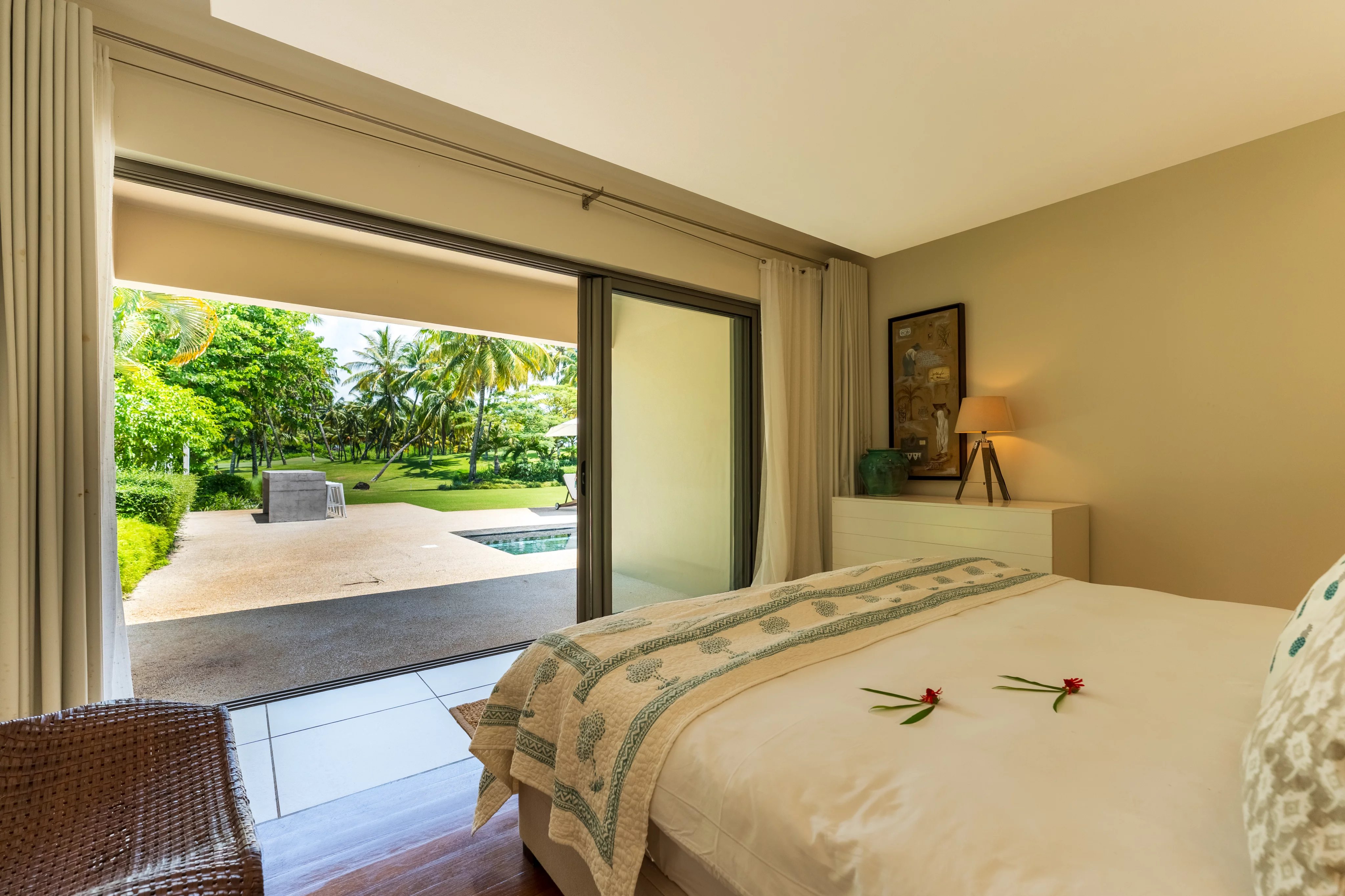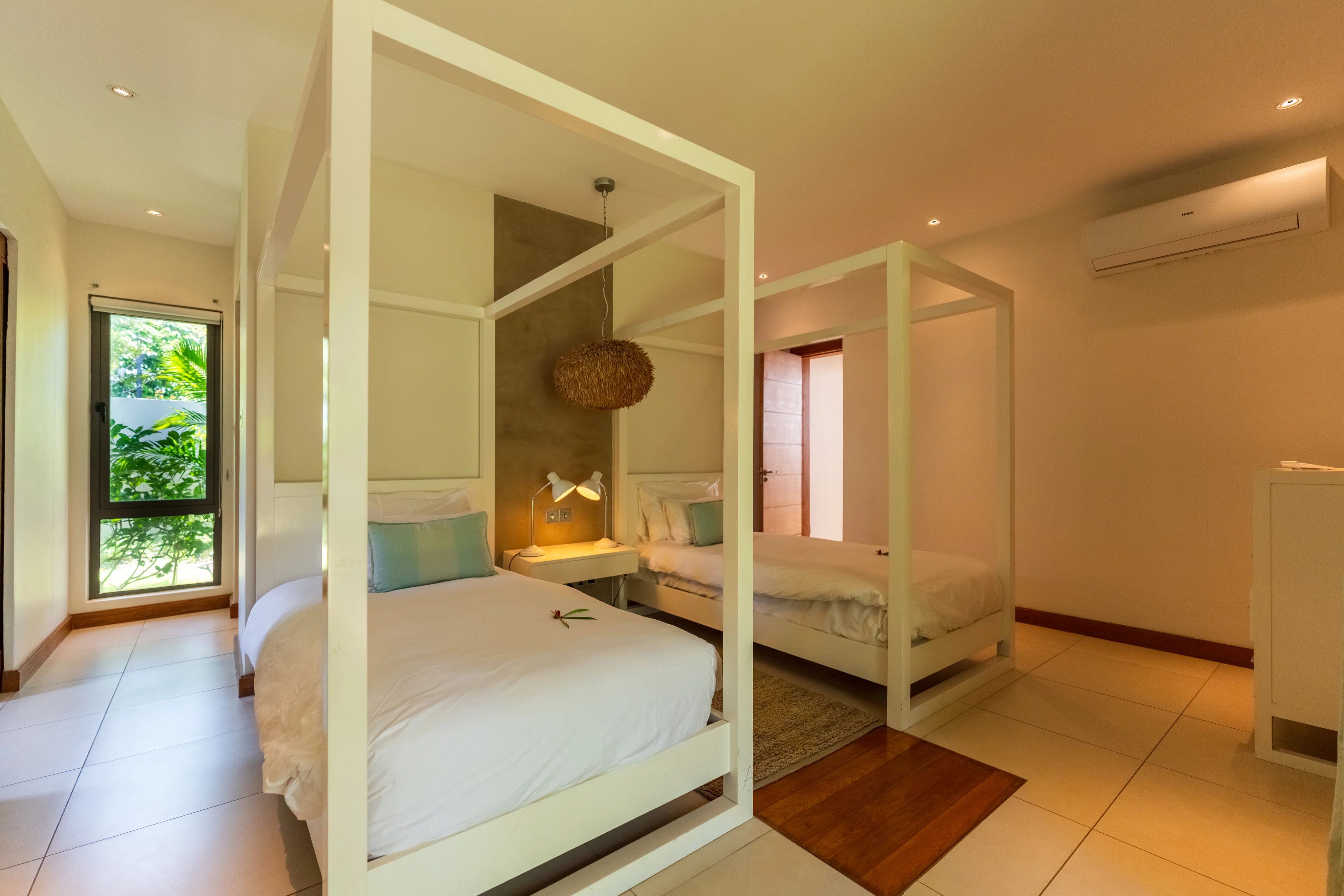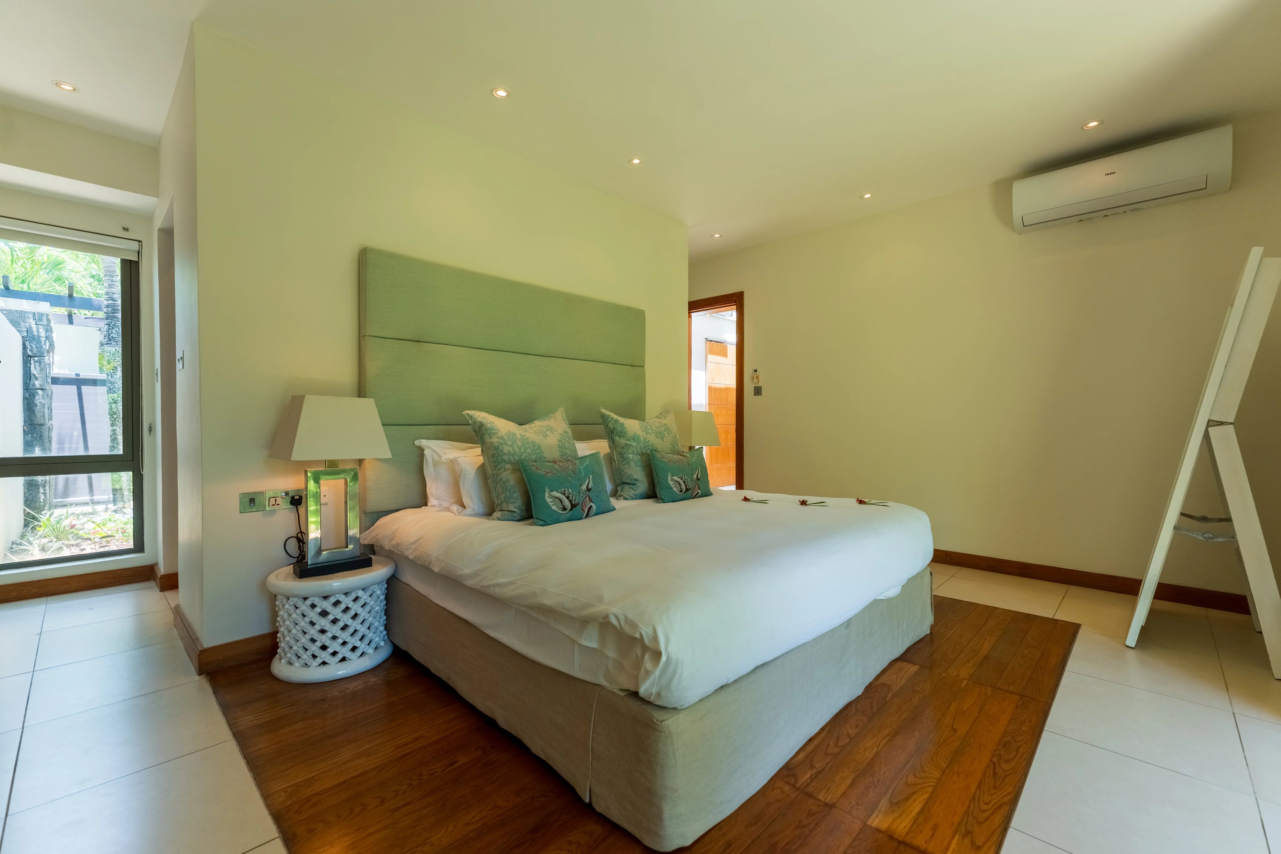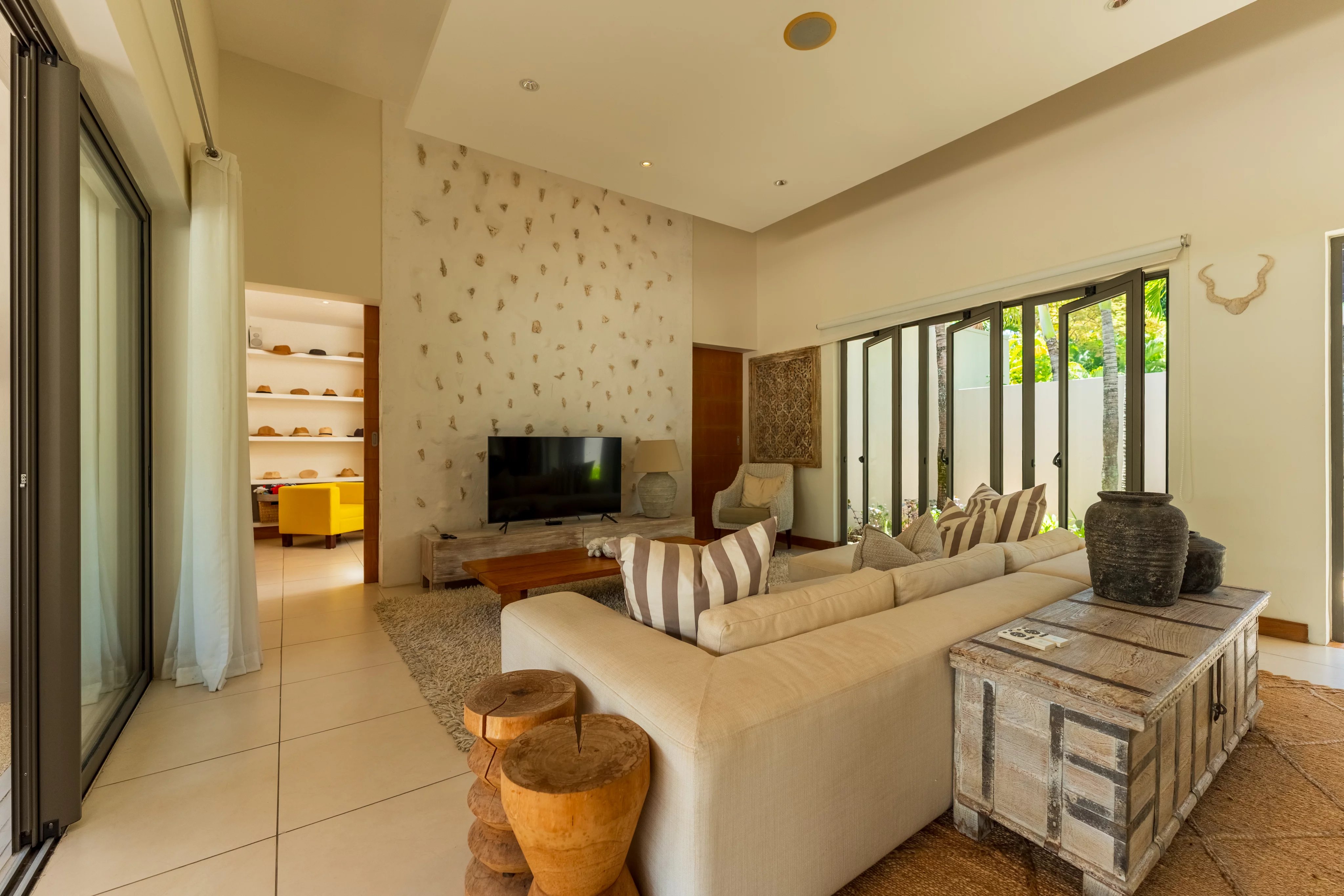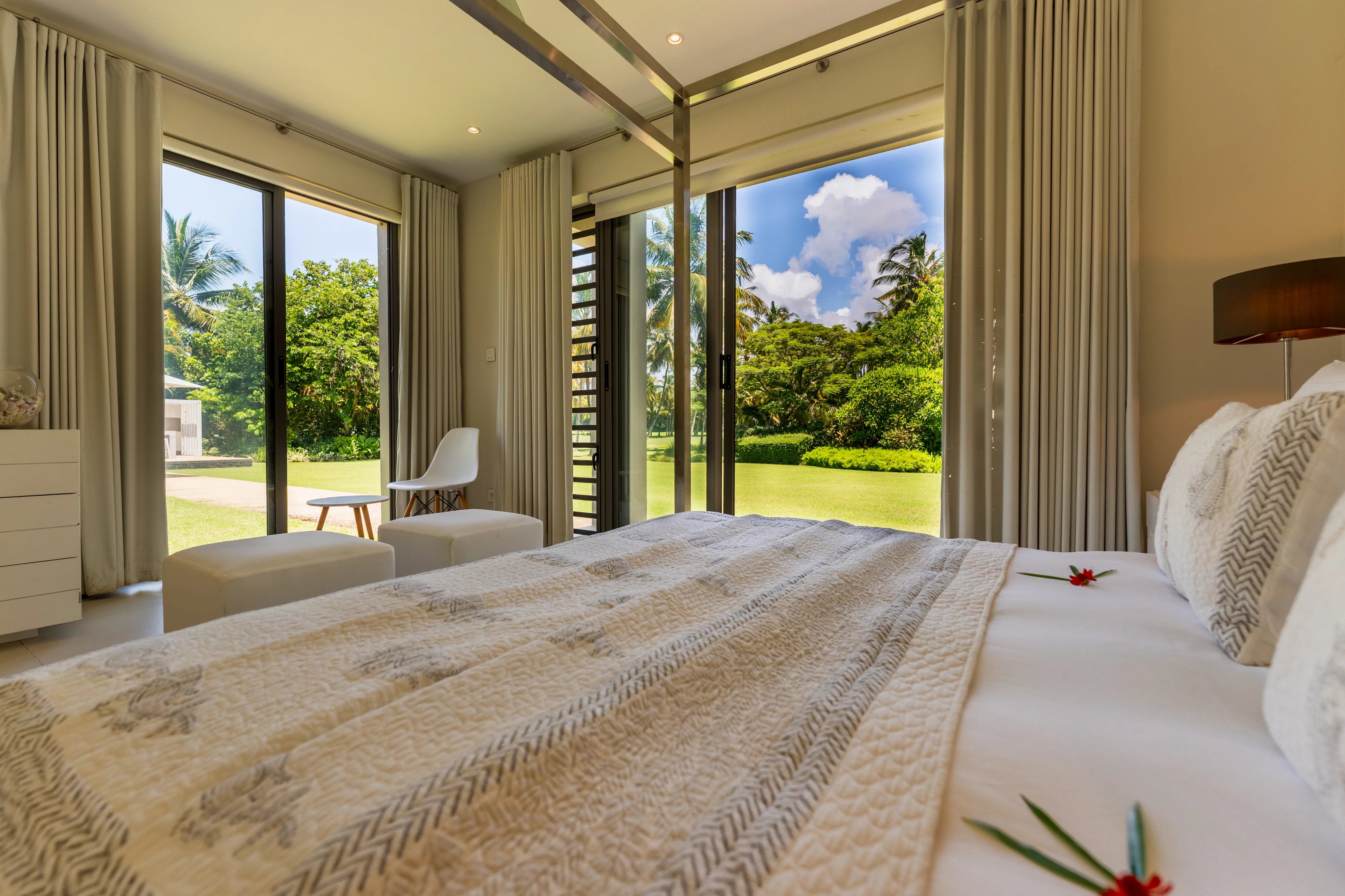 Elle dispose de trois chambres en suite dans la villa principale, chacune avec une salle de bains moderne et un accès direct au jardin. Deux autres chambres indépendantes en annexe, également en suite, offrent intimité et vue sur le jardin. Avec un total de cinq chambres, ce bien est particulièrement rare à Anahita.
