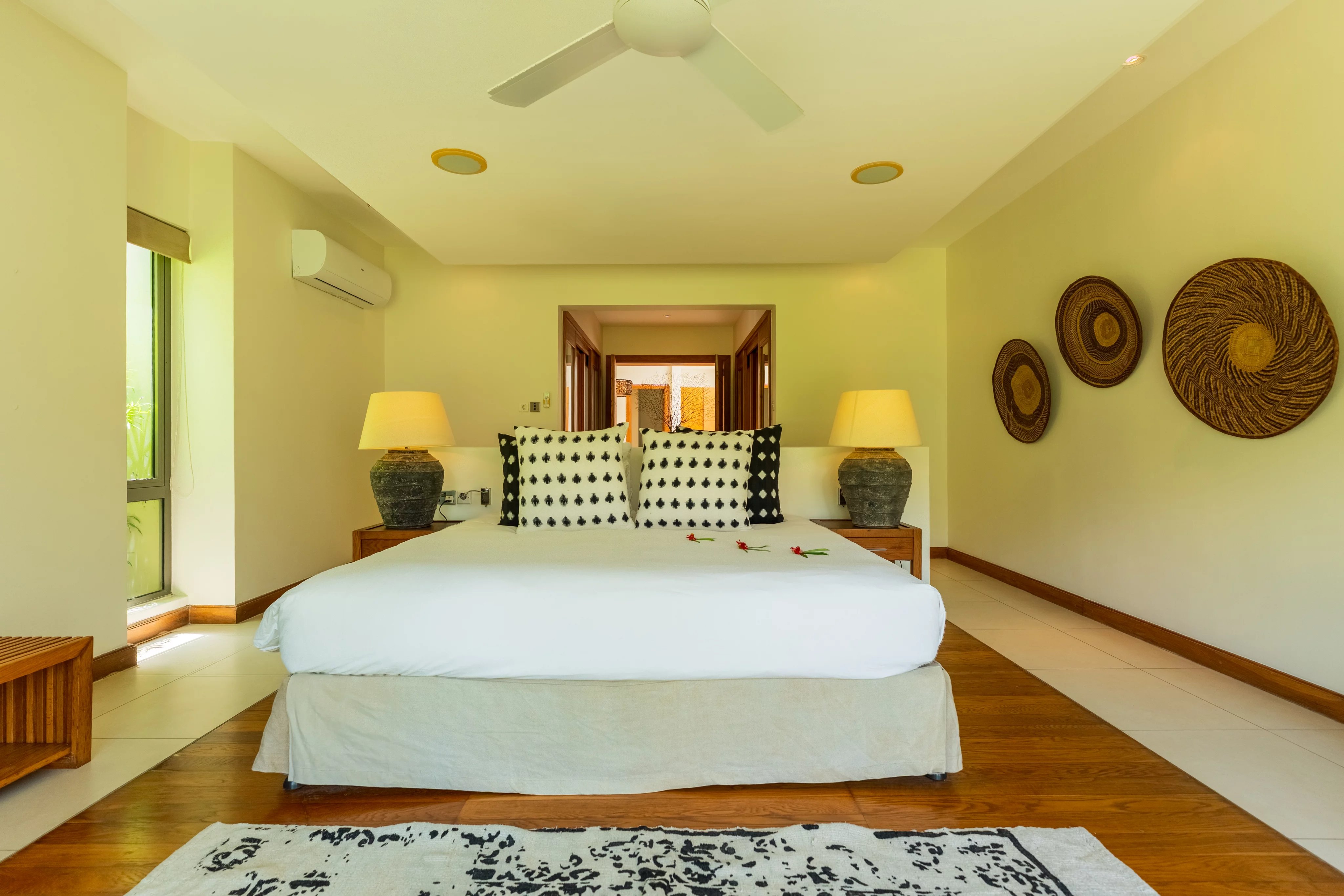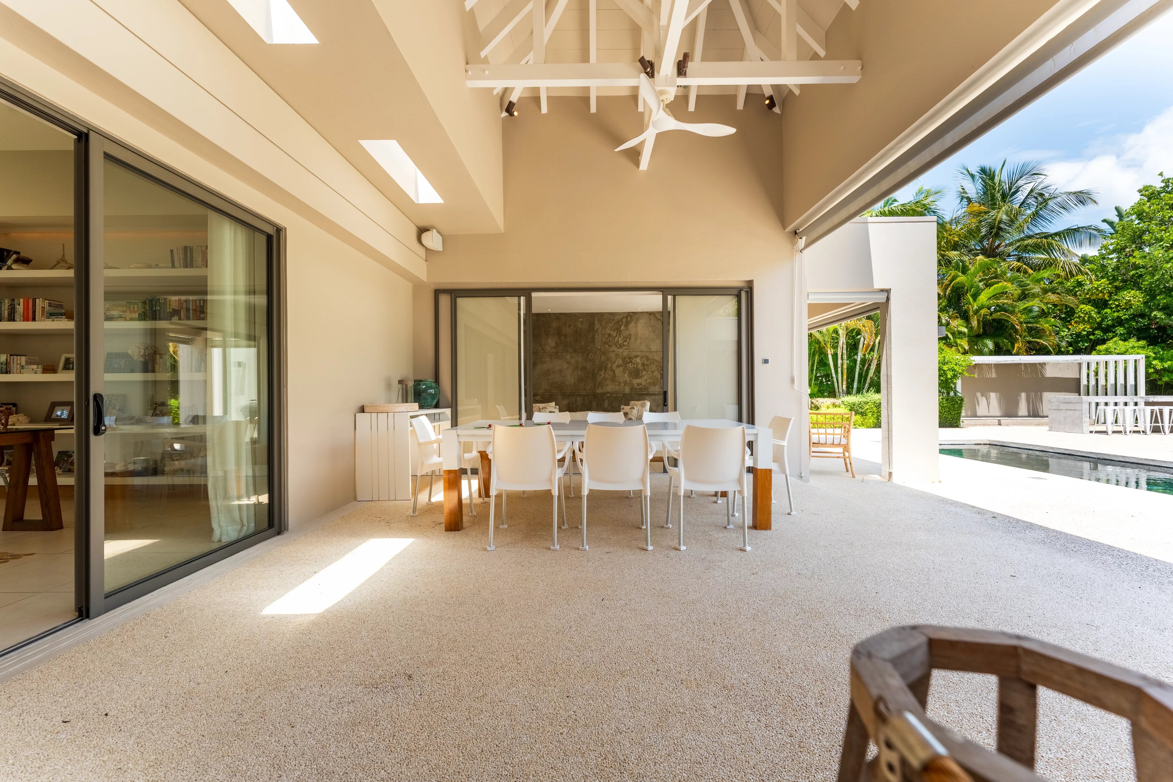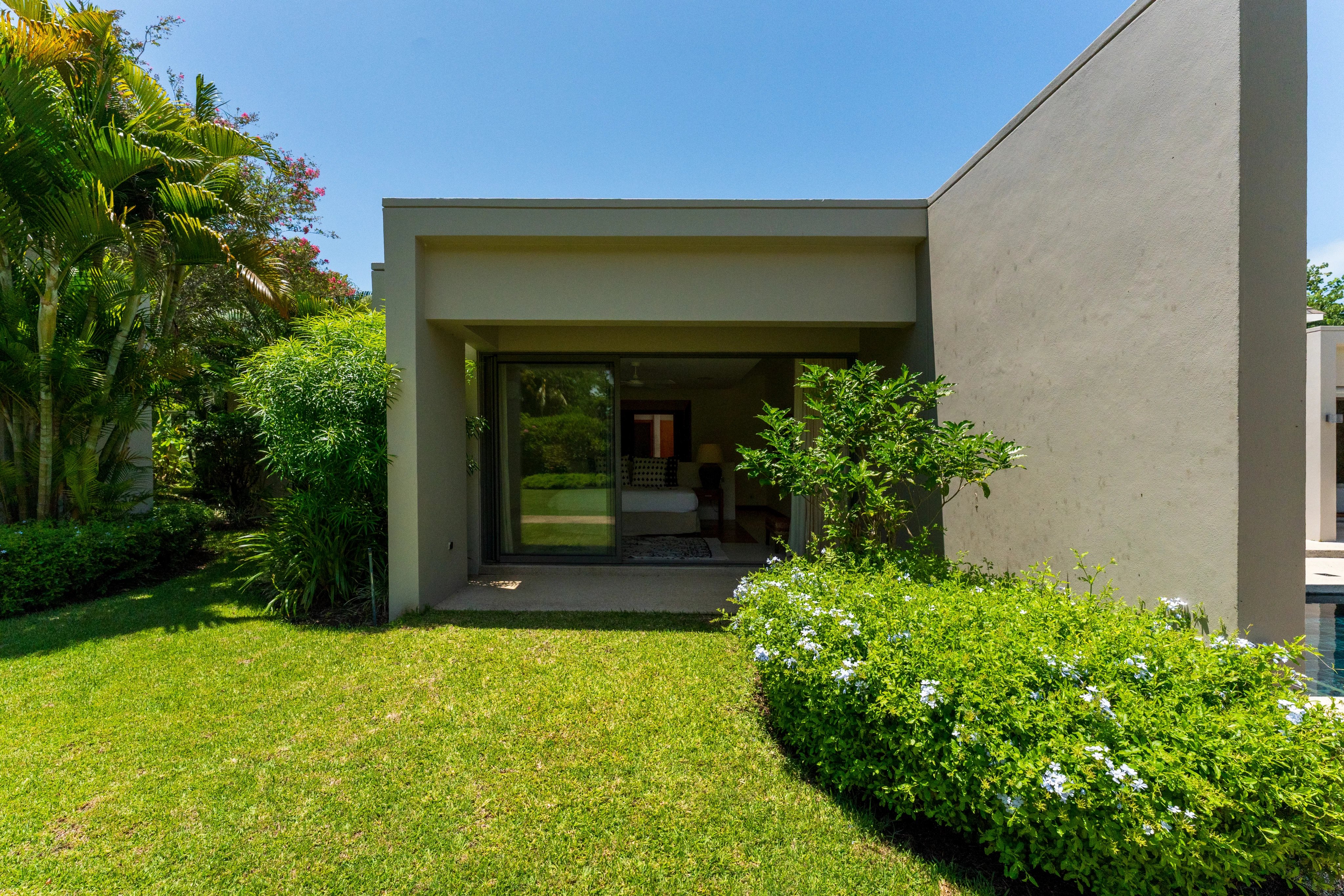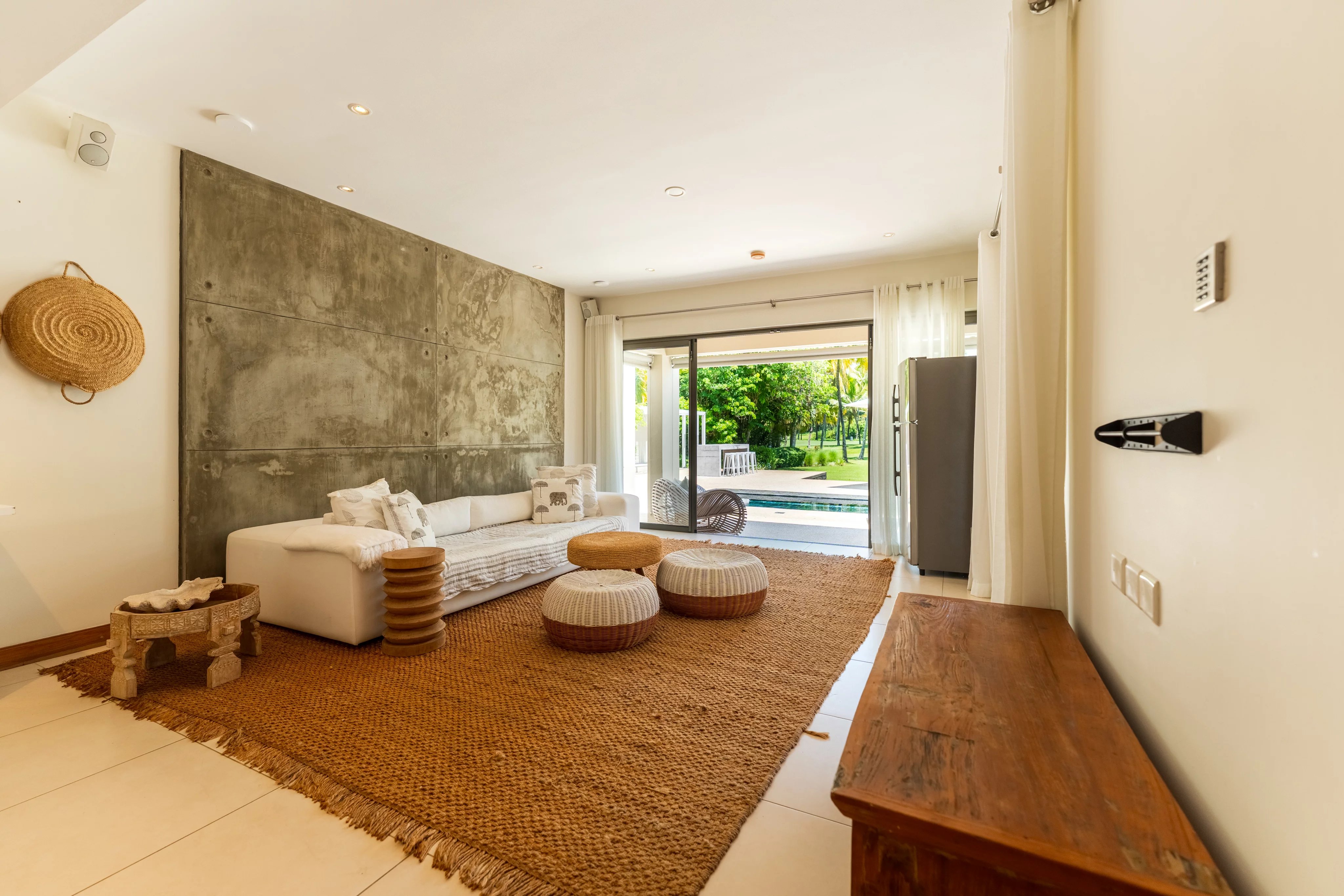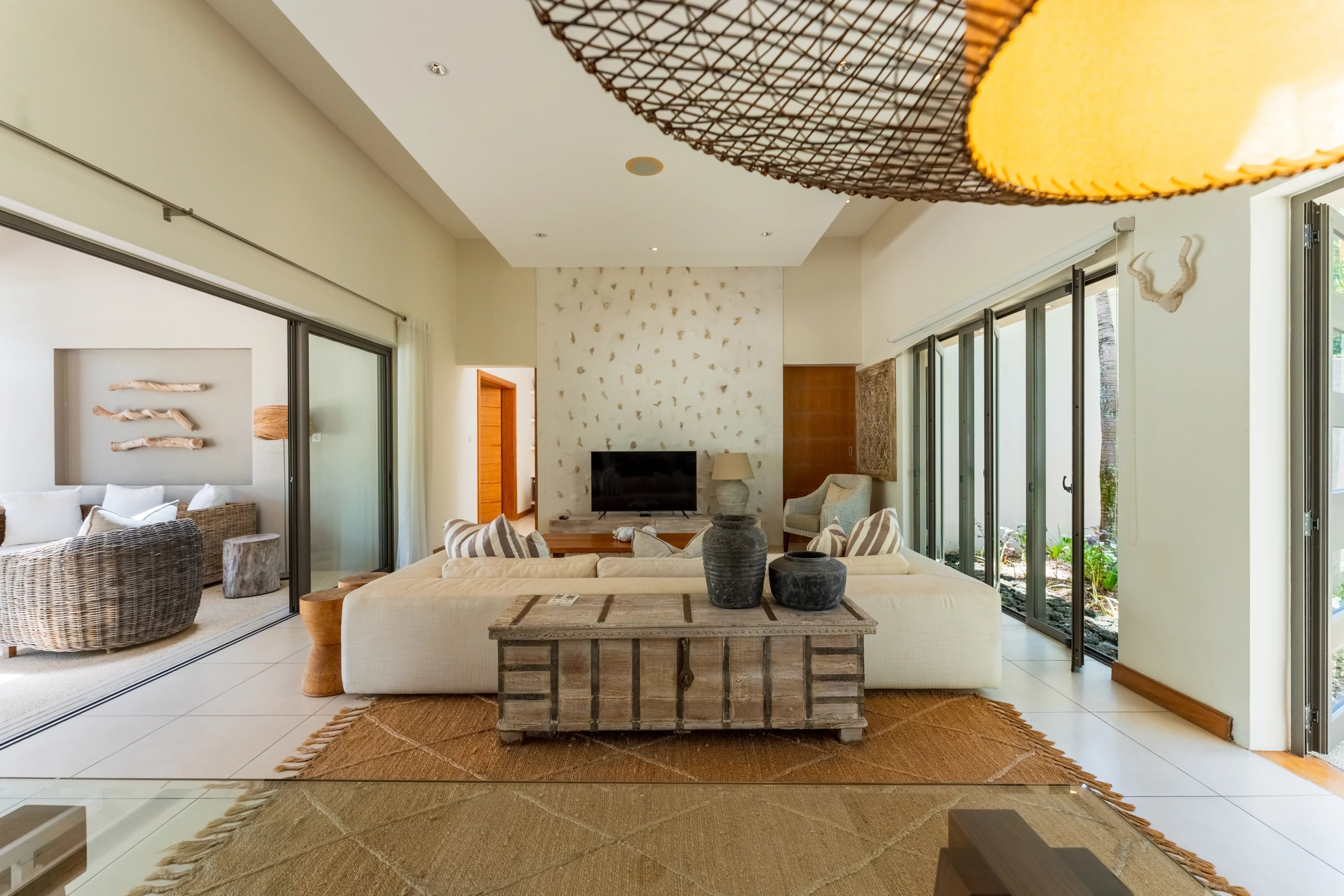 Elle dispose de trois chambres en suite dans la villa principale, chacune avec une salle de bains moderne et un accès direct au jardin. Deux autres chambres indépendantes en annexe, également en suite, offrent intimité et vue sur le jardin. Avec un total de cinq chambres, ce bien est particulièrement rare à Anahita.
