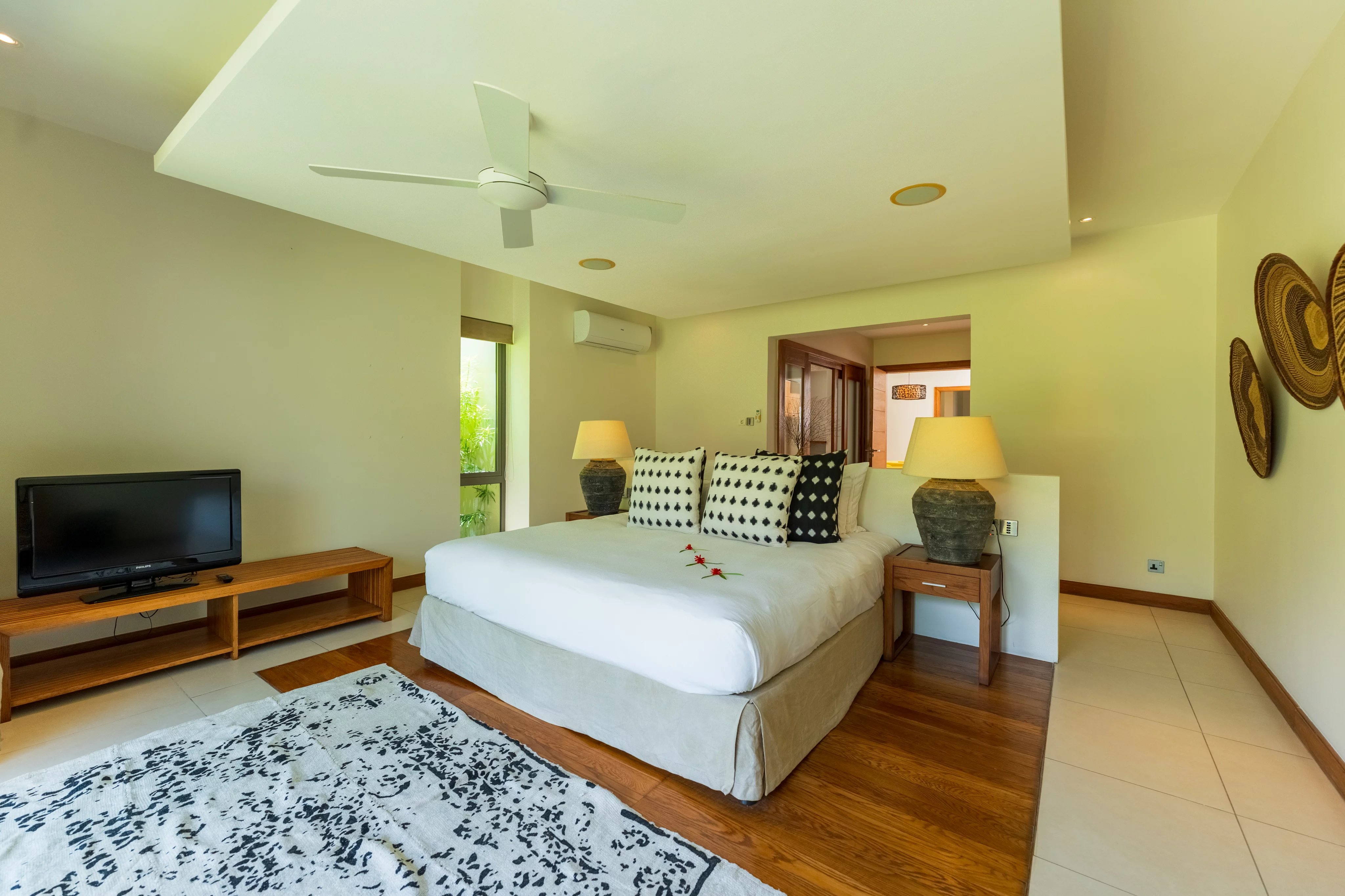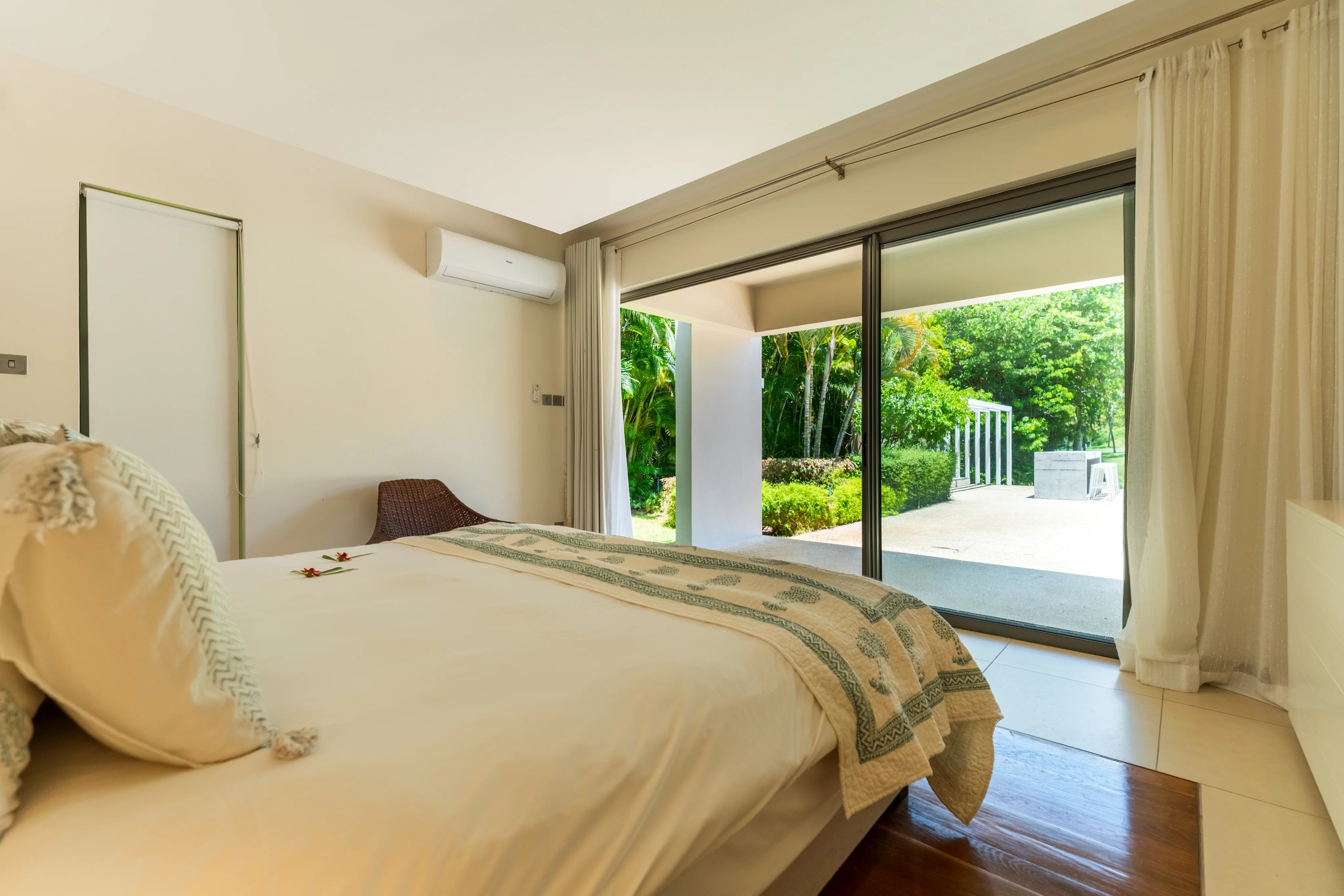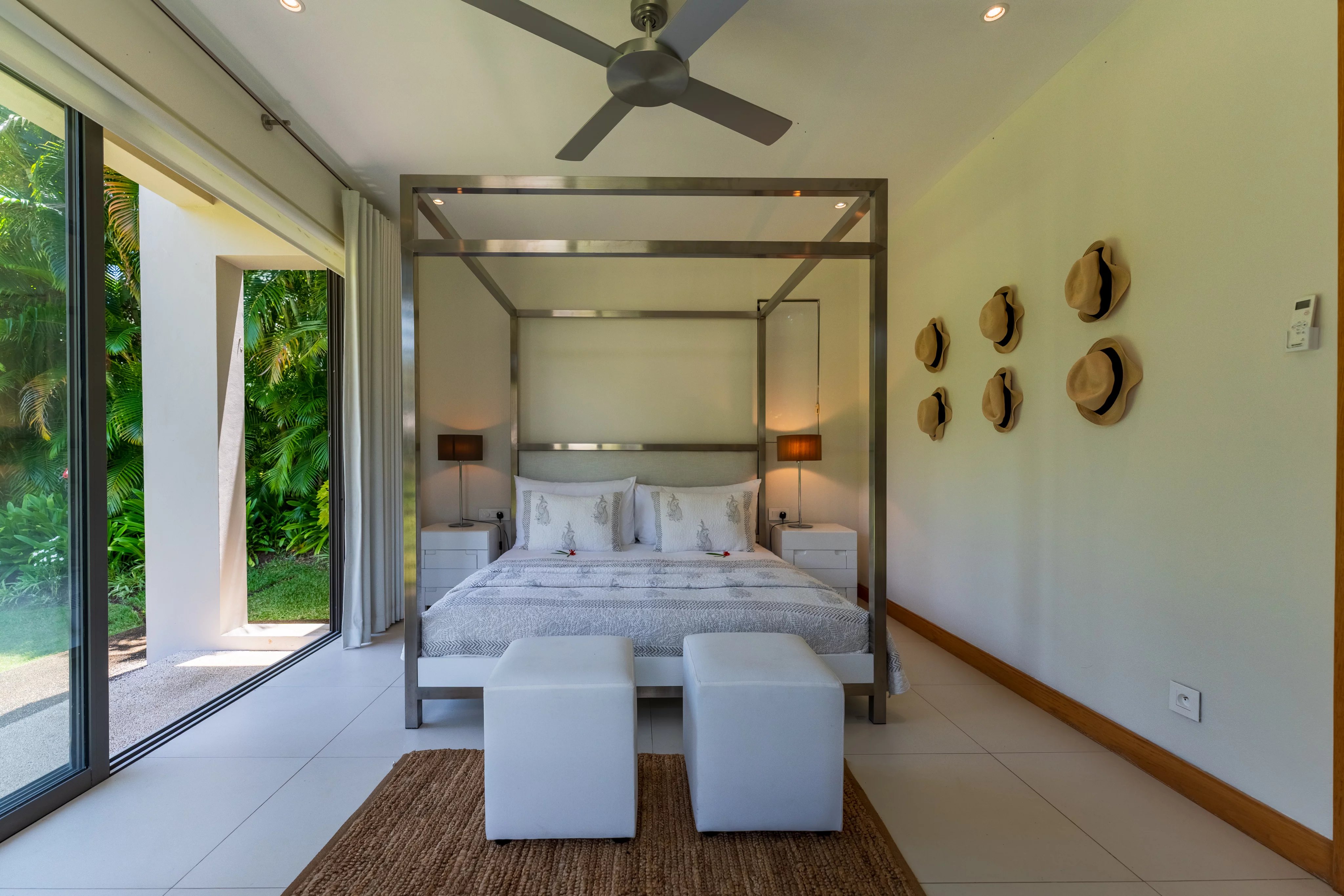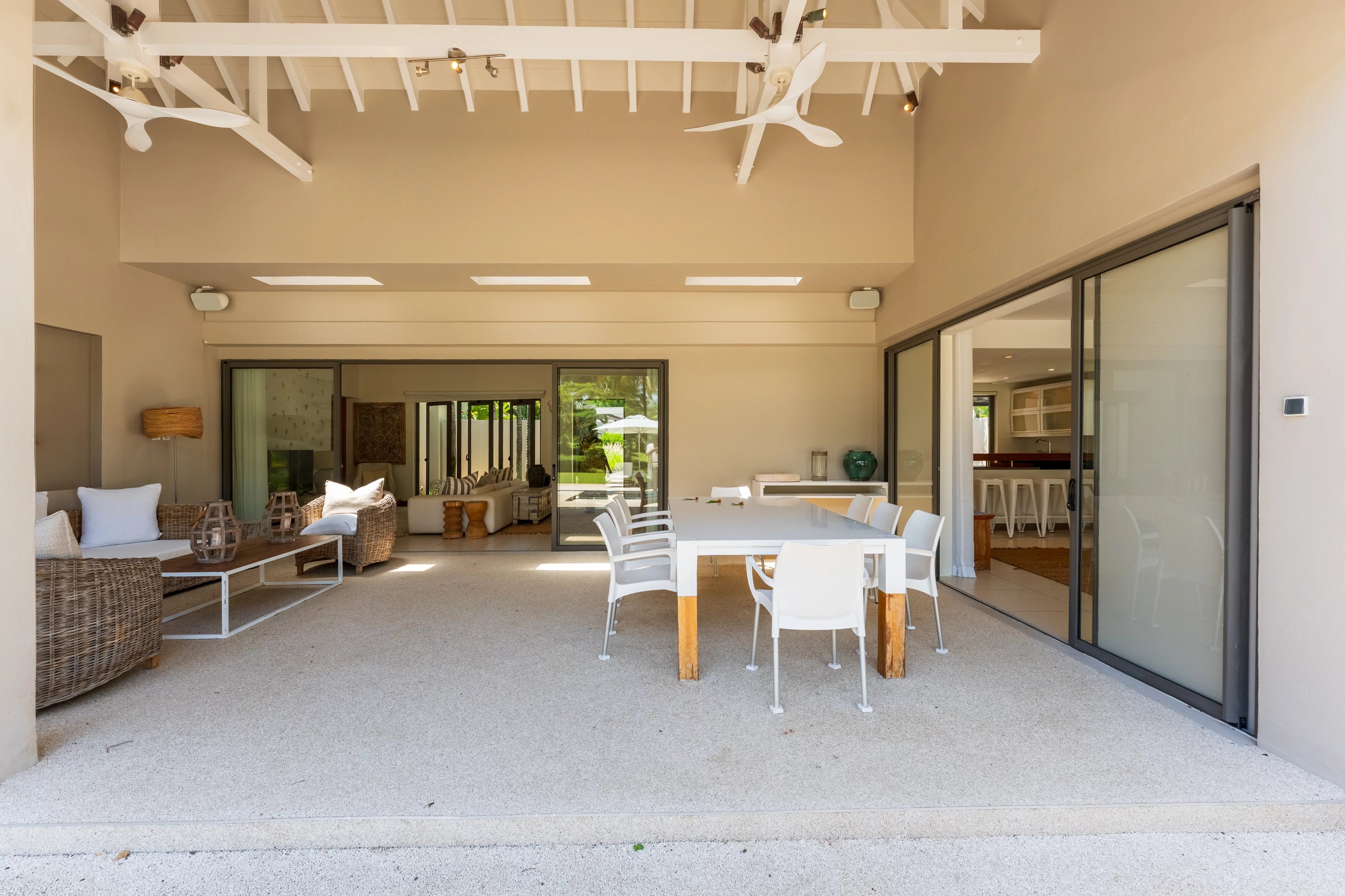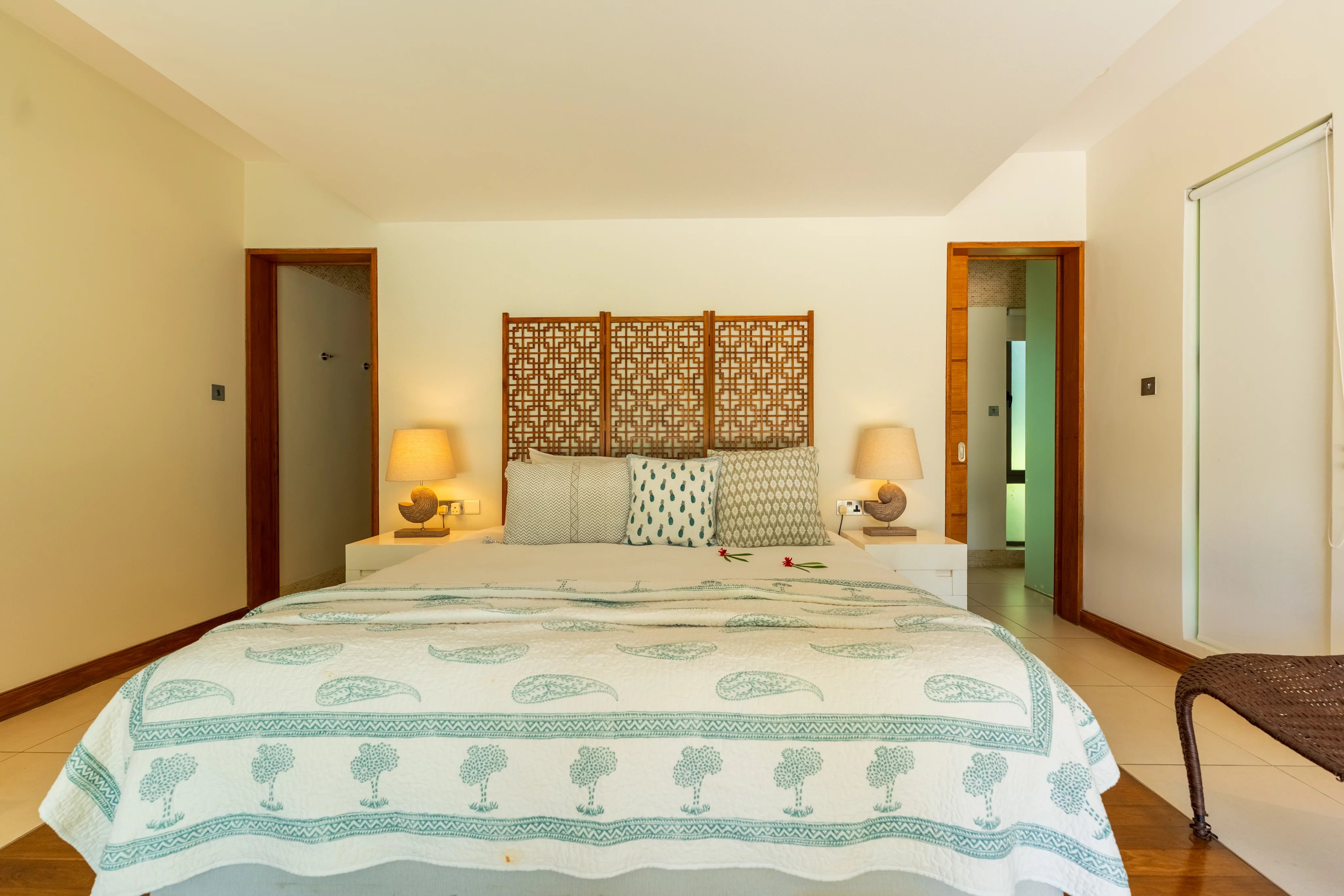 Elle dispose de trois chambres en suite dans la villa principale, chacune avec une salle de bains moderne et un accès direct au jardin. Deux autres chambres indépendantes en annexe, également en suite, offrent intimité et vue sur le jardin. Avec un total de cinq chambres, ce bien est particulièrement rare à Anahita.