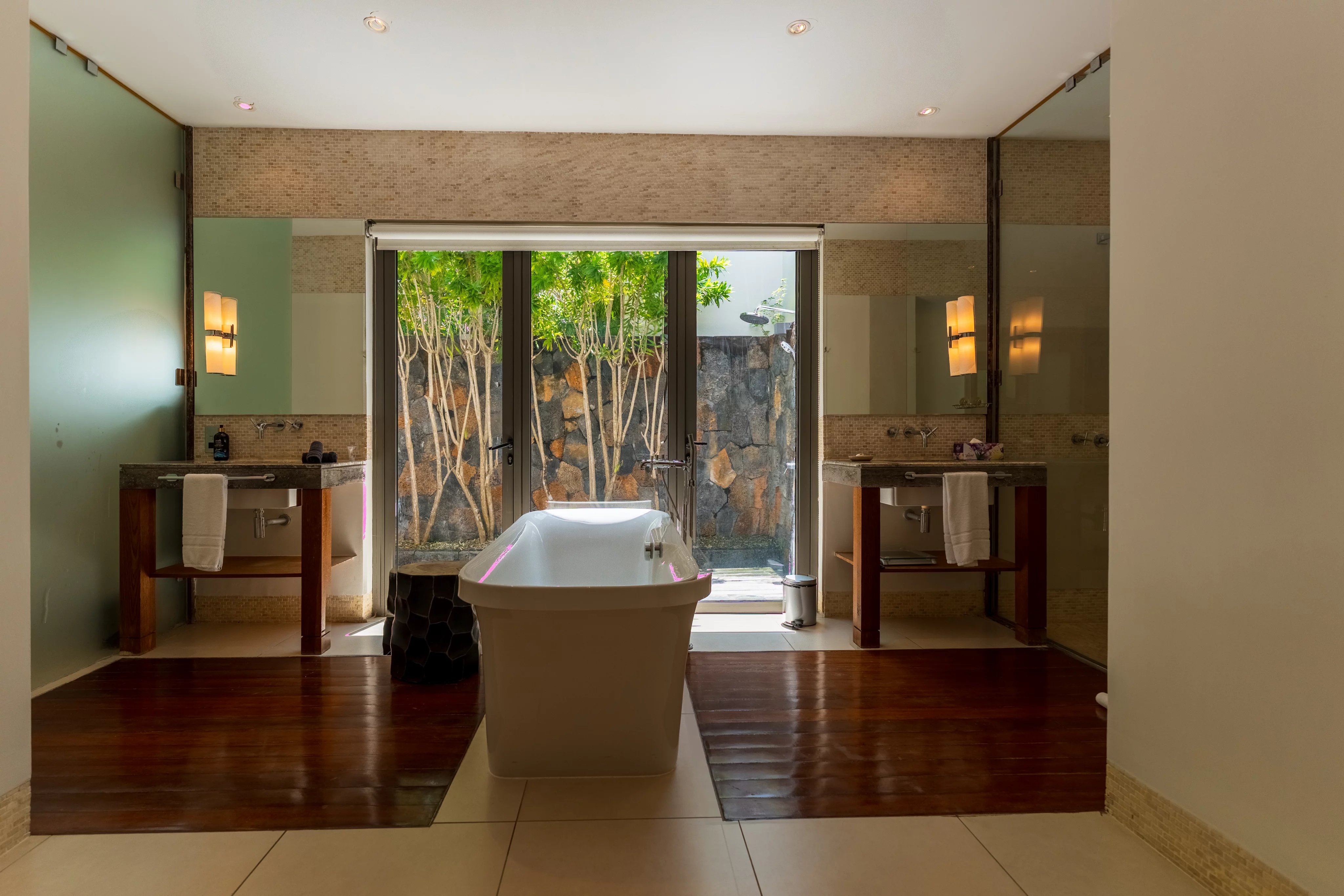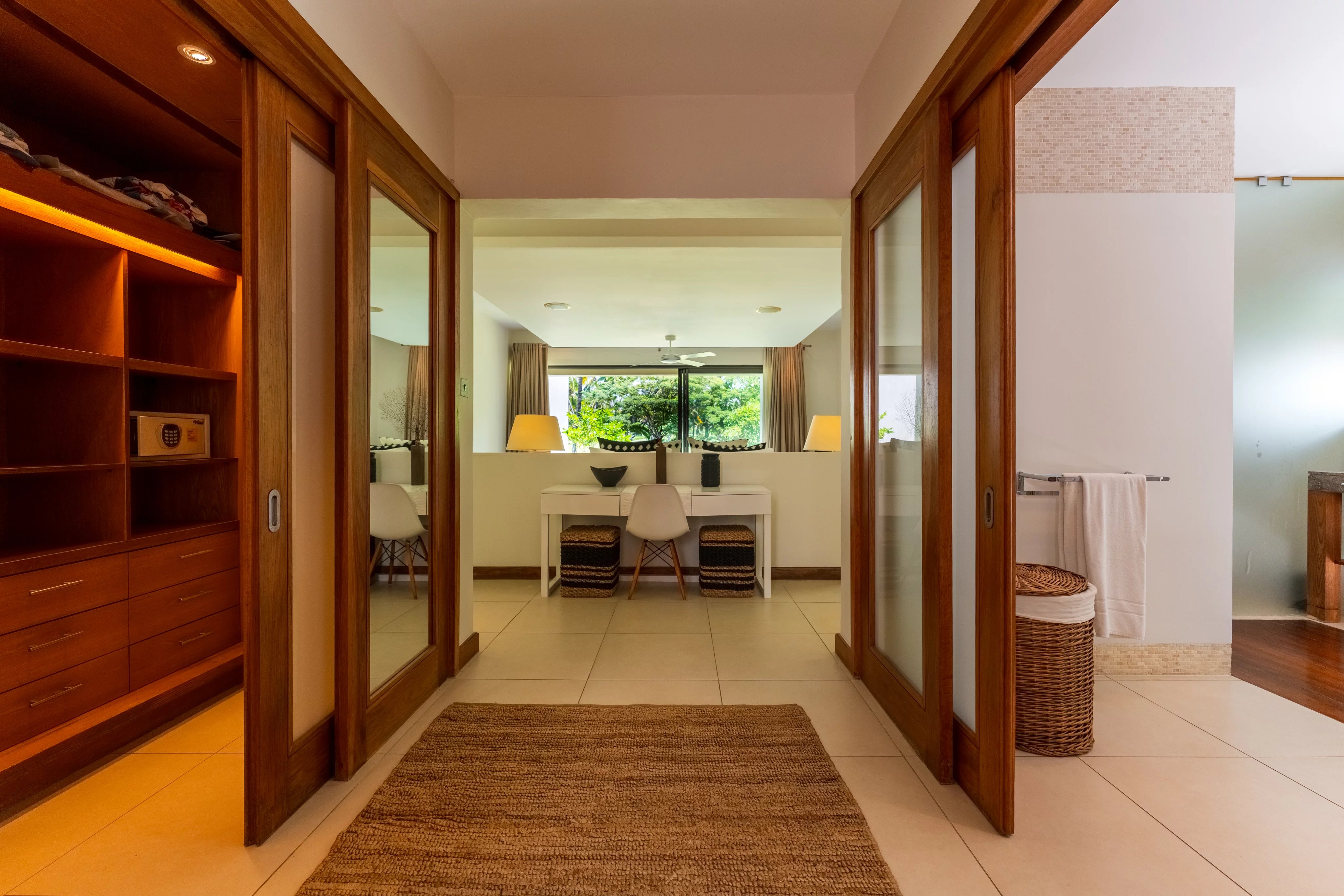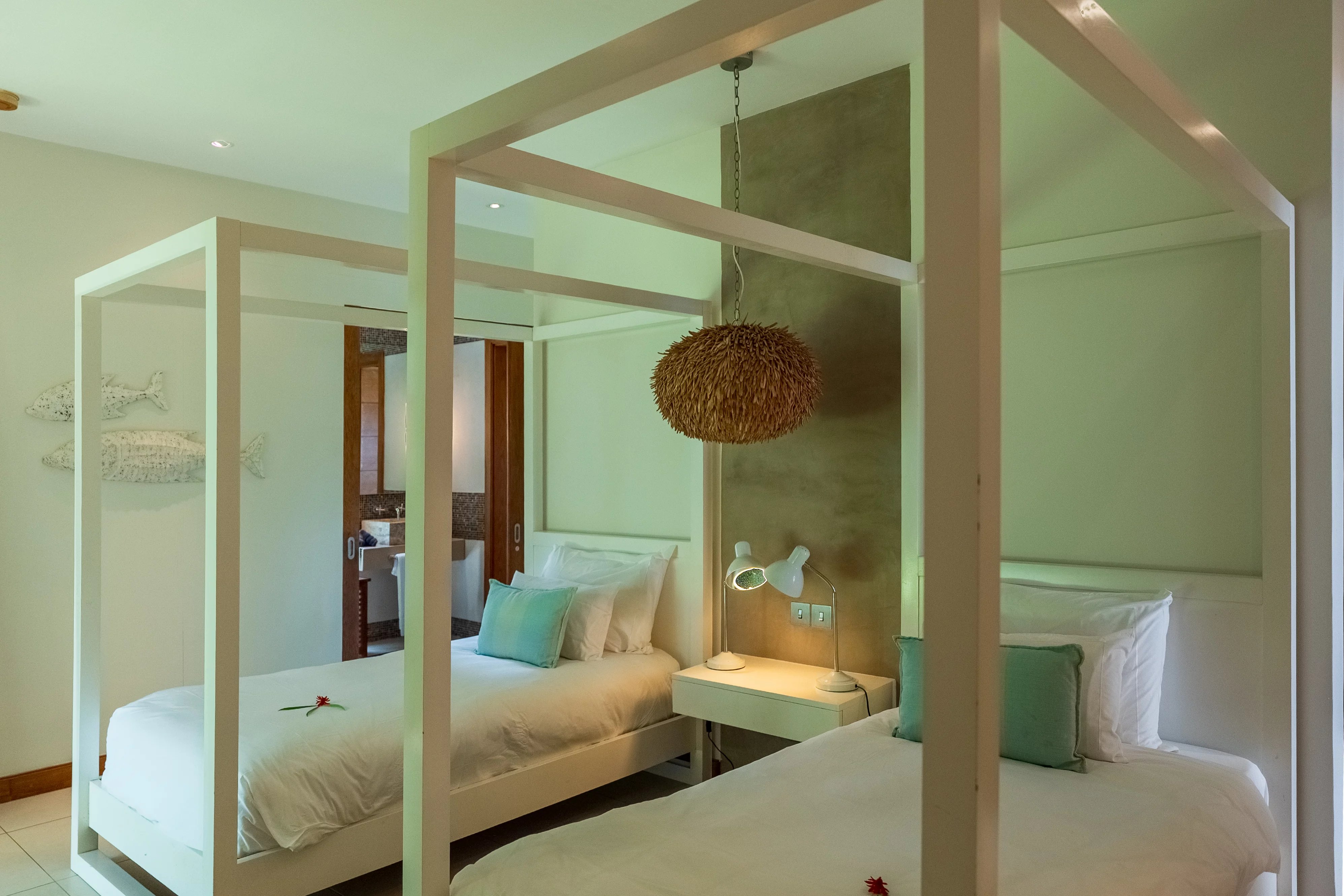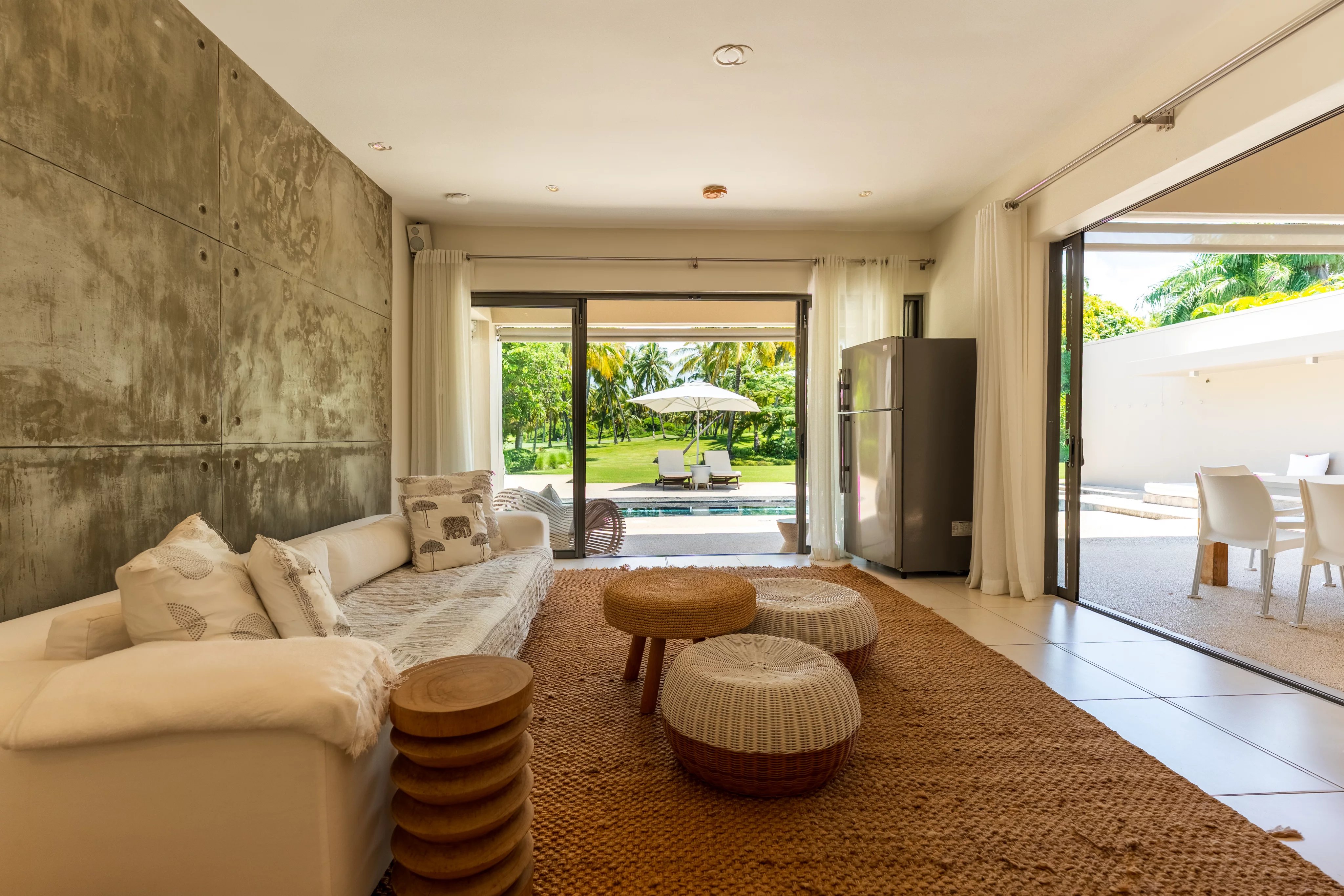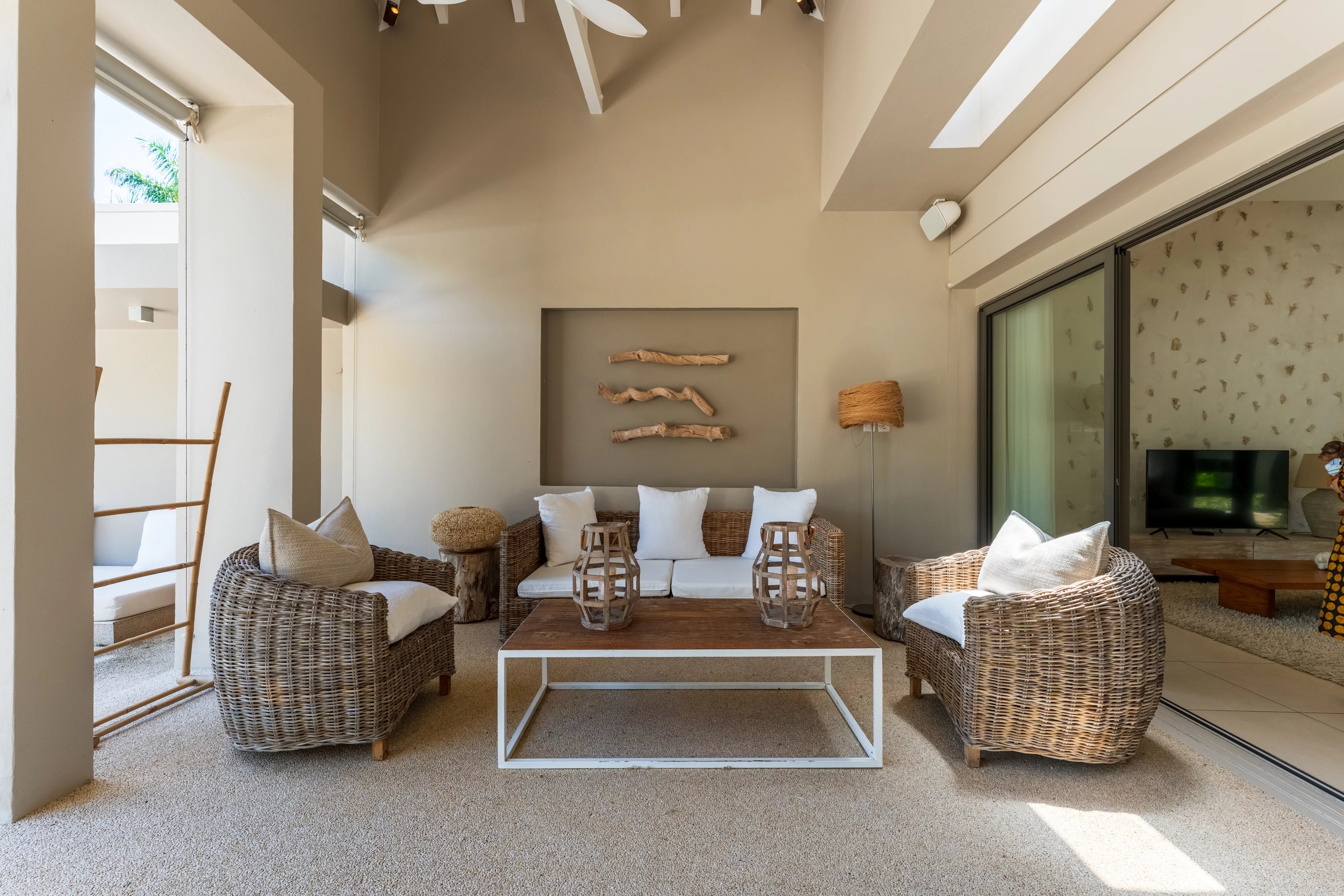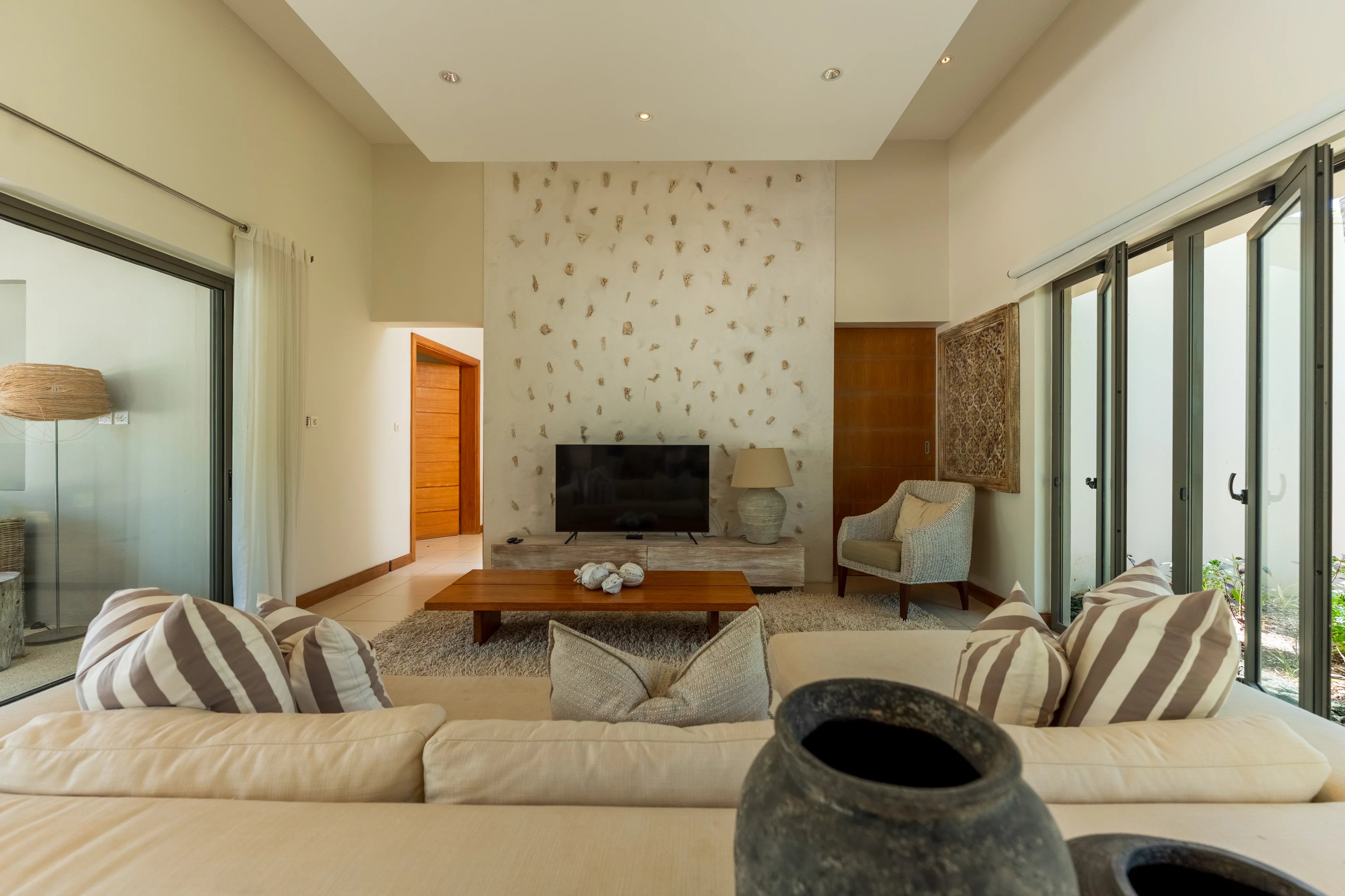 Elle dispose de trois chambres en suite dans la villa principale, chacune avec une salle de bains moderne et un accès direct au jardin. Deux autres chambres indépendantes en annexe, également en suite, offrent intimité et vue sur le jardin. Avec un total de cinq chambres, ce bien est particulièrement rare à Anahita.