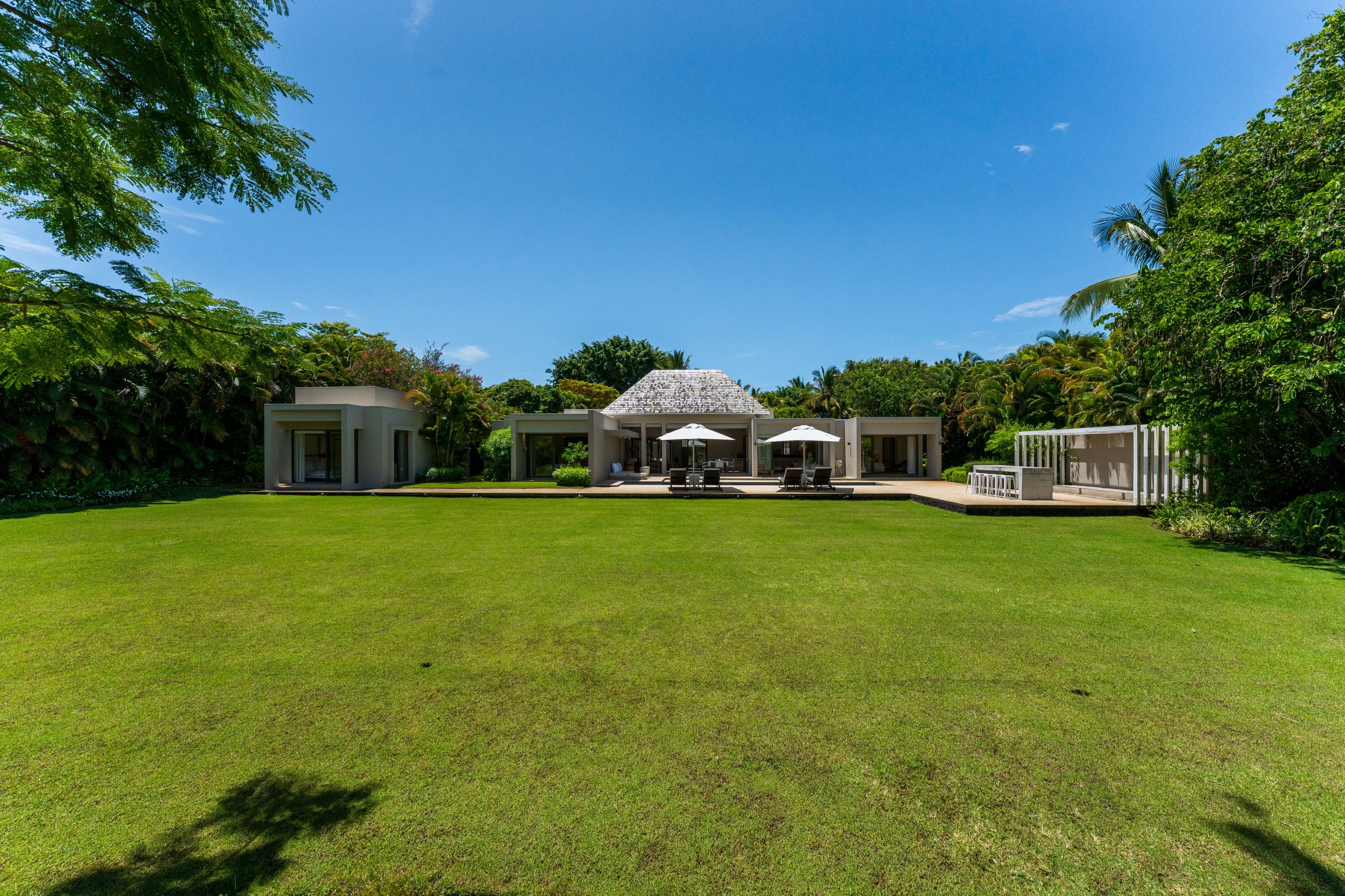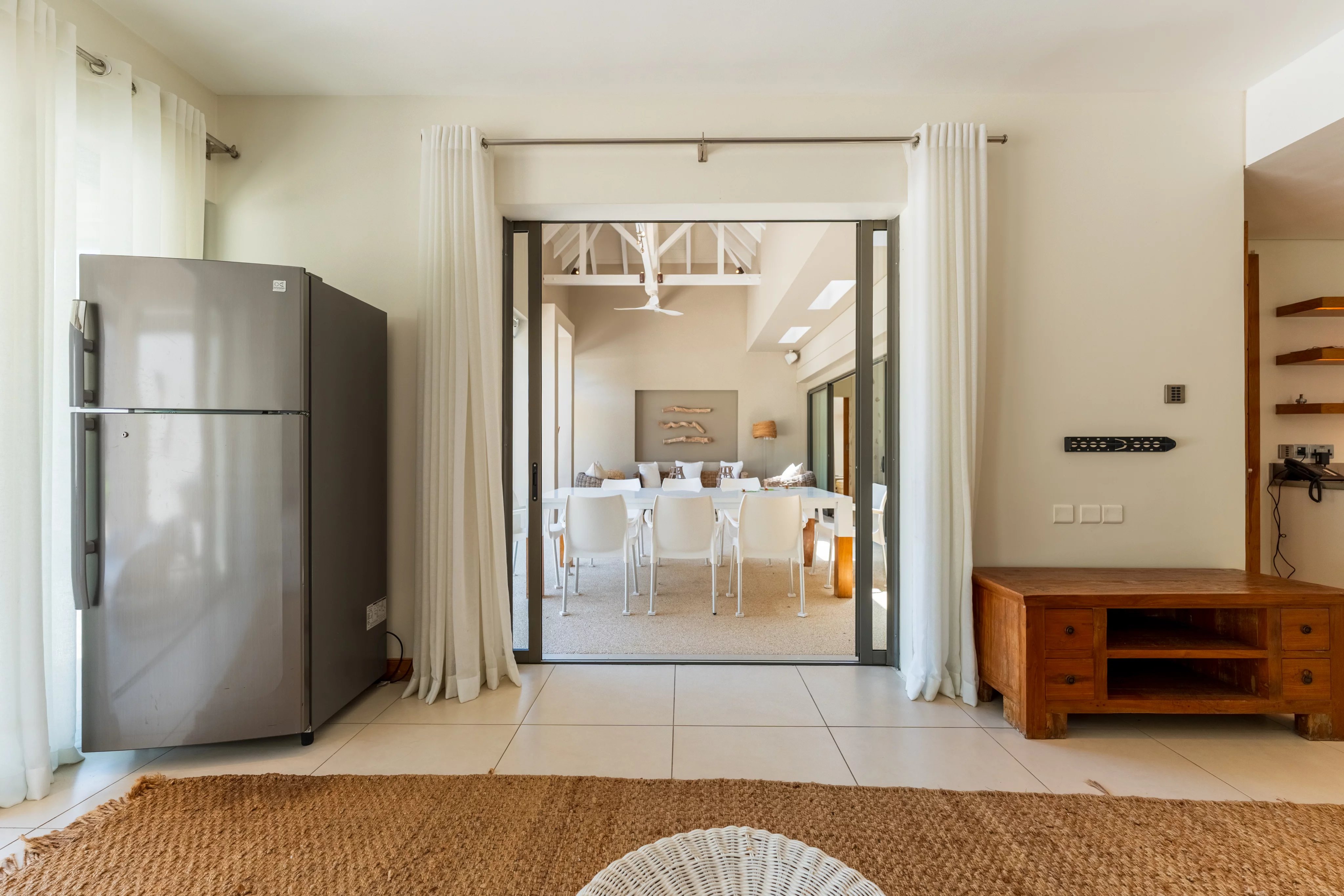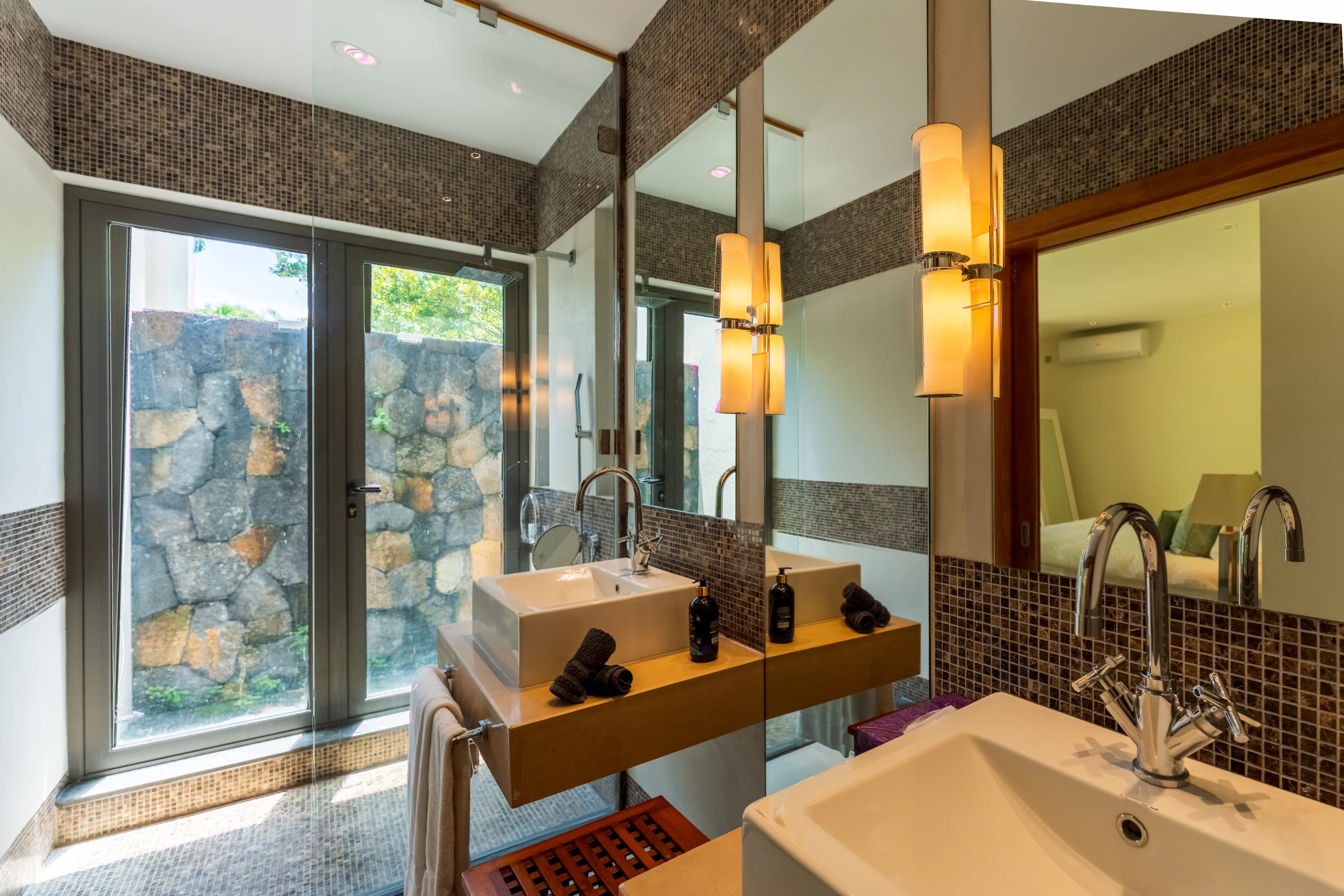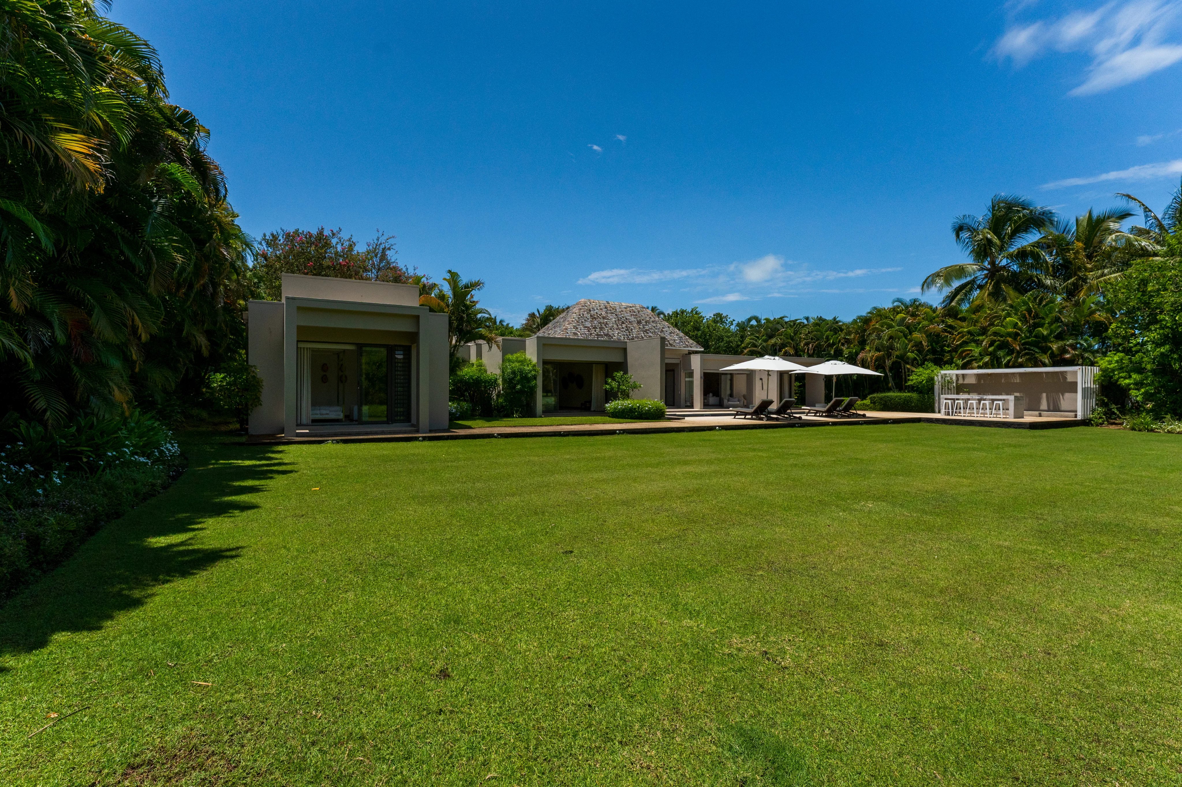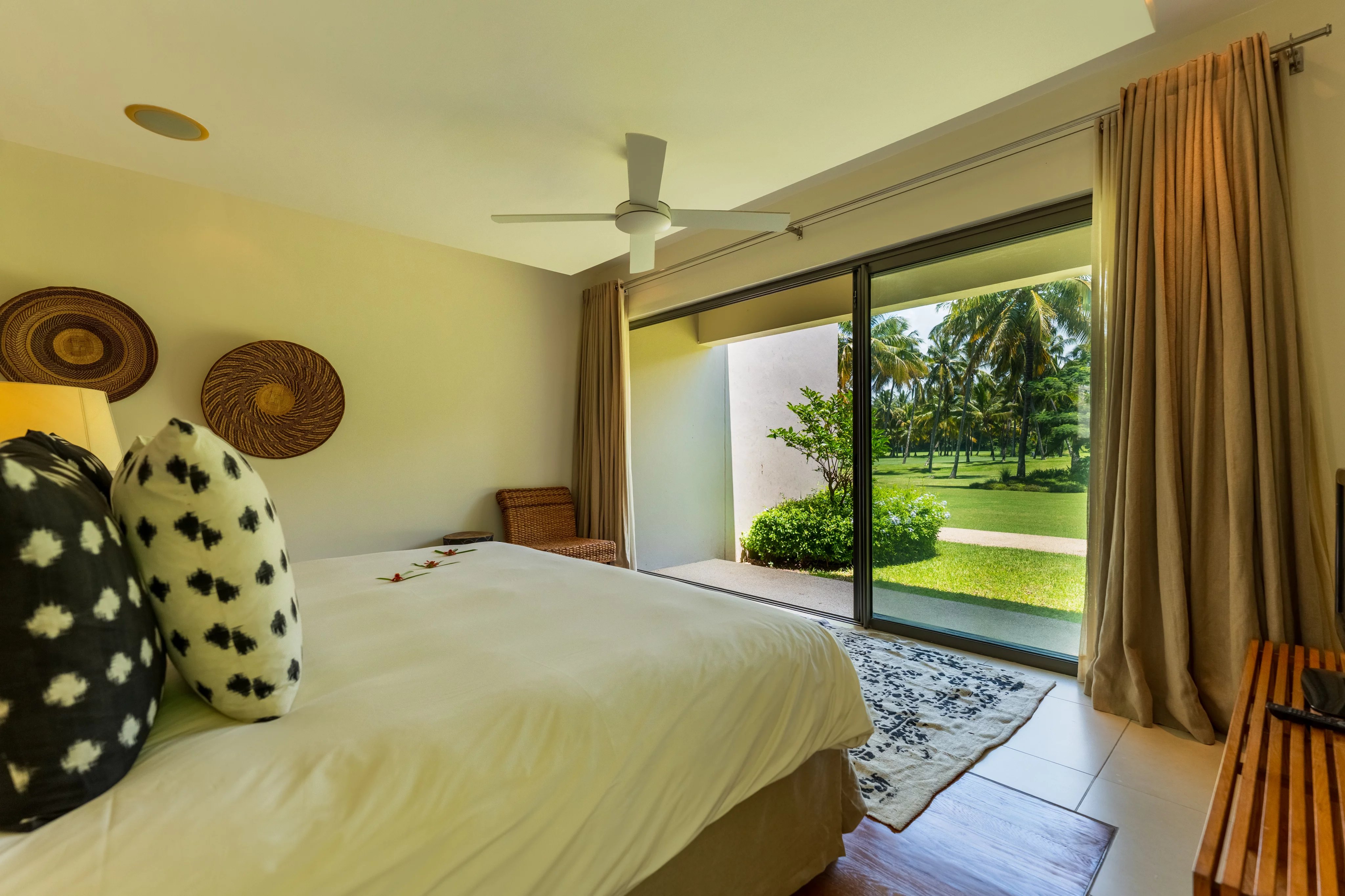 Elle dispose de trois chambres en suite dans la villa principale, chacune avec une salle de bains moderne et un accès direct au jardin. Deux autres chambres indépendantes en annexe, également en suite, offrent intimité et vue sur le jardin. Avec un total de cinq chambres, ce bien est particulièrement rare à Anahita.