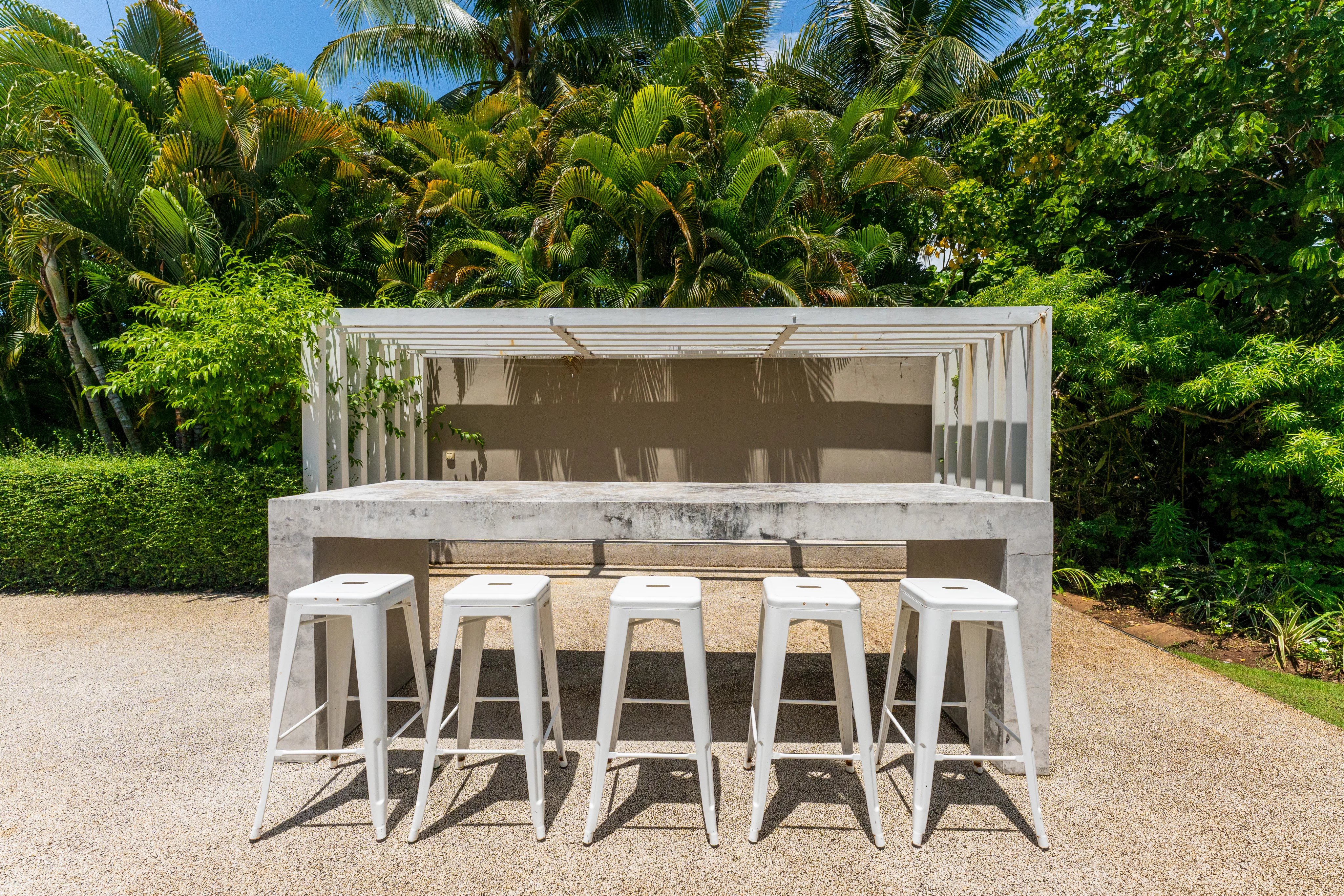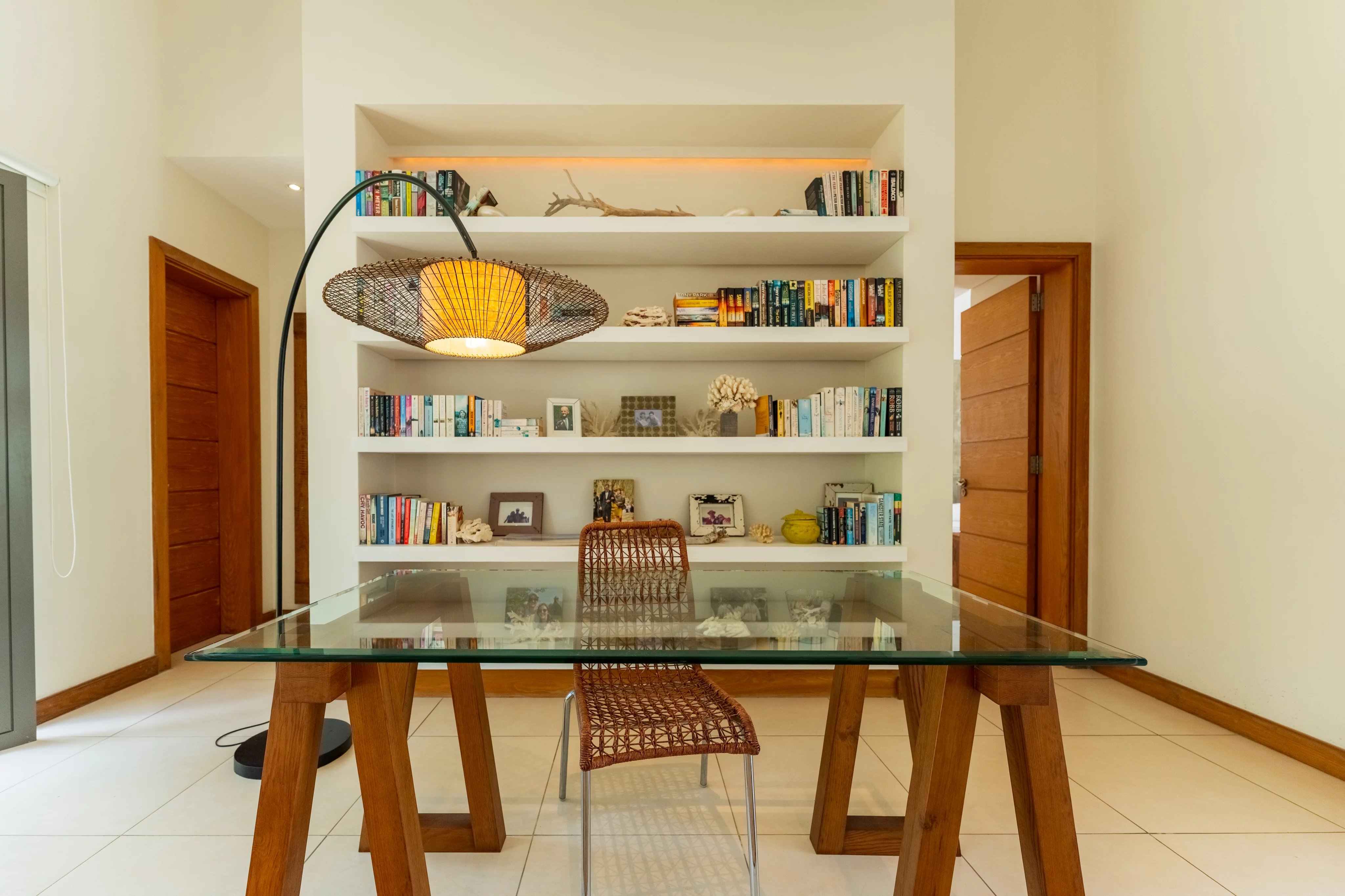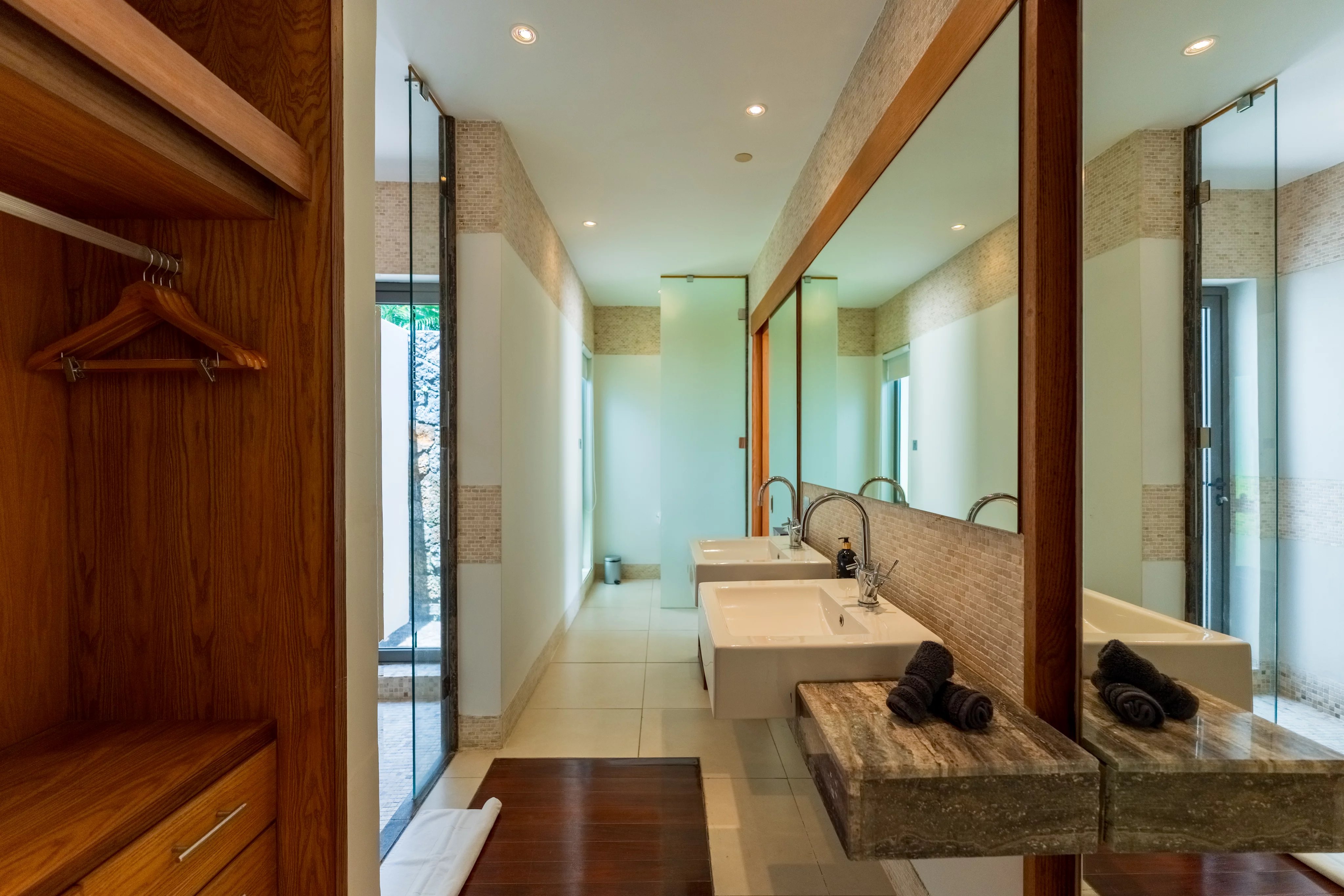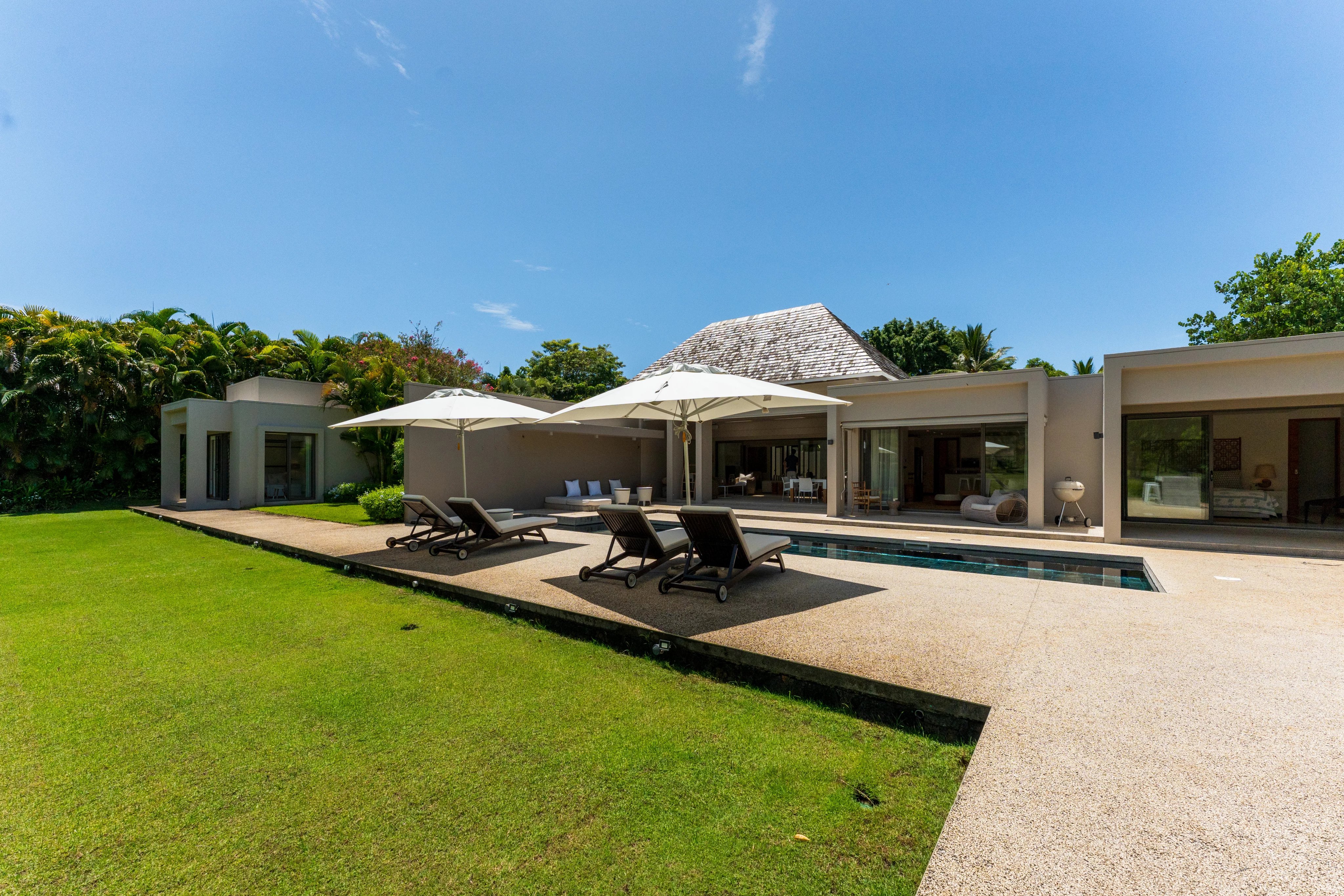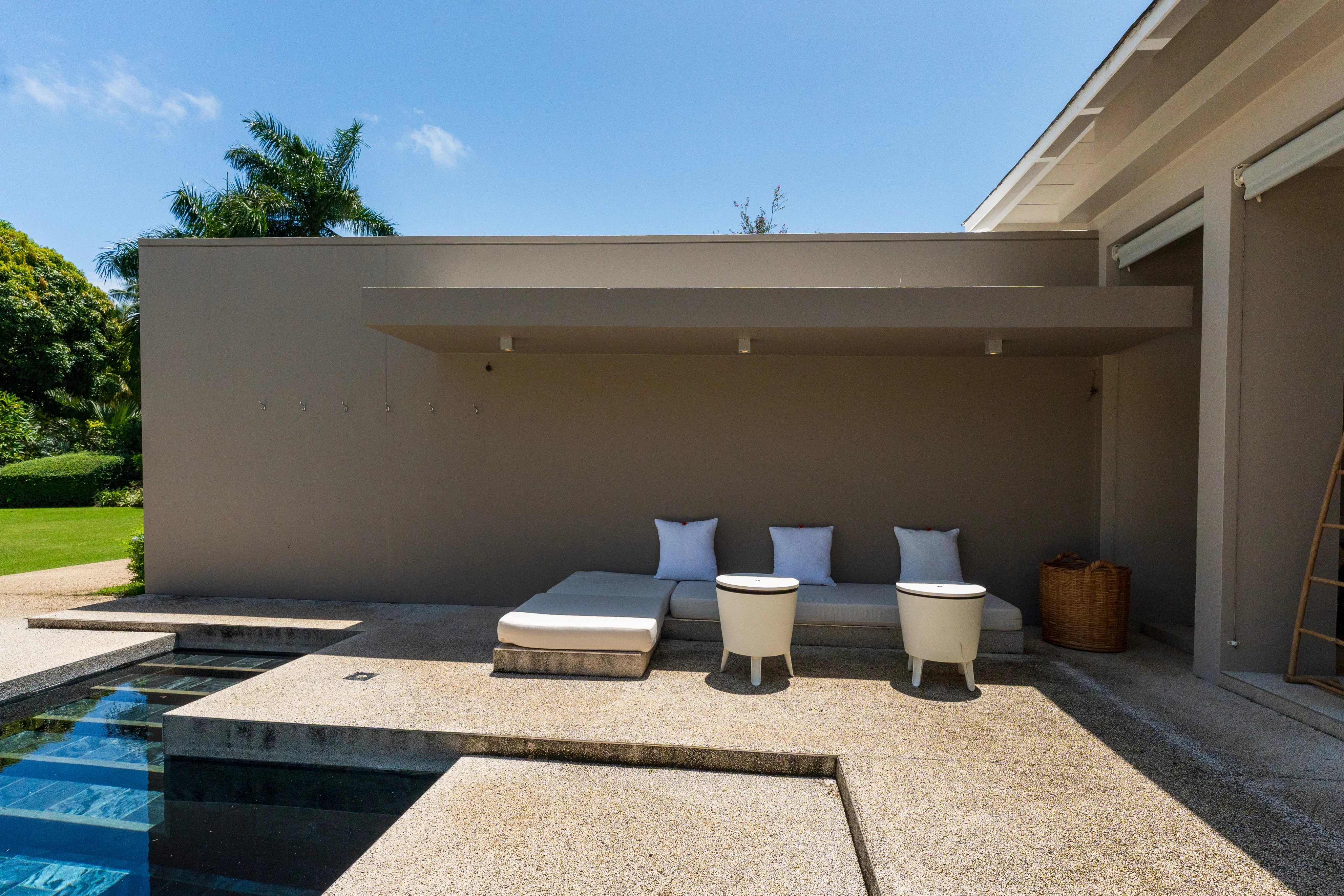Elle dispose de trois chambres en suite dans la villa principale, chacune avec une salle de bains moderne et un accès direct au jardin. Deux autres chambres indépendantes en annexe, également en suite, offrent intimité et vue sur le jardin. Avec un total de cinq chambres, ce bien est particulièrement rare à Anahita.