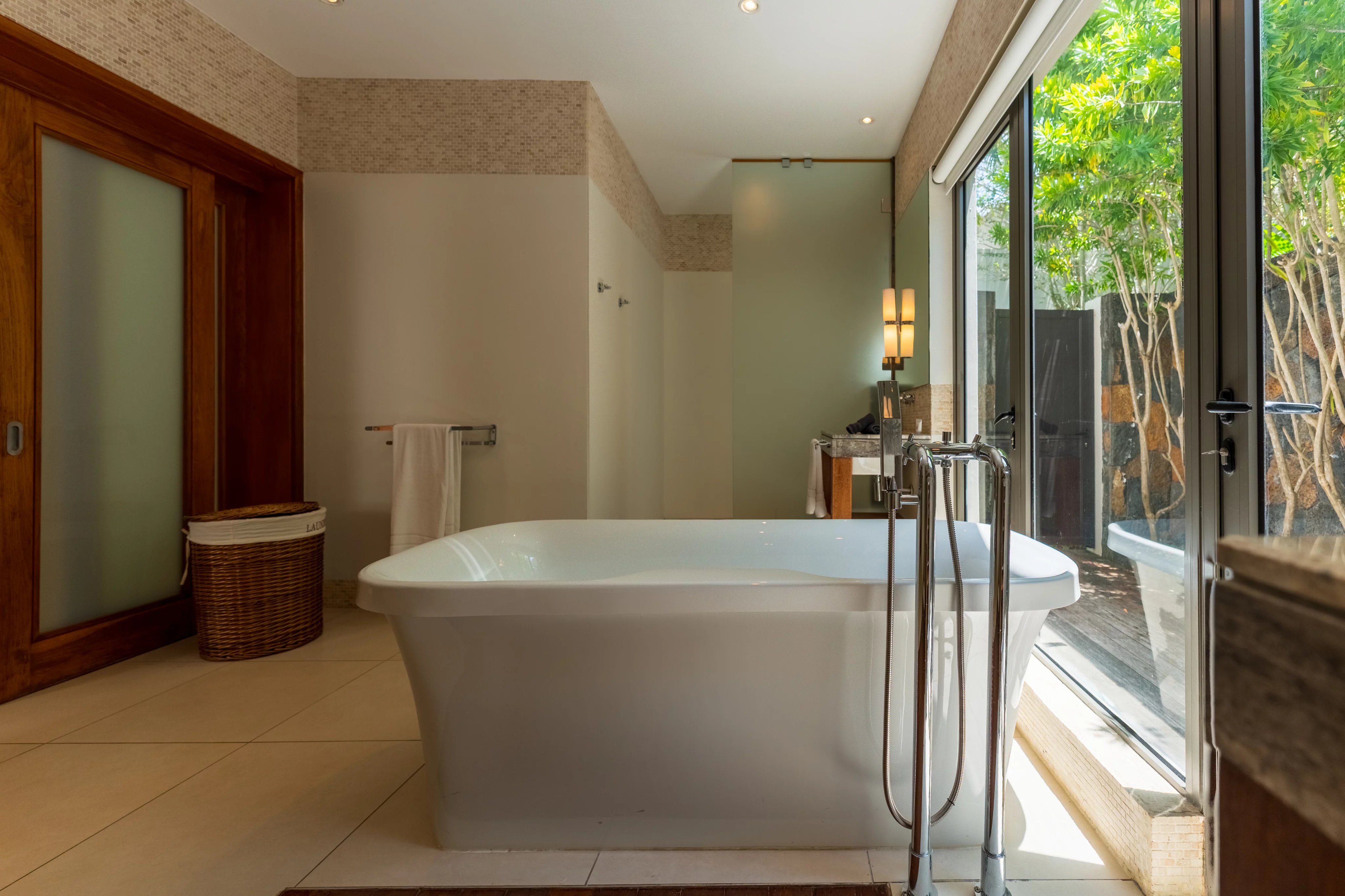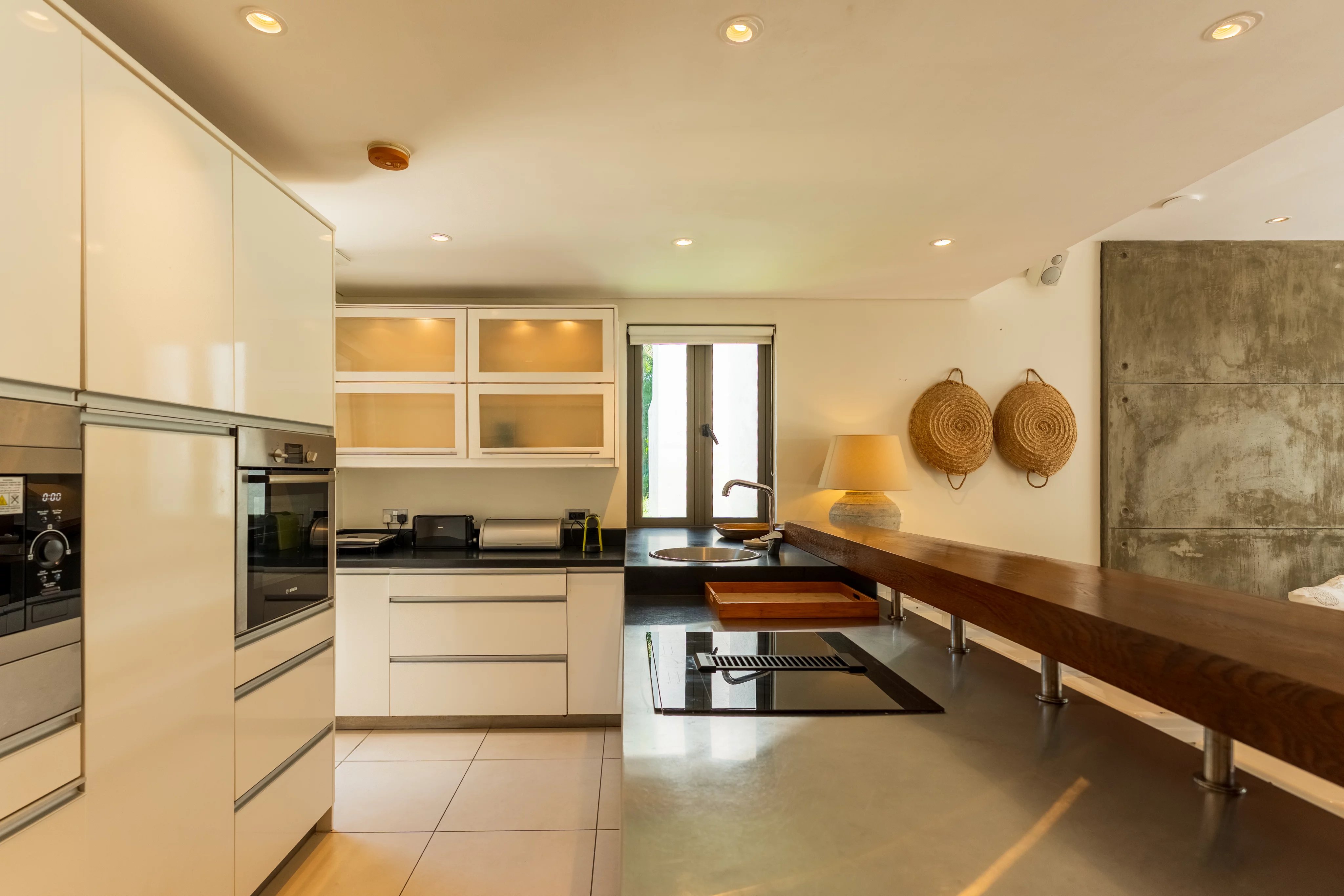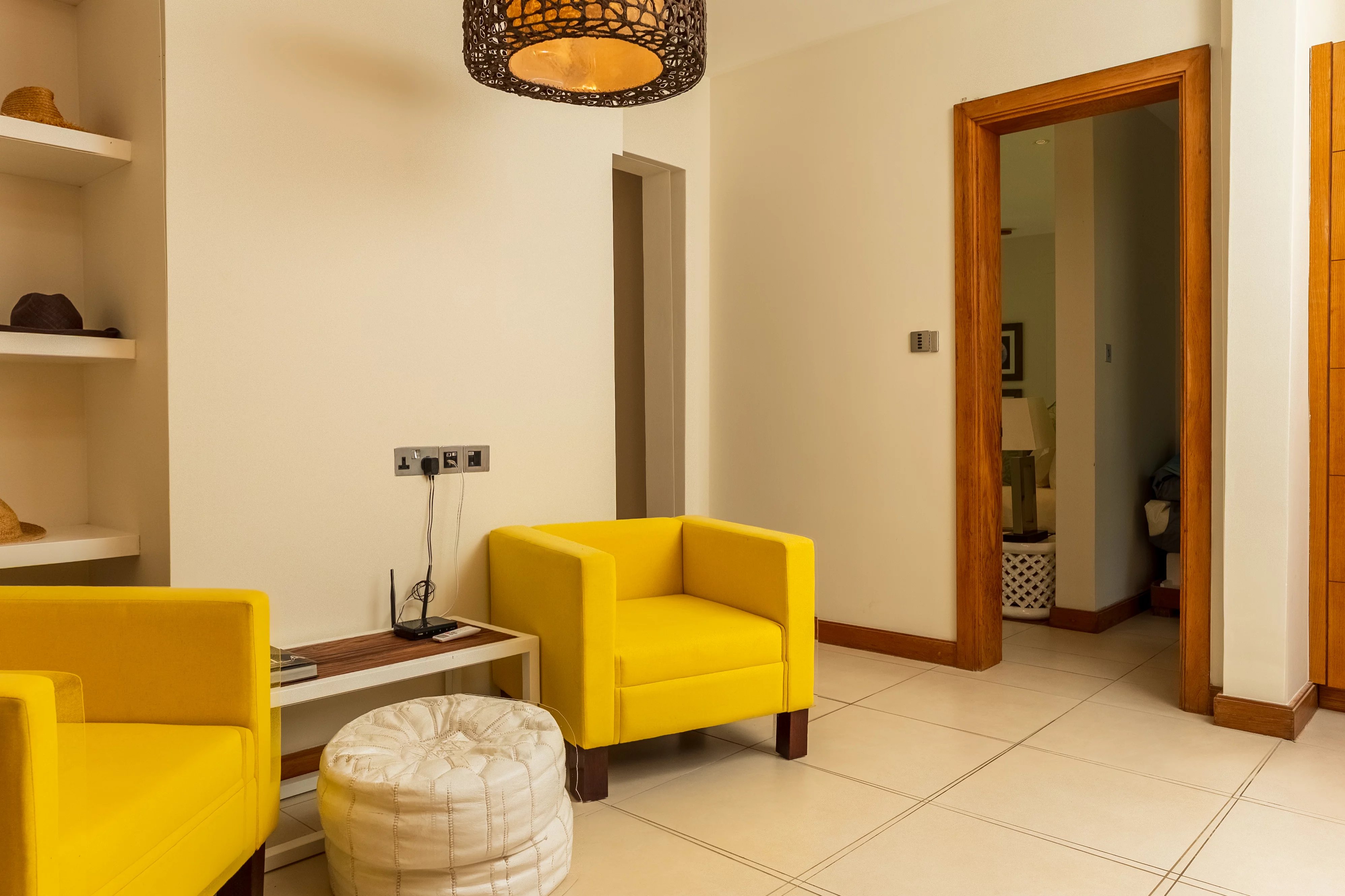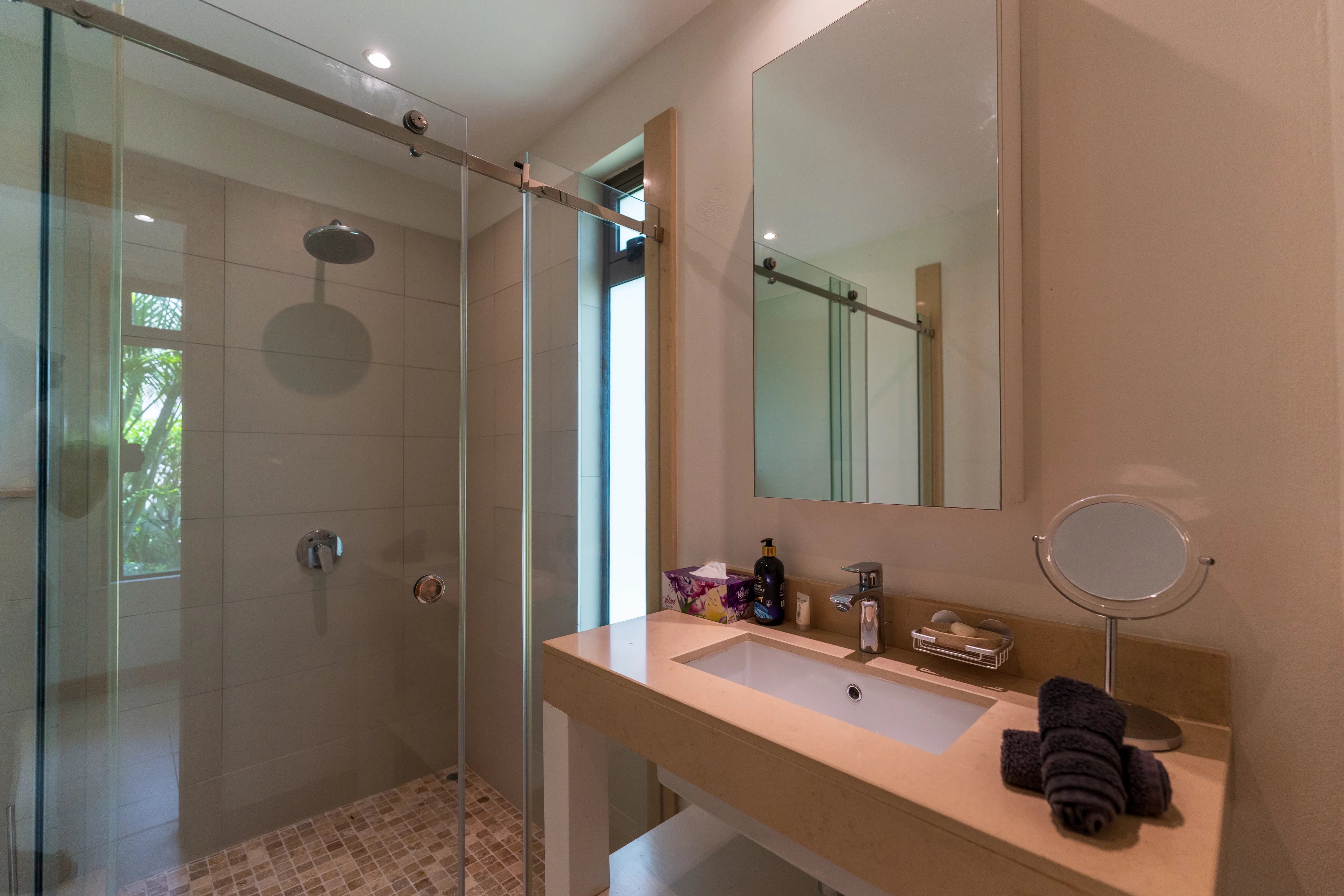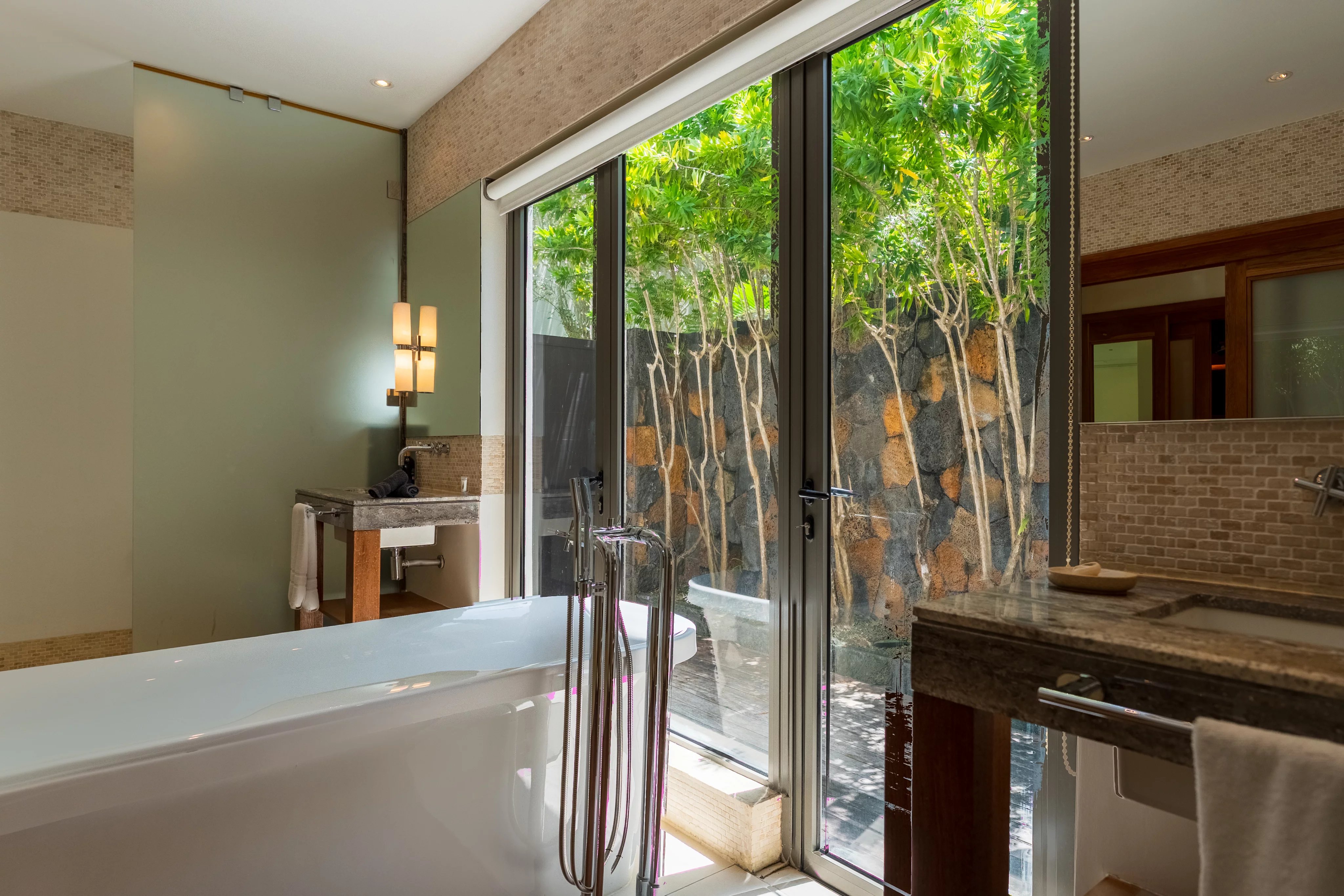 Elle dispose de trois chambres en suite dans la villa principale, chacune avec une salle de bains moderne et un accès direct au jardin. Deux autres chambres indépendantes en annexe, également en suite, offrent intimité et vue sur le jardin. Avec un total de cinq chambres, ce bien est particulièrement rare à Anahita.