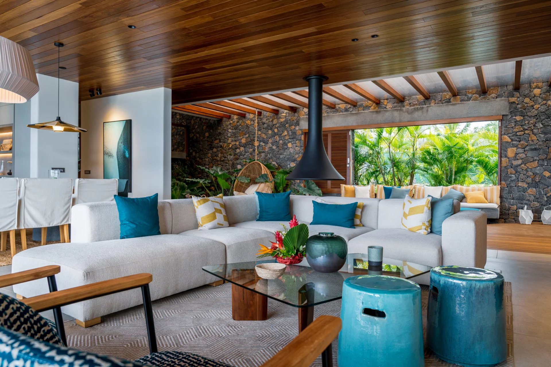 Un salon lumineux avec un jardin tropical intérieur, créant une ambiance apaisante.