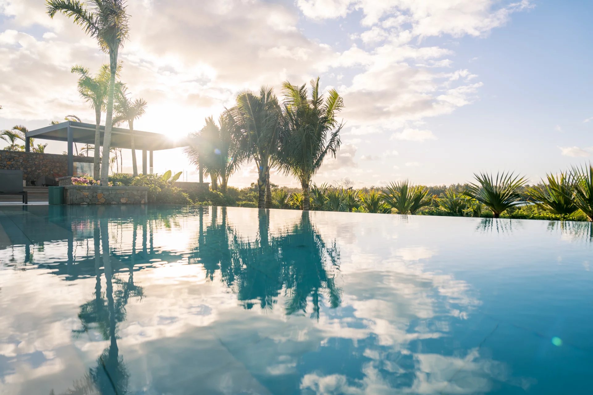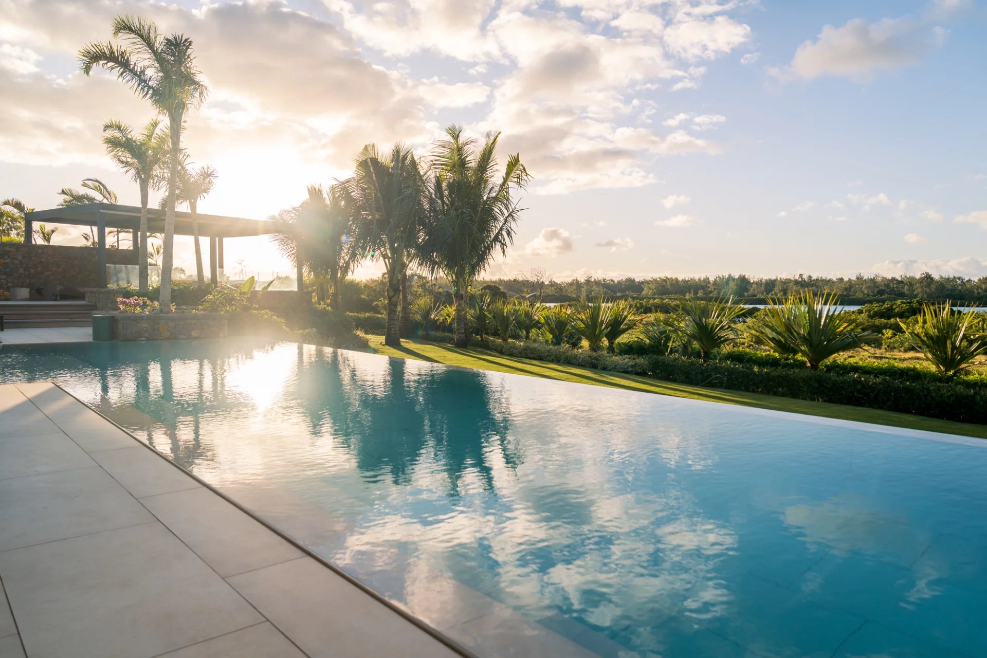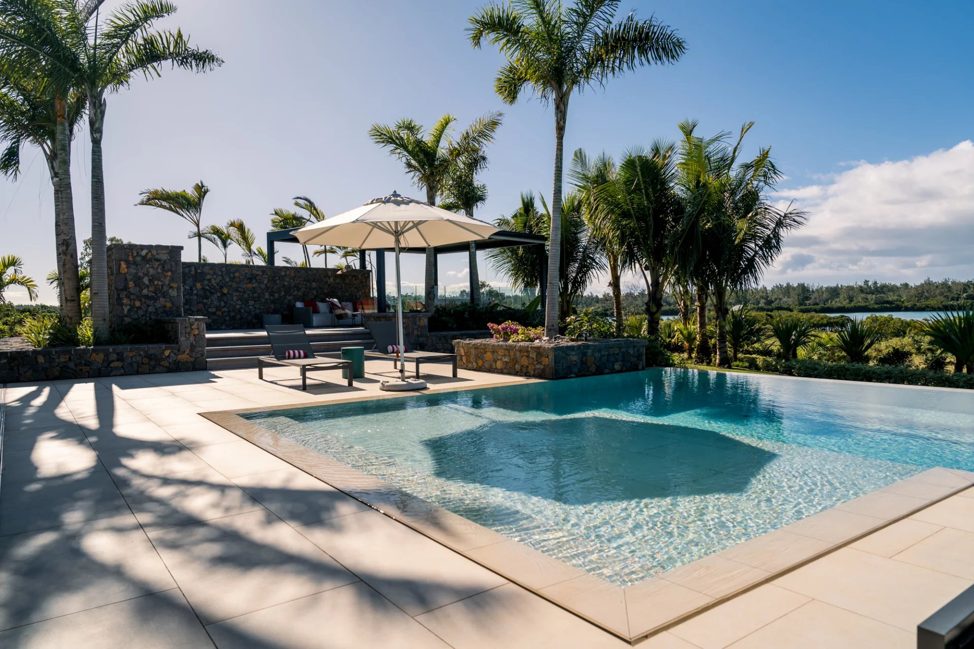 Une piscine à débordement de 15 mètres bordée d’un gazebo offrant un panorama exceptionnel sur l’Île aux Cerfs.