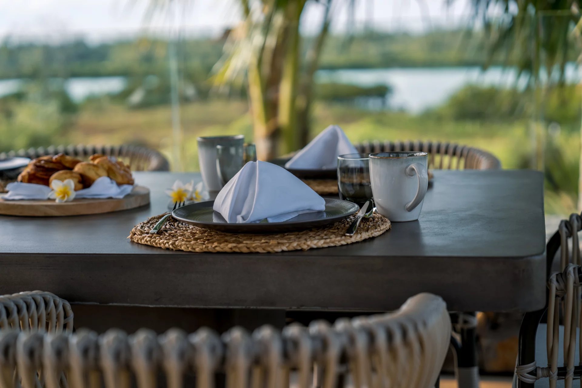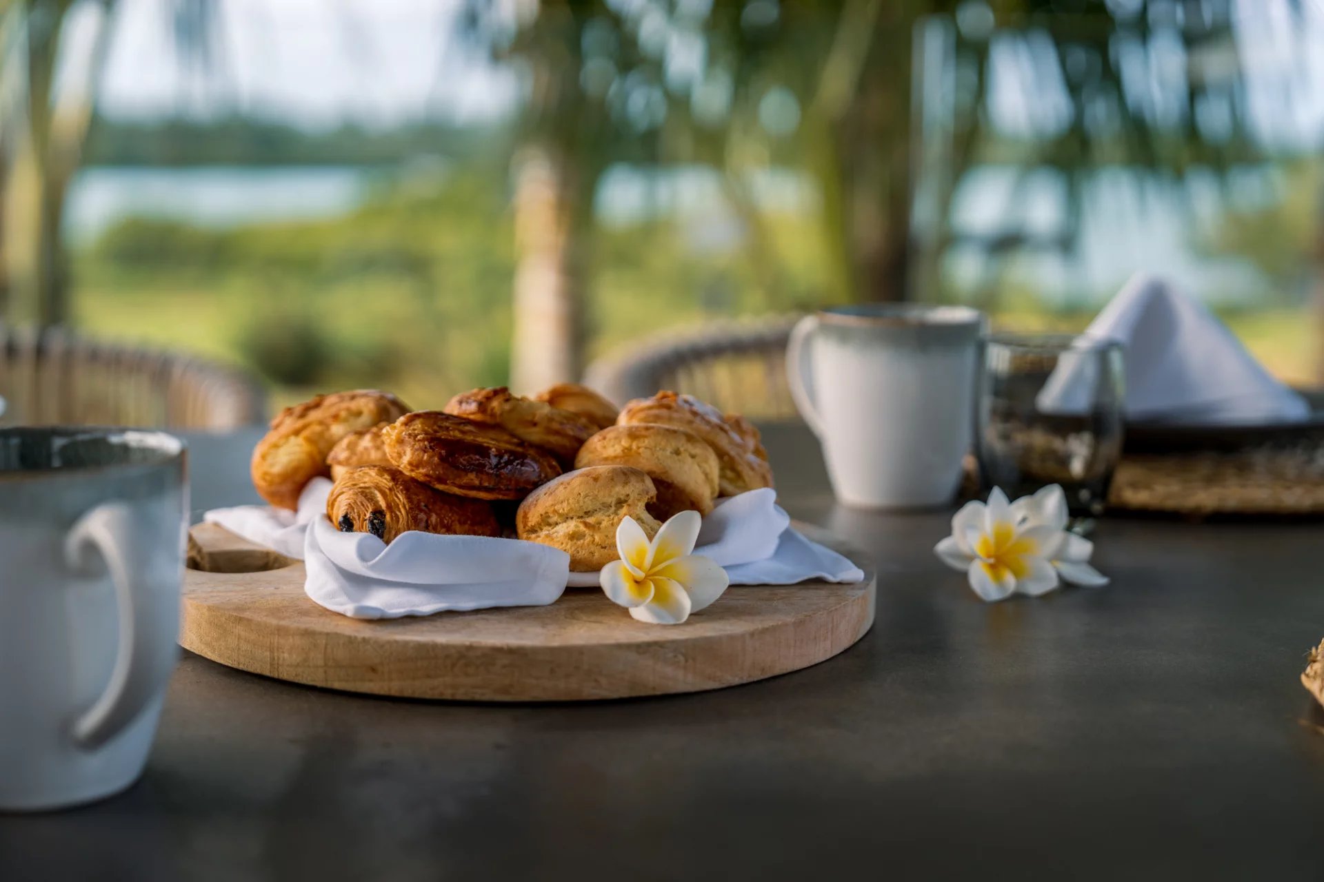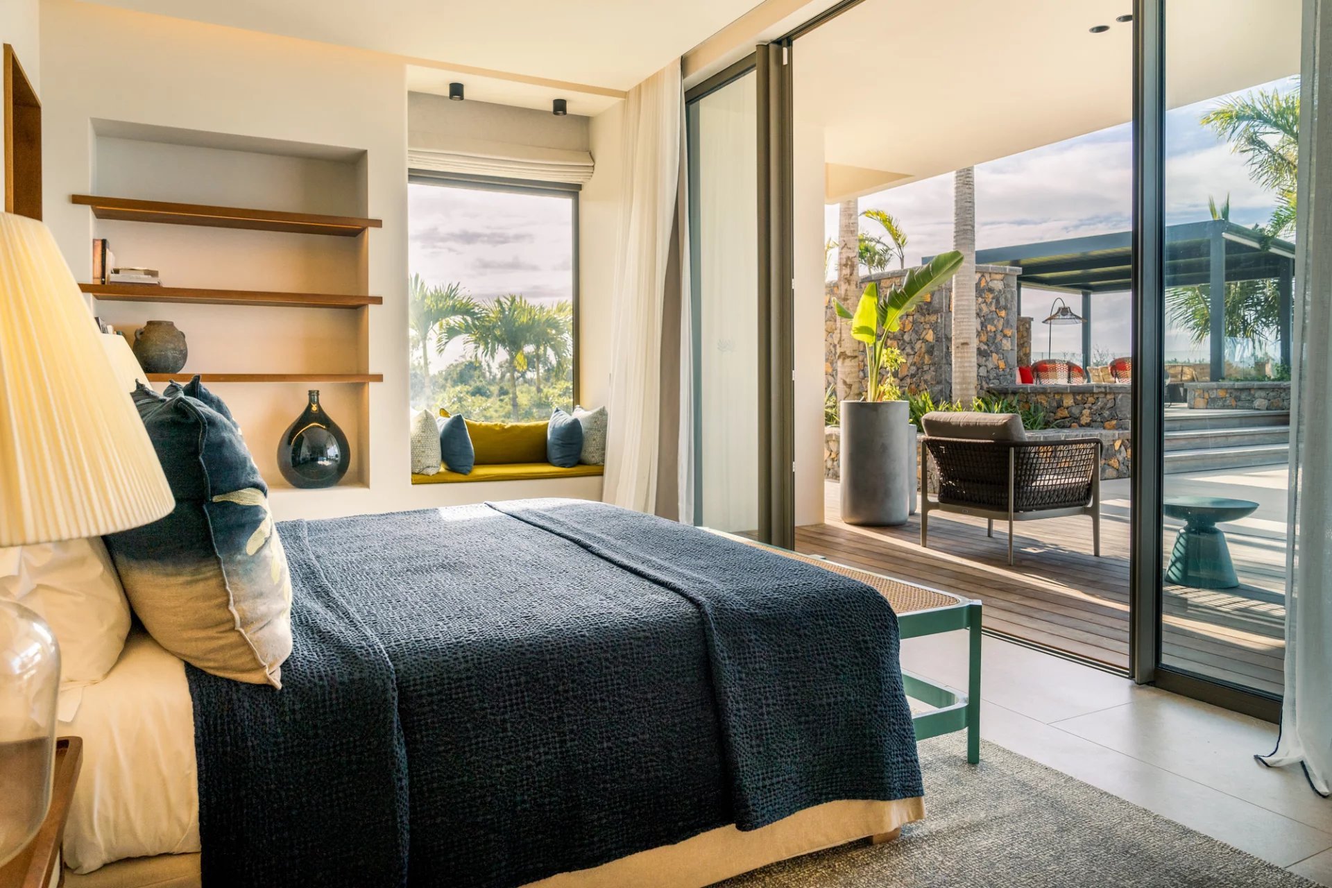 5 chambres spacieuses avec salles de bain privatives, offrant une vue splendide sur le jardin tropical et le lagon.