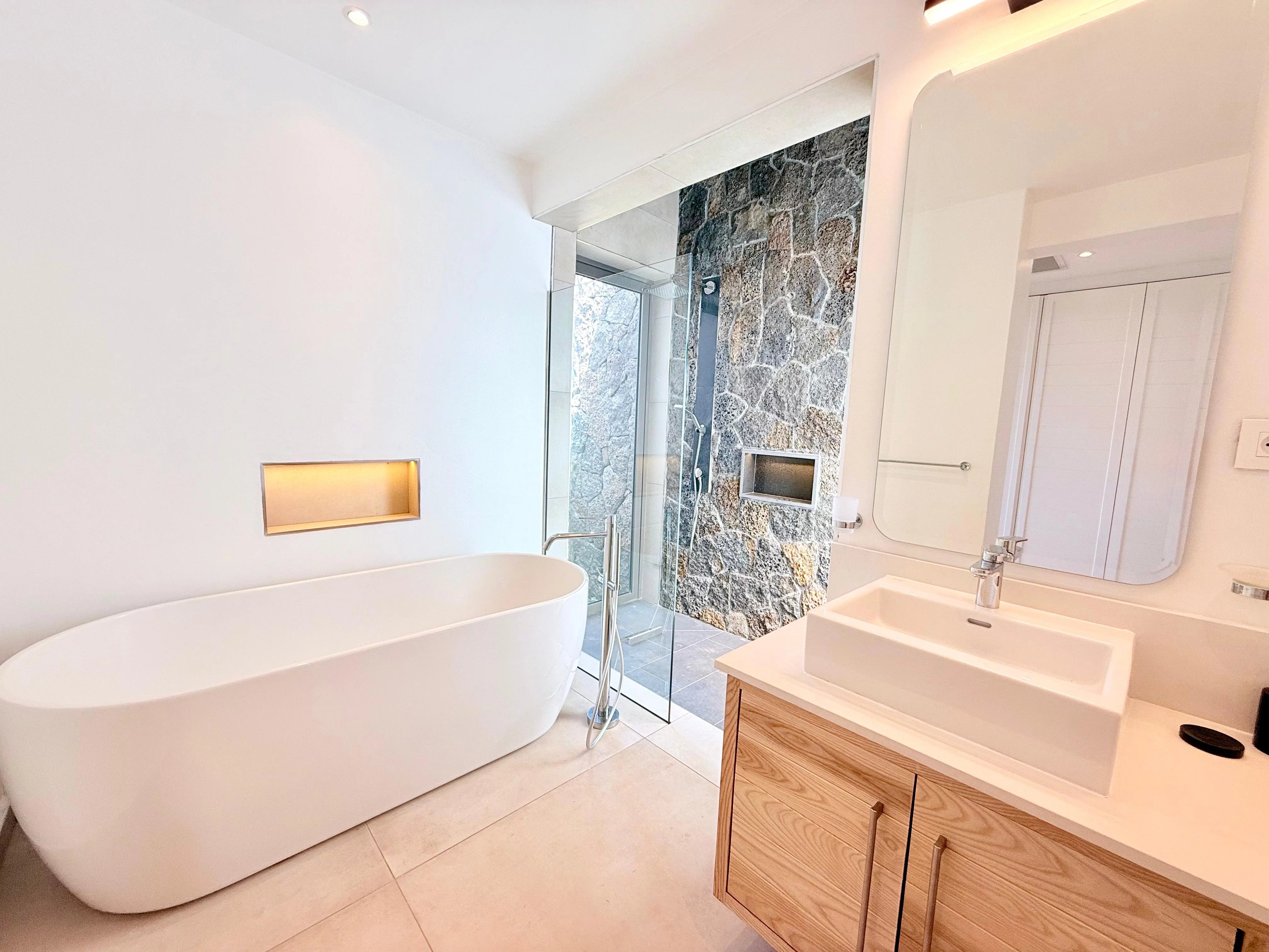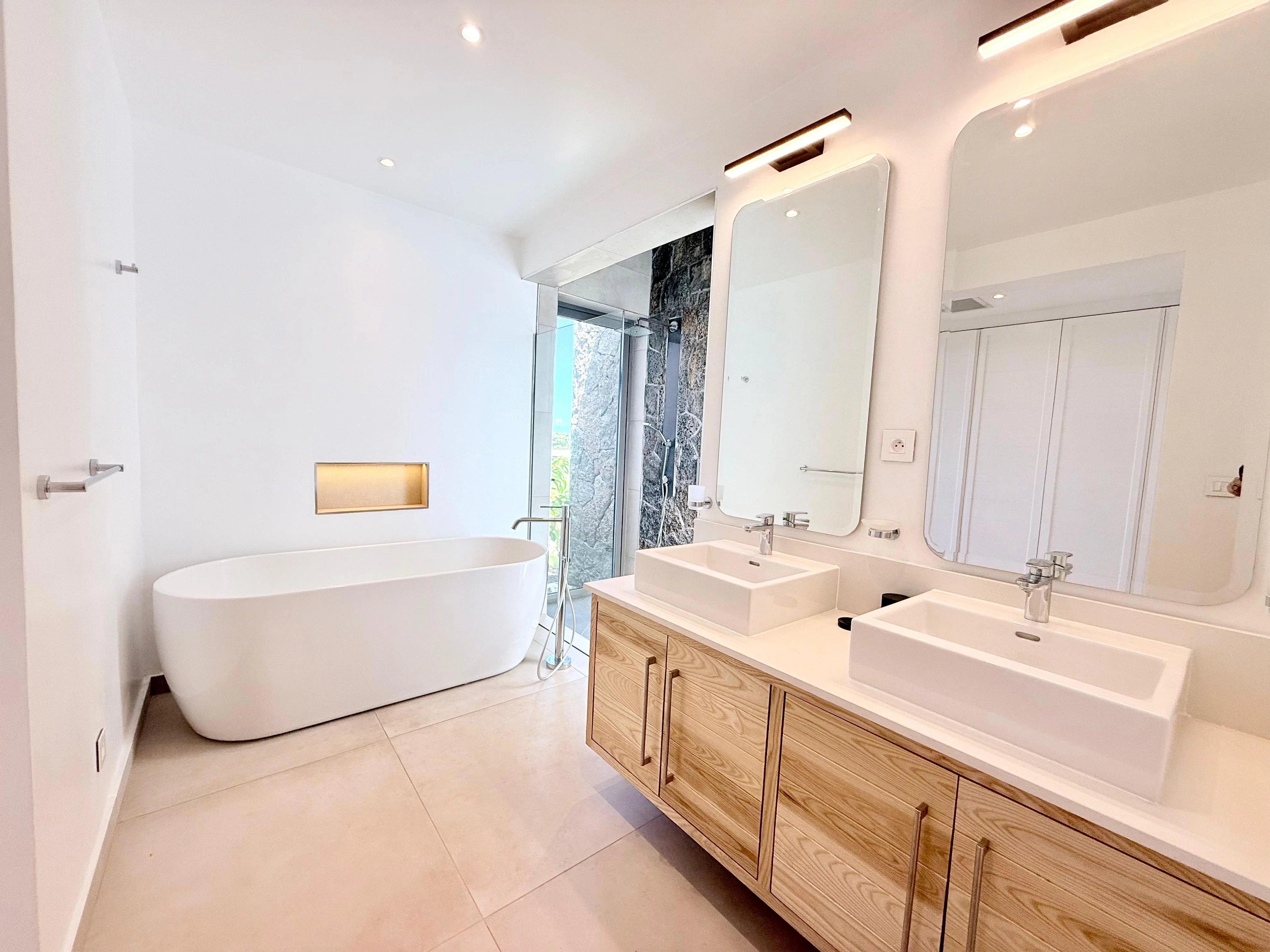 Déployée sur environ 360 m² habitables répartis sur deux niveaux, la propriété offre des volumes généreux et une circulation fluide entre les espaces. L’architecture met en valeur la lumière naturelle et crée une harmonie parfaite entre intérieur et extérieur, avec en toile de fond les montagnes verdoyantes et le lagon du Sud.