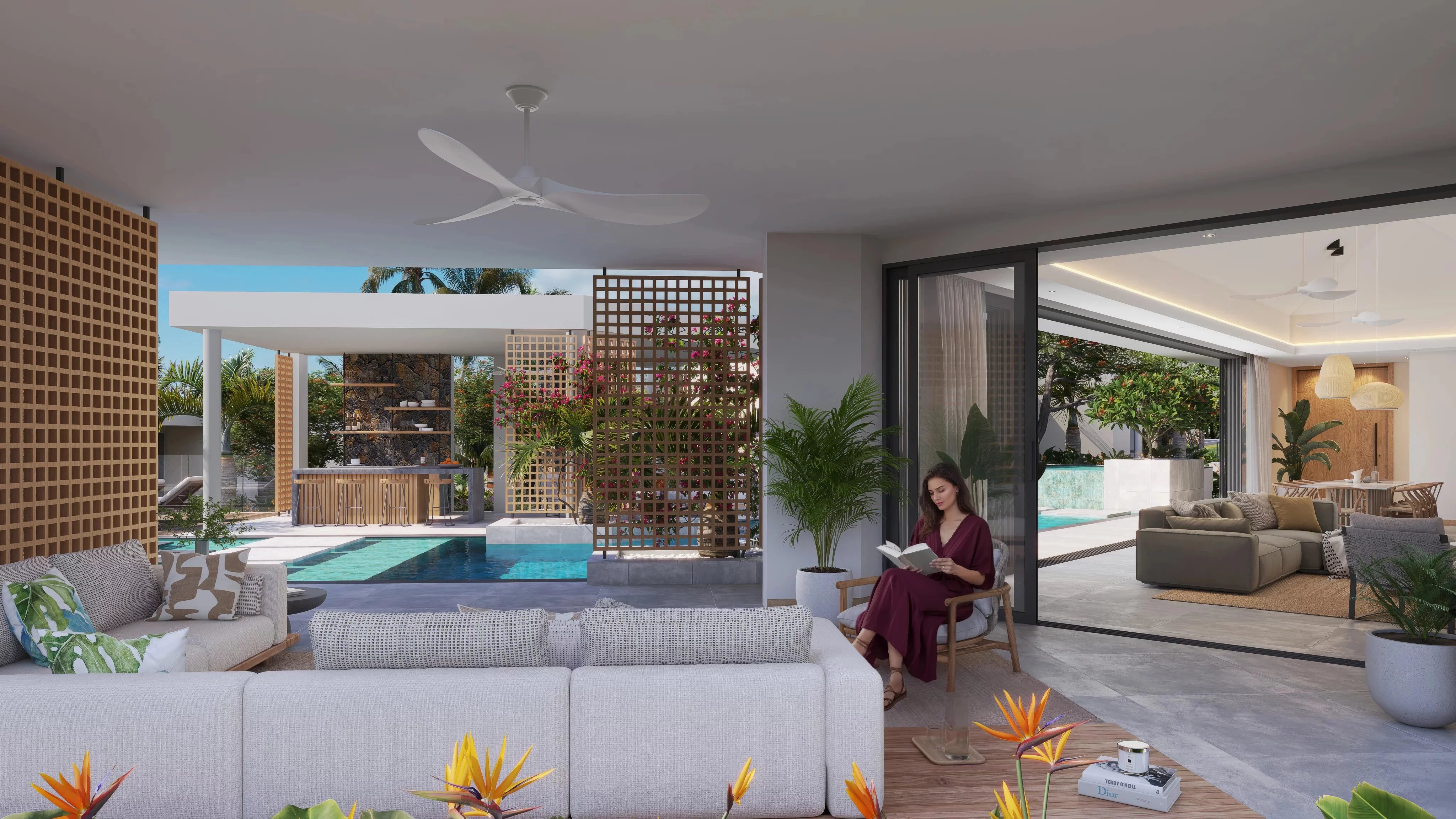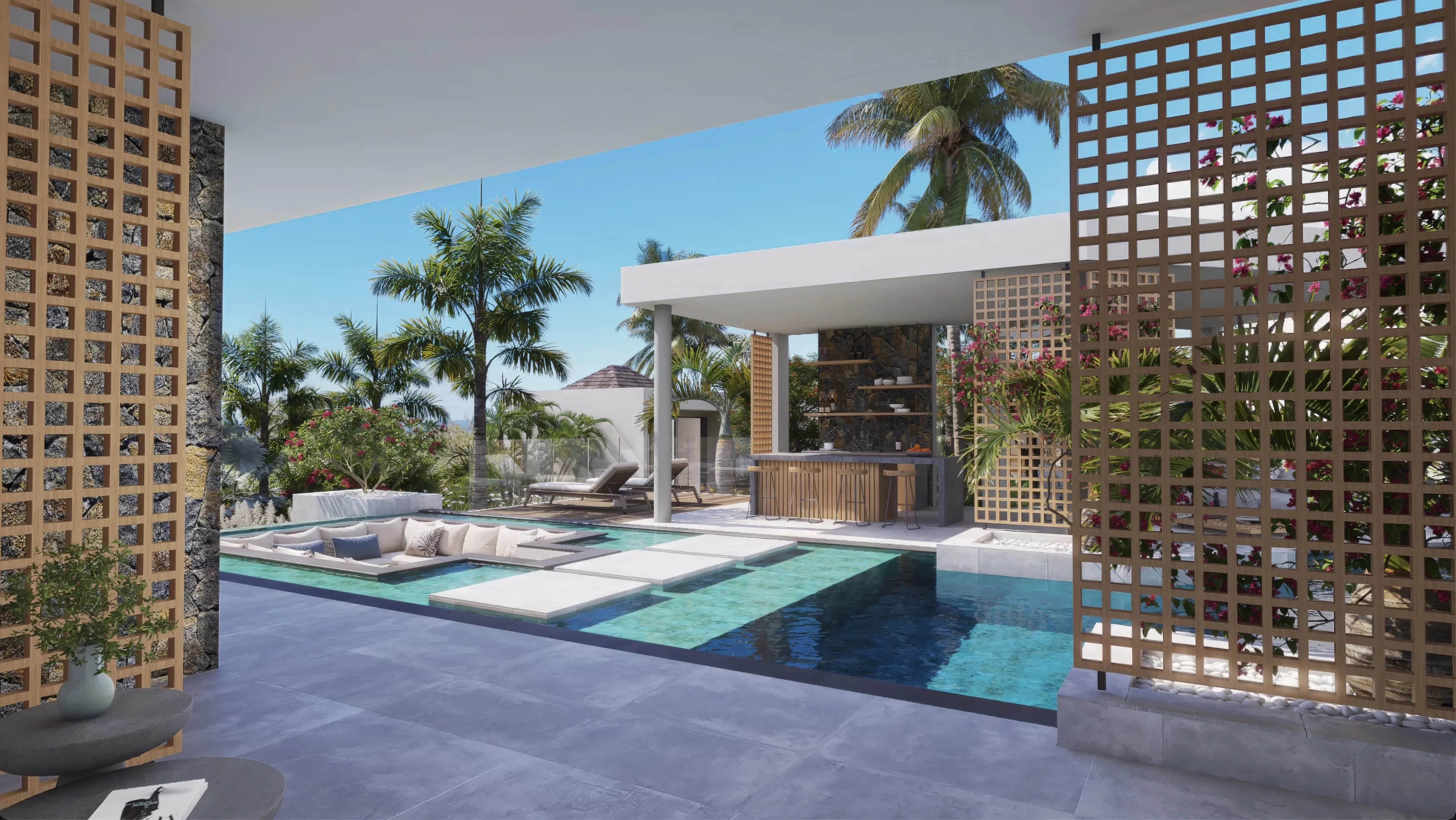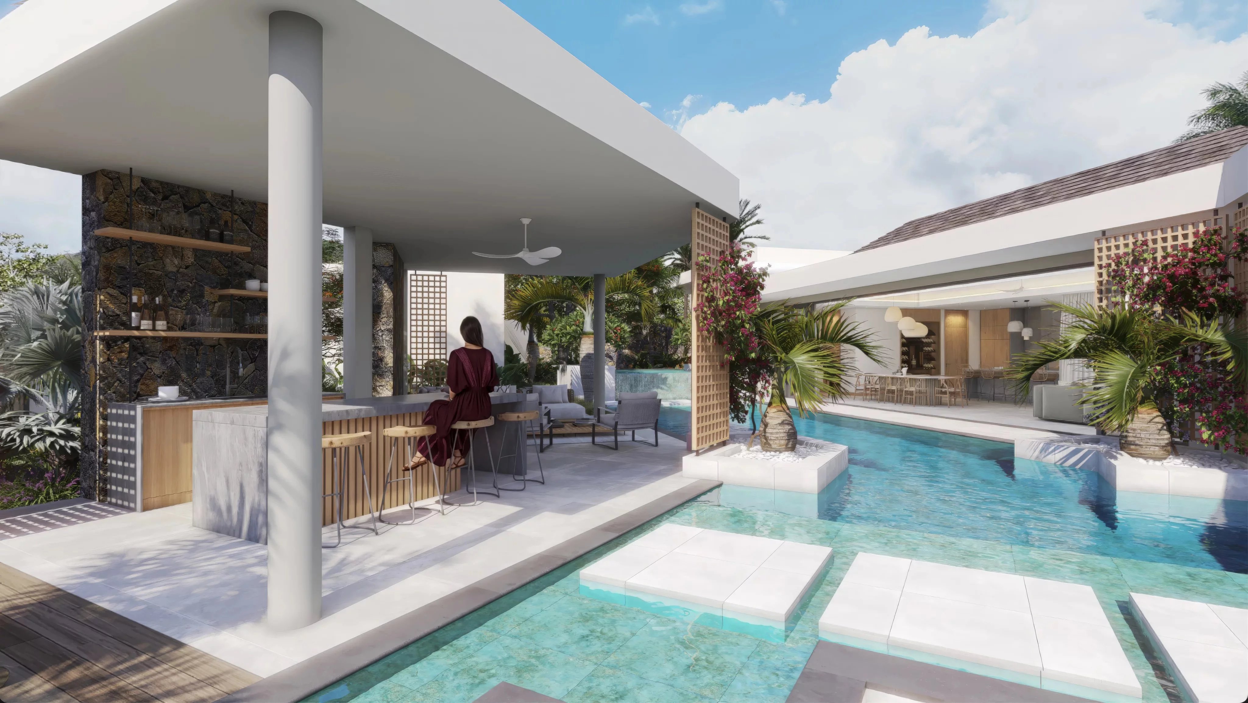 Pensée dans un esprit tropical contemporain, la villa met l’eau au centre de son architecture. La piscine à débordement structure les espaces de vie et crée une atmosphère raffinée et apaisante, très recherchée sur le marché du luxe. Les larges baies vitrées et les volumes ouverts assurent une parfaite continuité entre intérieur et extérieur, renforçant l’attrait du bien pour une clientèle internationale exigeante.