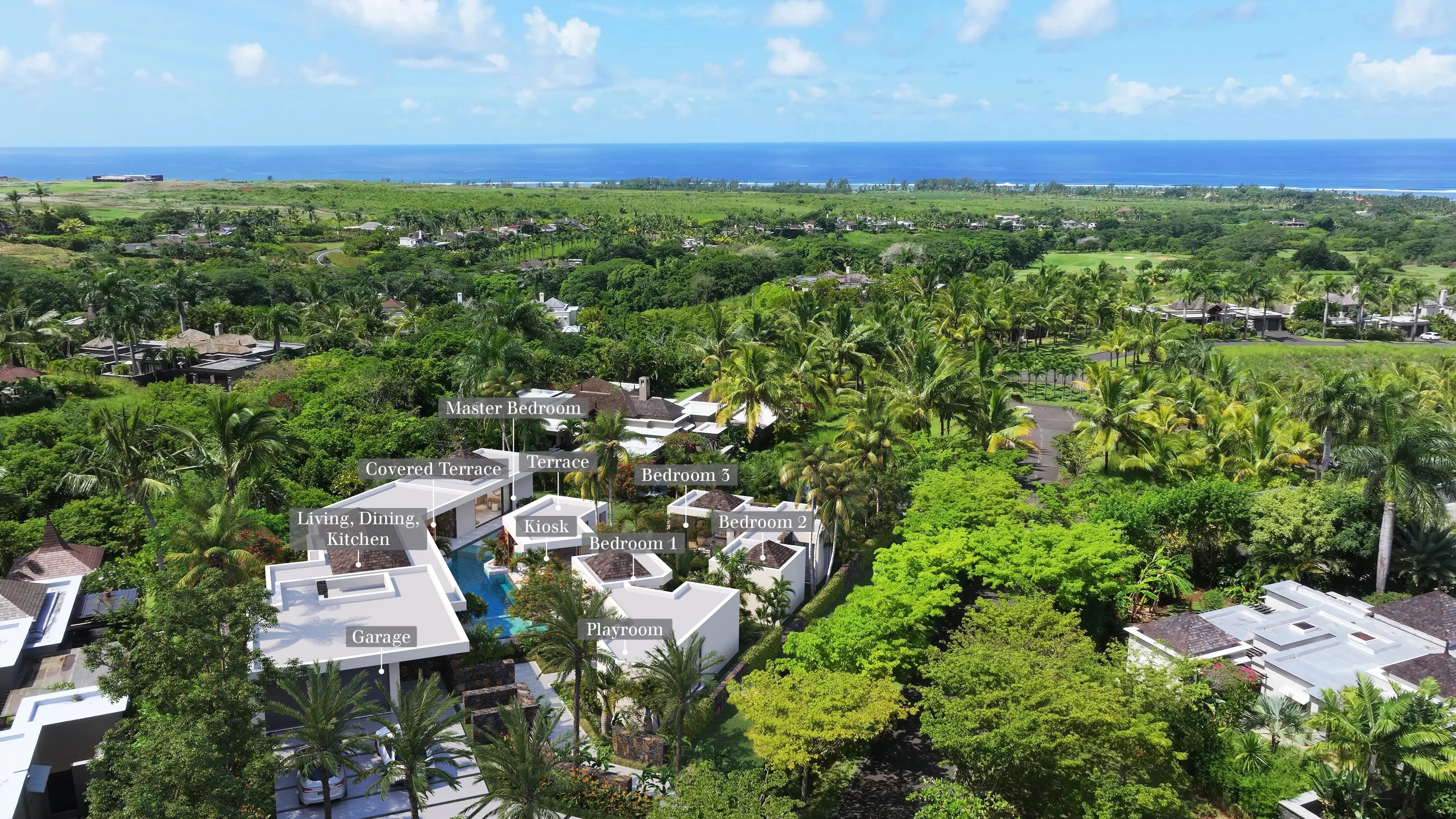 Les espaces de réception lumineux comprennent un vaste salon-salle à manger, une cuisine ouverte moderne et une arrière-cuisine fonctionnelle, parfaitement adaptés à un usage résidentiel haut de gamme comme à la location de prestige. Les suites, conçues comme des pavillons indépendants, garantissent confort, intimité et ouverture sur la nature, un atout majeur pour la valorisation locative.