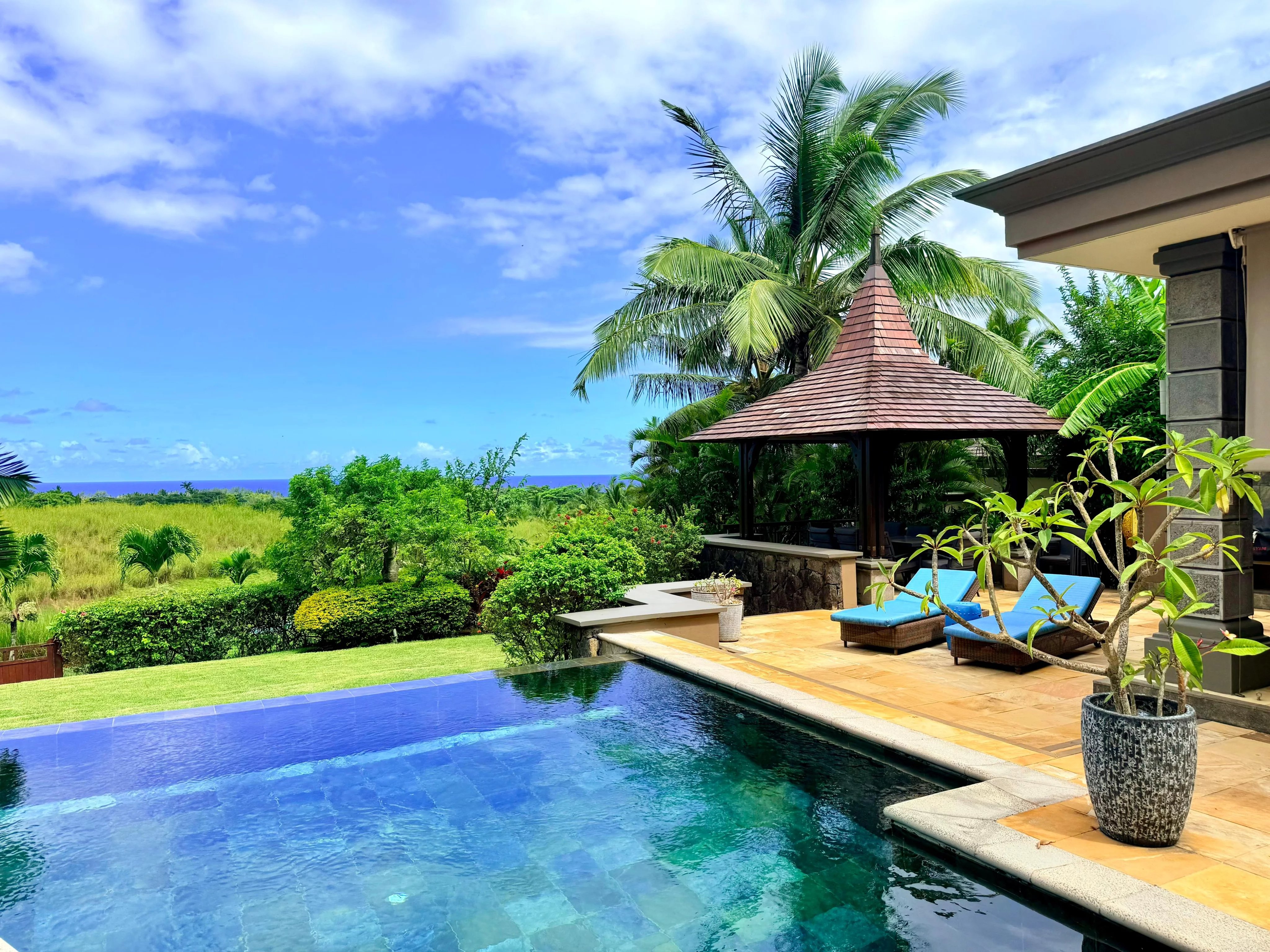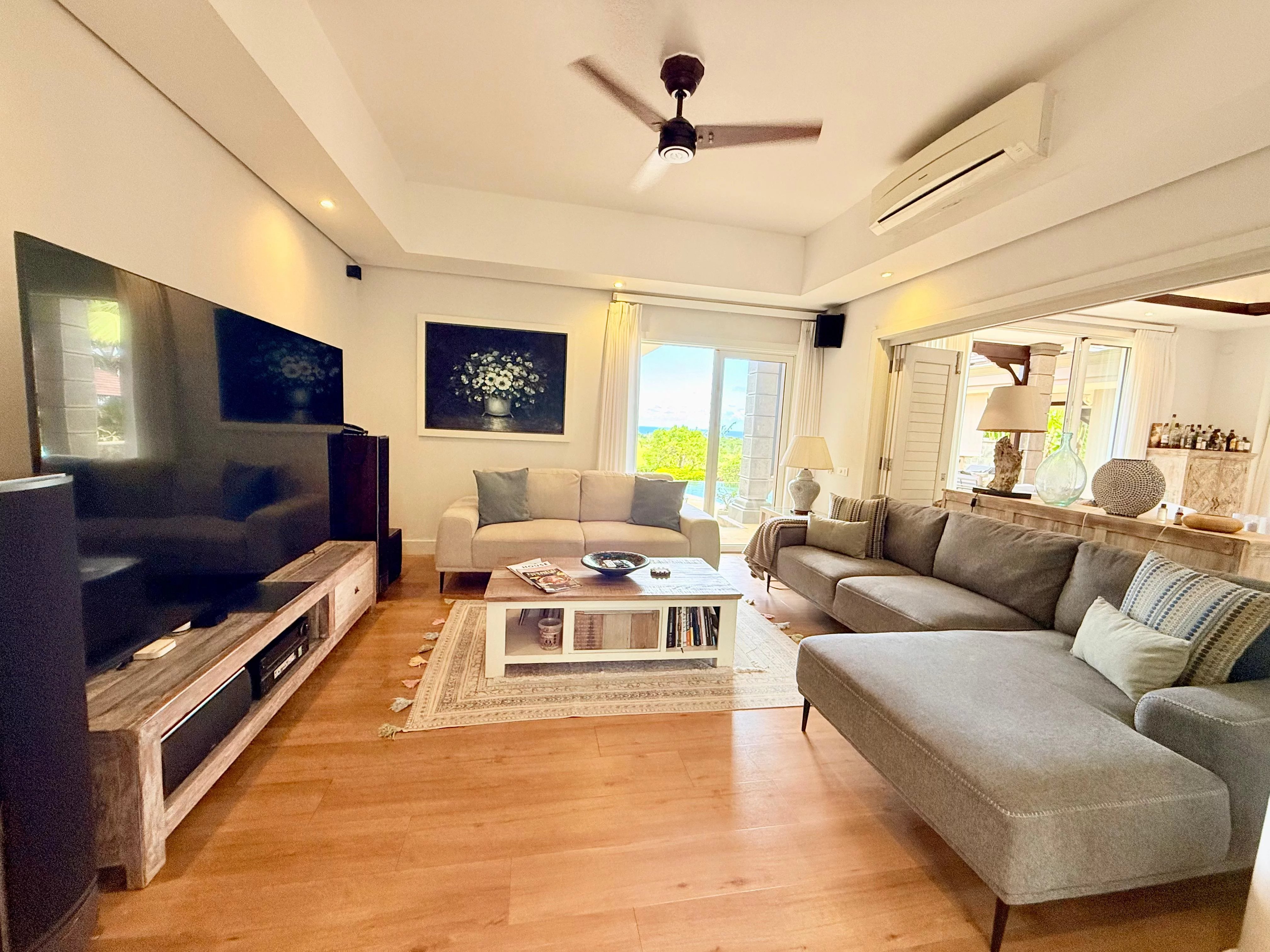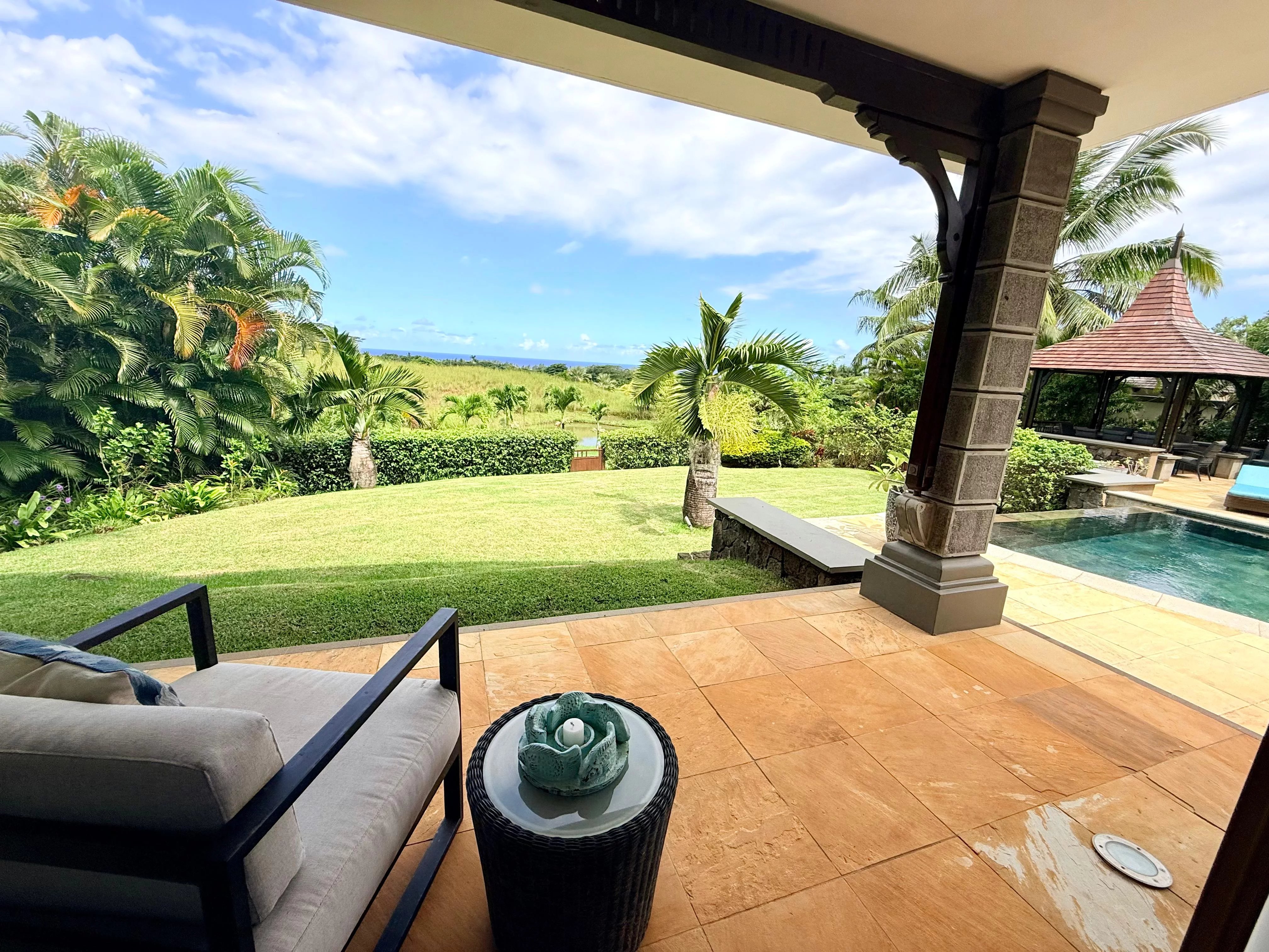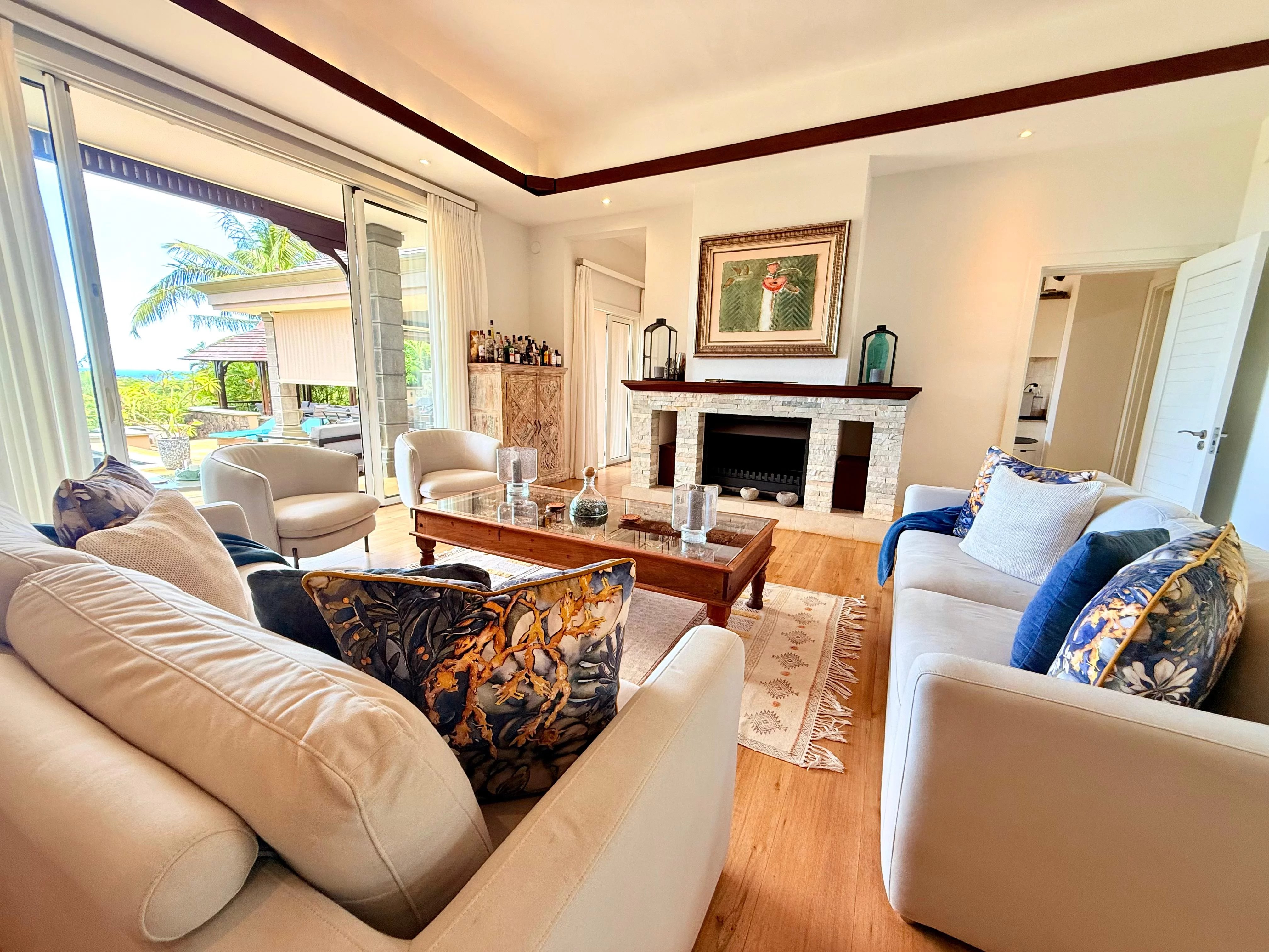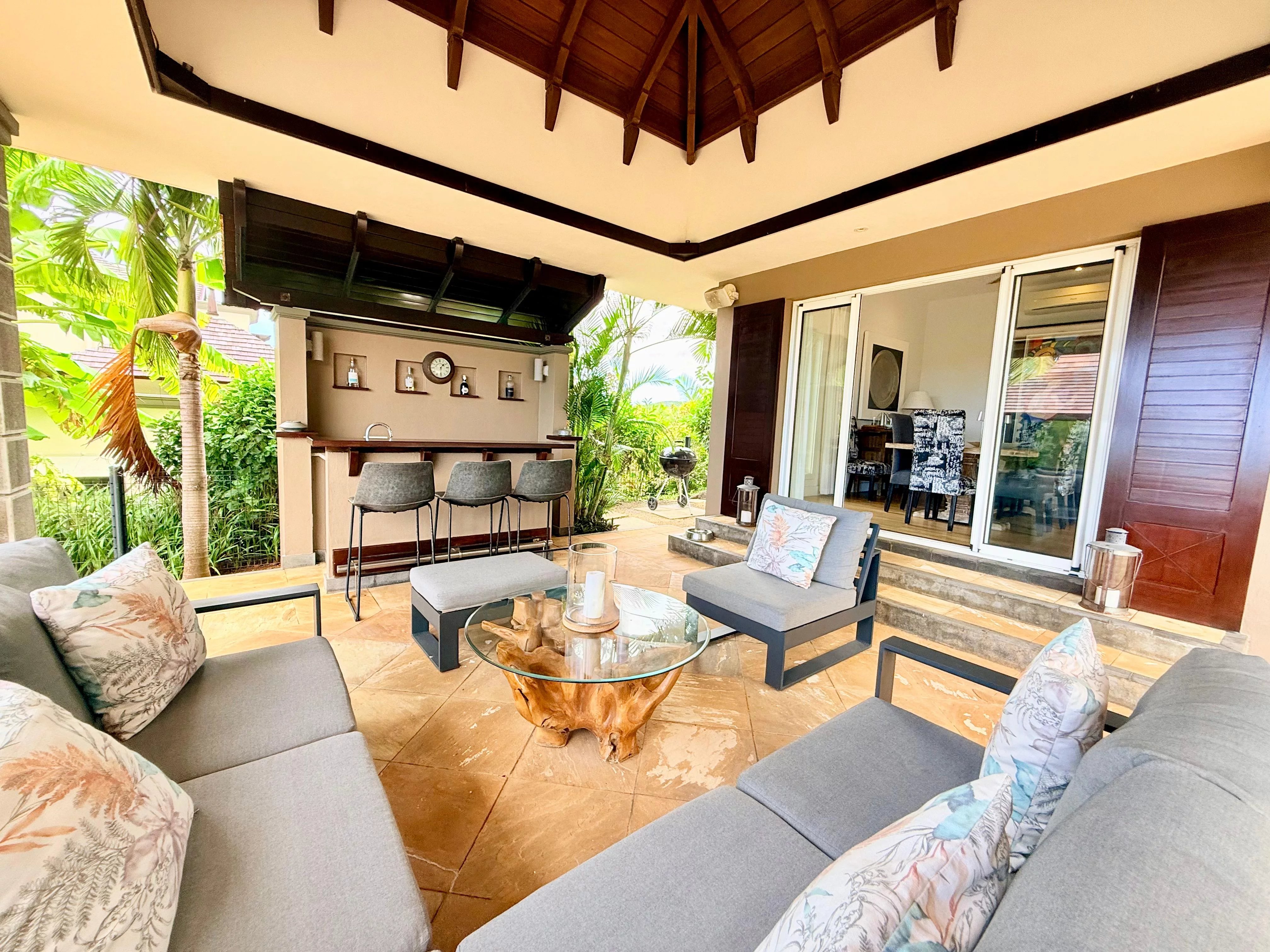 Les pièces de réception s’ouvrent harmonieusement sur de vastes varangues couvertes, menant à une superbe piscine à débordement face à l’horizon. Un espace bar et réception extérieur vient parfaire ce cadre, idéal pour profiter du climat mauricien tout au long de l’année.