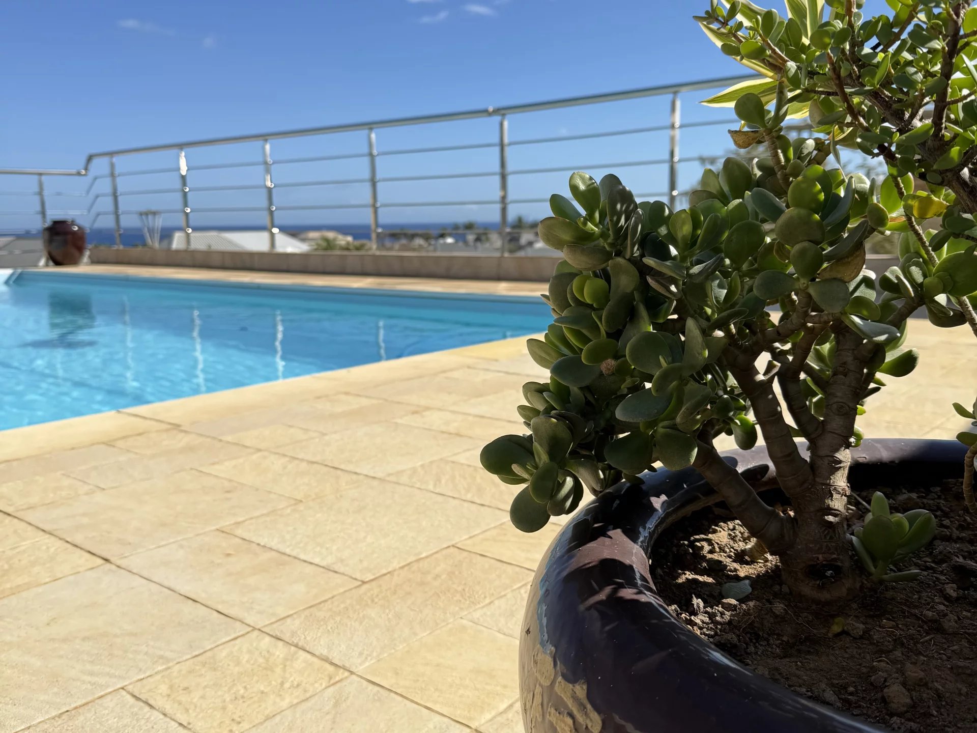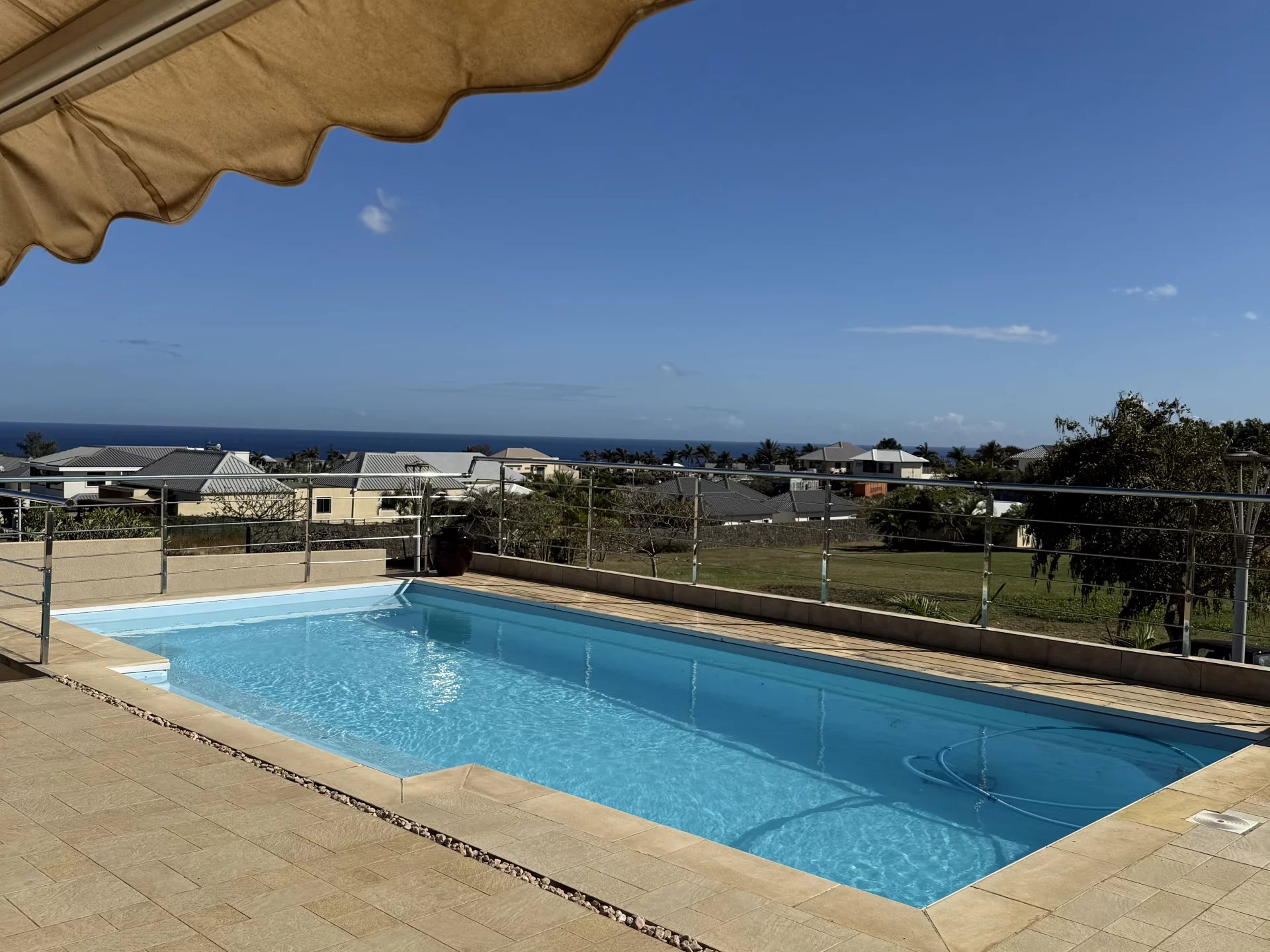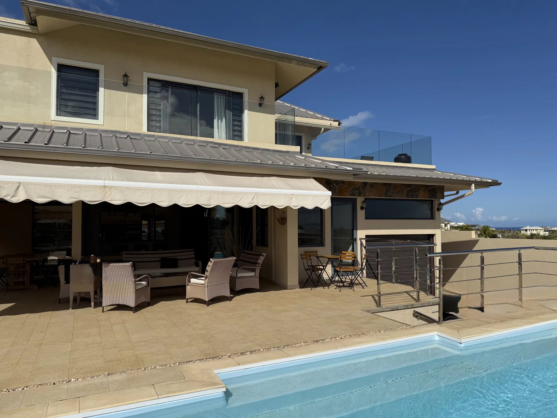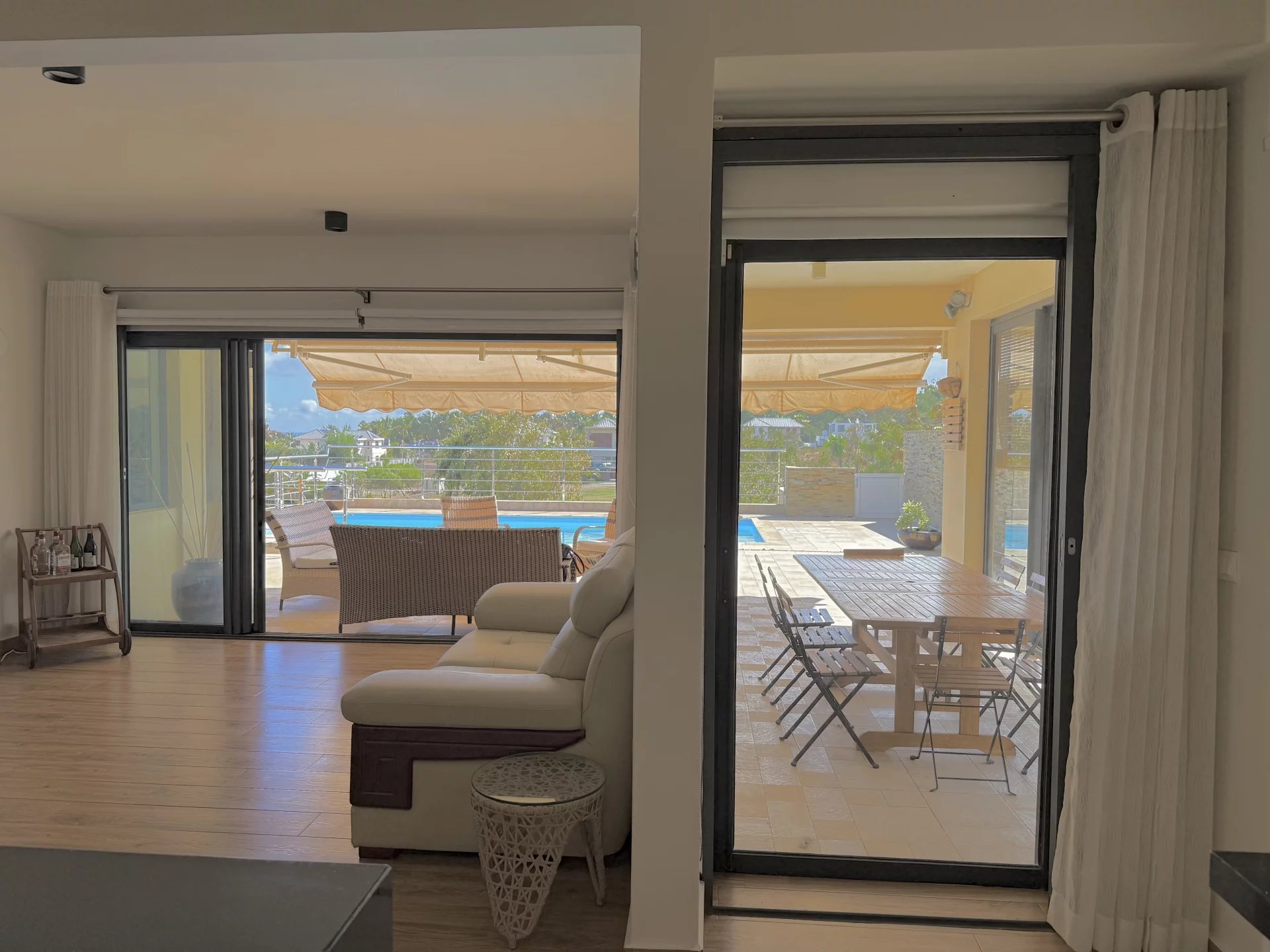 L’extérieur couvert, véritable prolongement de l’espace de vie, offre un agréable salon et un coin repas face à la piscine, pour profiter pleinement du climat et des vues exceptionnelles.