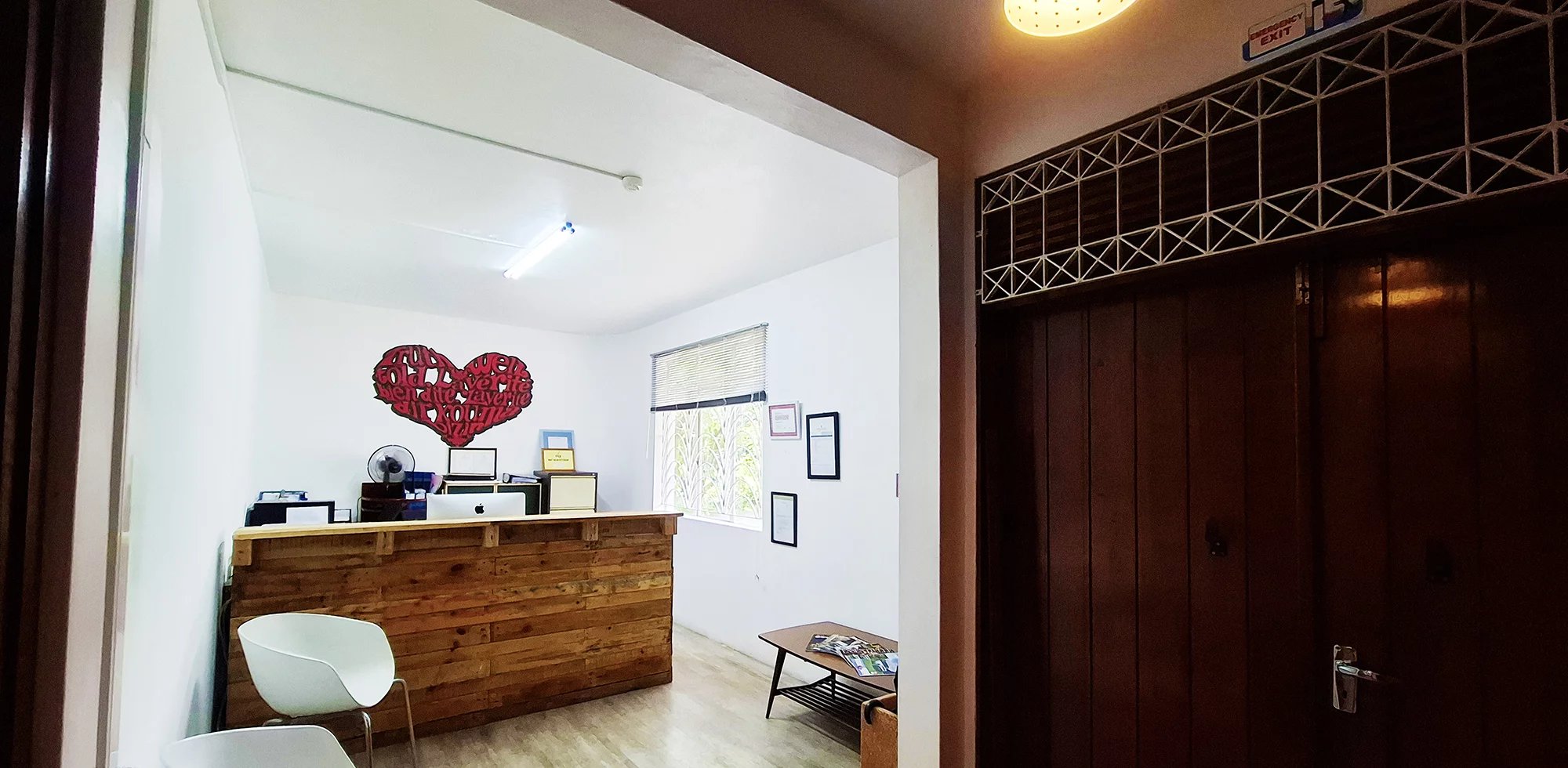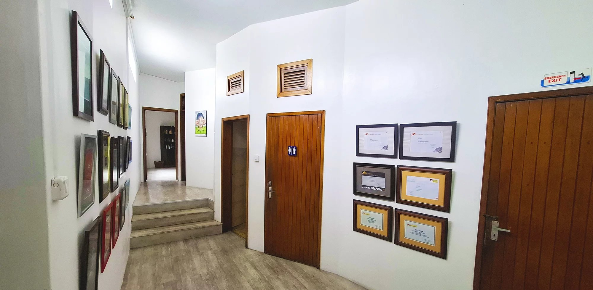 On y accède par un porche couvert, qui s’ouvre sur la réception.
