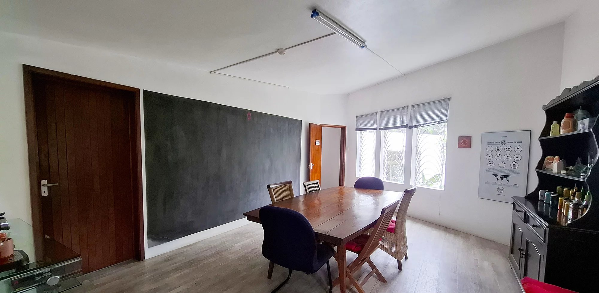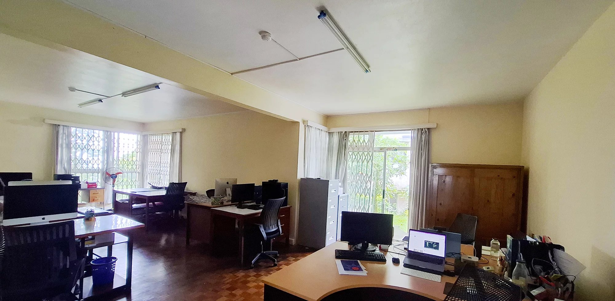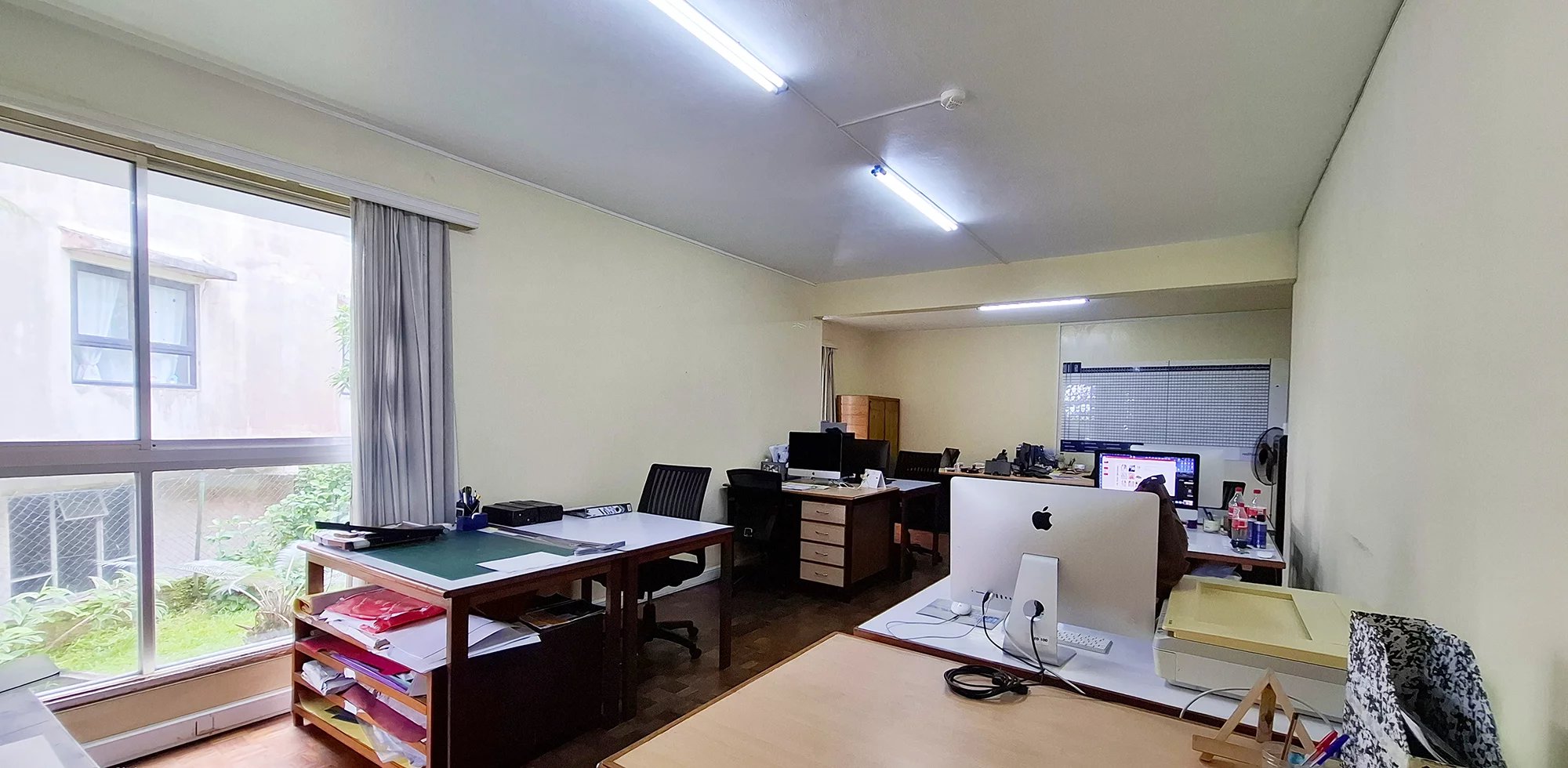 Le salon / salle à manger a été transformé en un spacieux espace ouvert accueillant aujourd’hui 13 bureaux. Cette pièce lumineuse surplombe le jardin et y donne accès également.
