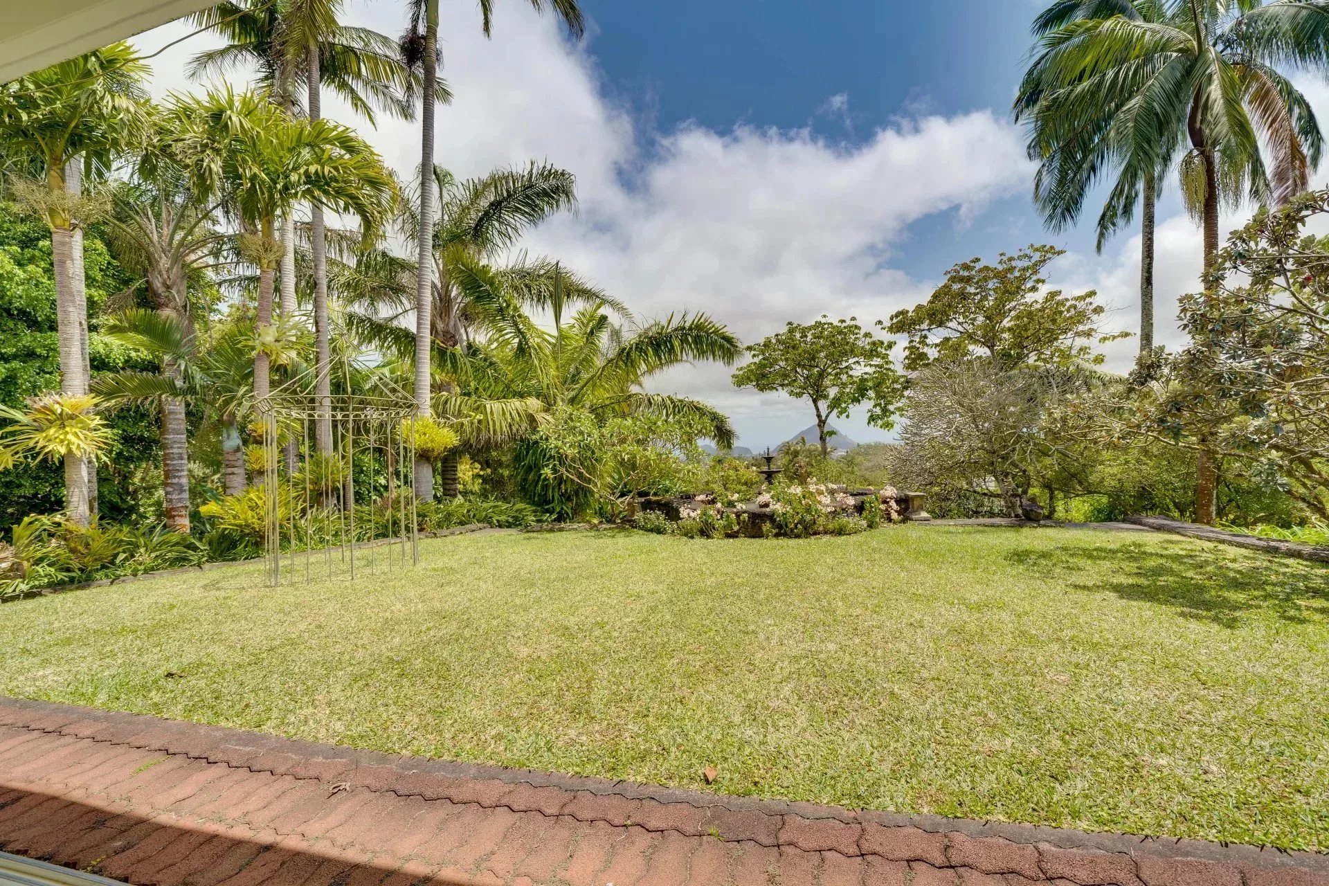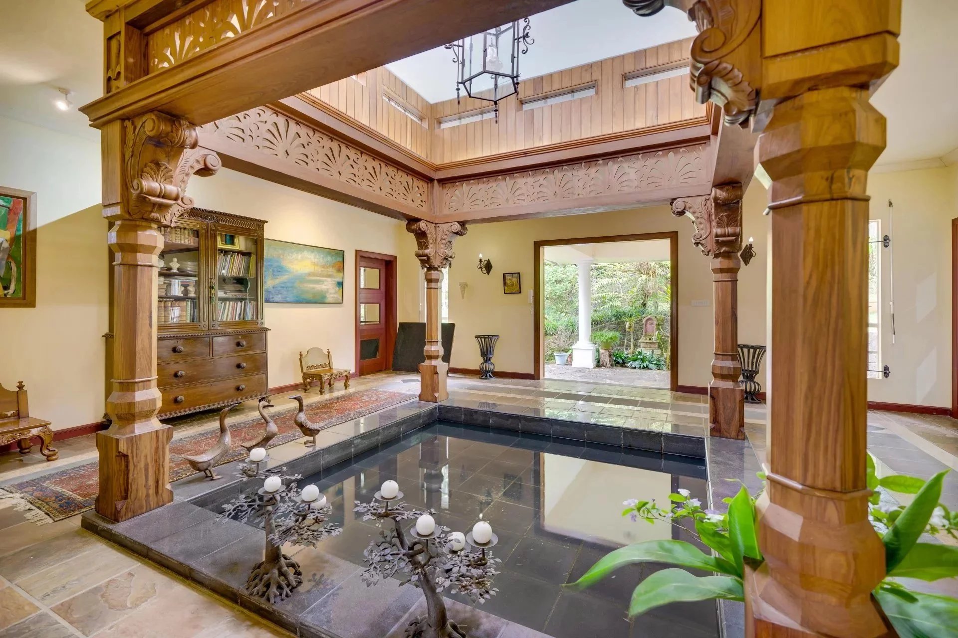 Le hall d'entrée avec son bassin et ses boiseries travaillées est unique. Celui ci donne accès aux différents espaces de vie: droit devant, nous avons la salle à manger et le salon qui s'ouvre sur une belle varangue dominant le jardin. Le salon de télé avec sa cheminée est aussi accessible depuis la varangue.