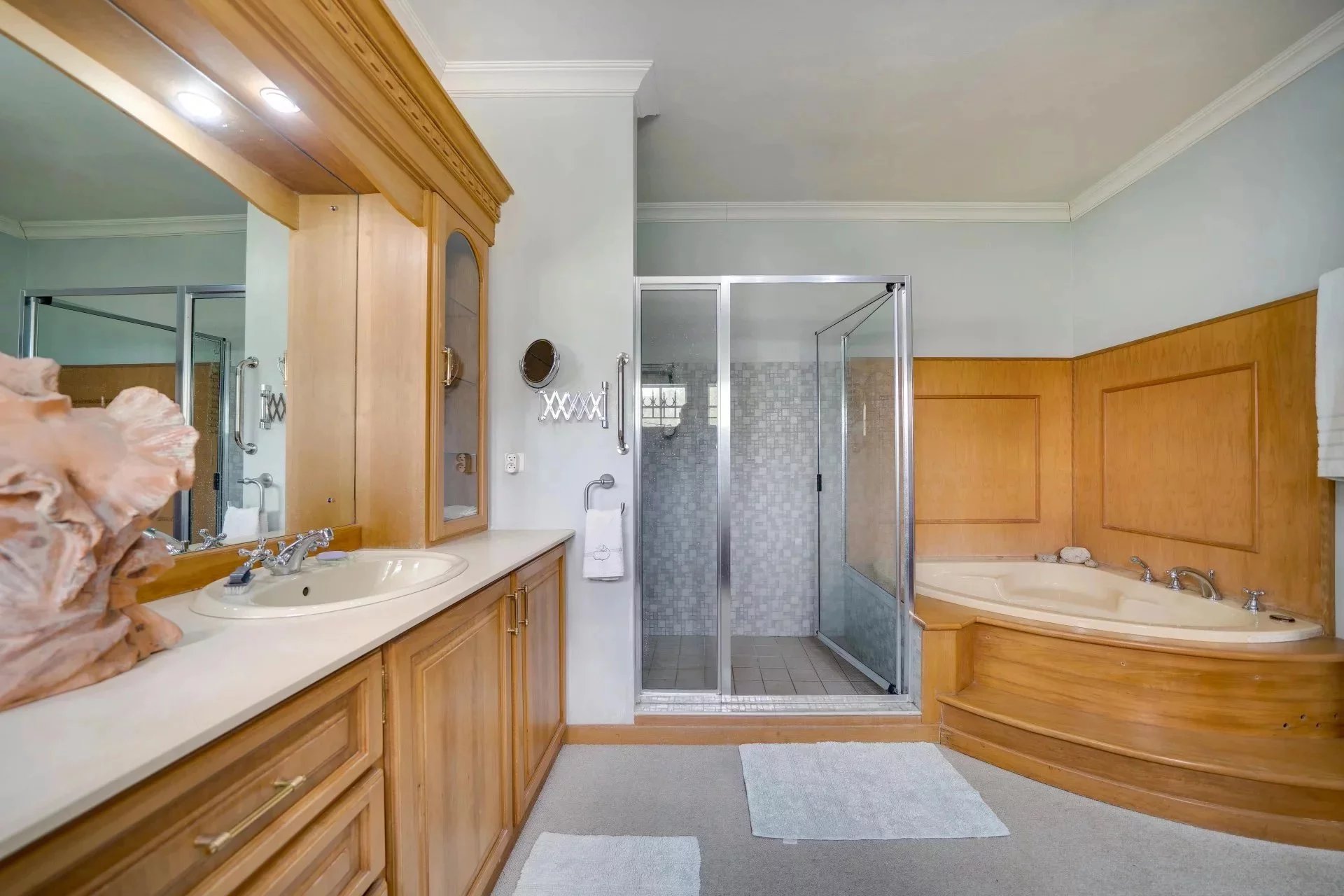 Cette maison d'exception de plain pied de 350 m² avec un sous sol de la même superficie est nichée au milieu d'un écrin de verdure de 64 perches, avec vue panoramique sur les montagnes et un magnifique jardin.
