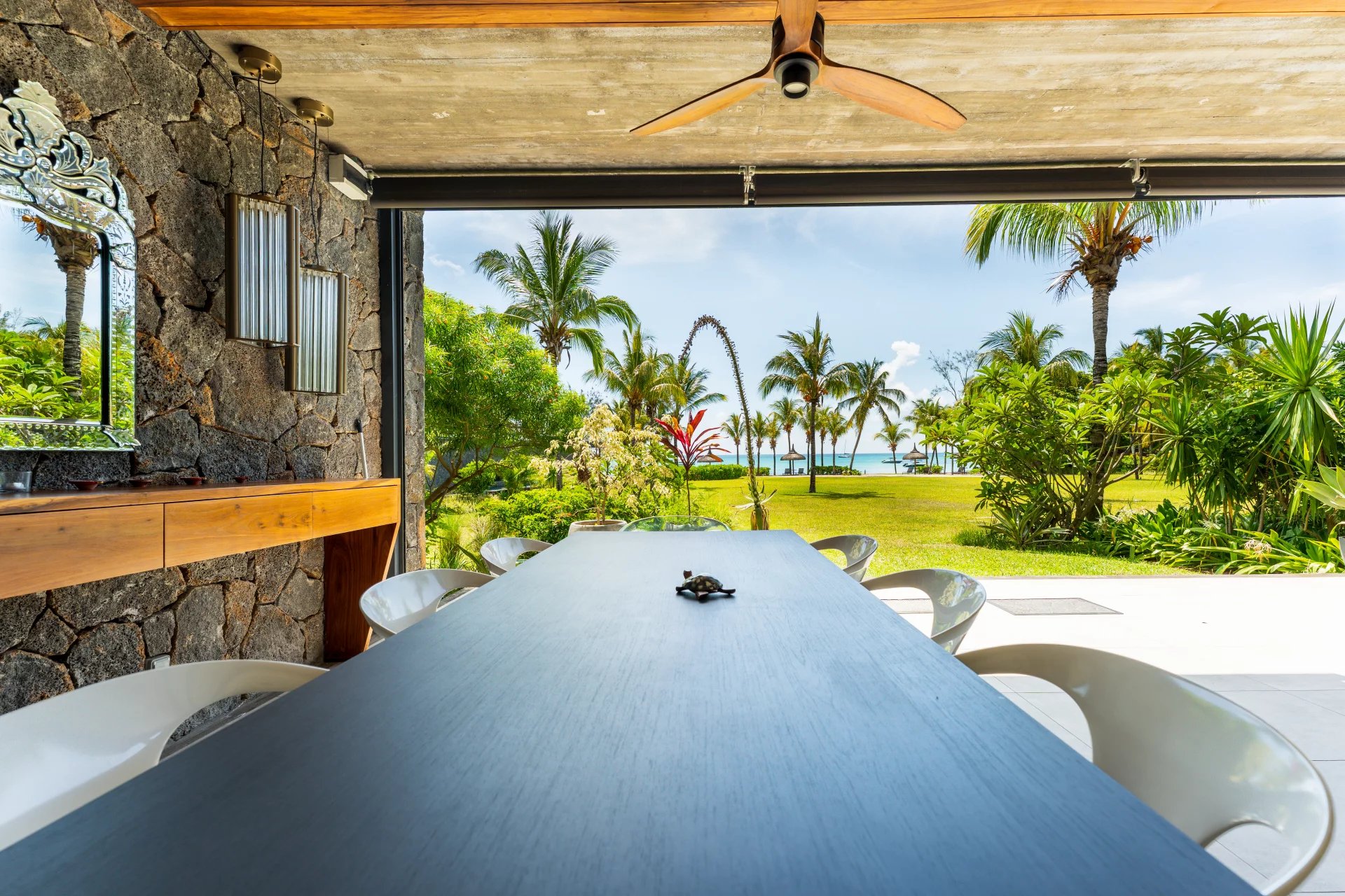 Les espaces de vie, séjour, cuisine, suite parentale et terrasse s'ouvrent entièrement sur l'extérieur, offrant une vue spectaculaire sur le lagon. L'appartement bénéficie également d'un sauna privé et d'un accès direct à la mer, accessible simplement en traversant le jardin tropical.
