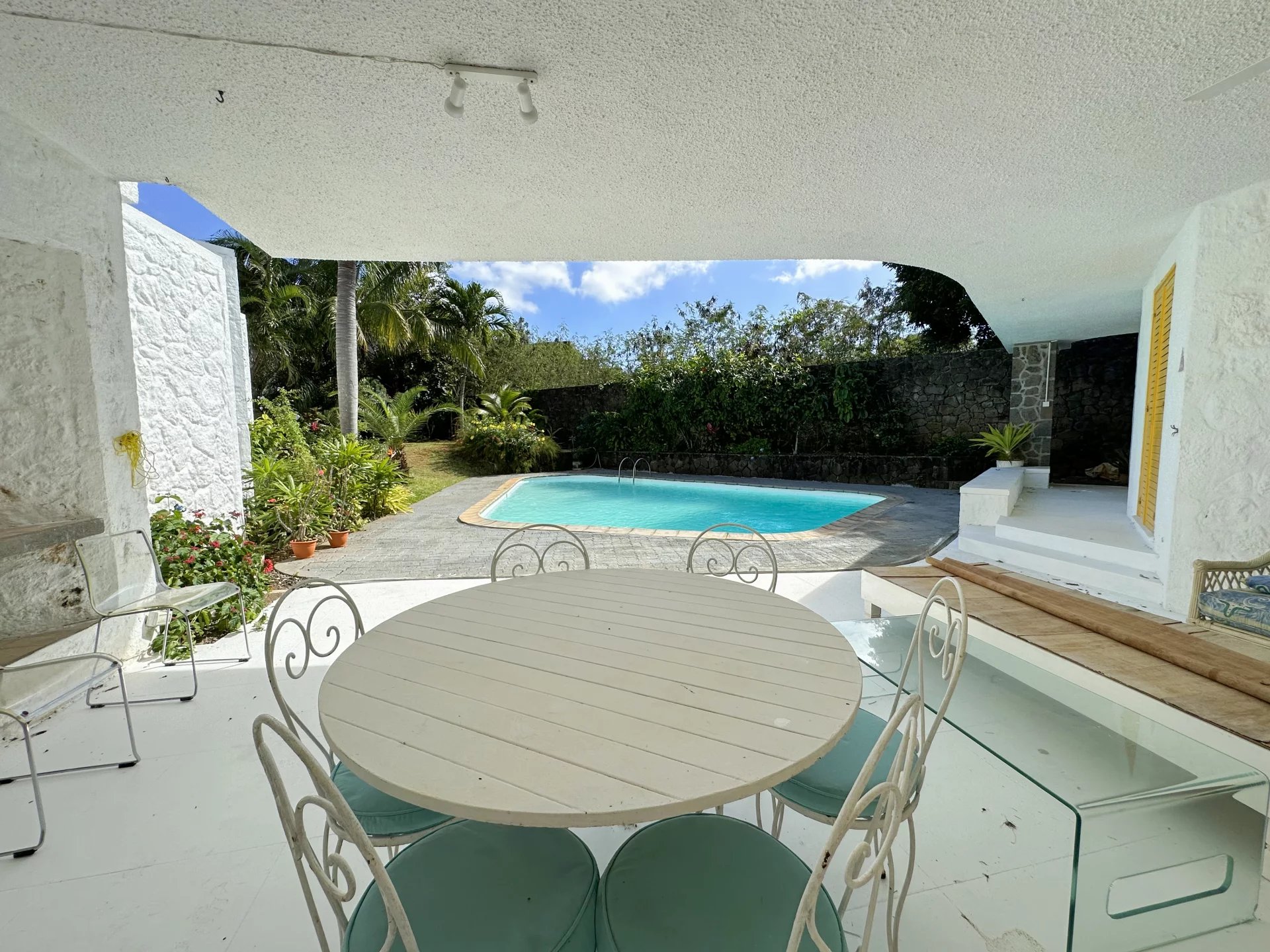 La propriété d'environ 300 m² sur un terrain de 1 200 m² est composée d'une villa de deux chambres, d'un bureau, d'une cuisine, d'une buanderie et d'un studio indépendant de 1 chambre, avec salon et cuisine s'ouvrant sur le grand terrain et la piscine.