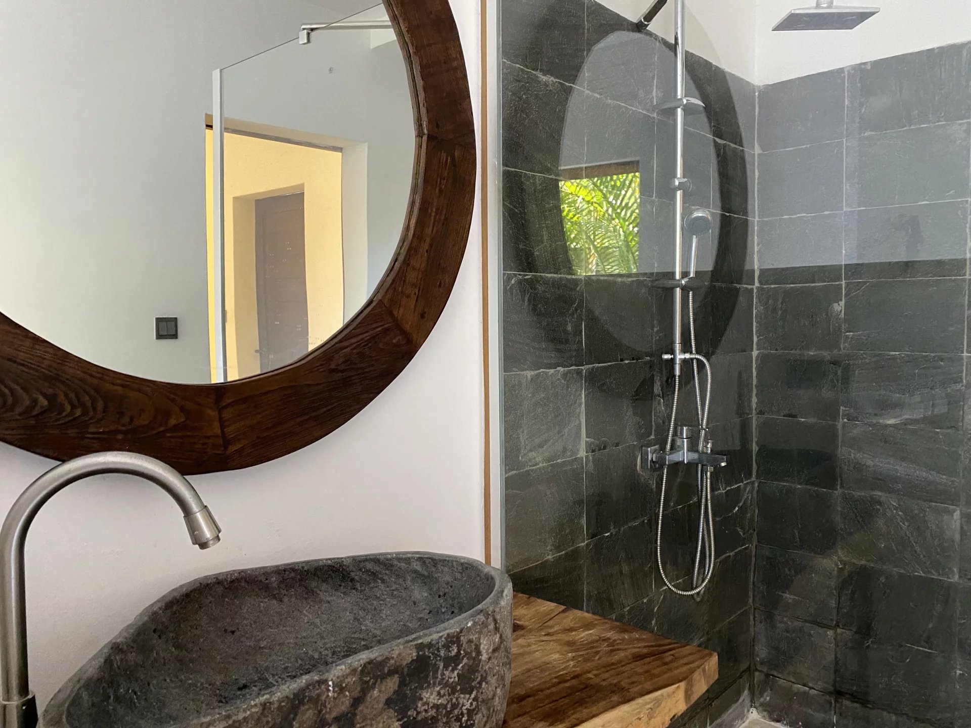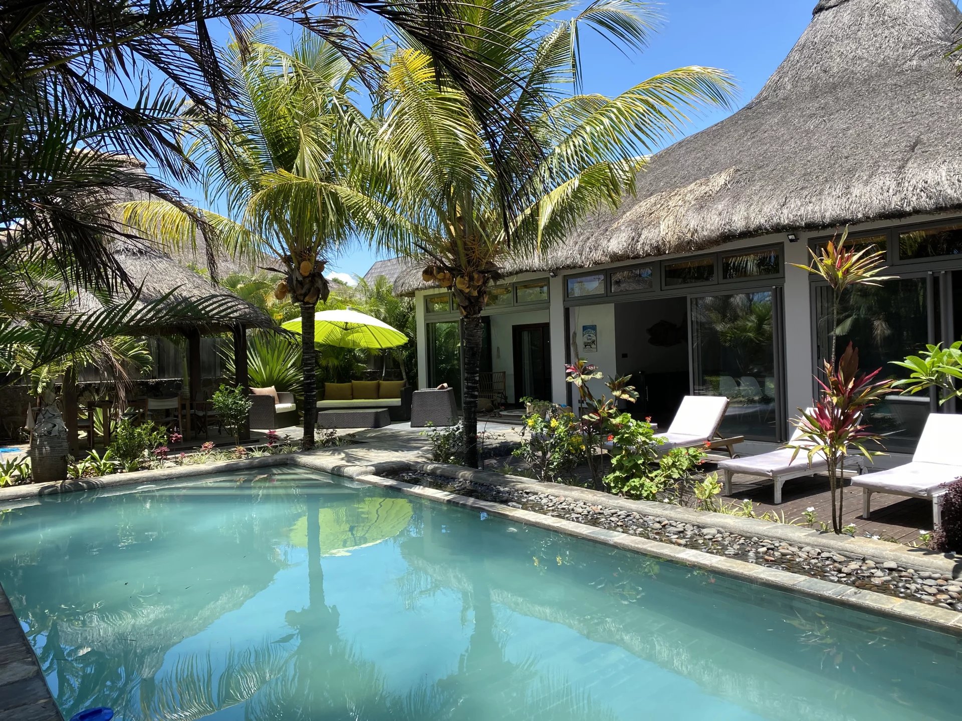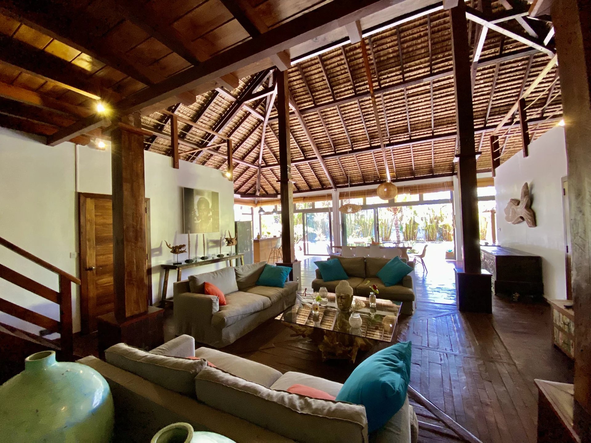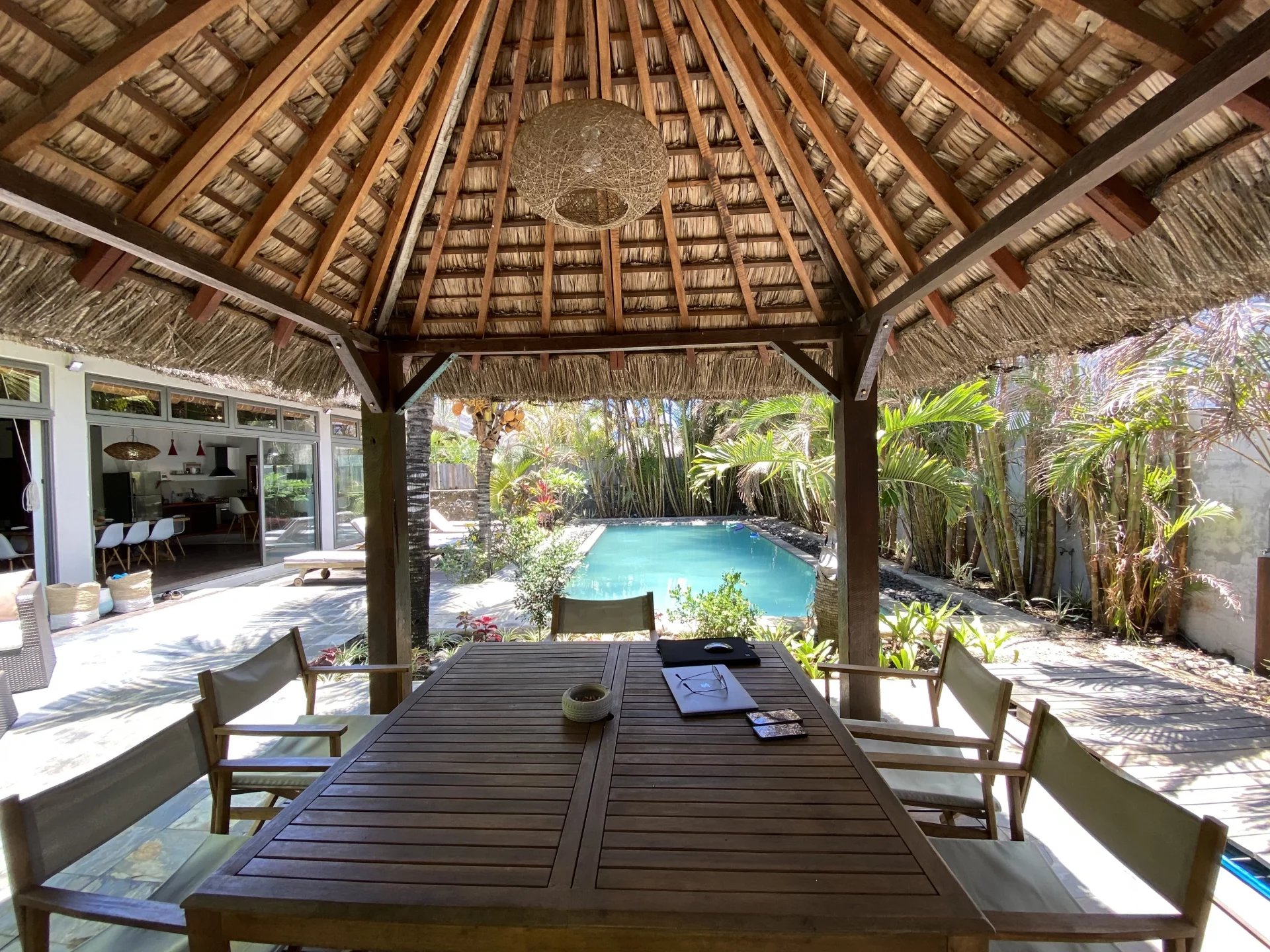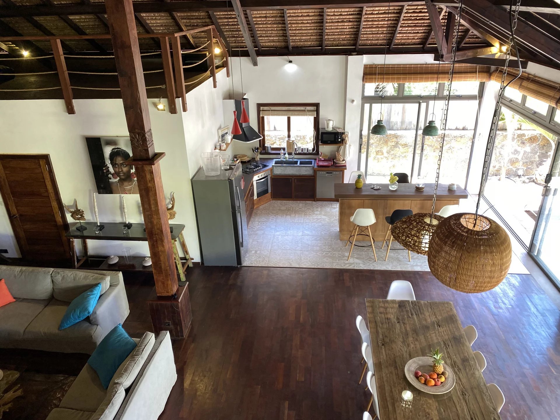 Au cœur de Pereybere, cette villa balinaise de 305 m² se compose d’un vaste espace séjour et salle à manger avec une superbe hauteur sous plafond sous le toit « Joglo ».