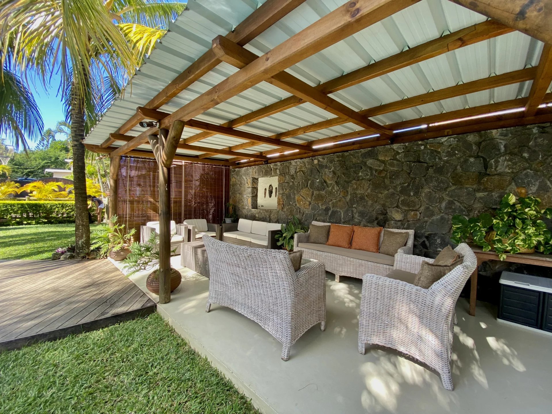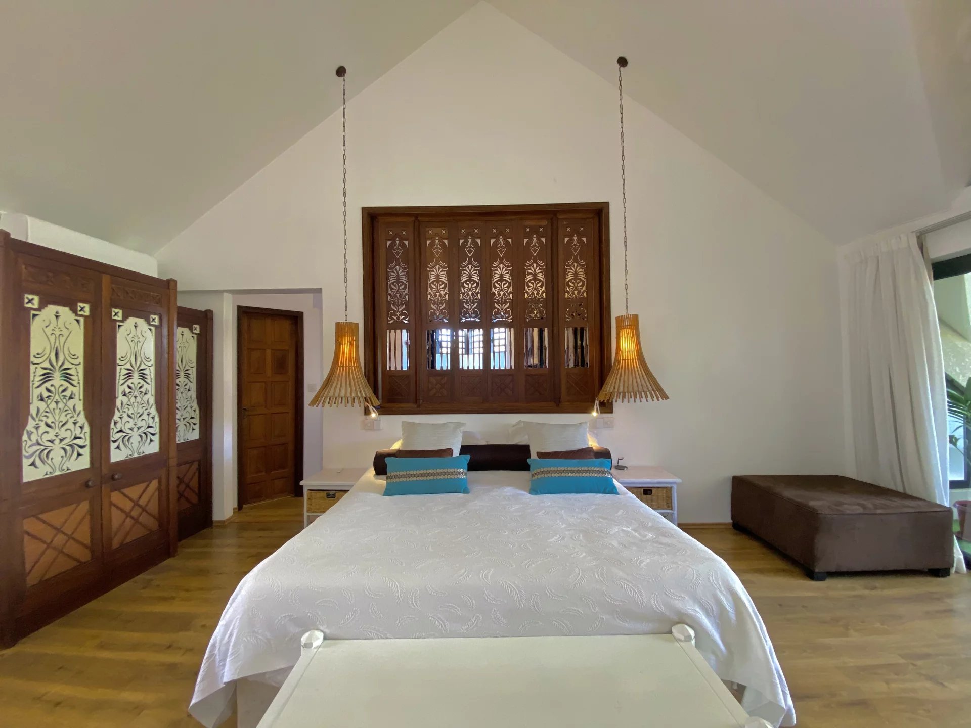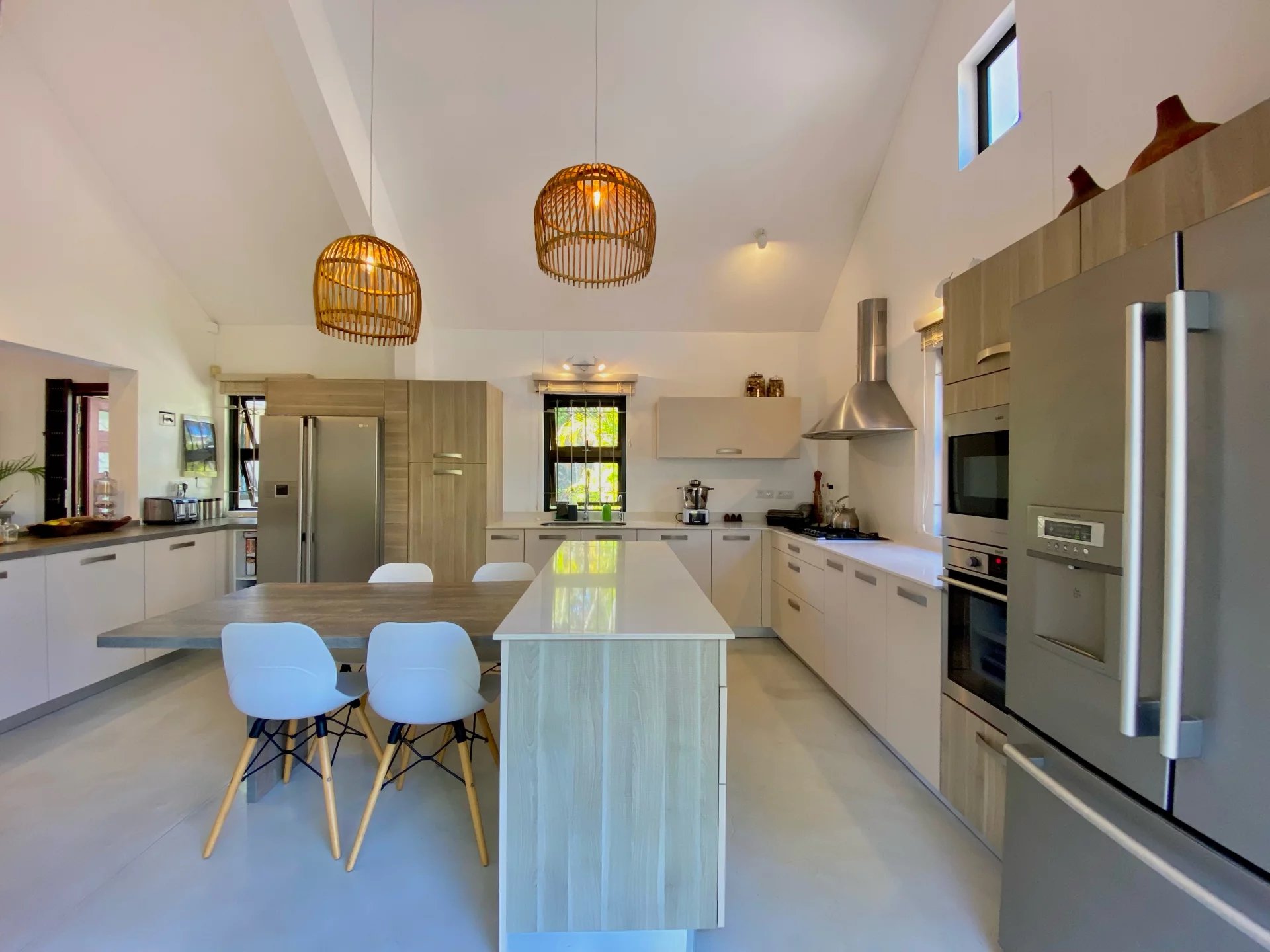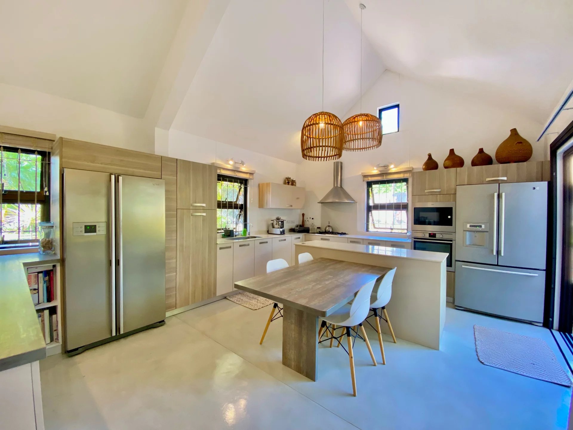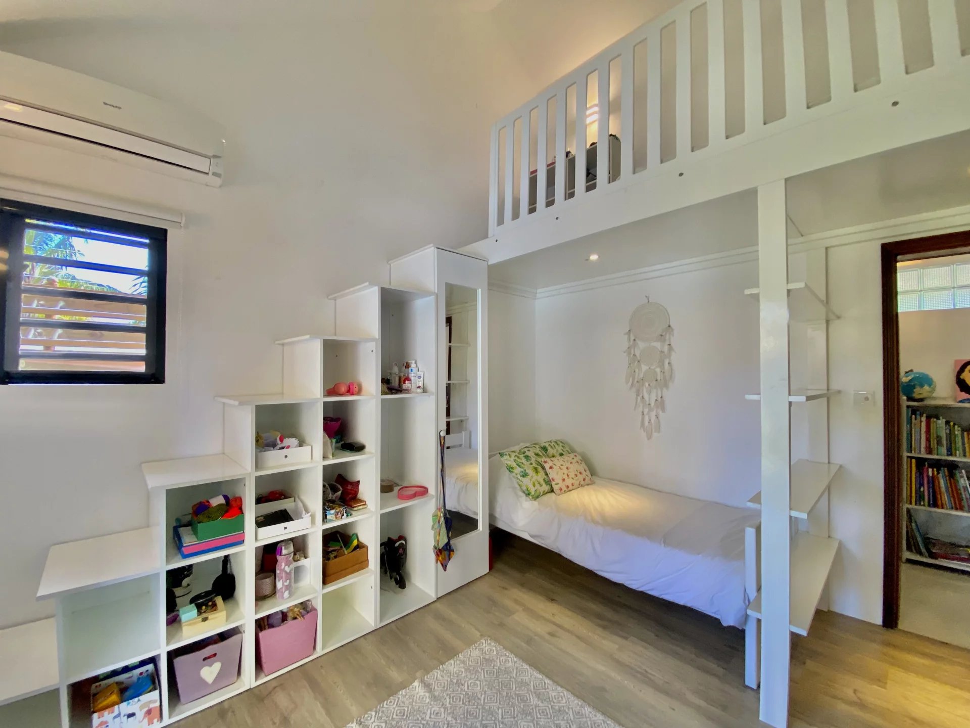 La villa possède 4 chambres possibilité 5, dont deux en suite. Elle se compose d'un grand bureau , d'une cuisine s'ouvrant sur un grand salon et d'un jardin tropical avec piscine et kiosk de 27 m².