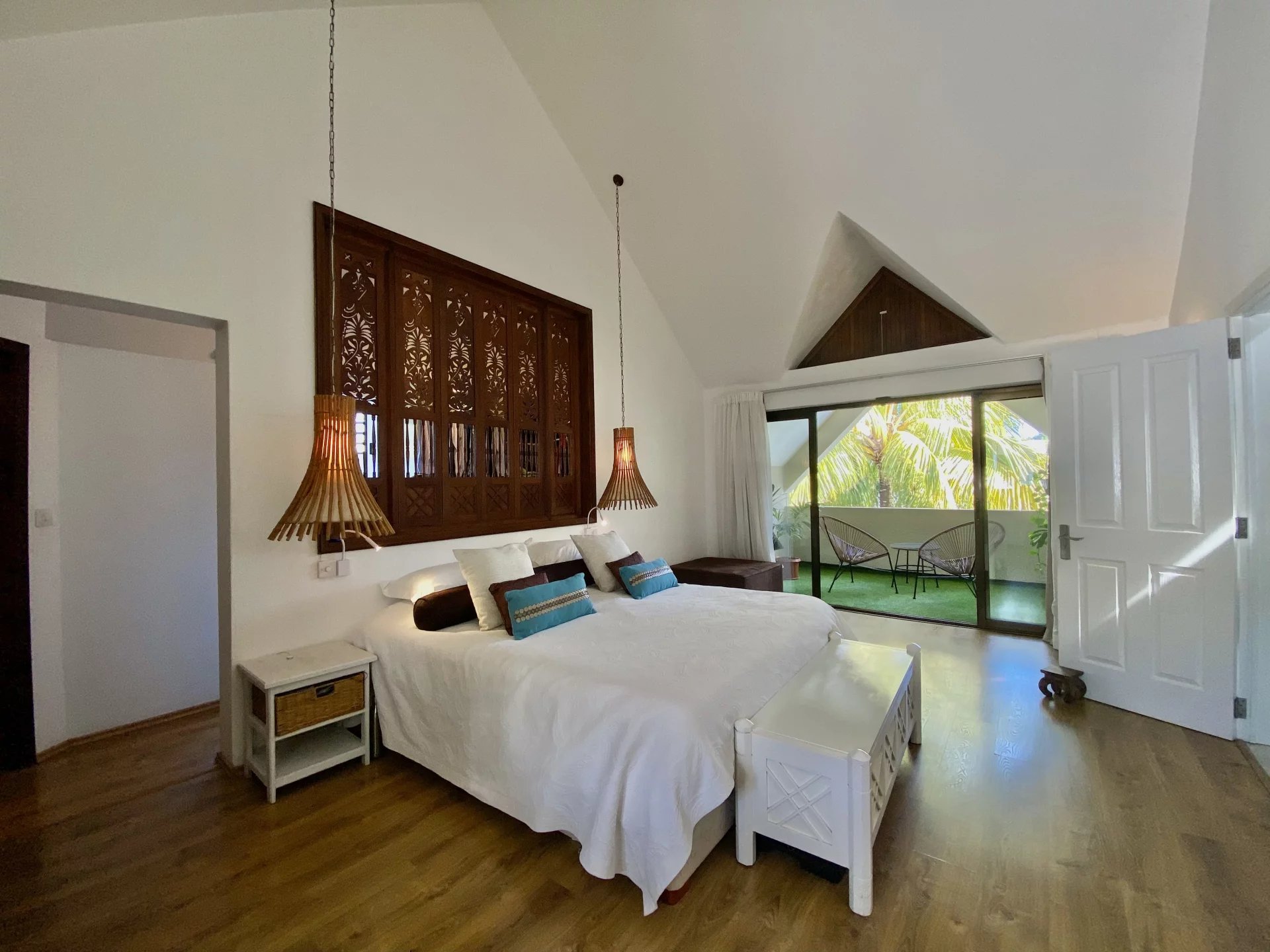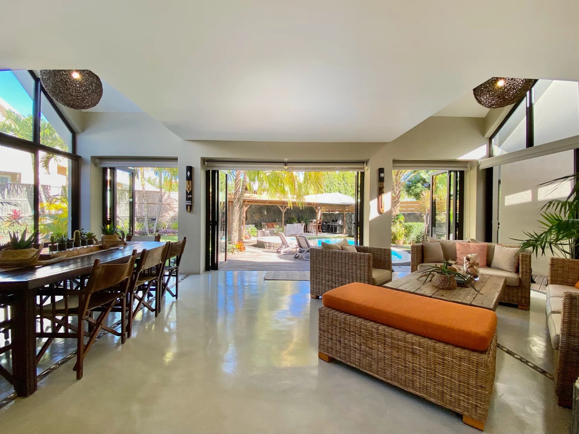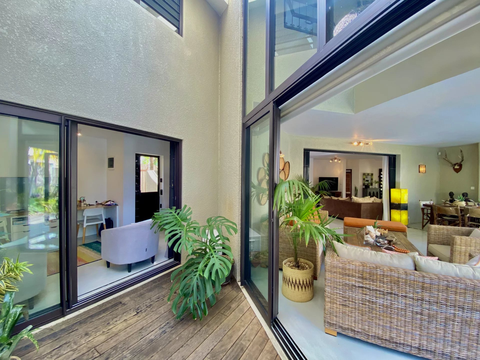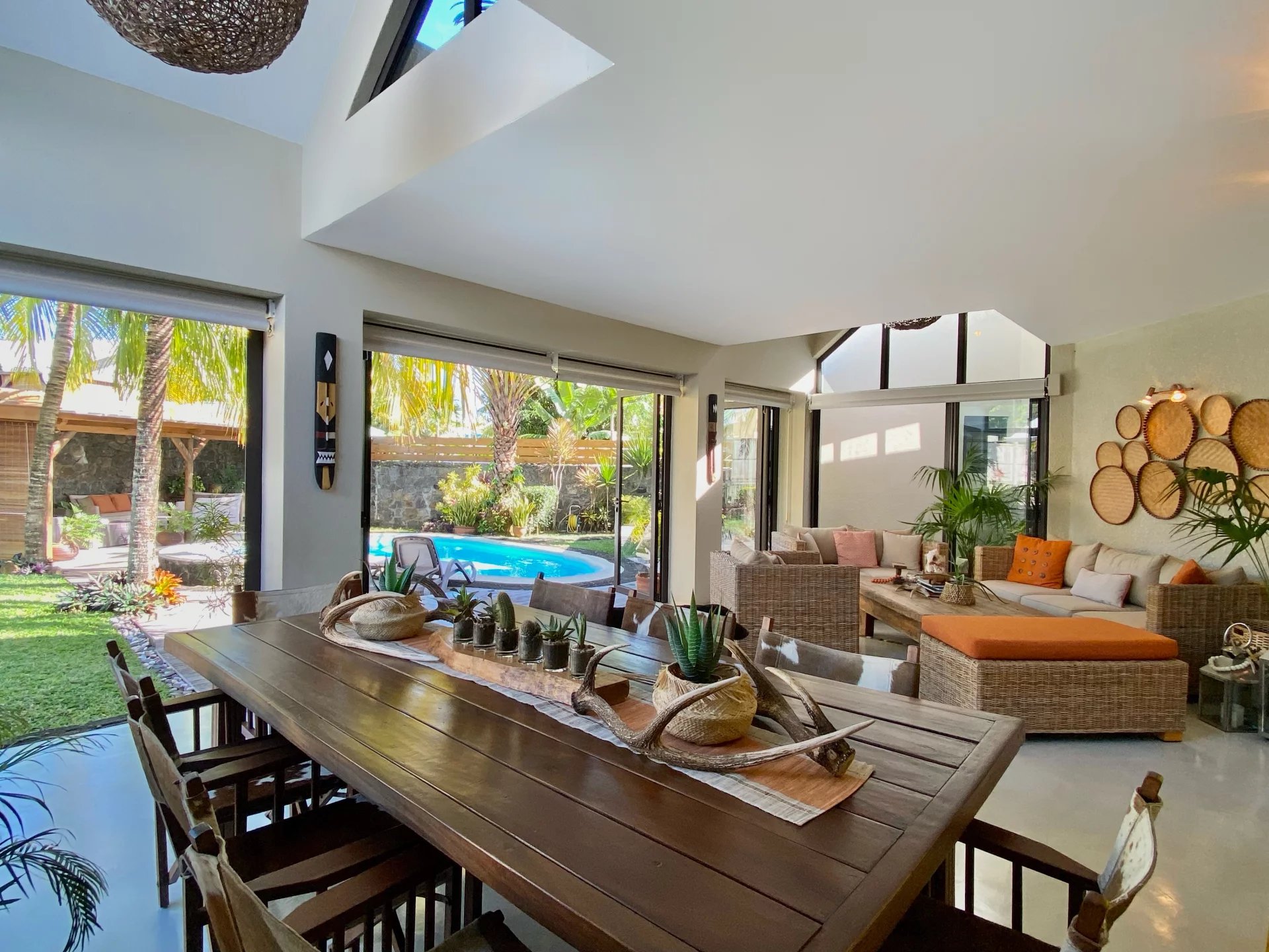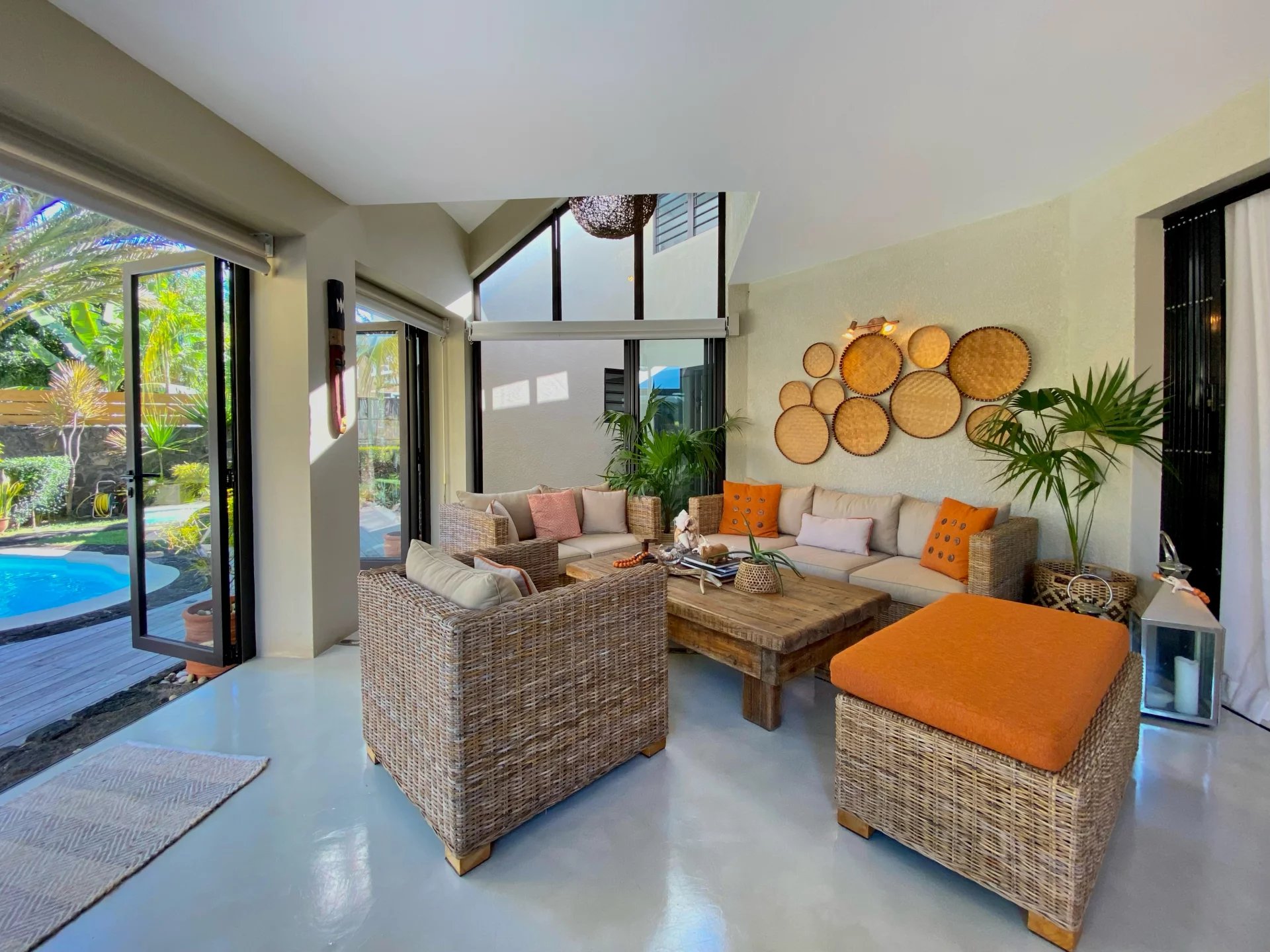 La villa possède 4 chambres possibilité 5, dont deux en suite. Elle se compose d'un grand bureau , d'une cuisine s'ouvrant sur un grand salon et d'un jardin tropical avec piscine et kiosk de 27 m².