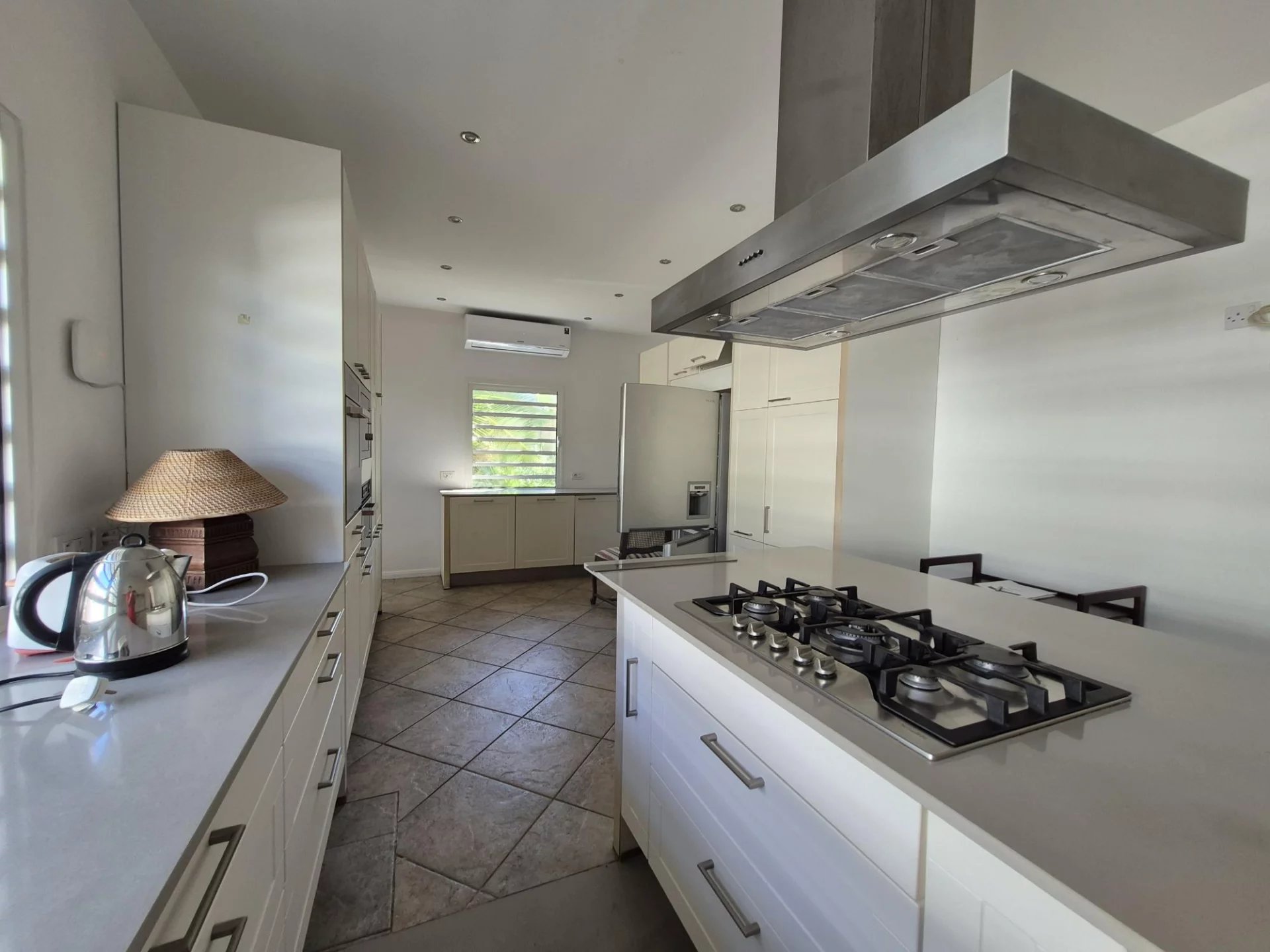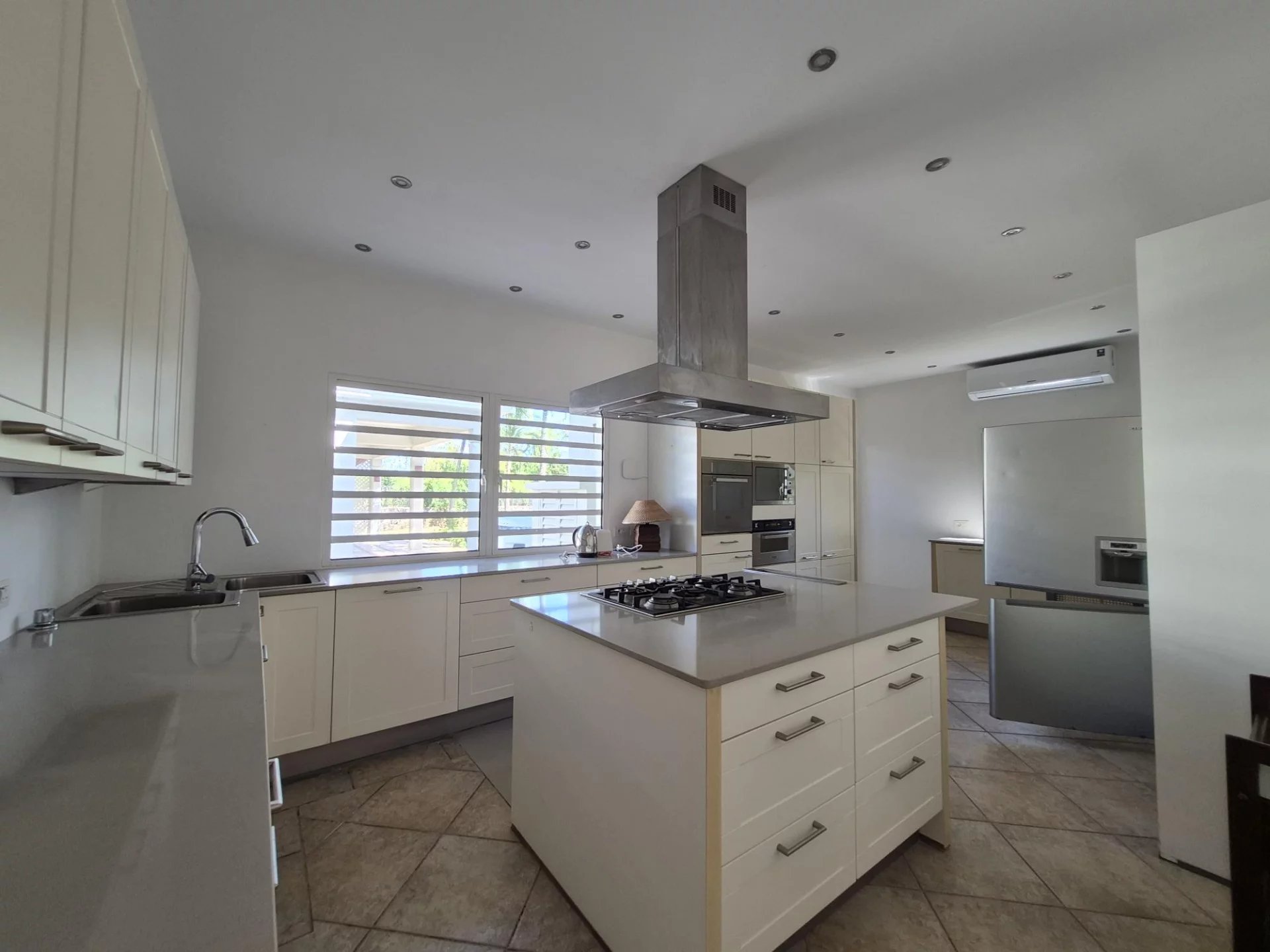 La cuisine moderne et climatisée, parfaitement entretenue, se trouve à proximité d’une salle de loisirs polyvalente, pouvant également servir de chambre supplémentaire avec salle de bain attenante.