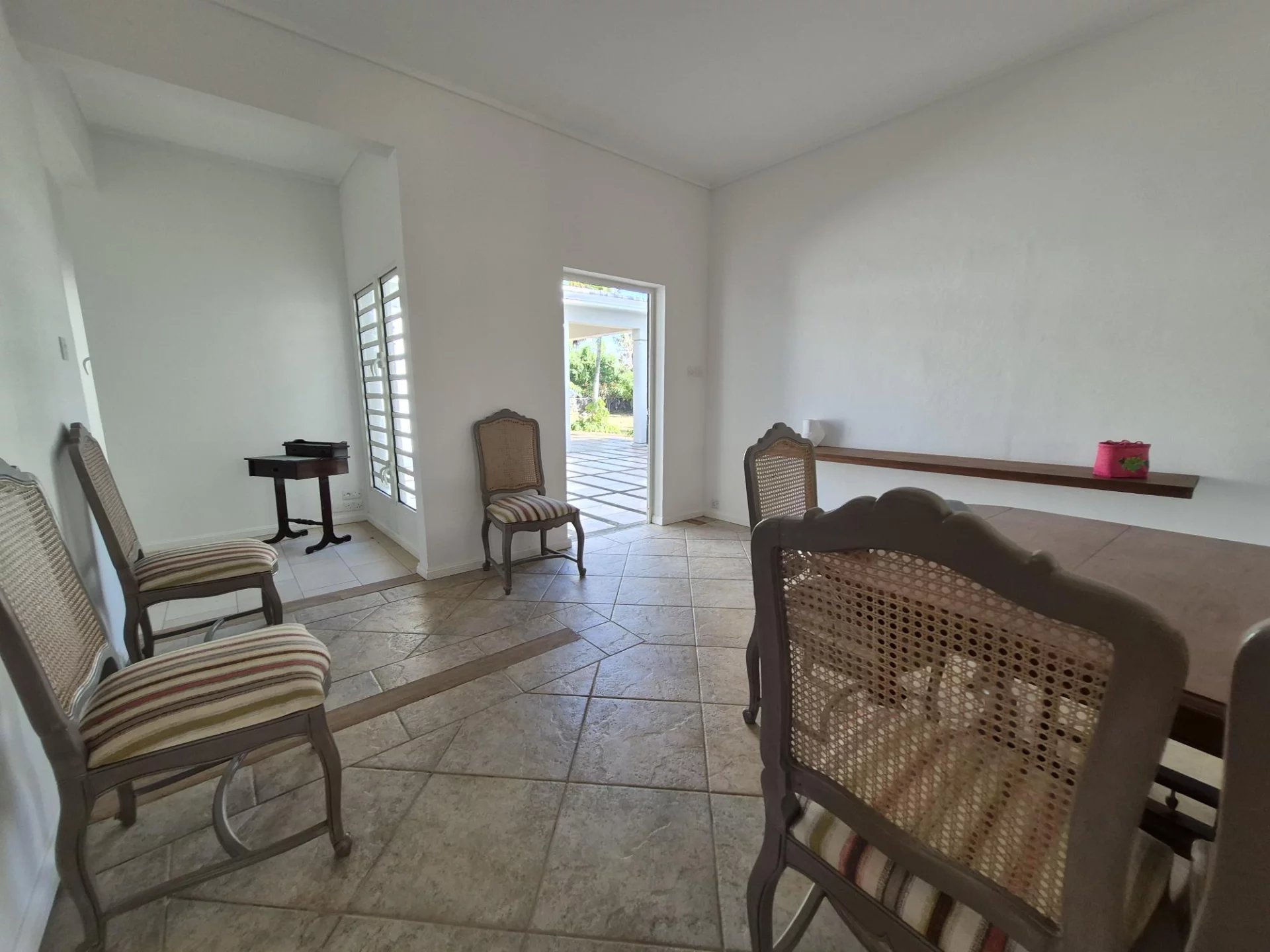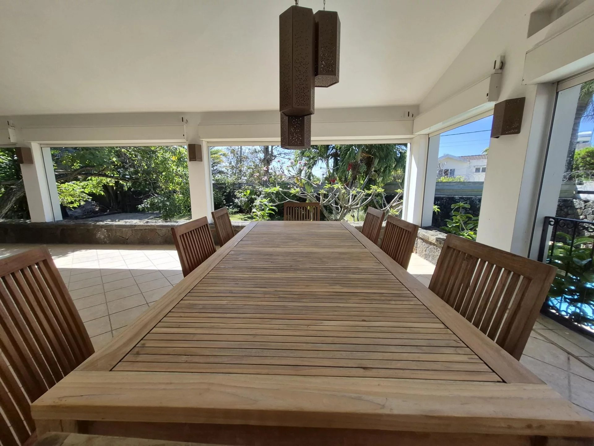 Dès l’entrée, vous serez séduits par les volumes généreux : un salon lumineux et une salle à manger qui s’ouvrent harmonieusement sur une grande véranda donnant sur la piscine scintillante et le jardin tropical luxuriant, idéal pour se détendre ou recevoir.