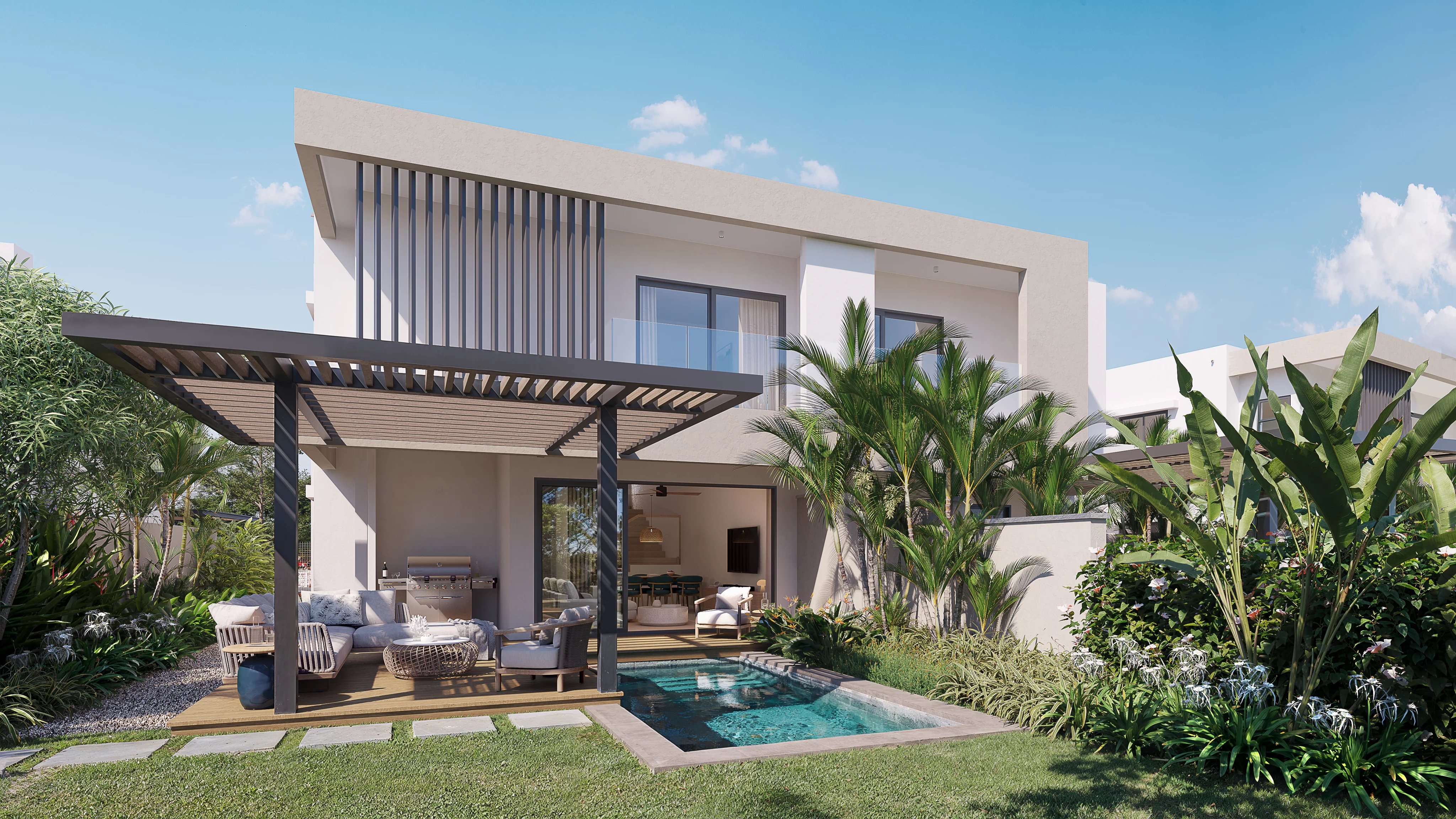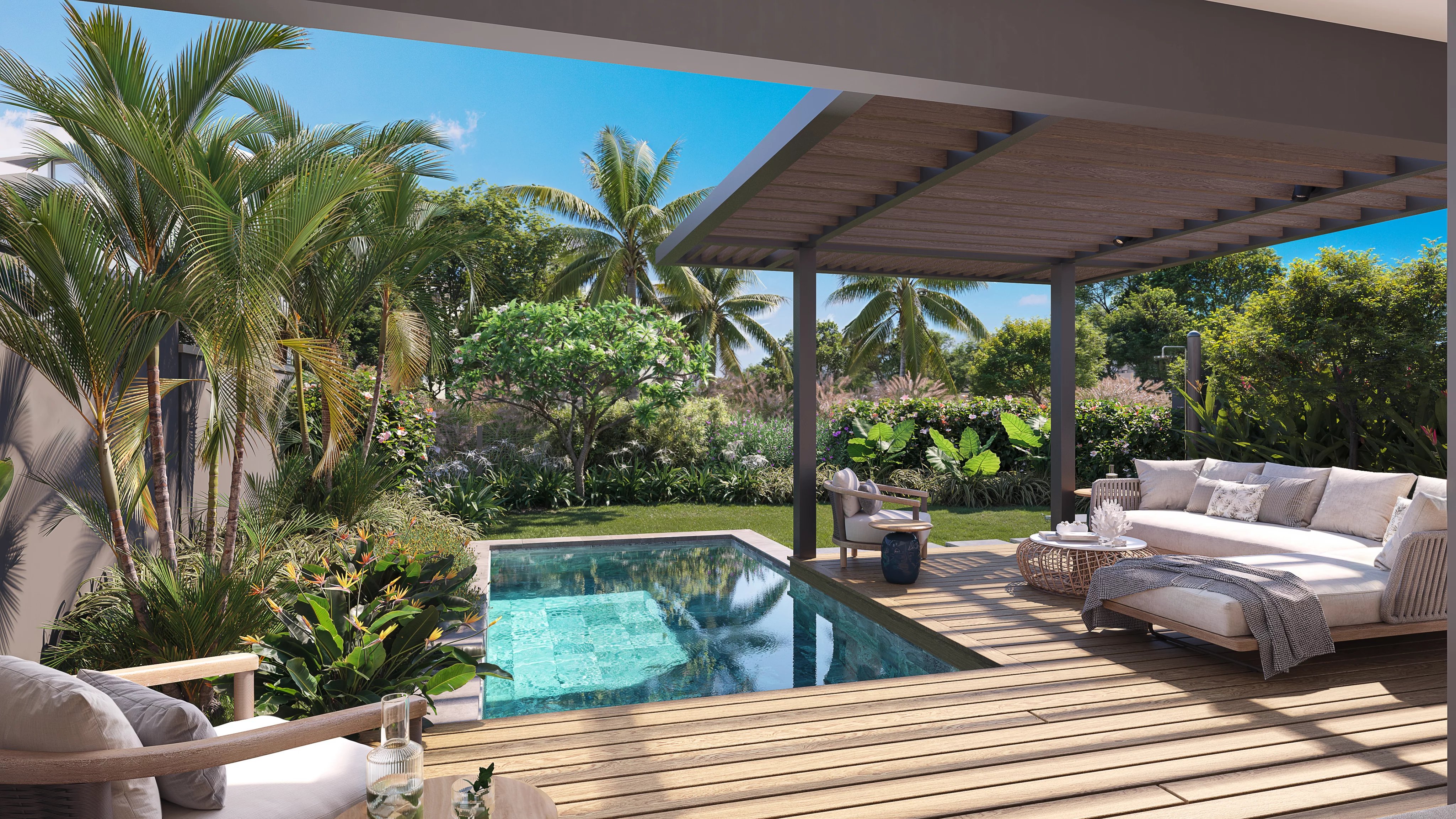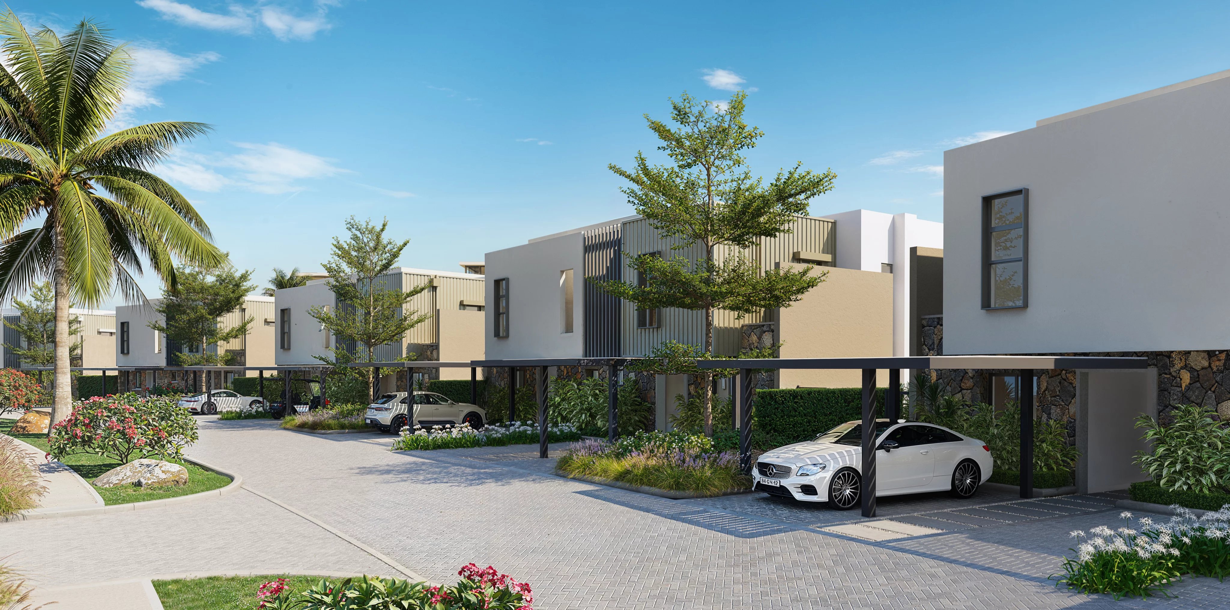 Pensé pour maximiser la lumière et la fluidité des espaces, ces résidences adoptent une configuration ouverte où la cuisine, la salle à manger et le séjour s’enchaînent harmonieusement. Cette continuité se prolonge vers la terrasse couverte et le jardin, créant une véritable expérience de vie entre intérieur et extérieur. Que ce soit pour un café matinal paisible ou une soirée détendue, chaque espace s’adapte au rythme du quotidien.