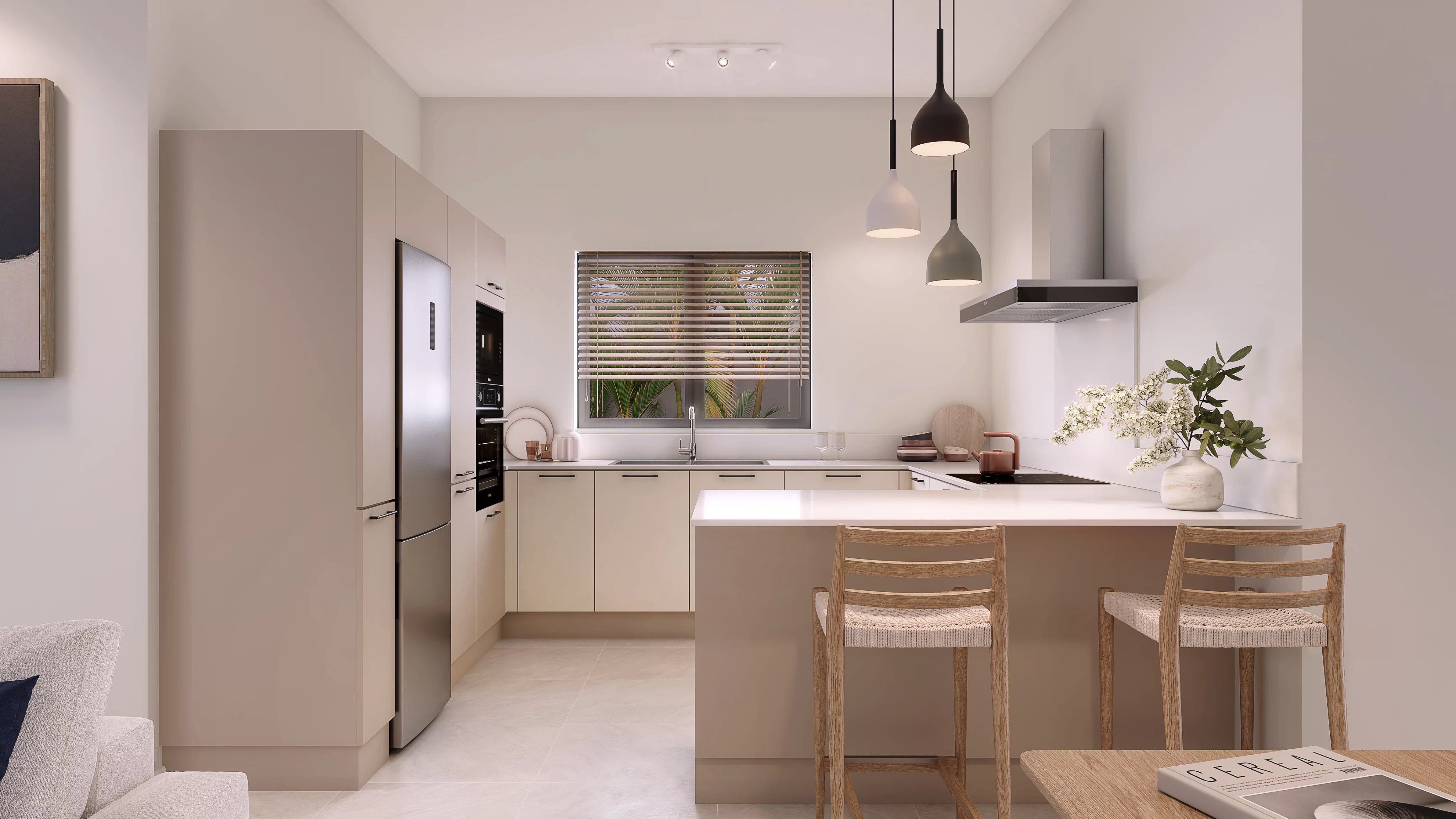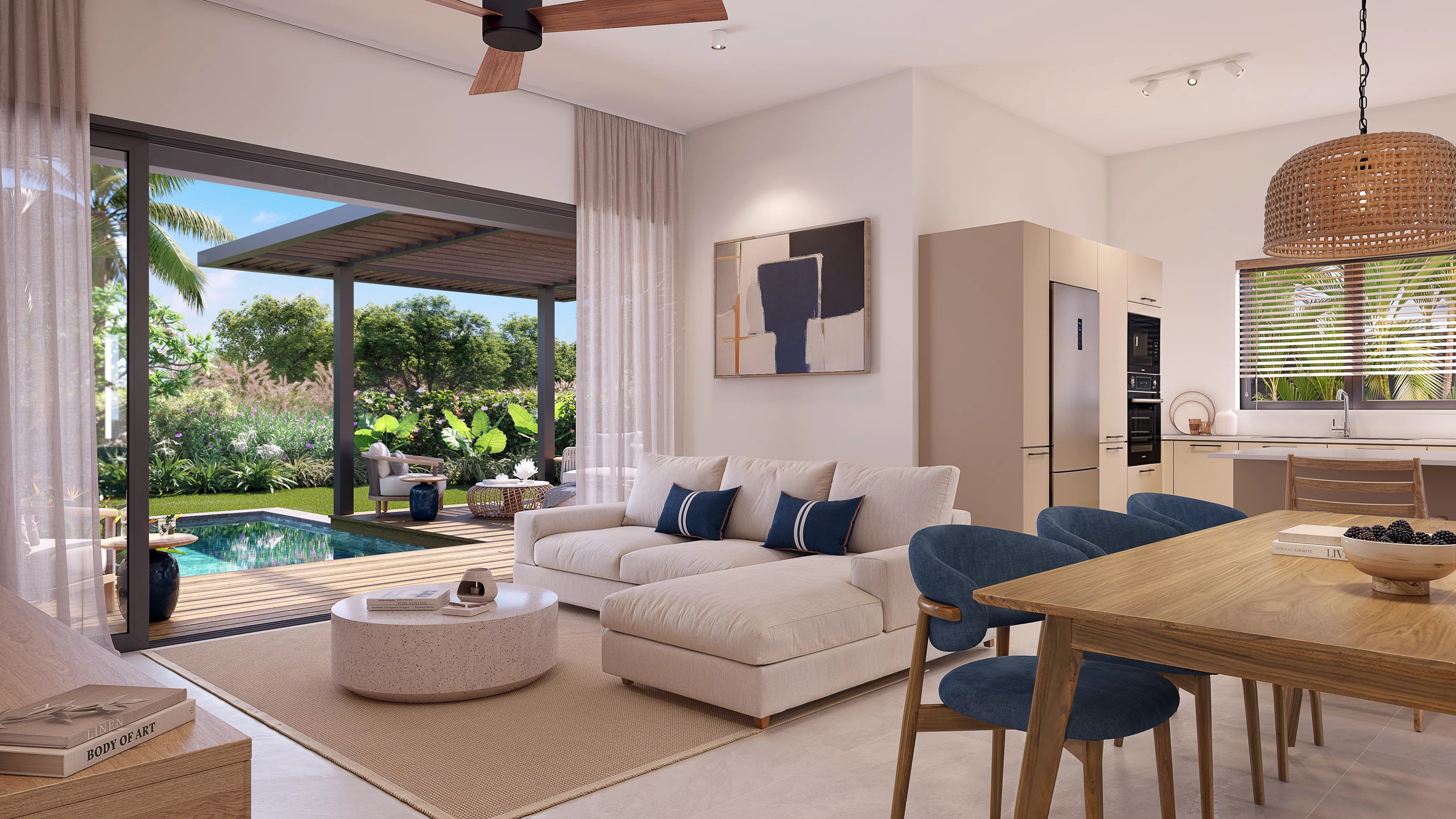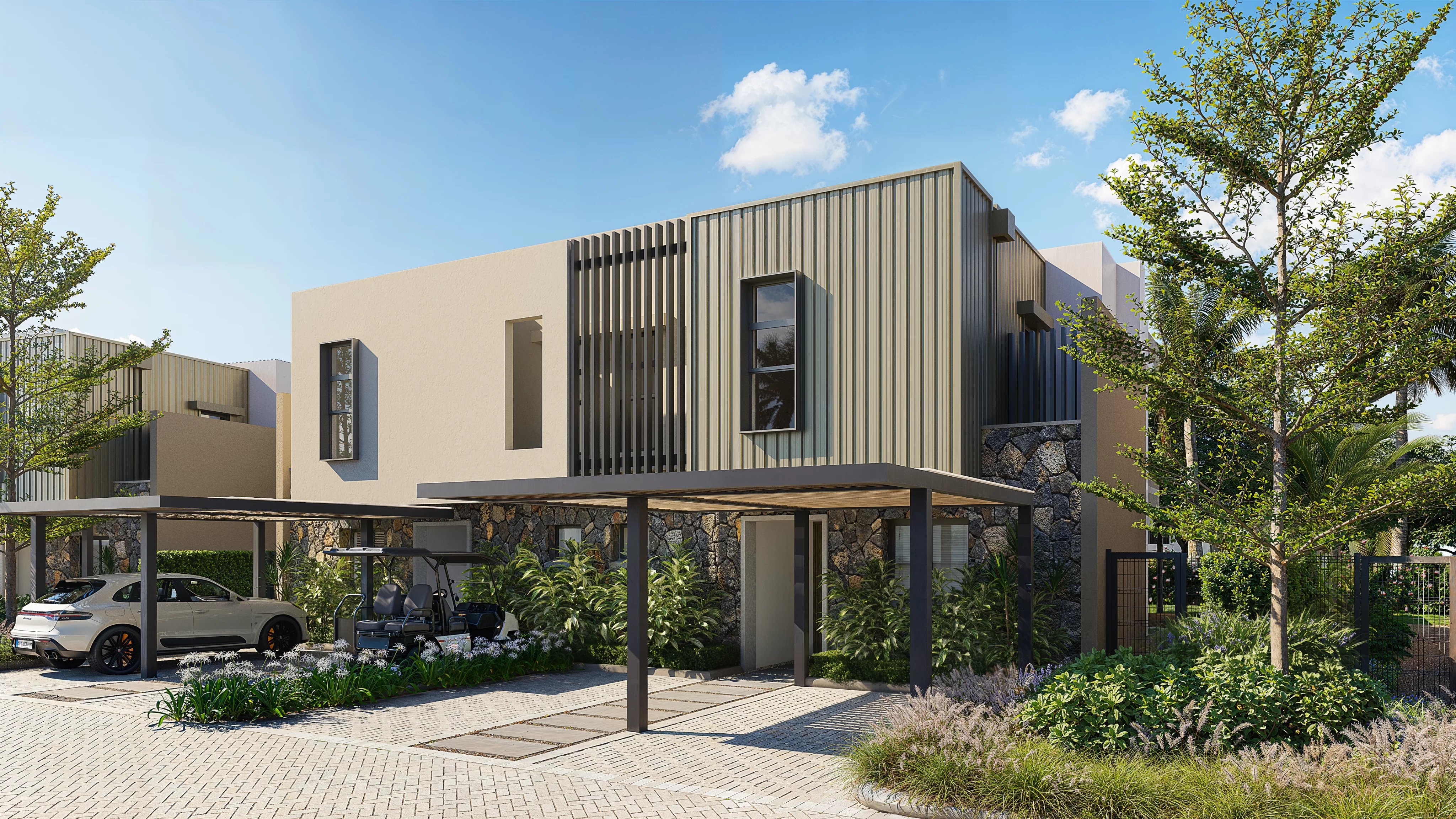 Pensé pour maximiser la lumière et la fluidité des espaces, ces résidences adoptent une configuration ouverte où la cuisine, la salle à manger et le séjour s’enchaînent harmonieusement. Cette continuité se prolonge vers la terrasse couverte et le jardin, créant une véritable expérience de vie entre intérieur et extérieur. Que ce soit pour un café matinal paisible ou une soirée détendue, chaque espace s’adapte au rythme du quotidien.