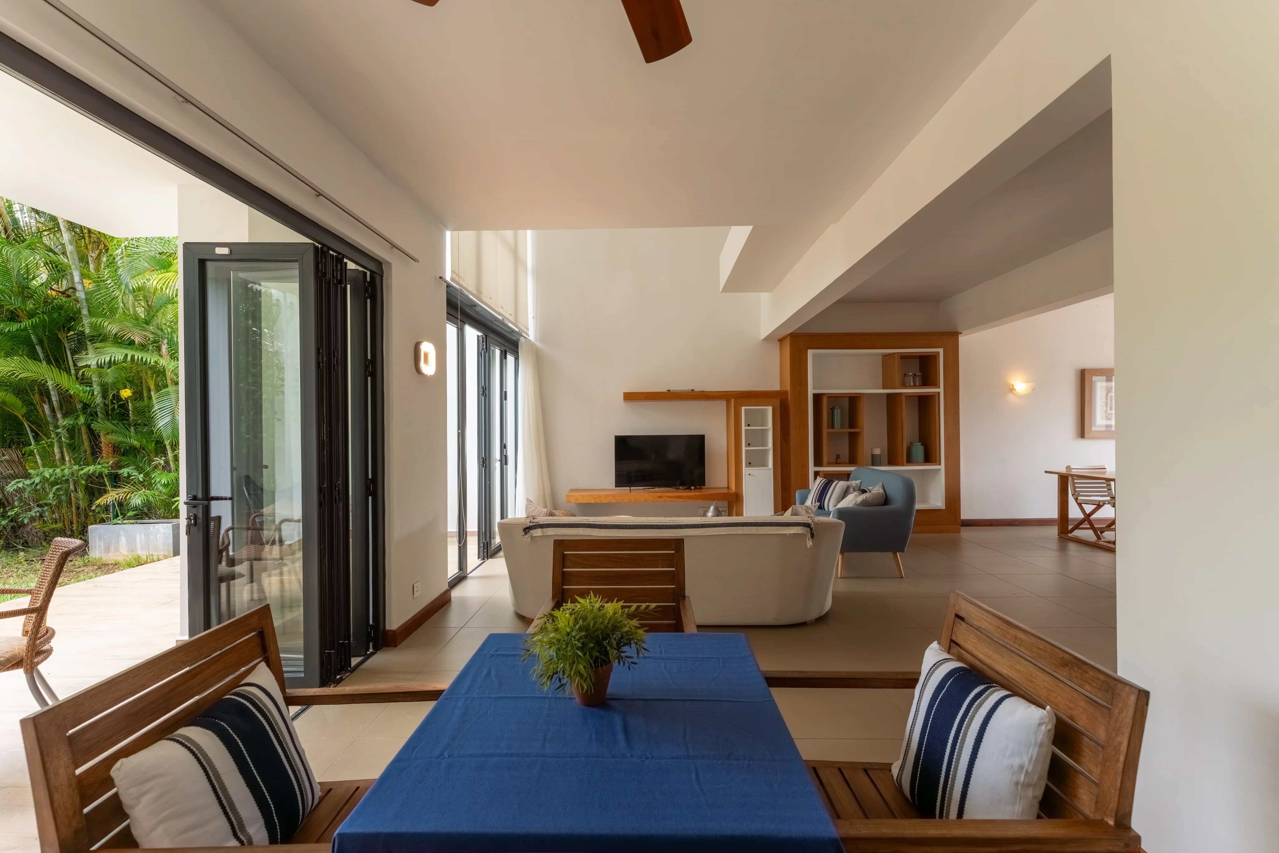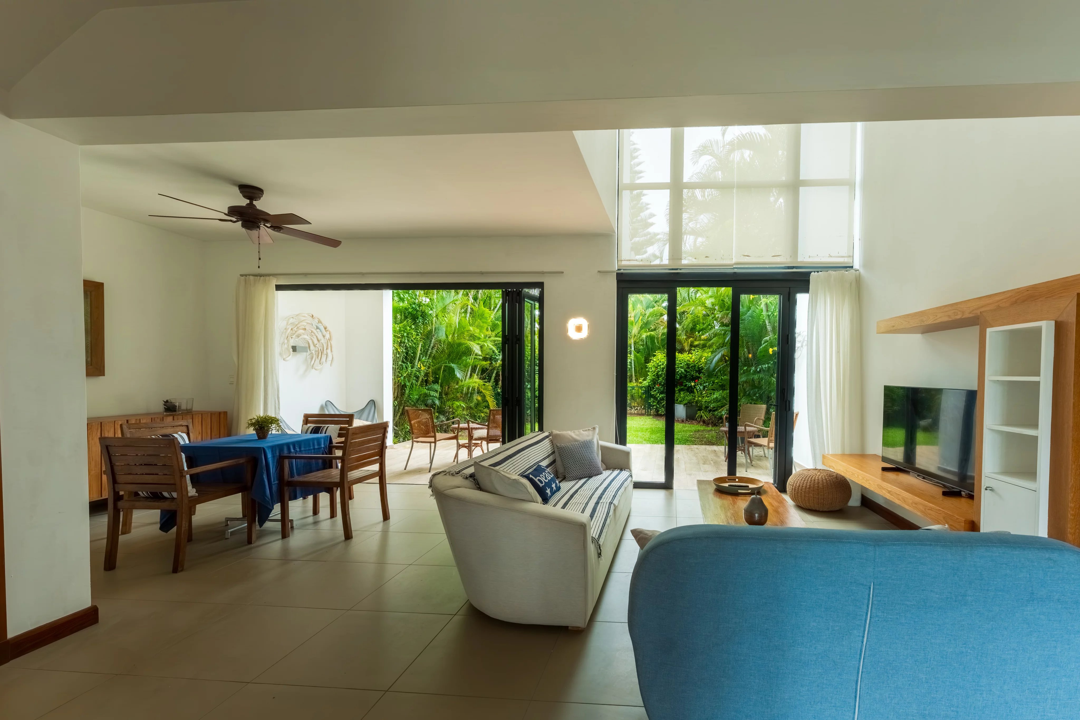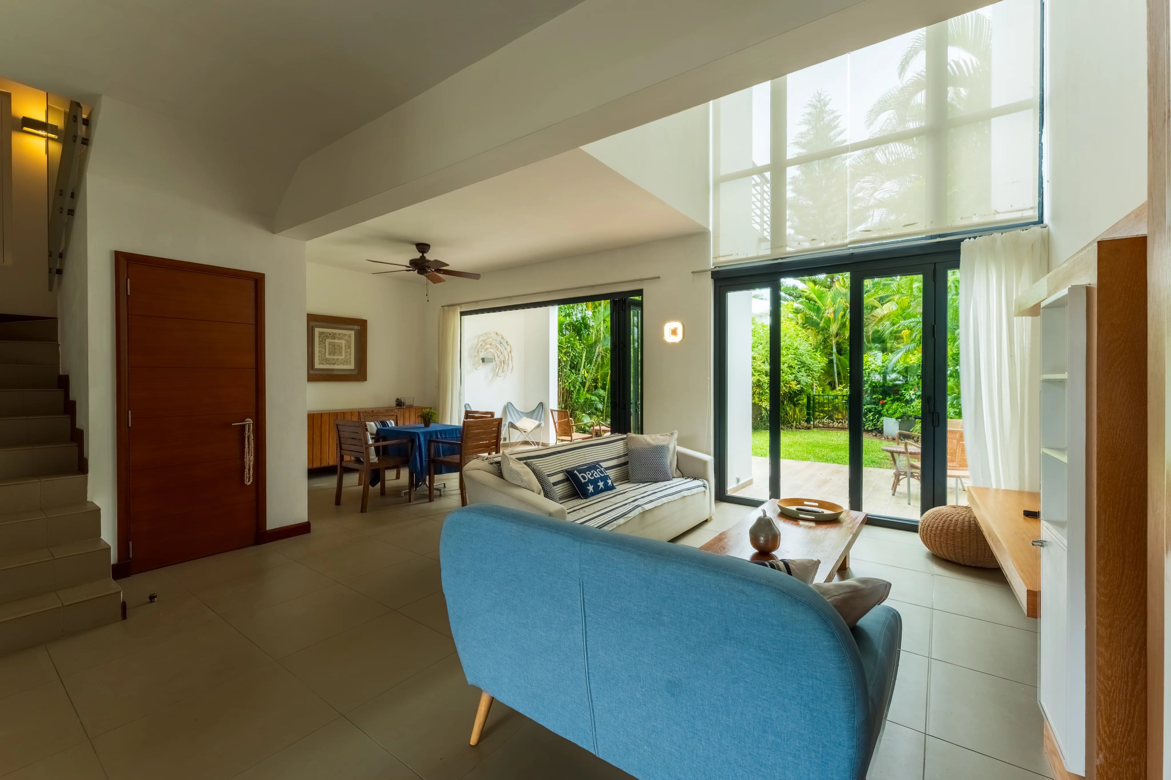 Le rez-de-chaussée propose un vaste espace de vie lumineux comprenant salon, salle à manger et cuisine entièrement équipée, ouvert sur trois vérandas prolongées par le jardin, créant une parfaite continuité entre l’intérieur et l’extérieur. L’exposition traversante nord-sud garantit une luminosité naturelle et une ventilation optimale tout au long de la journée.