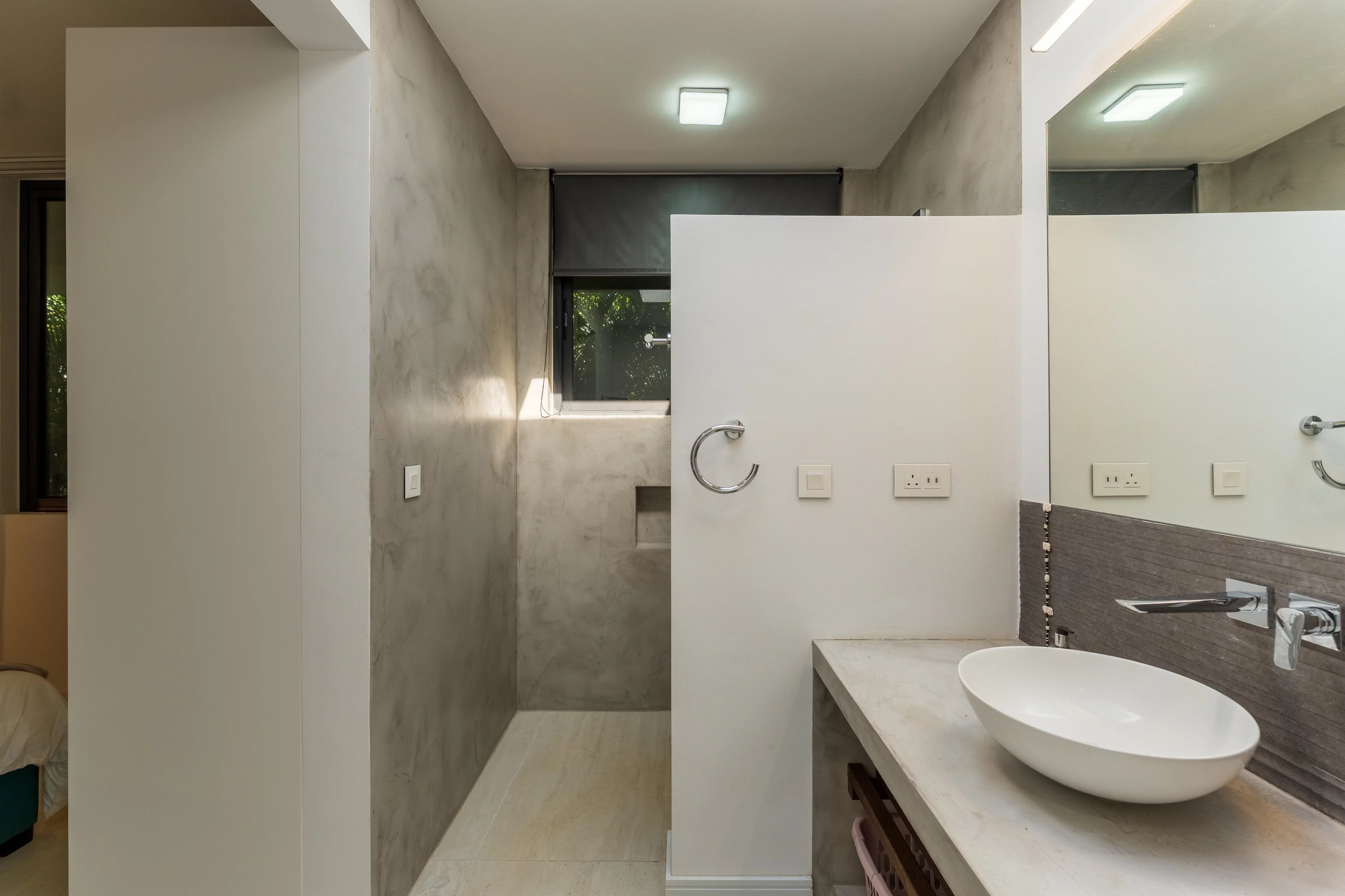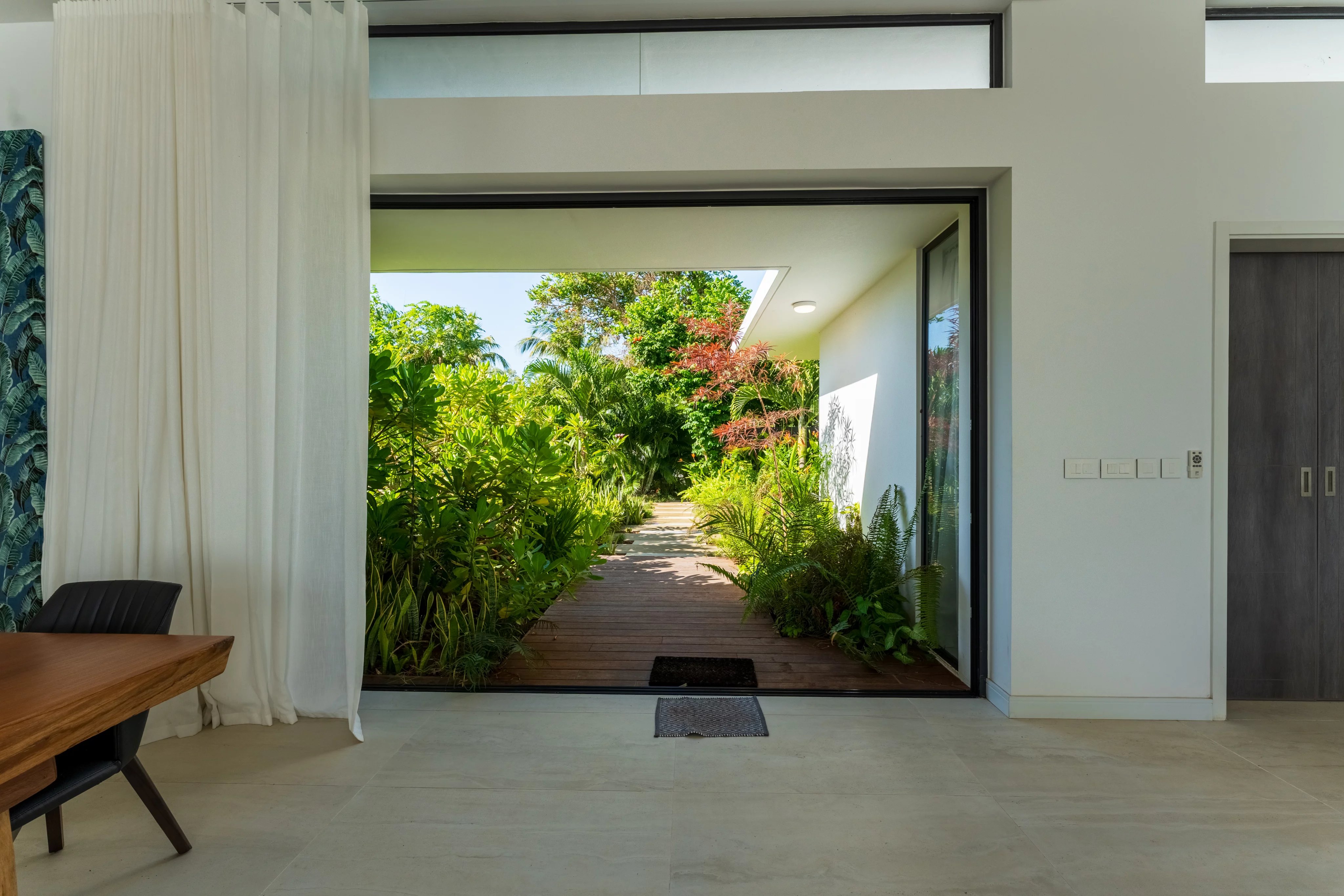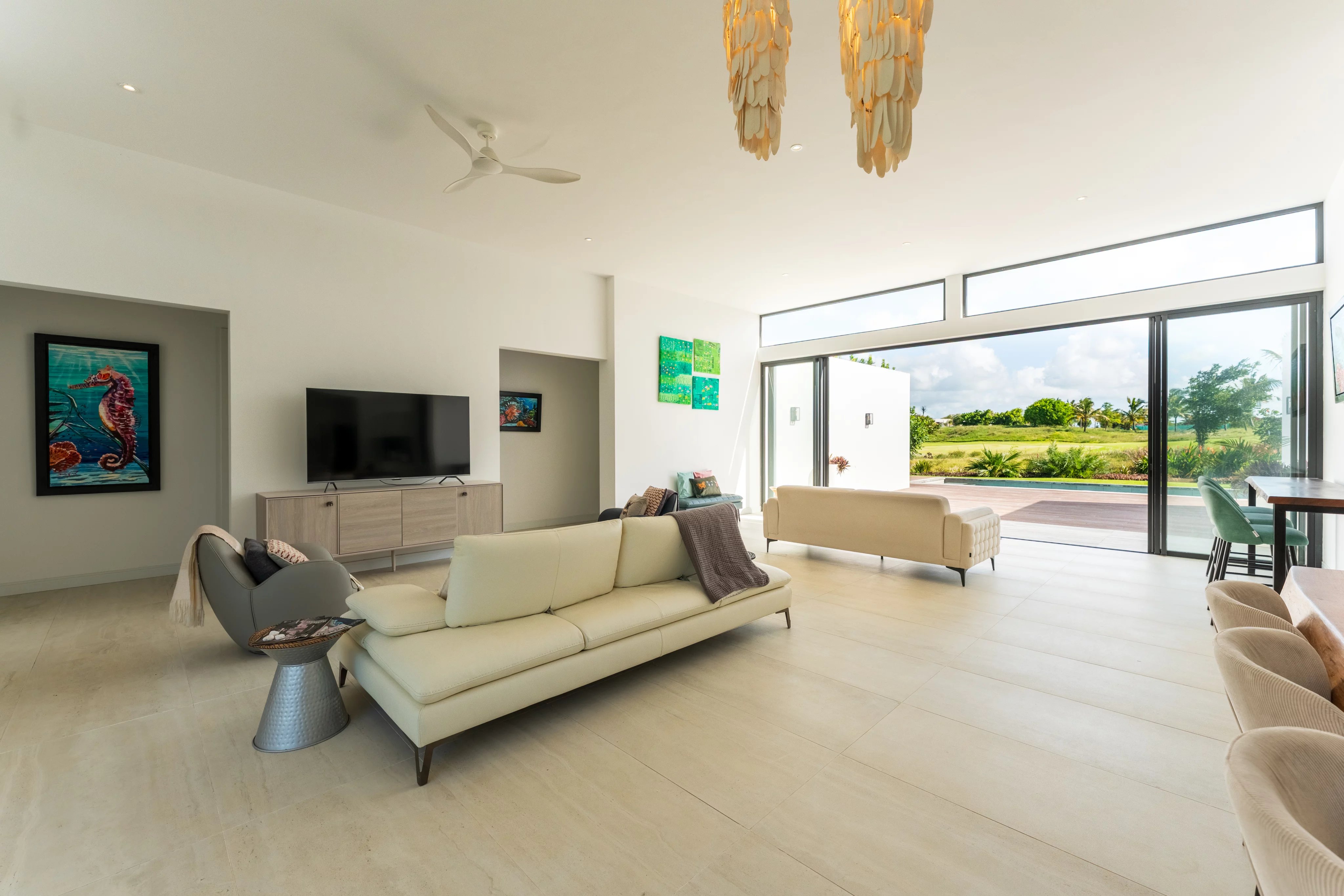La villa dispose de 4 chambres avec salle de bain, d'un séjour lumineux ouvert sur la terrasse, le jardin et la piscine. Les grandes ouvertures permettent de profiter pleinement de la vue sur le parcours et de la lumière naturelle. Les quatre chambres avec salle de bain sont confortables et spacieuses.