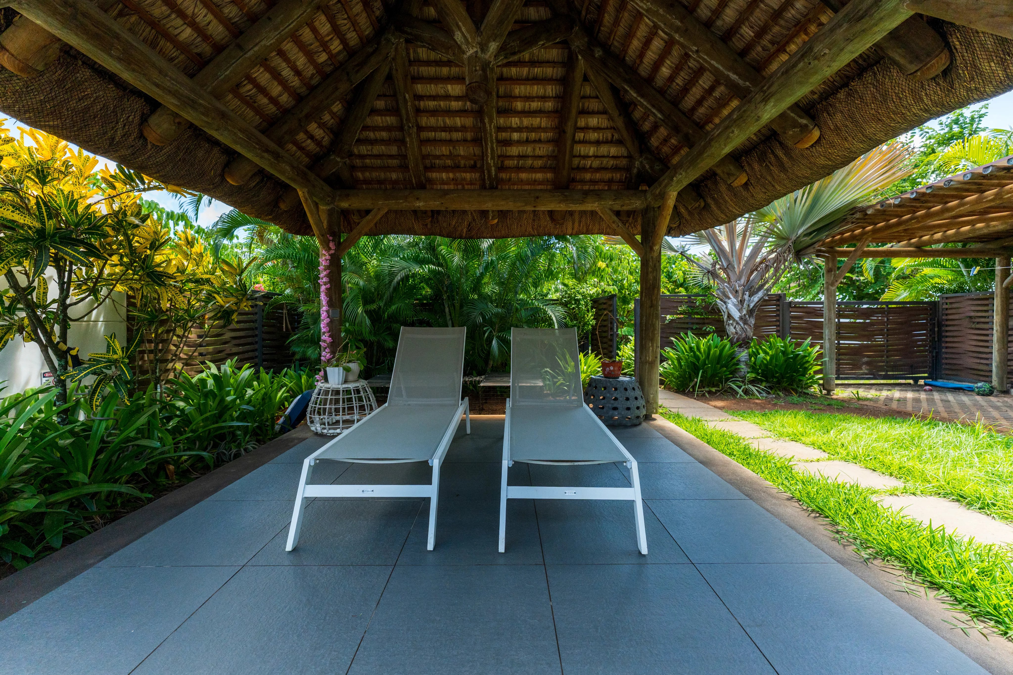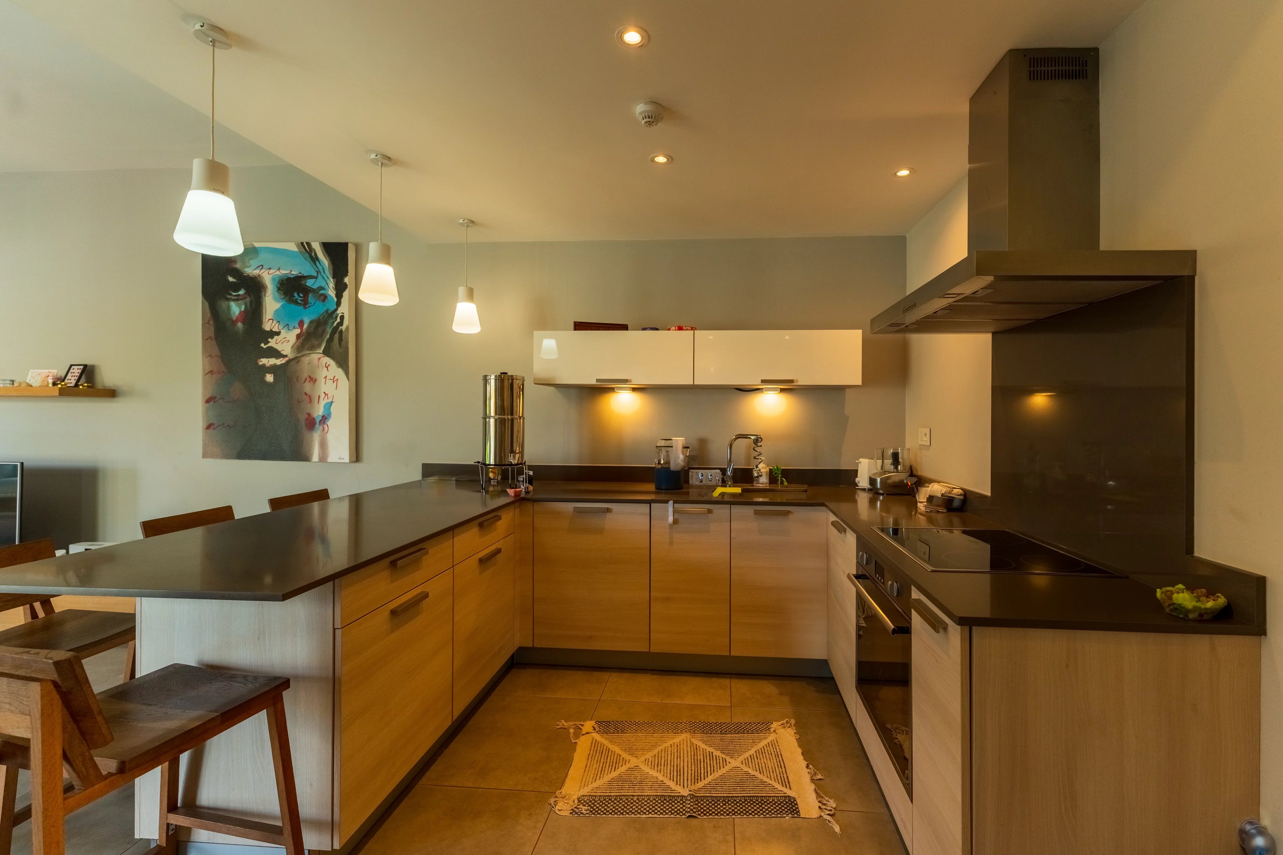La cuisine américaine est parfaitement équipée, avec une arrière-cuisine extérieure également disponible, et un petit bureau est astucieusement intégré dans le hall.