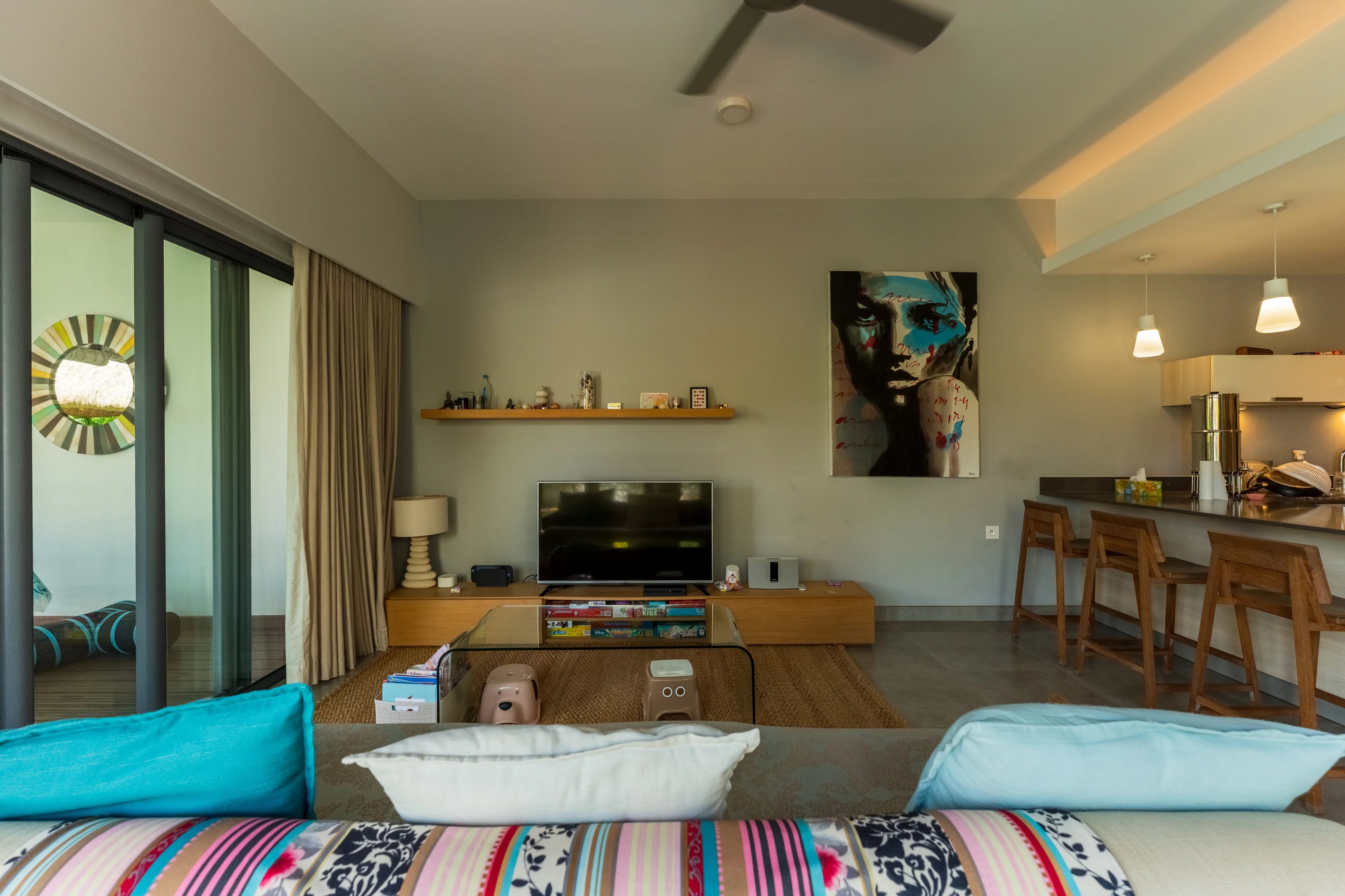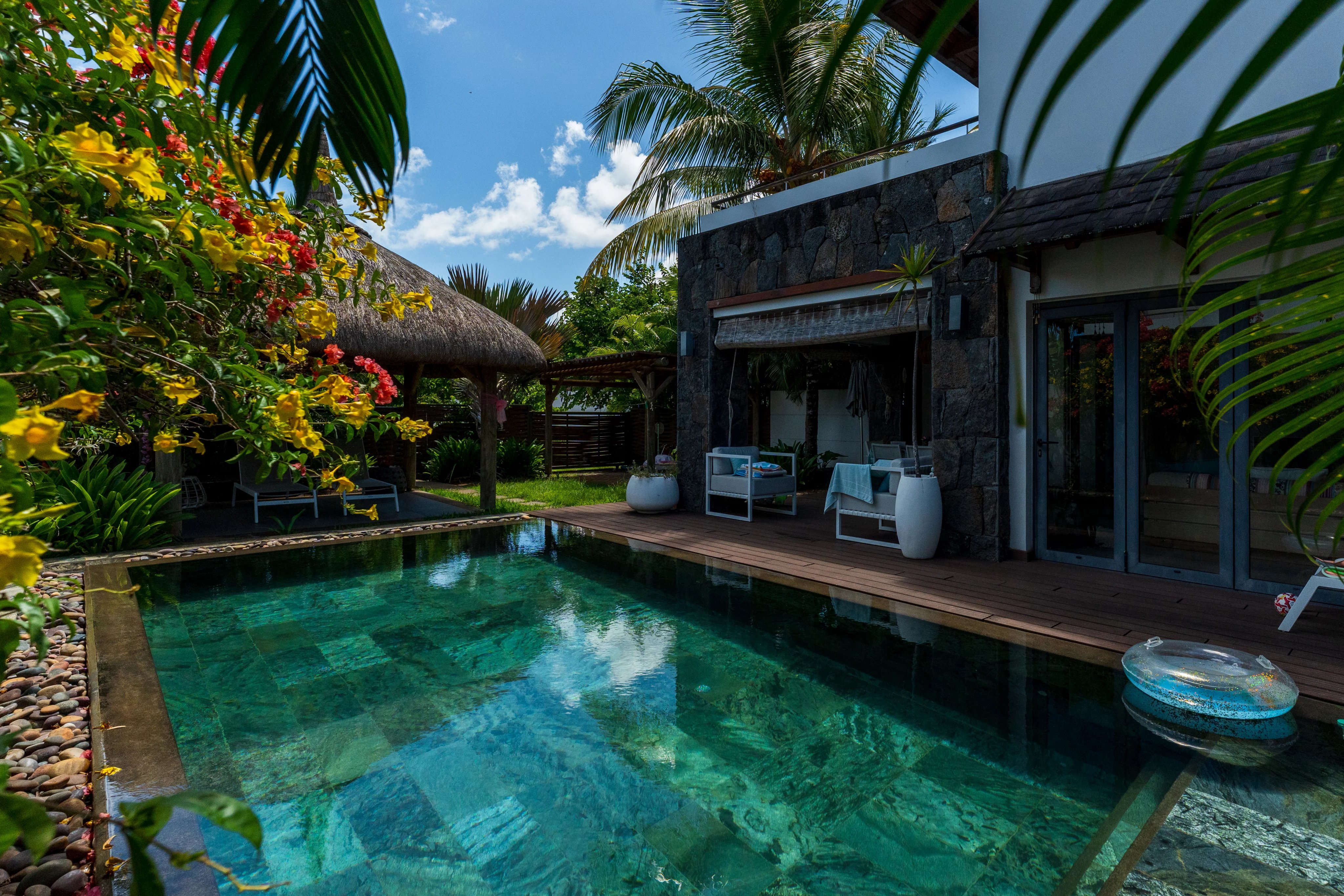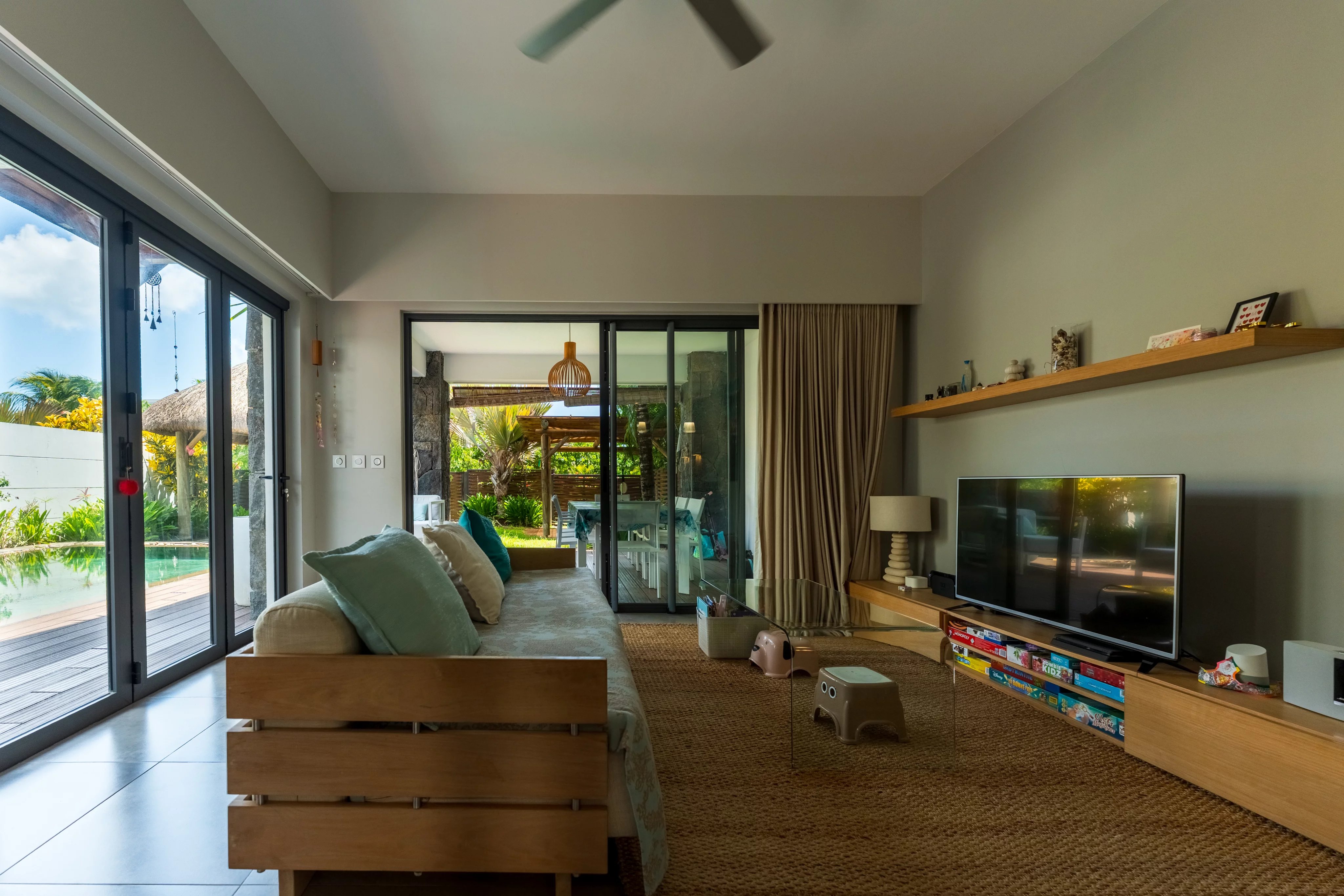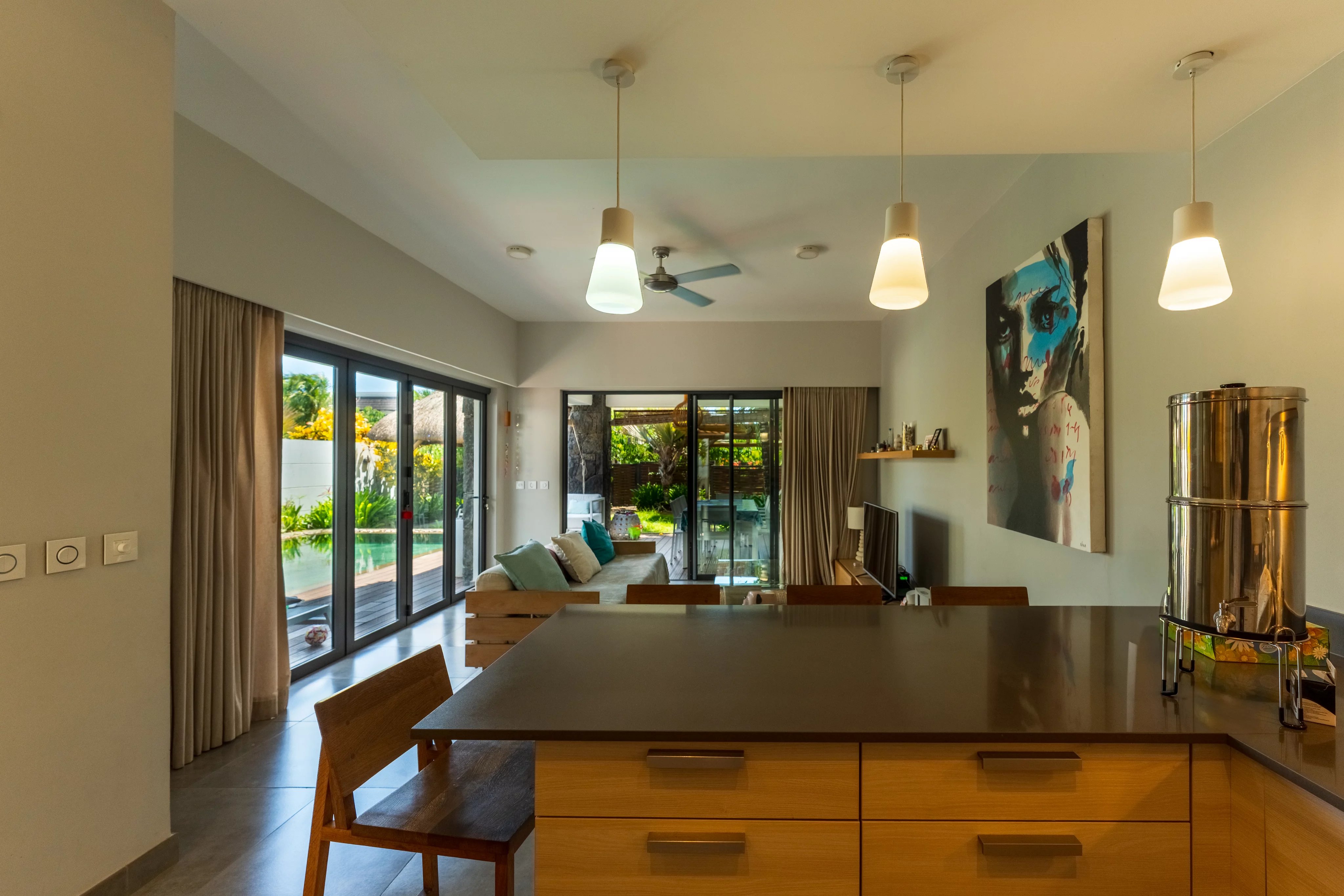 L'espace de vie est lumineux : toutes les baies vitrées s'ouvrent pour profiter de la terrasse, de la piscine et du jardin.