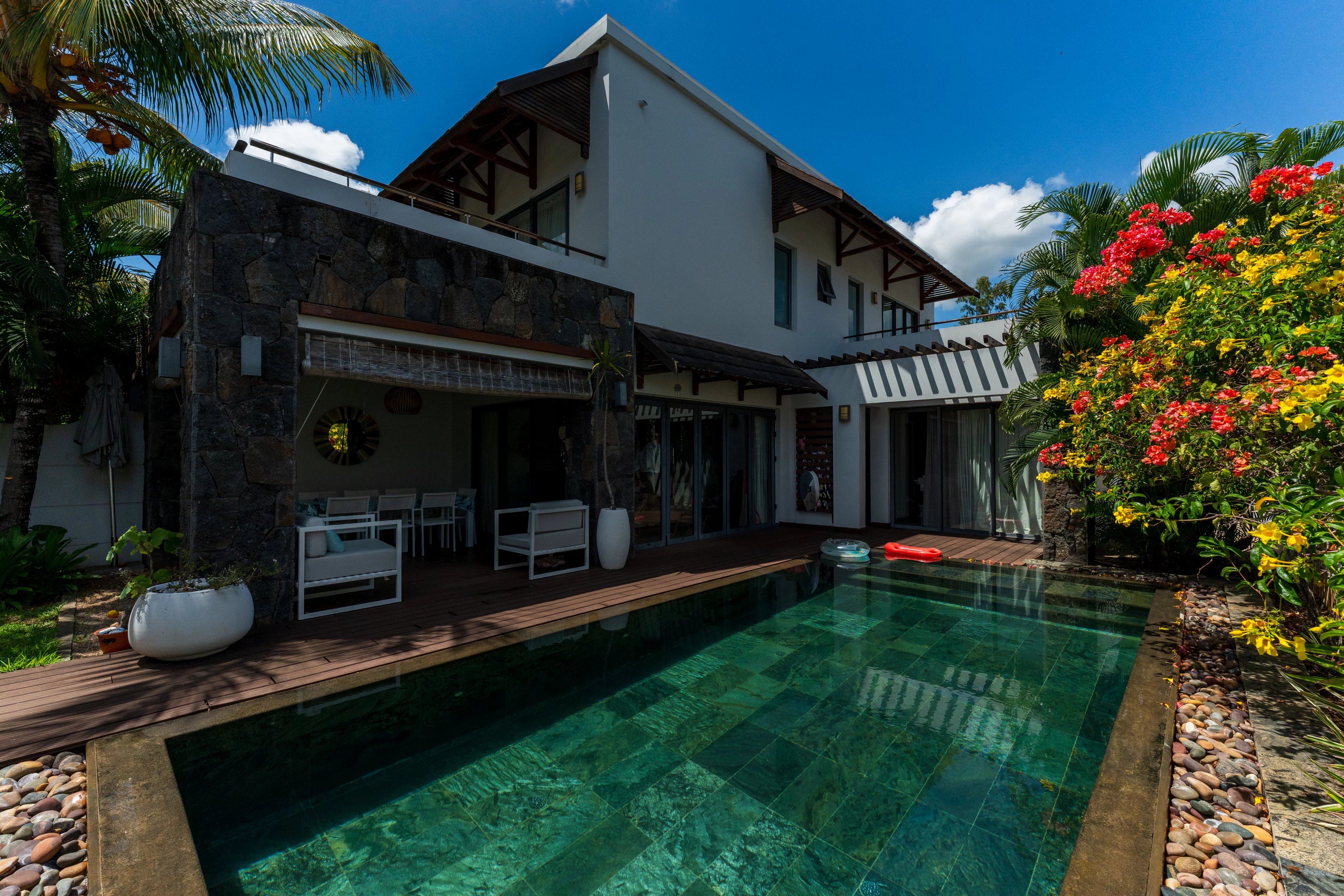 D'une superficie totale de 247 m², elle dispose de 3 chambres en suite, d'un jardin paysager et d'une piscine privée.