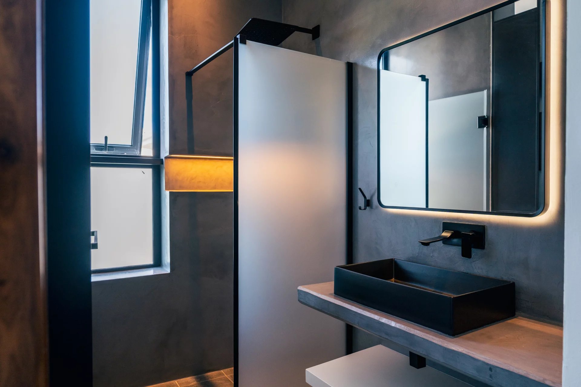 À l’intérieur, la cuisine ouverte au design contemporain est équipée d’appareils allemands haut de gamme, incluant une plaque à induction WOK. Deux chambres se trouvent sur ce niveau, dont l’une peut être aménagée en bureau avec vue sur la mer. Un escalier flottant mène à la suite parentale, offrant une vue panoramique sur la mer et les montagnes, une douche intérieure et extérieure, ainsi qu’un dressing de style Art Déco.