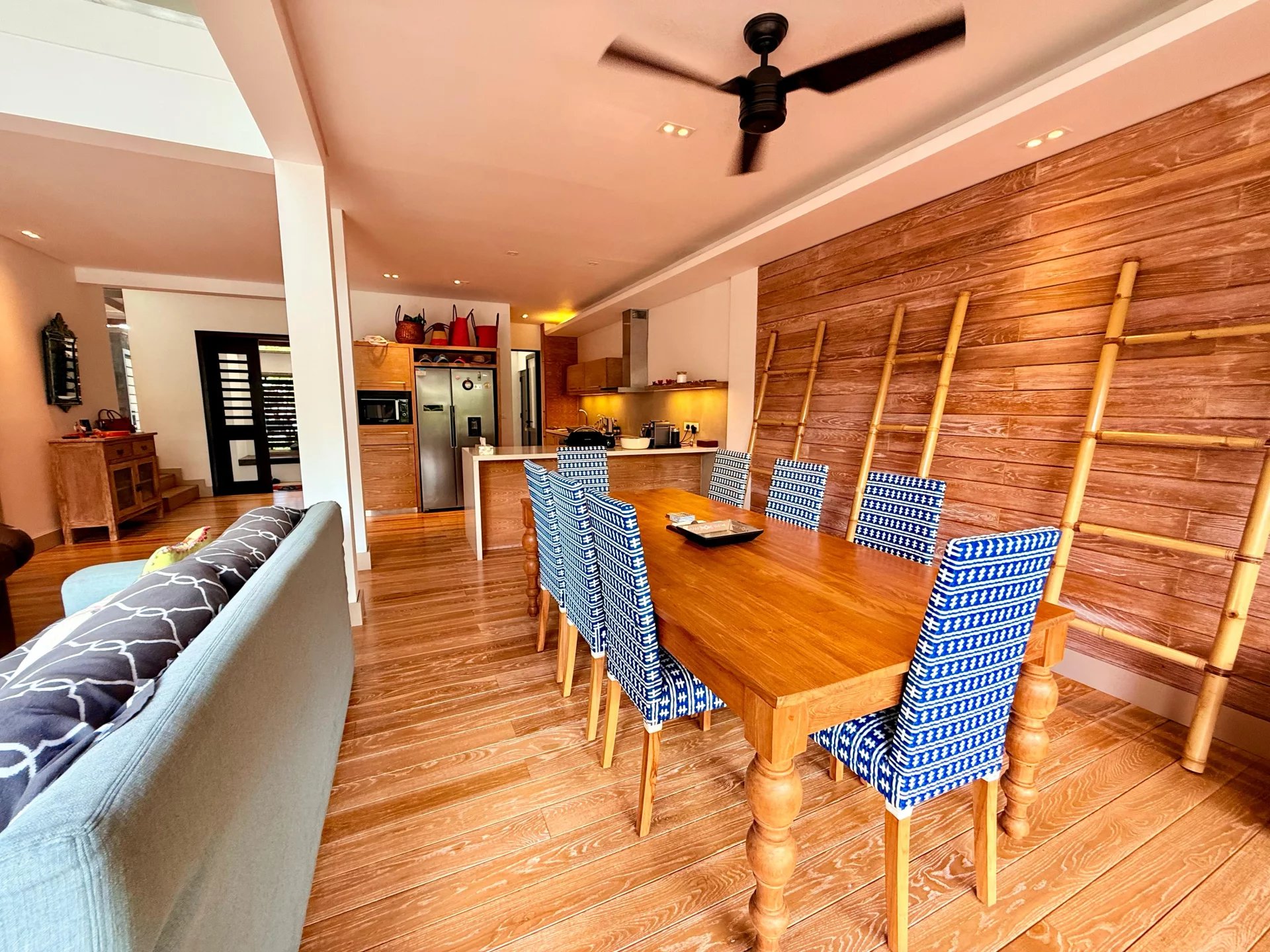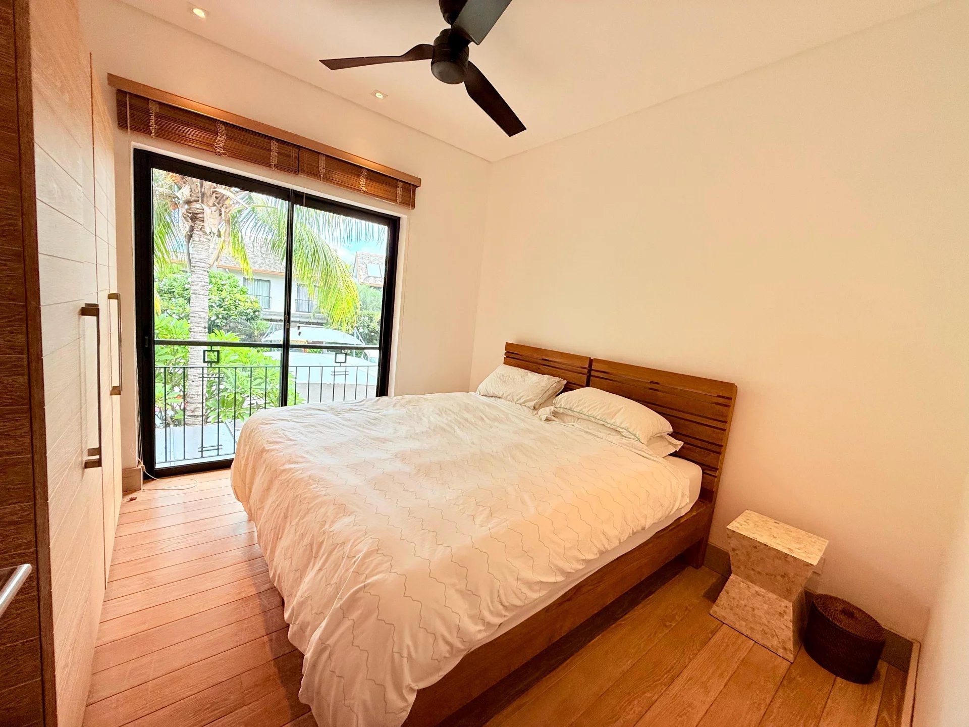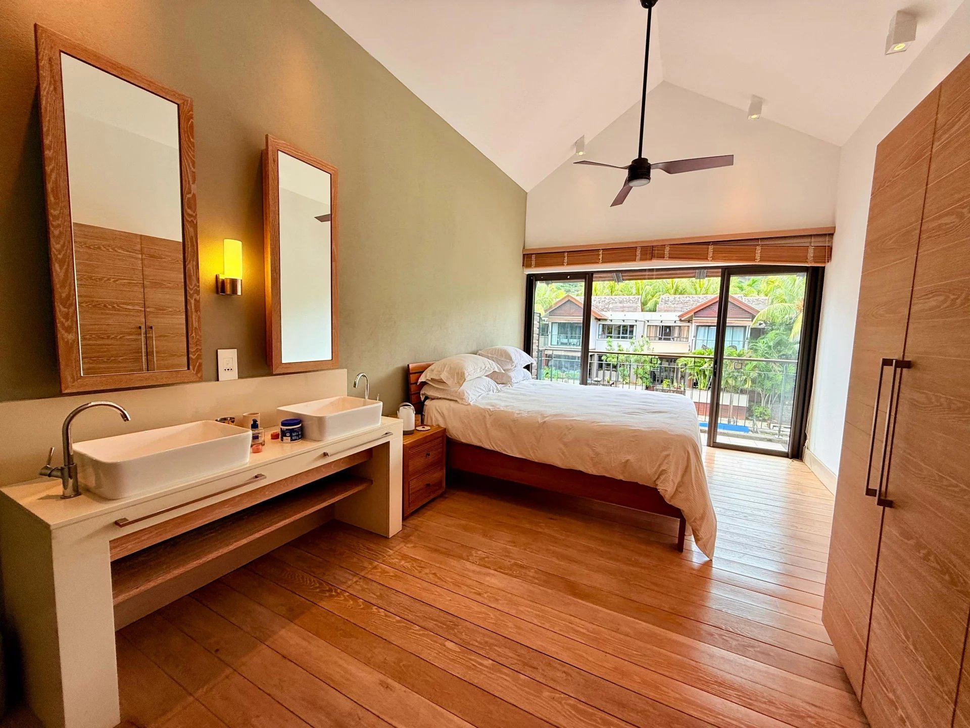 À l’étage, la suite parentale dispose d’un balcon privé avec vue. Deux autres chambres se partagent une salle de bains élégante. Ventilateurs de plafond, rangements intégrés et finitions soignées complètent le tout.