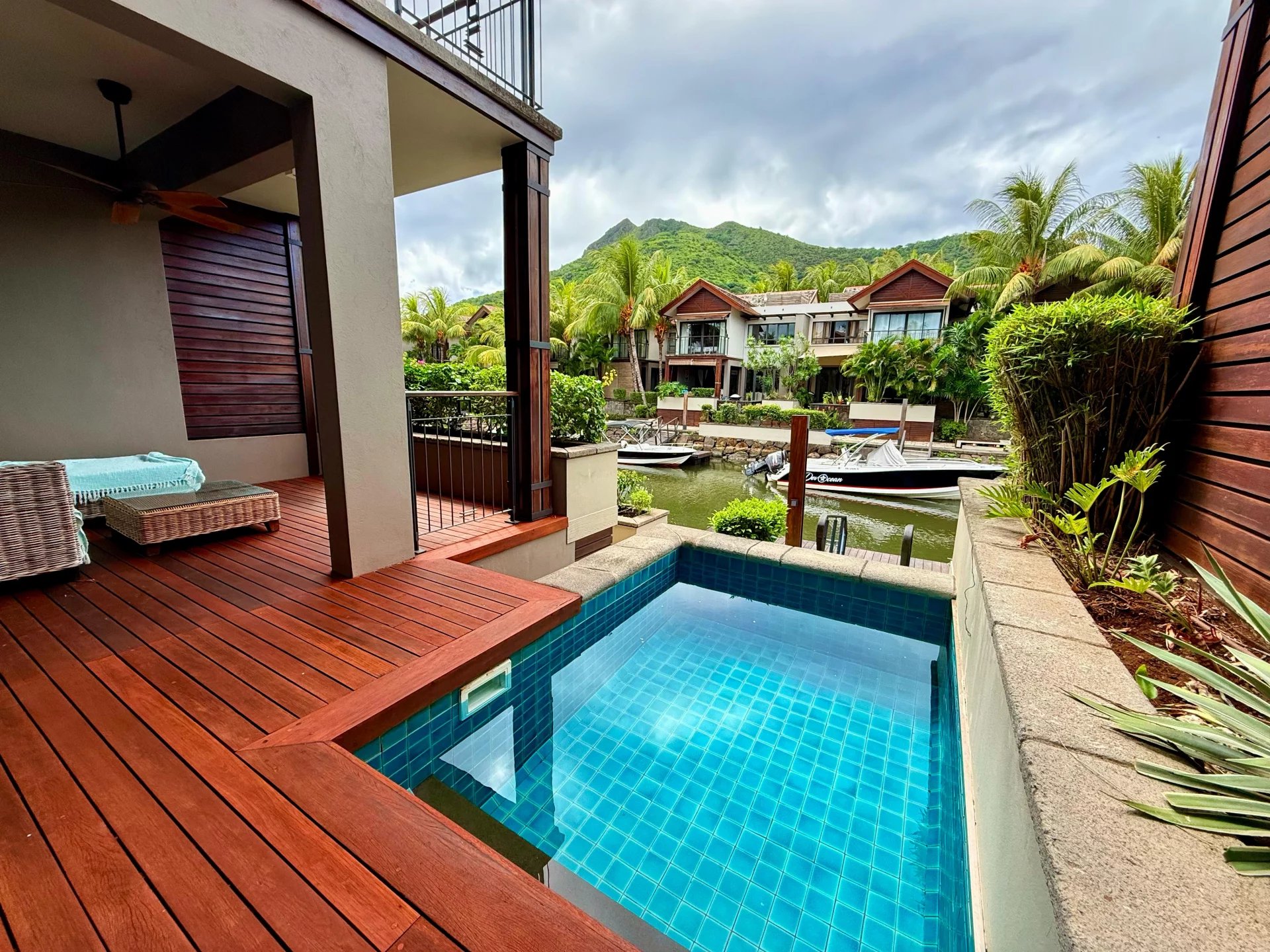 En excellent état, ce bien rare comprend un mouillage privé de 7,5 m, une piscine privative et offre une vue dégagée sur la montagne de La Tourelle ainsi que le lagon.