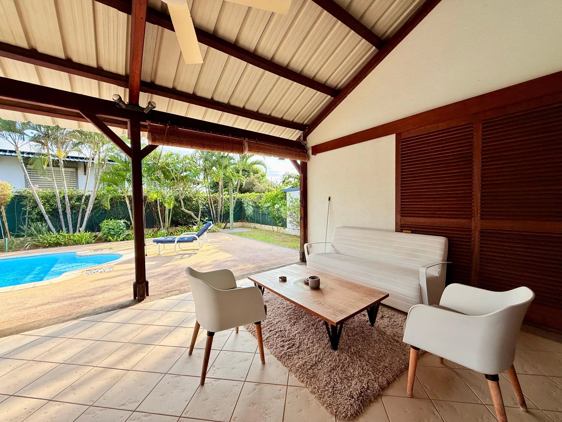 La villa se distingue par ses vues panoramiques sur la montagne de La Tourelle, créant un cadre naturel unique pour se détendre ou recevoir en toute intimité. Le séjour s’ouvre sur une terrasse généreuse, avec piscine privée et kiosque, parfaits pour des moments conviviaux en famille ou entre amis.