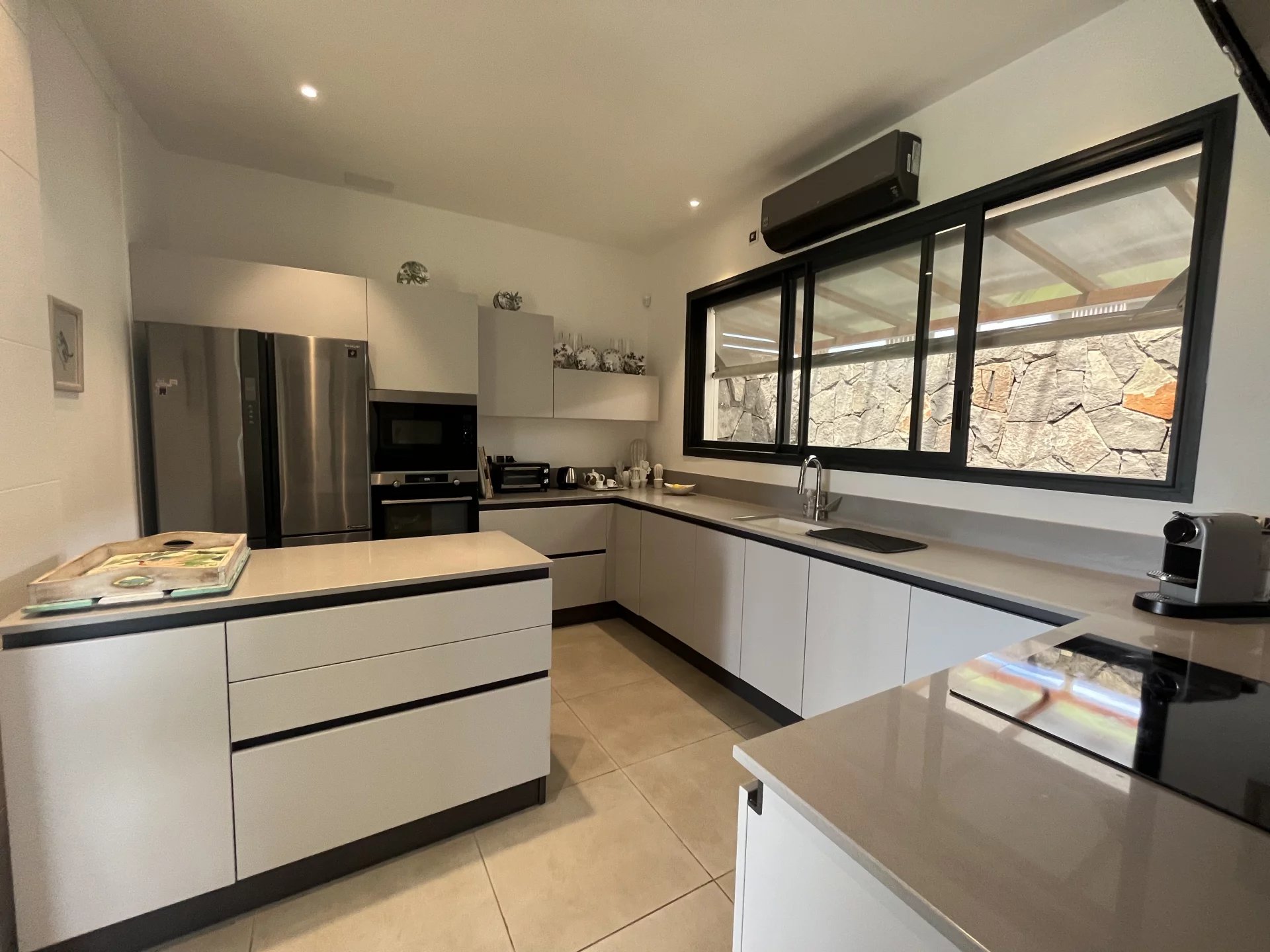 La maison dispose de 3 chambres en suite, toutes équipées de placards et de la climatisation. L'espace de vie offre un salon-salle à manger ainsi que sa cuisine indépendante entièrement équipée, et une buanderie aménagée. Ouvert sur une terrasse couverte, vous bénéficierez d'un agréable espace de vie extérieur avec sa piscine et son kiosque pour profiter de moments de détente dans un environnement apaisant.