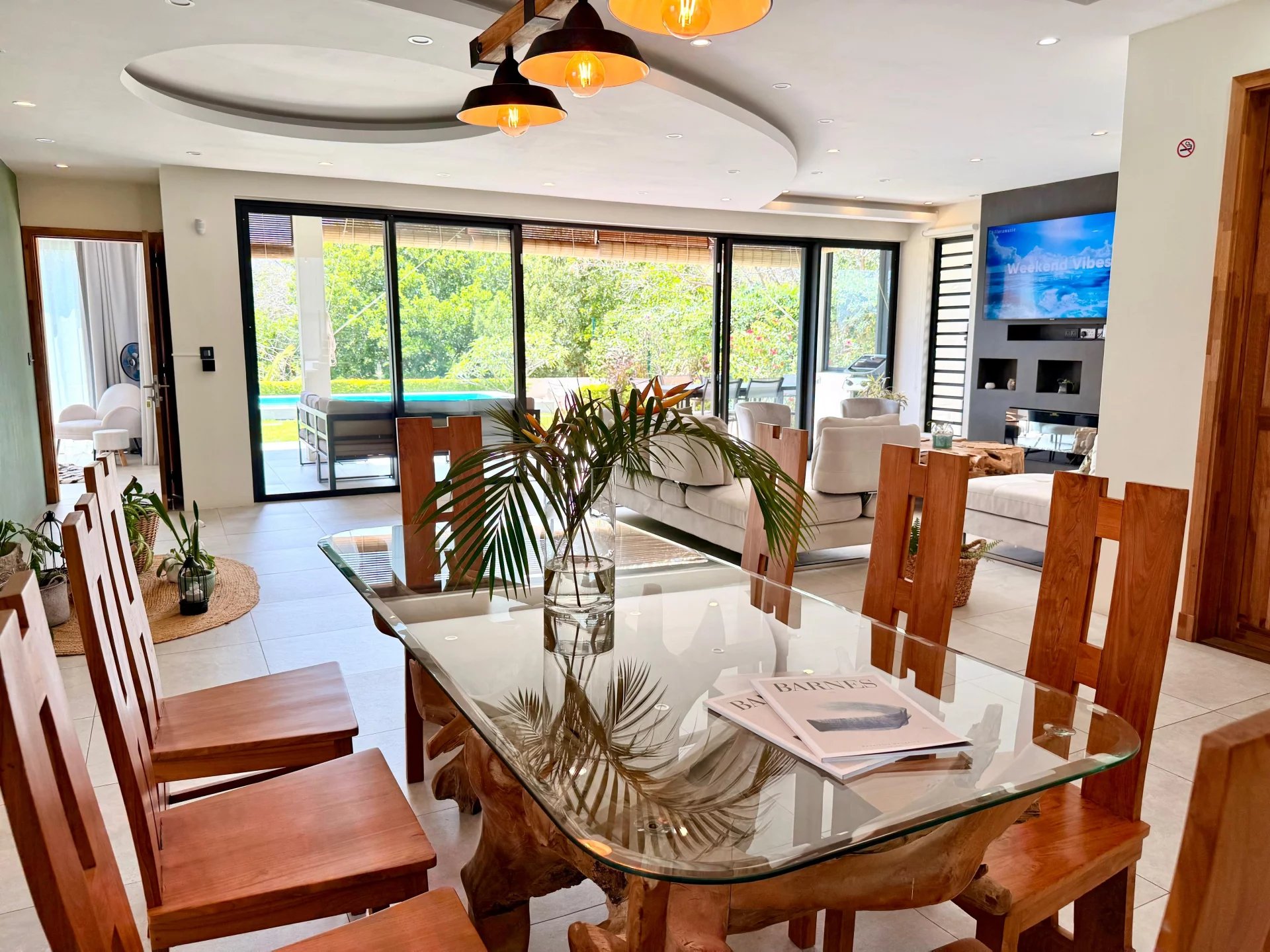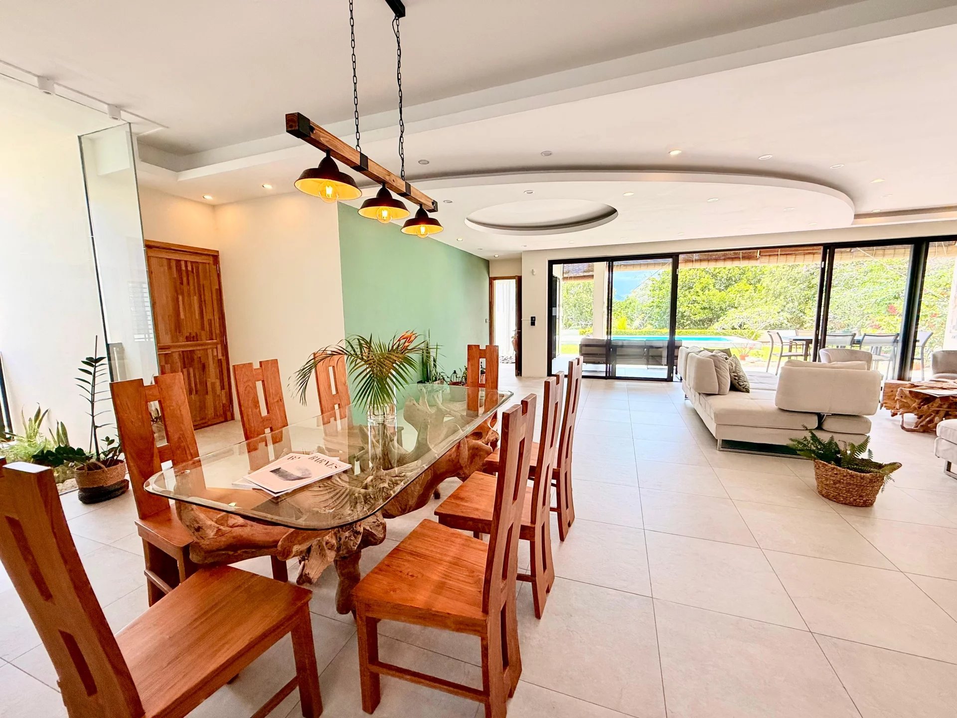 Séjour et salle à manger ouverts sur l’extérieur grâce à de larges baies vitrées.
