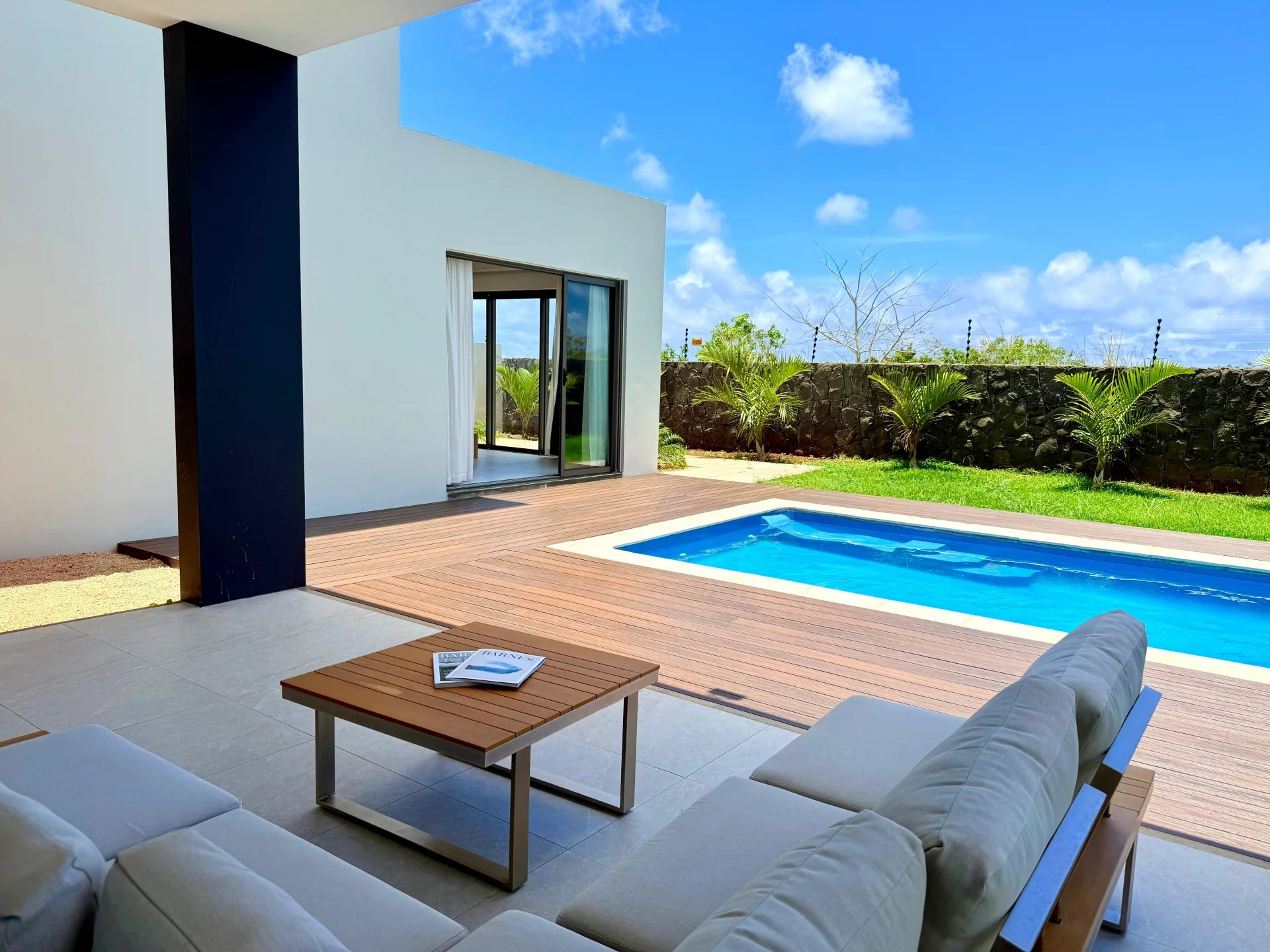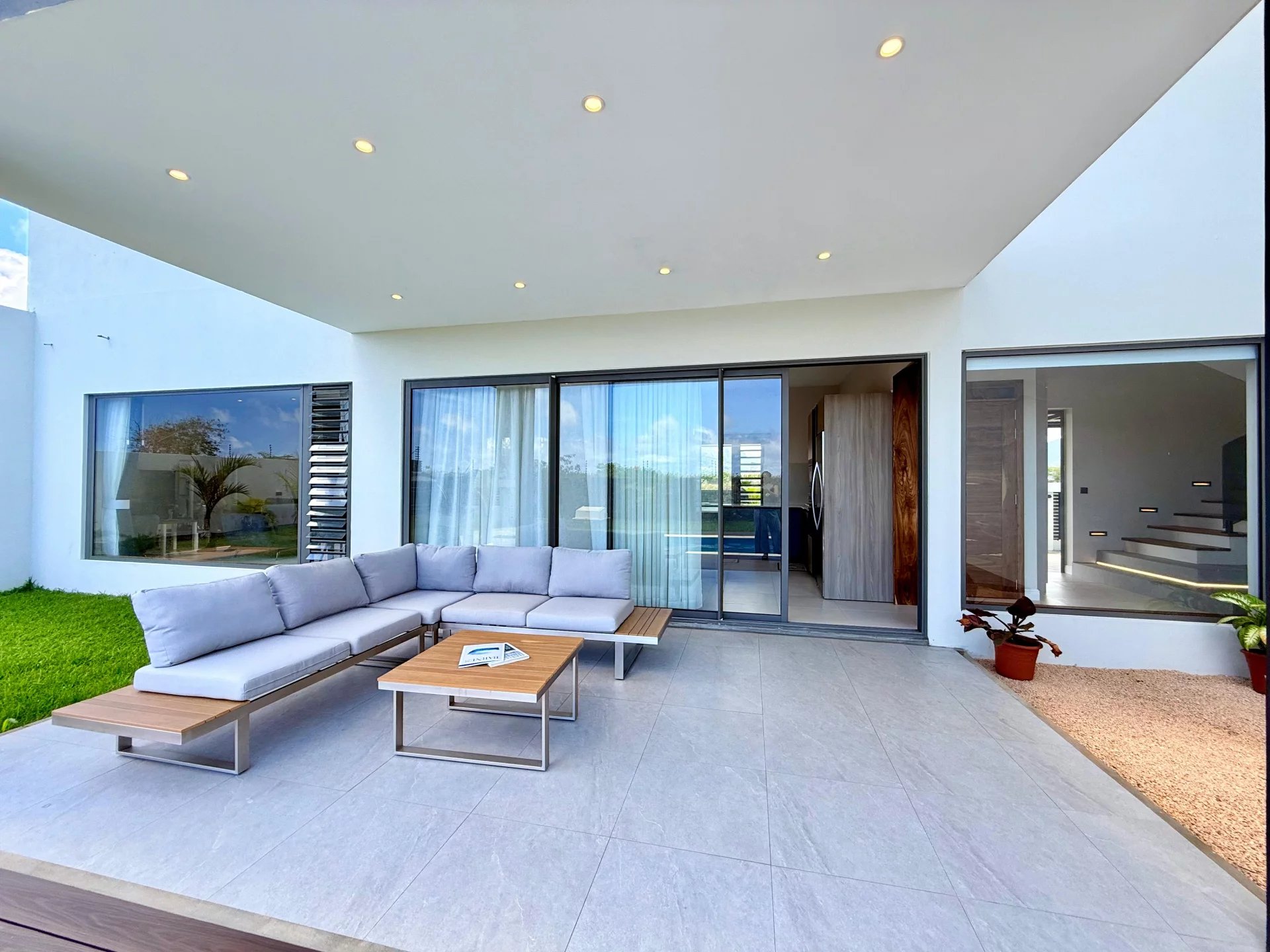 Les grandes ouvertures donnent accès à une superbe terrasse couverte élégamment meublée, offrant une vue apaisante sur la piscine et créant un parfait espace extérieur pour se détendre ou recevoir. La villa comprend également trois spacieuses chambres en suite, chacune pensée pour offrir intimité et confort, ainsi que des salles de bains au design chic et contemporain et une salle de bain supplémentaire pour les invités.