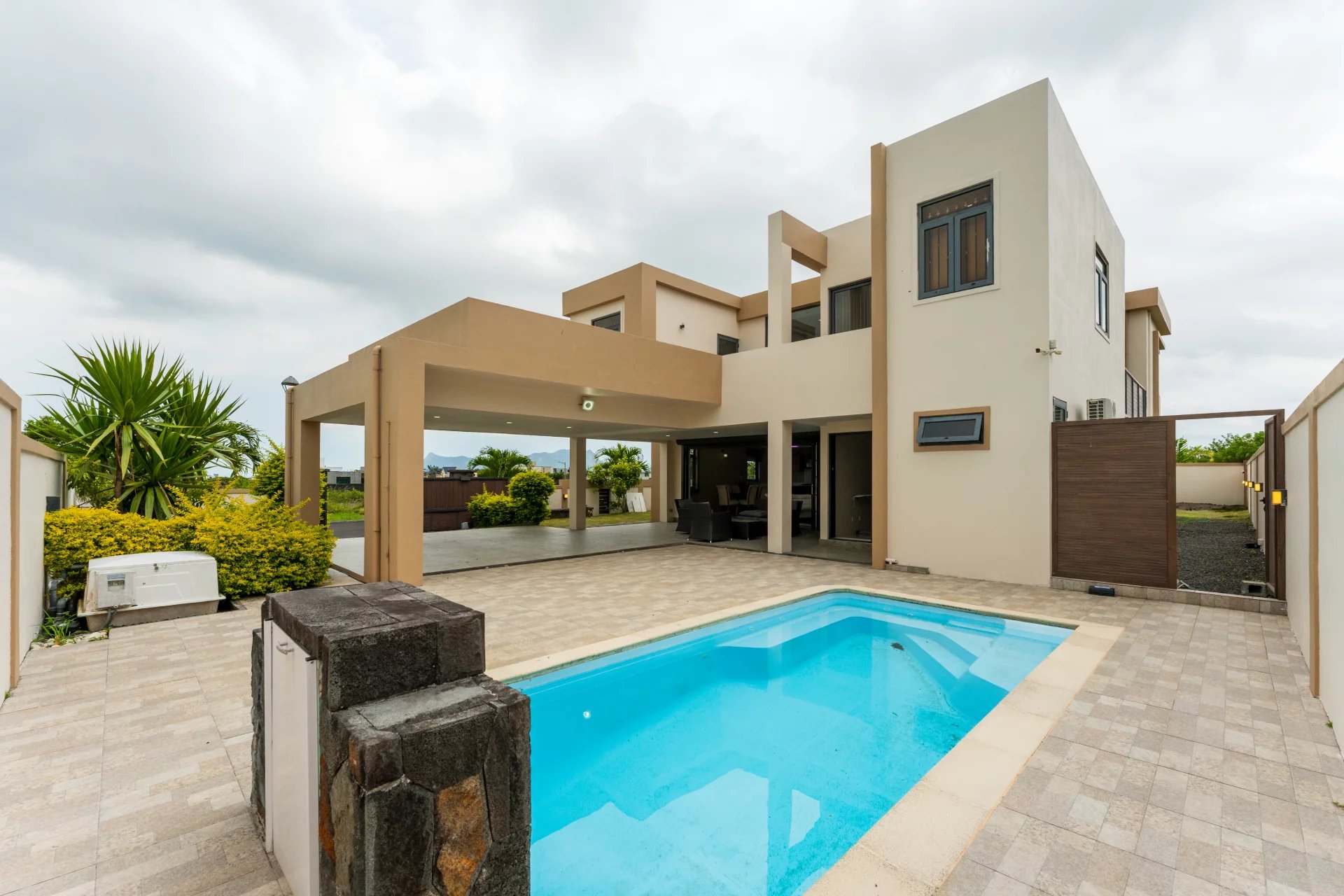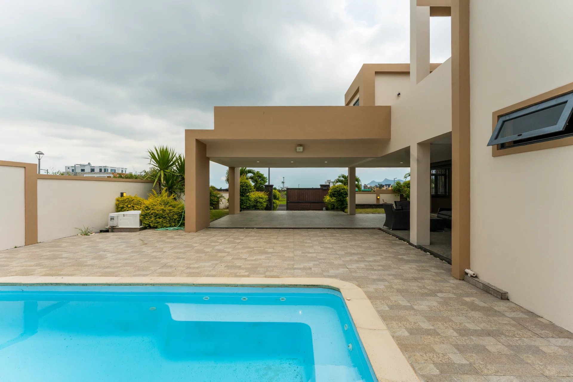 Les espaces extérieurs sont tout aussi soignés, avec une piscine privée dotée d’un mur d’eau, un jardin paysager et une terrasse couverte idéale pour recevoir. Un garage double couvert, un portail automatisé et des volets roulants complètent les équipements.